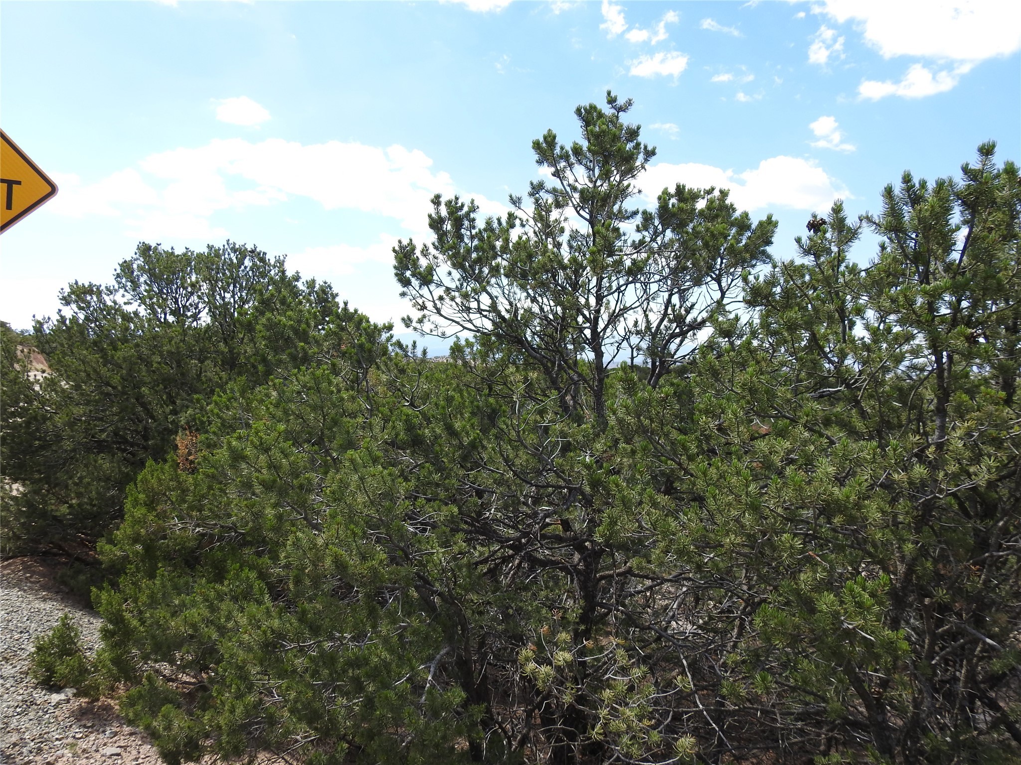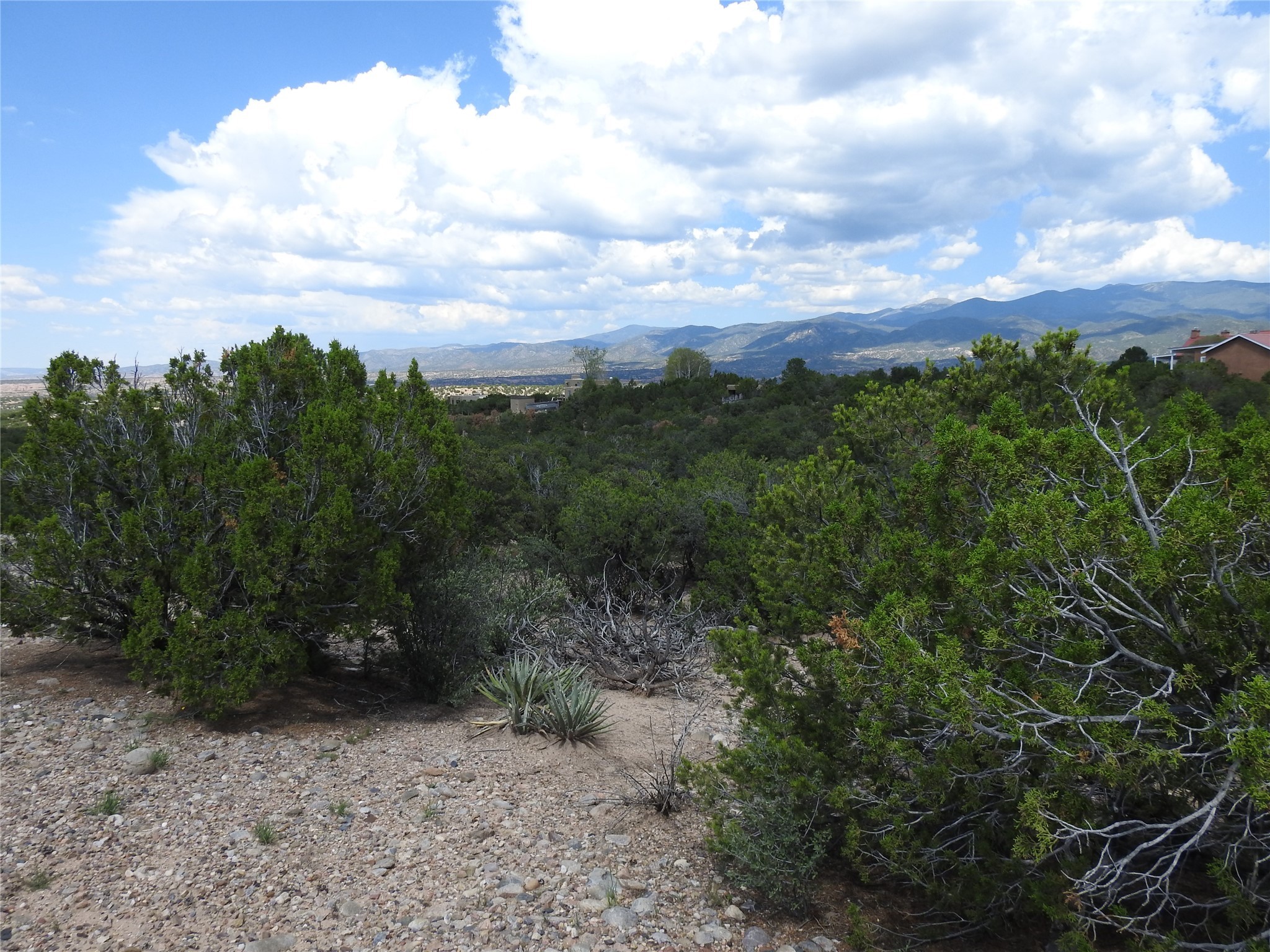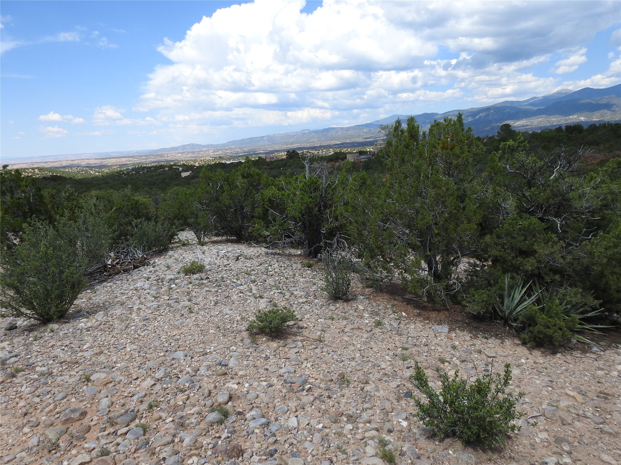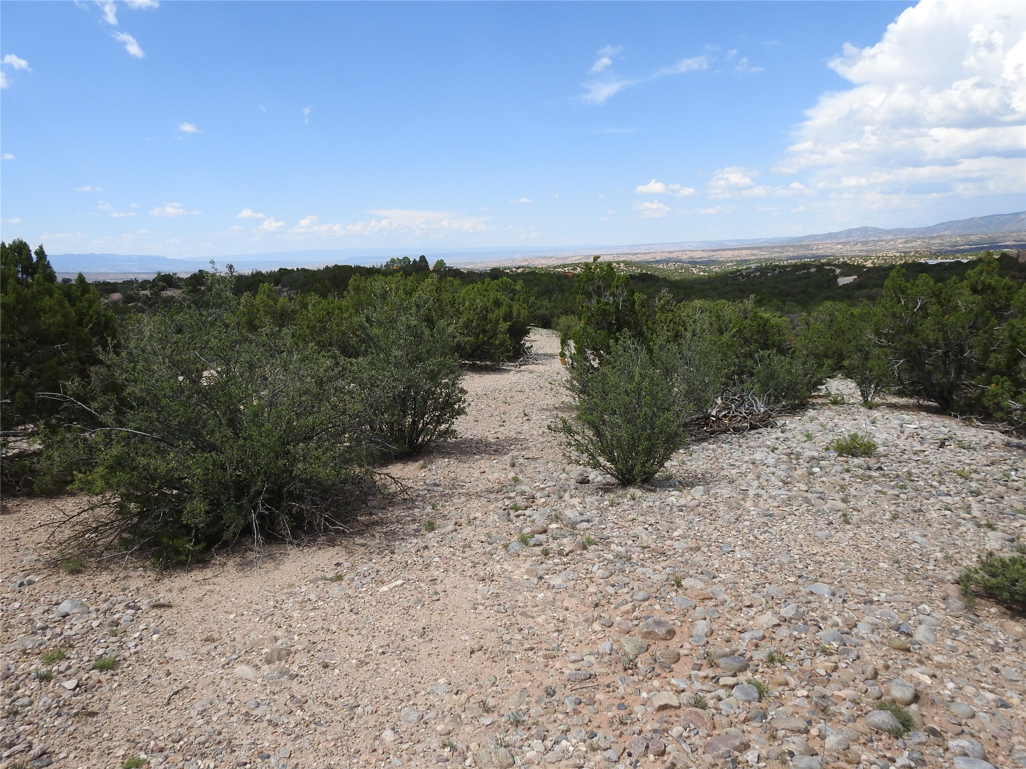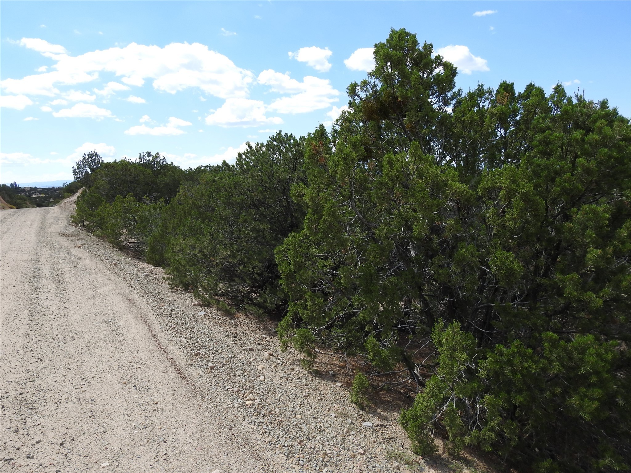 Beautiful, Pristine acreage off San Rafael. This triangular piece is covered with Pinon, Cedar, and different bushes. Ridges are hidden throughout and with existing roads going down two sides of this triangular lot, there are many points of entry sites. Over 700 feet down San Rafael and over 580 feet along Tano Trail.