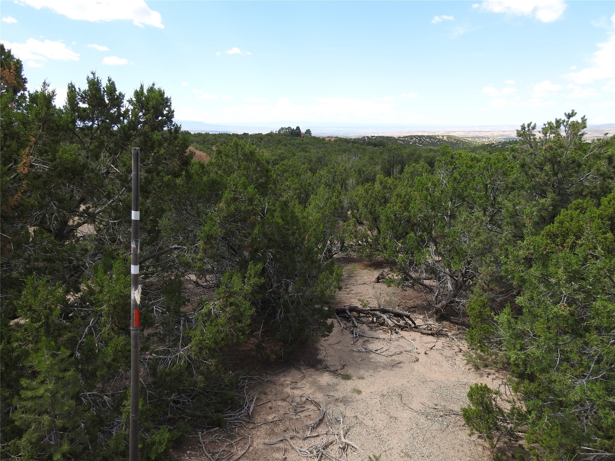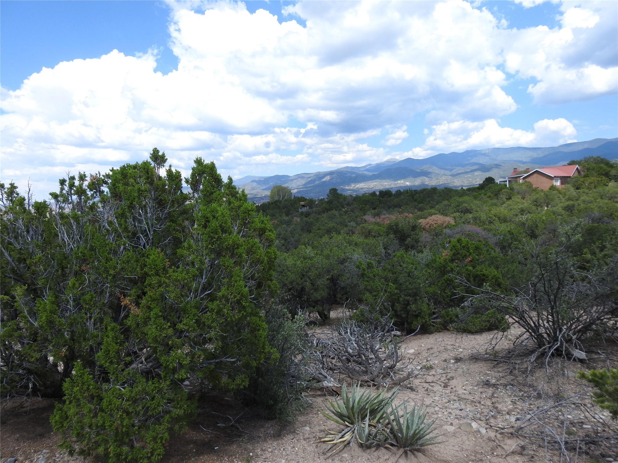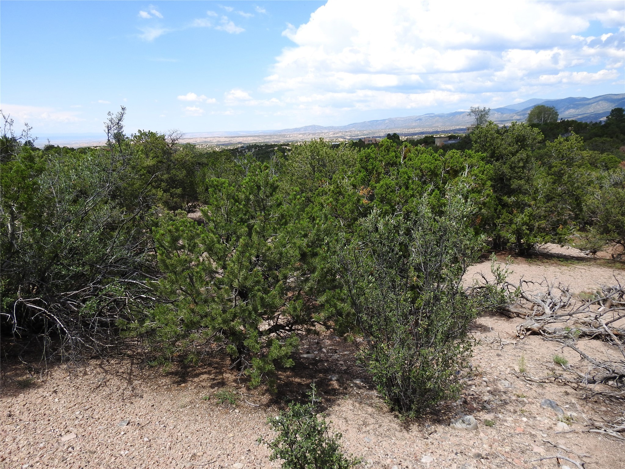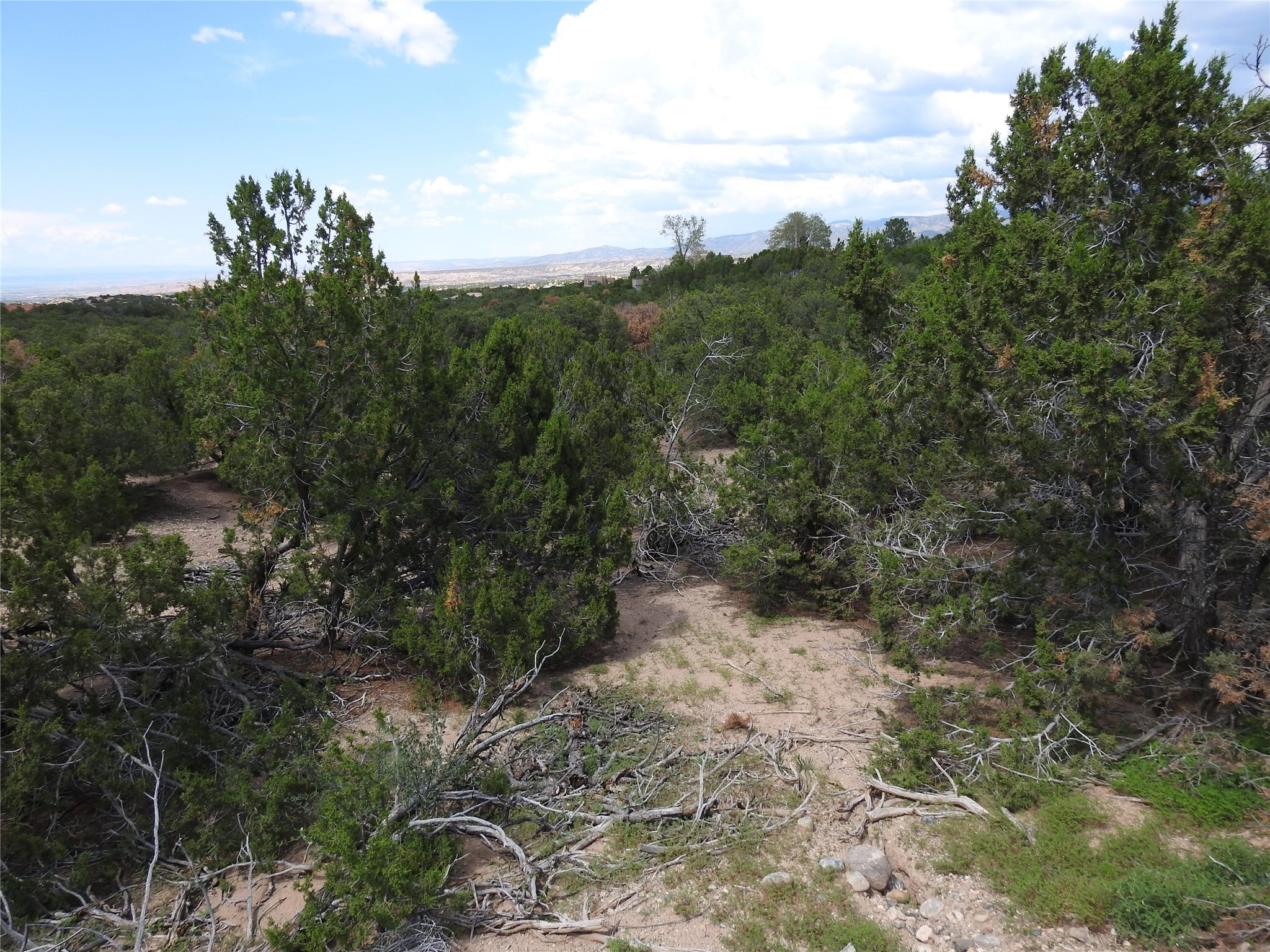 Beautiful, Pristine acreage off San Rafael. This triangular piece is covered with Pinon, Cedar, and different bushes. Ridges are hidden throughout and with existing roads going down two sides of this triangular lot, there are many points of entry sites. Over 700 feet down San Rafael and over 580 feet along Tano Trail.