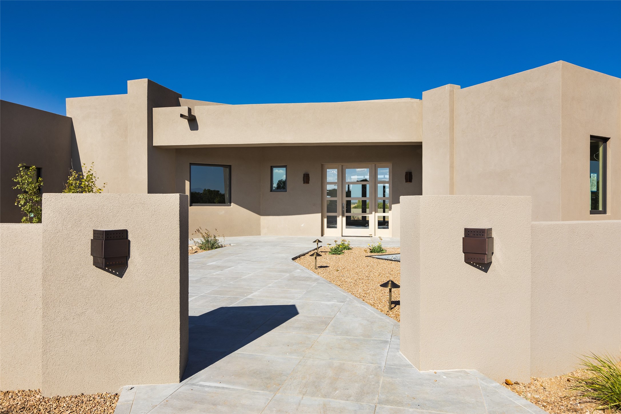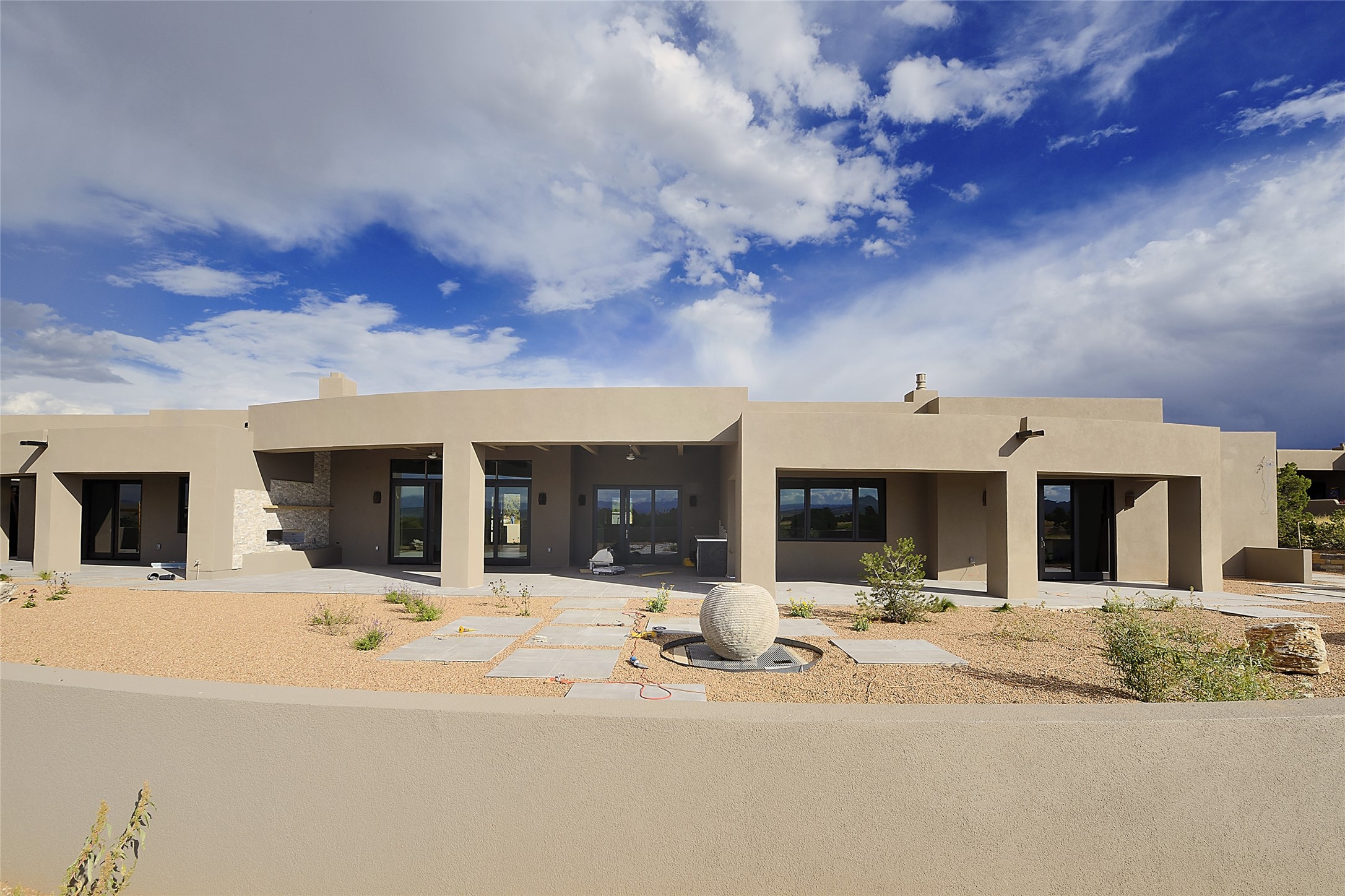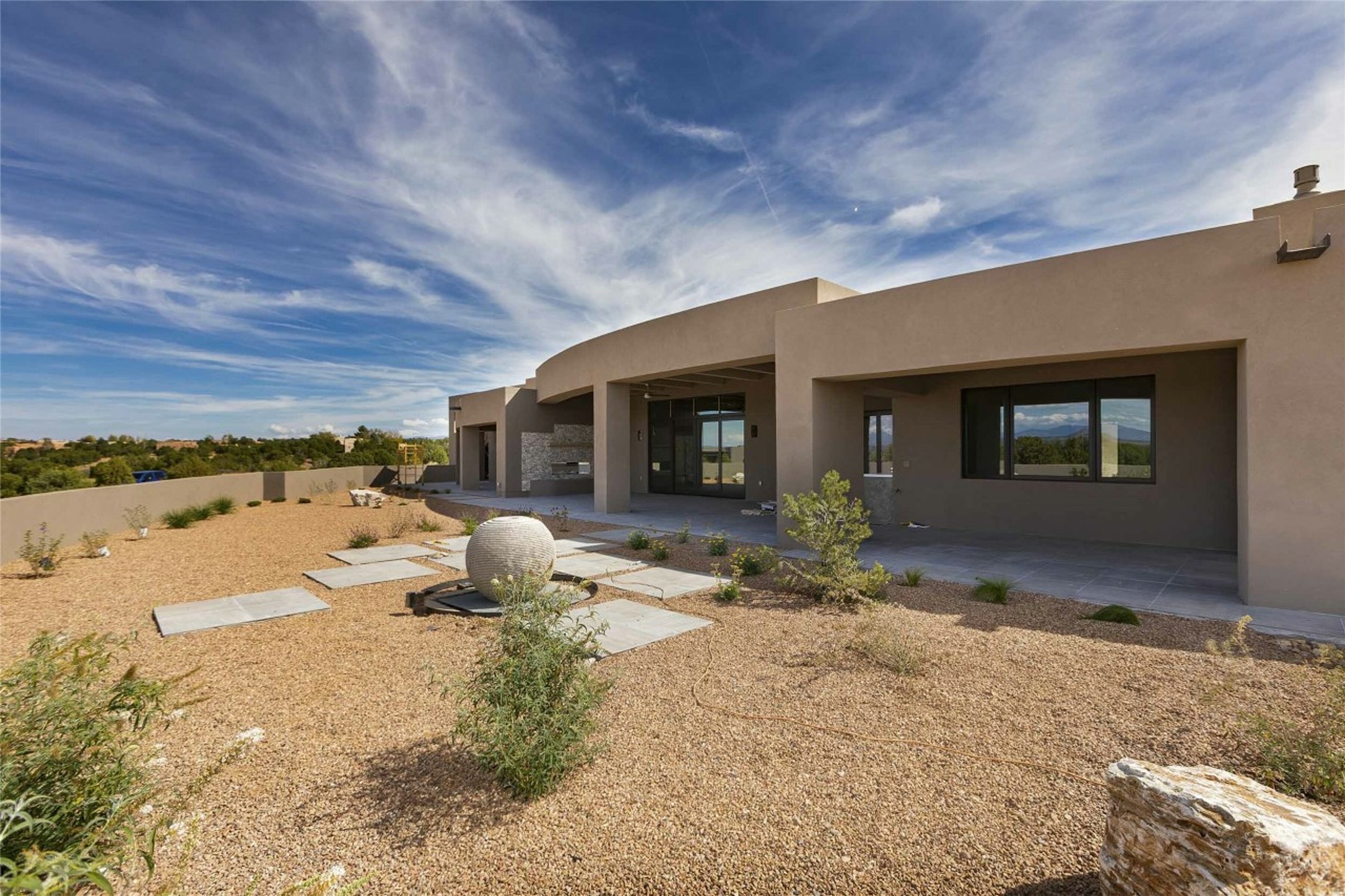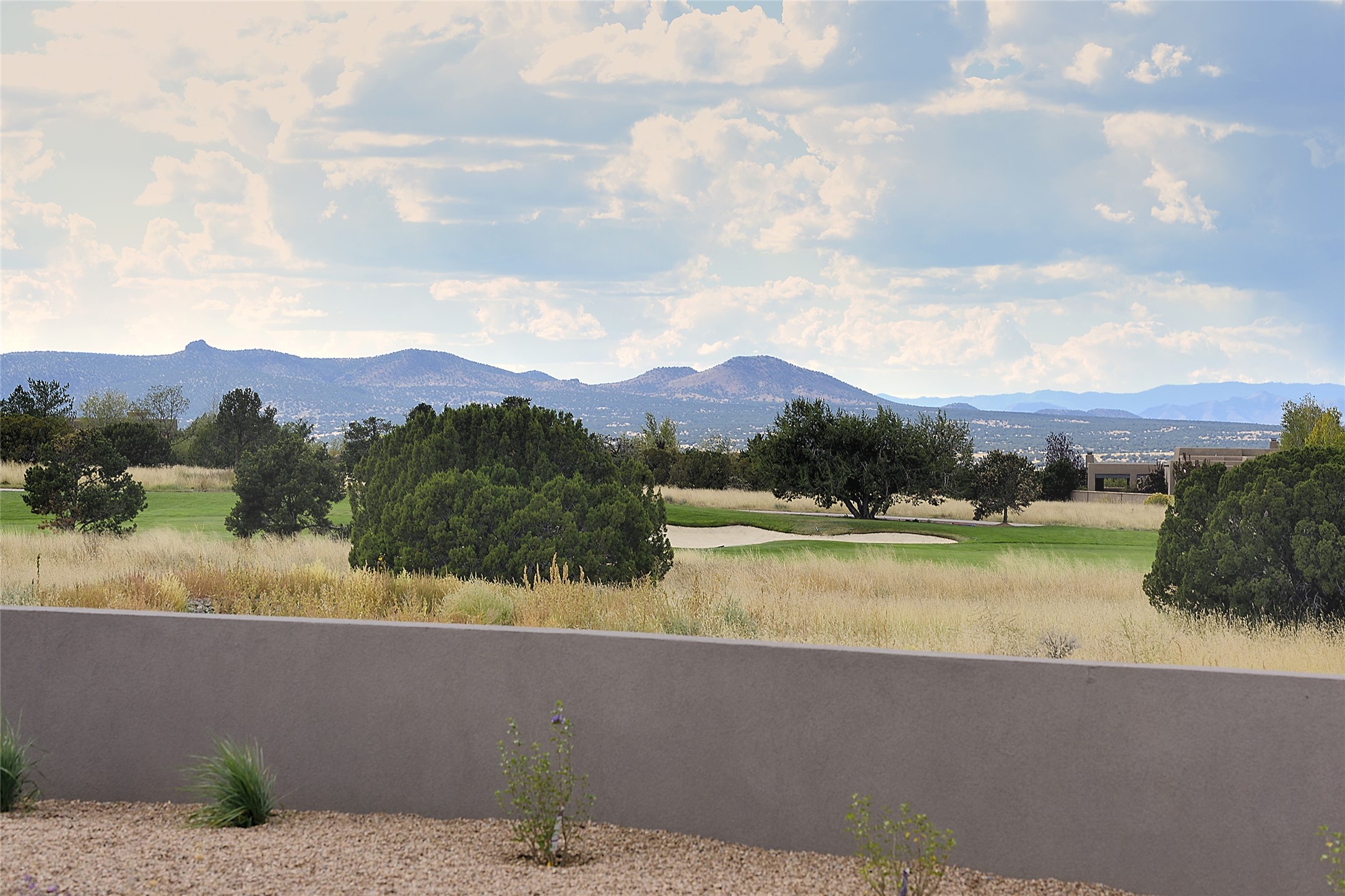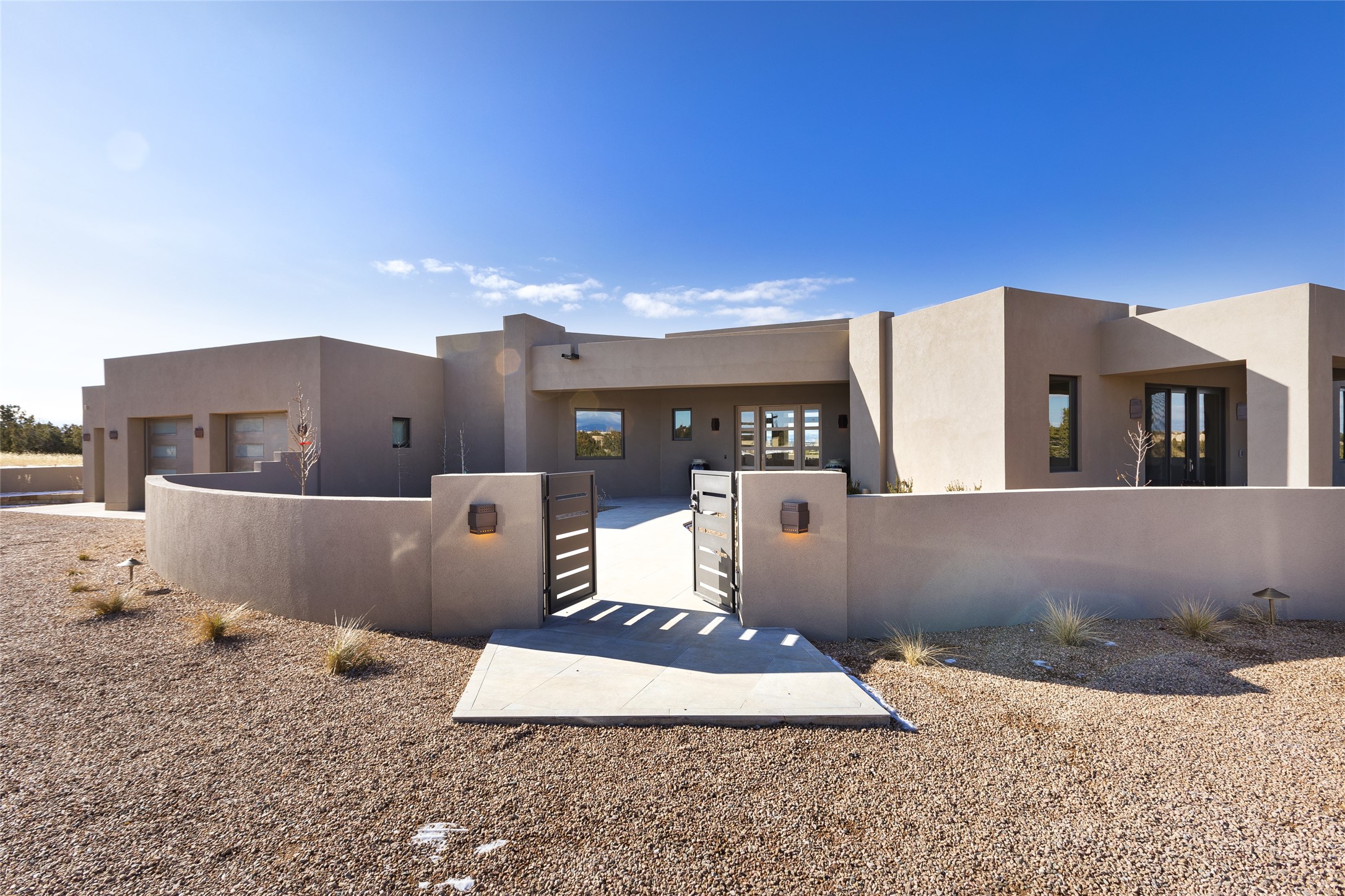 Las Campanas luxury at its finest. This rare, triumphant 2022-built Tour de Force residence excites with the ultimate blend of sophisticated design and spectacular Sunset Golf Course, Jemez Mountain, sunset, and Sangre de Cristo Mountain views. Thoughtfully designed, this exceptional residence offers an ideal entertainment experience with expansive interior and exterior entertainment areas. Privately accessed through a front entrance courtyard with a tranquil water feature, this exquisite home offers a professional designer chef's island kitchen with Wolf and Subzero appliances, a walk-in pantry, breakfast bar, and custom cabinetry. The open concept living areas include a spacious living and dining room with dramatic Jemez Mountain and golf course views, fireplace with stacked stone accents, and back portal access. The owner's suite offers golf course views, fireplace, portal access, and a spacious spa-like bath with a sauna, soaking tub, custom shower, dual vanities, and dual closets. Adjacent to the owner's suite is a private office or ideal exercise room. Guests enjoy true independence with a separate guest wing which offers two spacious ensuite bedrooms with private entrances, separated by a secondary office or living room. Luxury finishes include a roof top deck, white oak hardwood and porcelain flooring throughout, plaster walls, a Sonos sound system, built-in BBQ, designer landscape, and a 3 car garage with a heated 3rd bay.