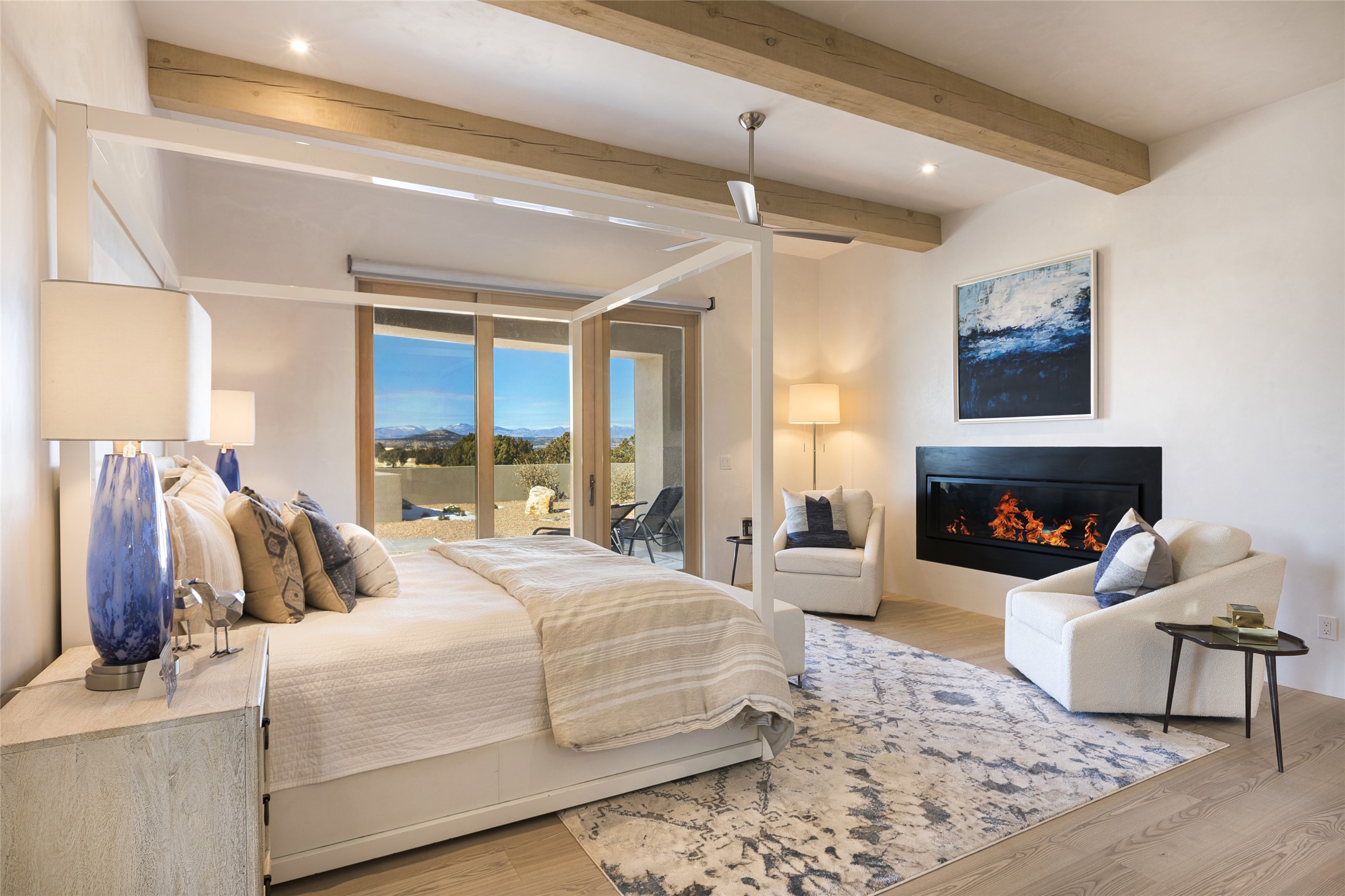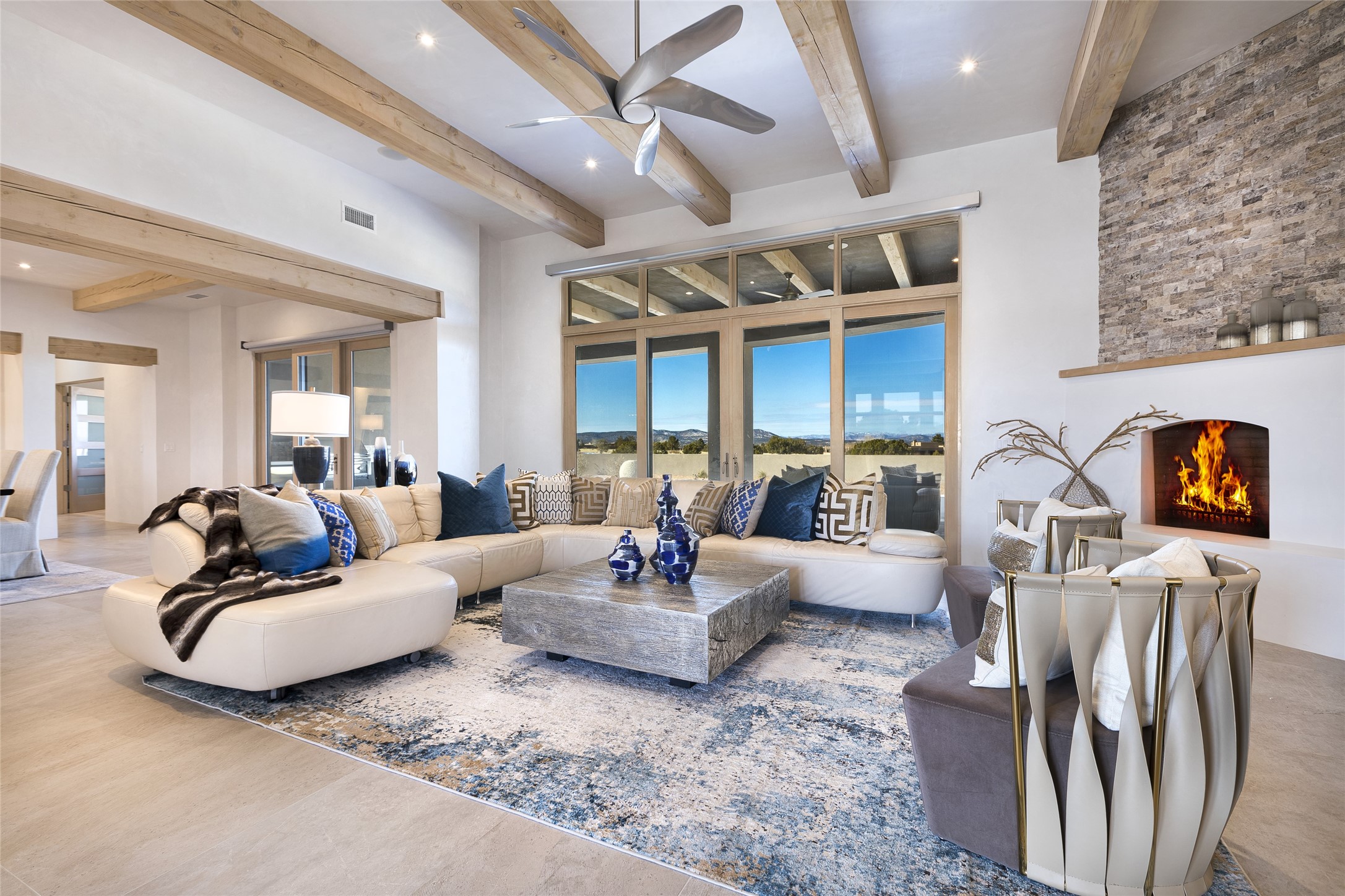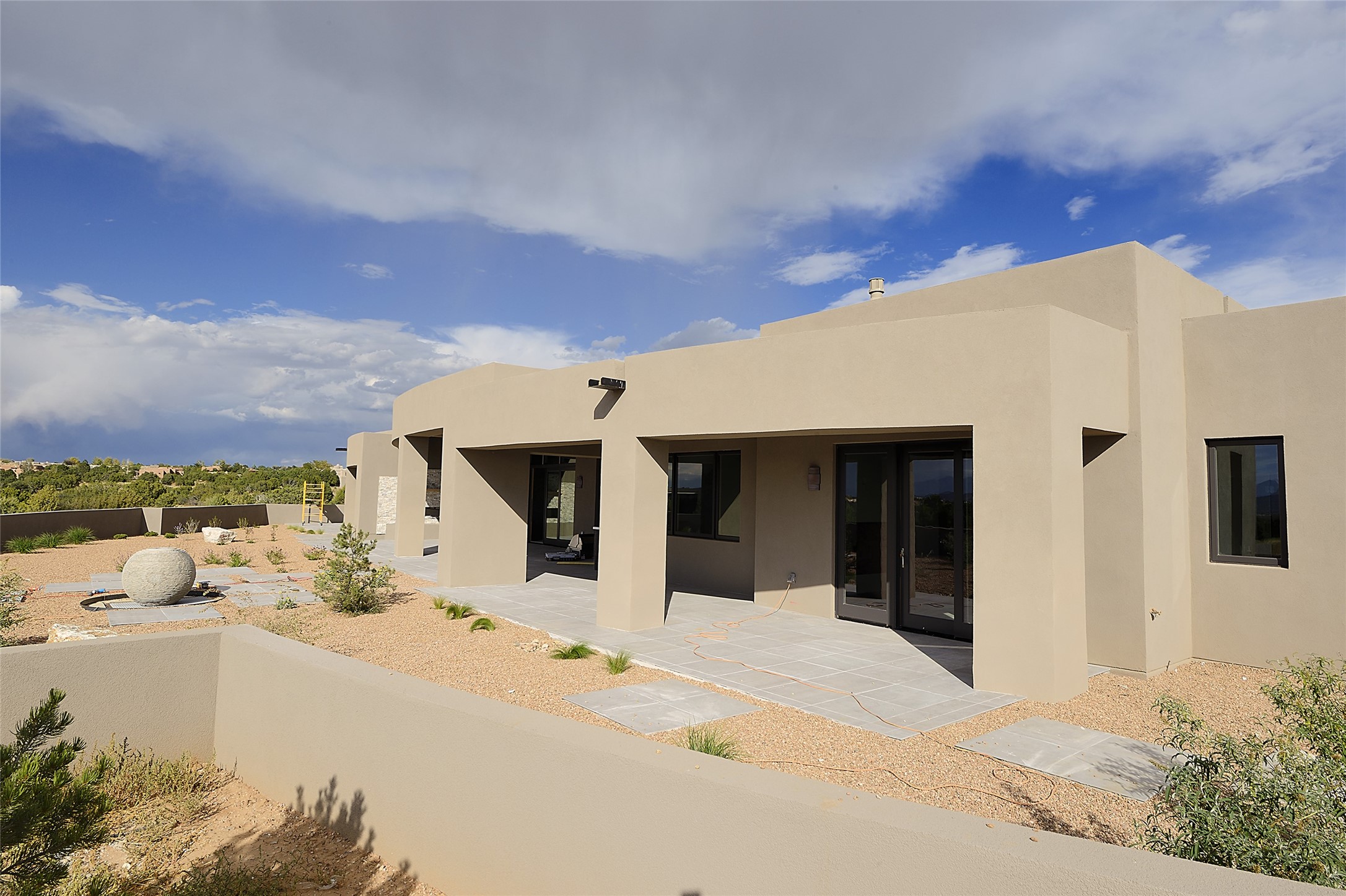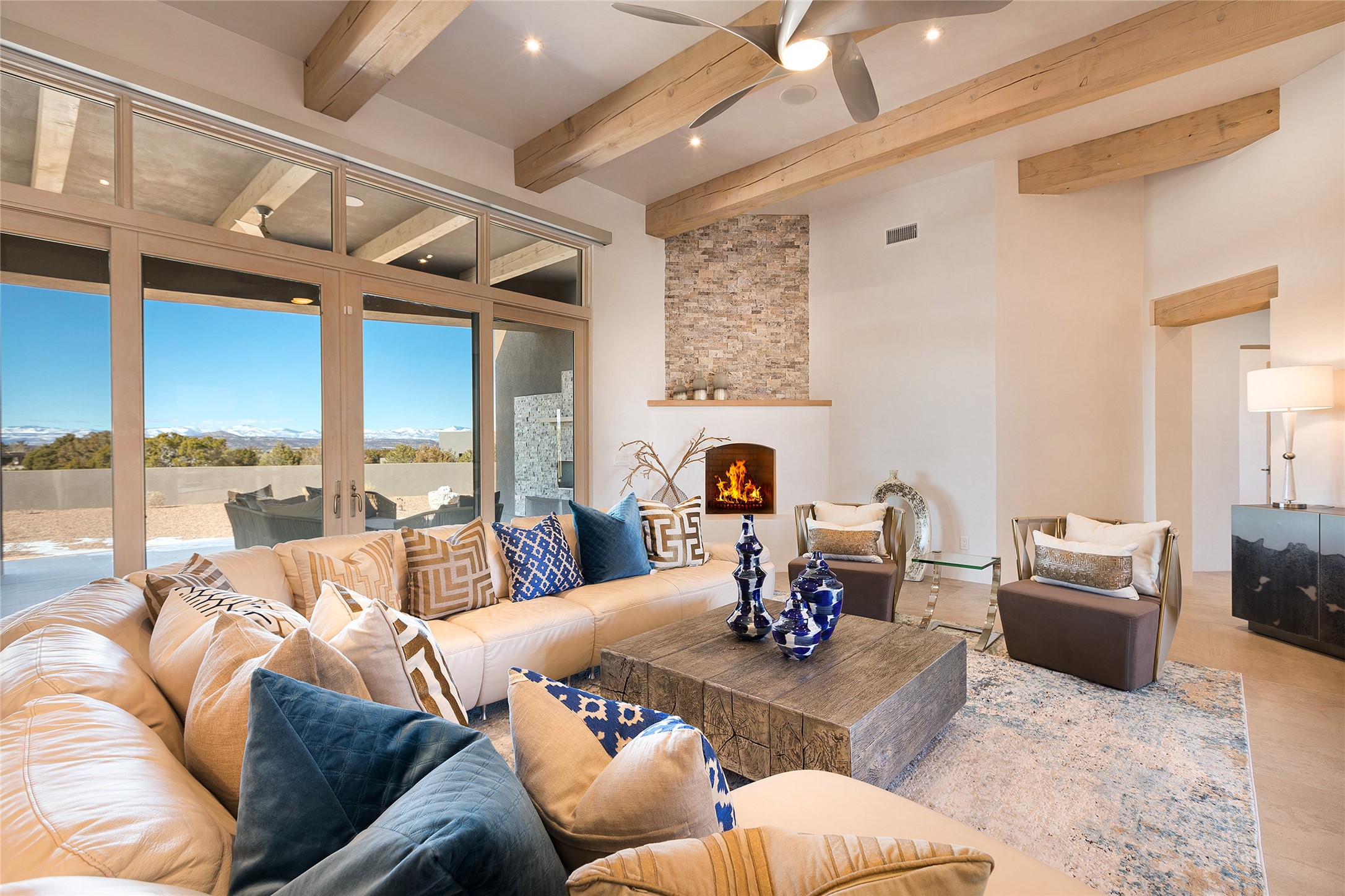 Las Campanas luxury at its finest. This rare, triumphant 2022-built Tour de Force residence excites with the ultimate blend of sophisticated design and spectacular Sunset Golf Course, Jemez Mountain, sunset, and Sangre de Cristo Mountain views. Thoughtfully designed, this exceptional residence offers an ideal entertainment experience with expansive interior and exterior entertainment areas. Privately accessed through a front entrance courtyard with a tranquil water feature, this exquisite home offers a professional designer chef's island kitchen with Wolf and Subzero appliances, a walk-in pantry, breakfast bar, and custom cabinetry. The open concept living areas include a spacious living and dining room with dramatic Jemez Mountain and golf course views, fireplace with stacked stone accents, and back portal access. The owner's suite offers golf course views, fireplace, portal access, and a spacious spa-like bath with a sauna, soaking tub, custom shower, dual vanities, and dual closets. Adjacent to the owner's suite is a private office or ideal exercise room. Guests enjoy true independence with a separate guest wing which offers two spacious ensuite bedrooms with private entrances, separated by a secondary office or living room. Luxury finishes include a roof top deck, white oak hardwood and porcelain flooring throughout, plaster walls, a Sonos sound system, built-in BBQ, designer landscape, and a 3 car garage with a heated 3rd bay.
