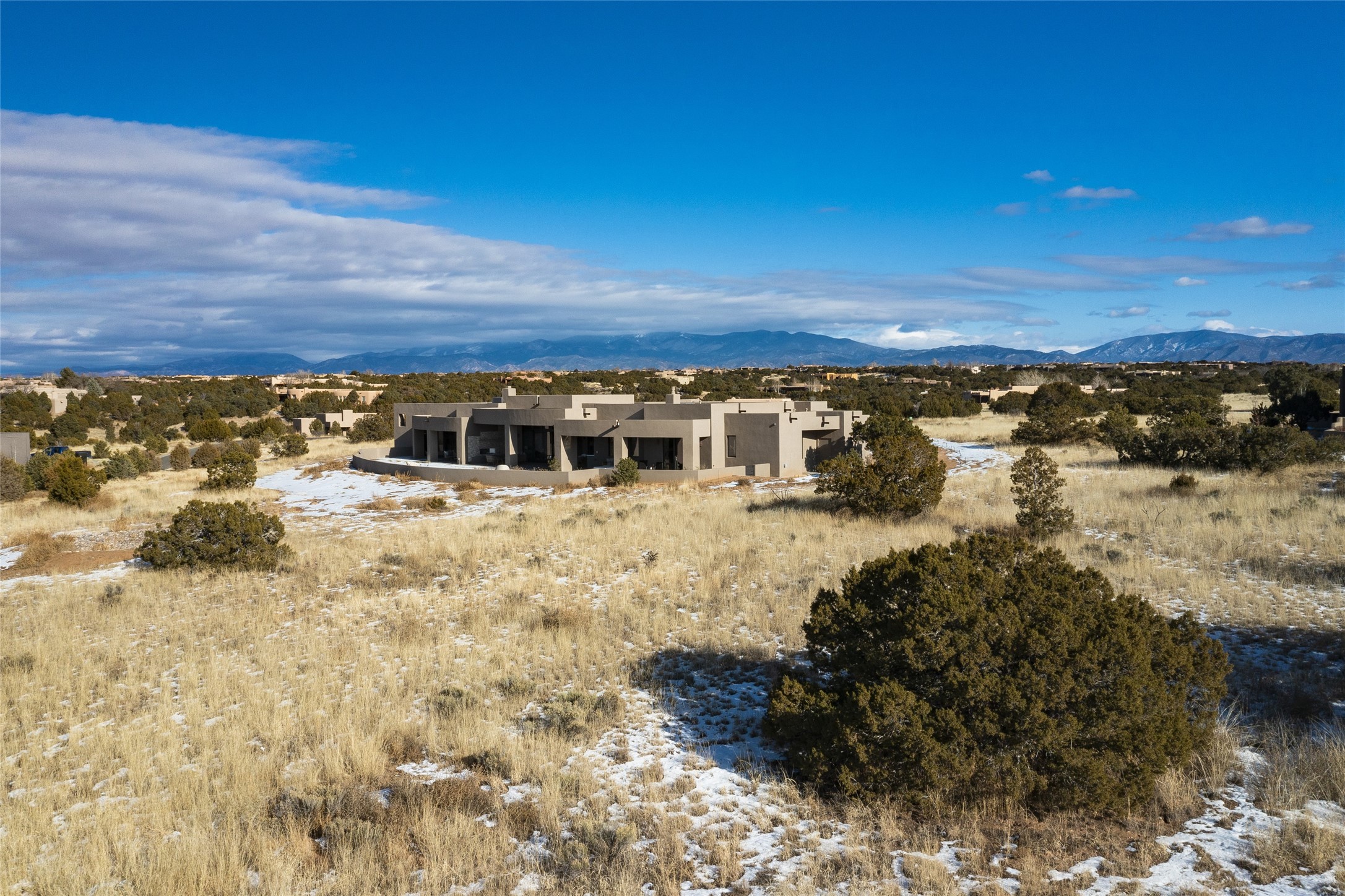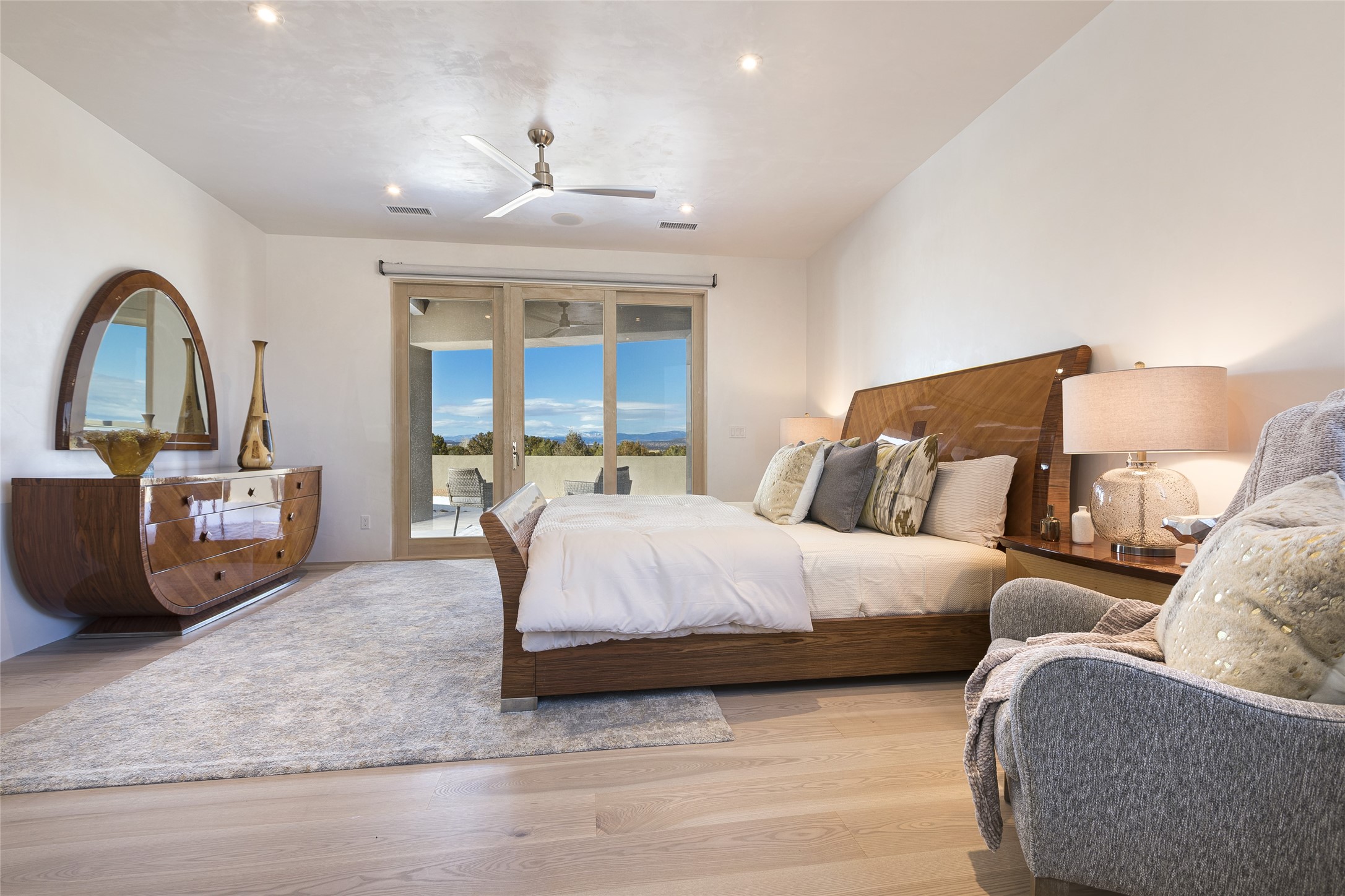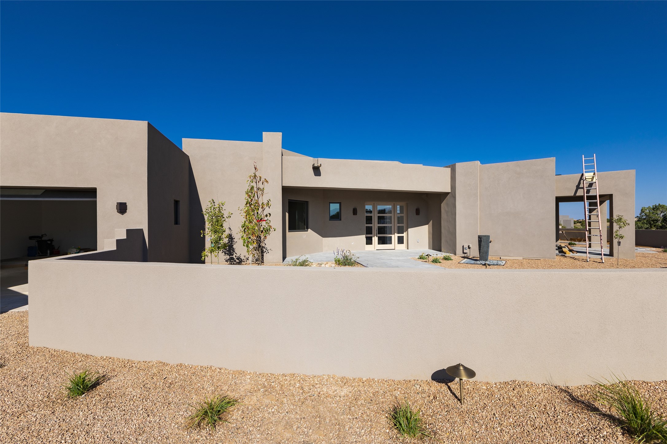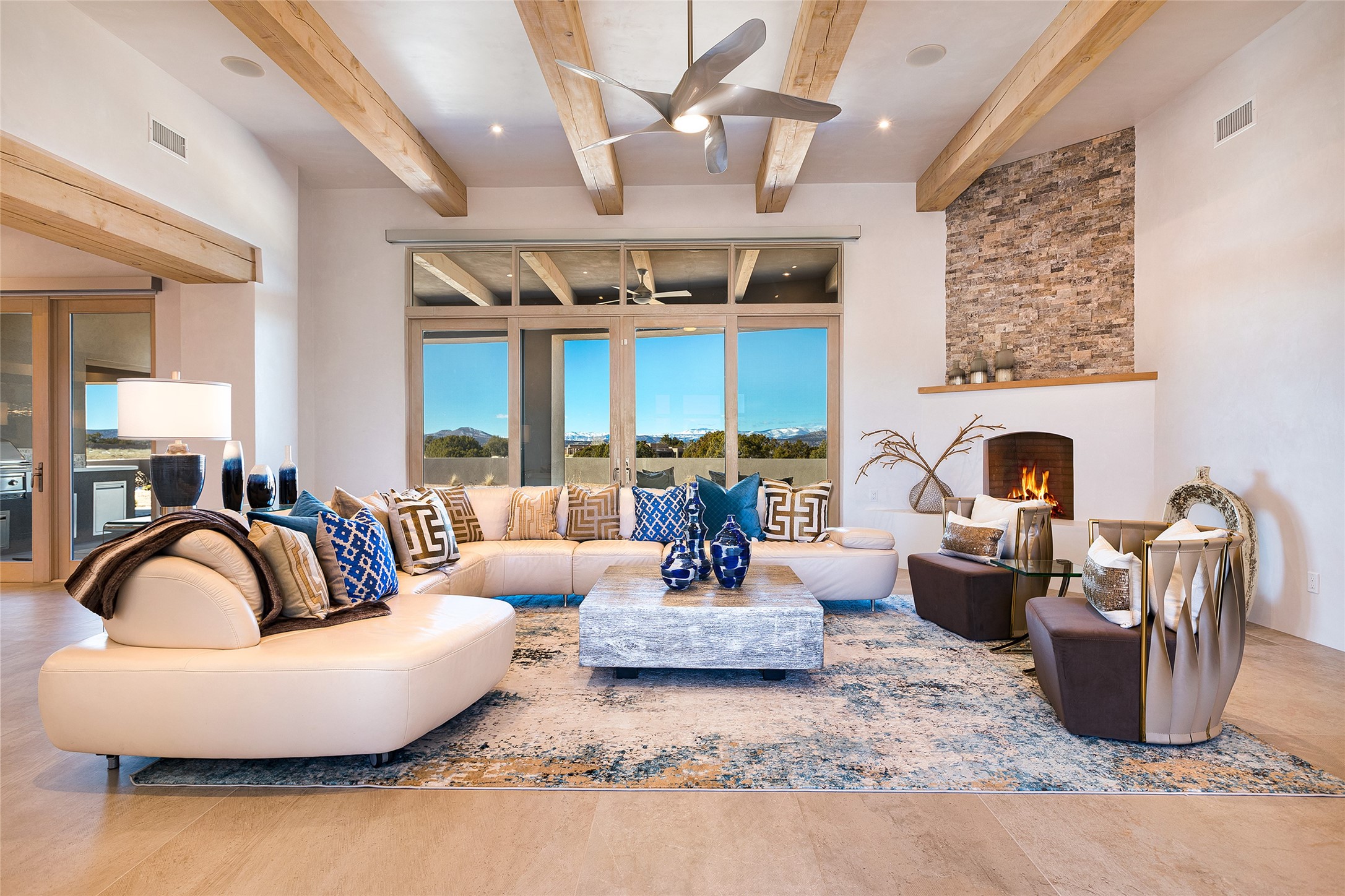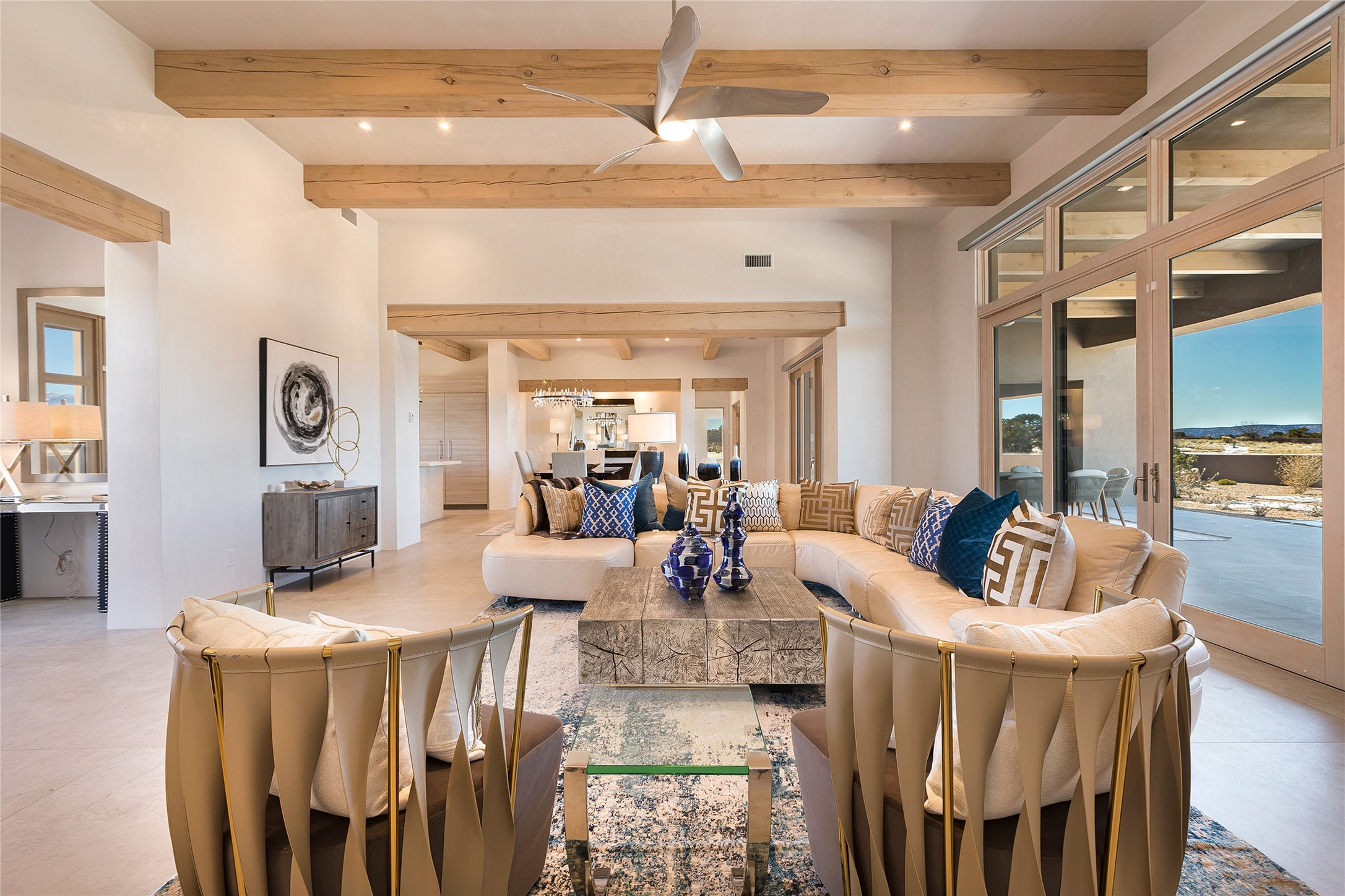 Las Campanas luxury at its finest. This rare, triumphant 2022-built Tour de Force residence excites with the ultimate blend of sophisticated design and spectacular Sunset Golf Course, Jemez Mountain, sunset, and Sangre de Cristo Mountain views. Thoughtfully designed, this exceptional residence offers an ideal entertainment experience with expansive interior and exterior entertainment areas. Privately accessed through a front entrance courtyard with a tranquil water feature, this exquisite home offers a professional designer chef's island kitchen with Wolf and Subzero appliances, a walk-in pantry, breakfast bar, and custom cabinetry. The open concept living areas include a spacious living and dining room with dramatic Jemez Mountain and golf course views, fireplace with stacked stone accents, and back portal access. The owner's suite offers golf course views, fireplace, portal access, and a spacious spa-like bath with a sauna, soaking tub, custom shower, dual vanities, and dual closets. Adjacent to the owner's suite is a private office or ideal exercise room. Guests enjoy true independence with a separate guest wing which offers two spacious ensuite bedrooms with private entrances, separated by a secondary office or living room. Luxury finishes include a roof top deck, white oak hardwood and porcelain flooring throughout, plaster walls, a Sonos sound system, built-in BBQ, designer landscape, and a 3 car garage with a heated 3rd bay.