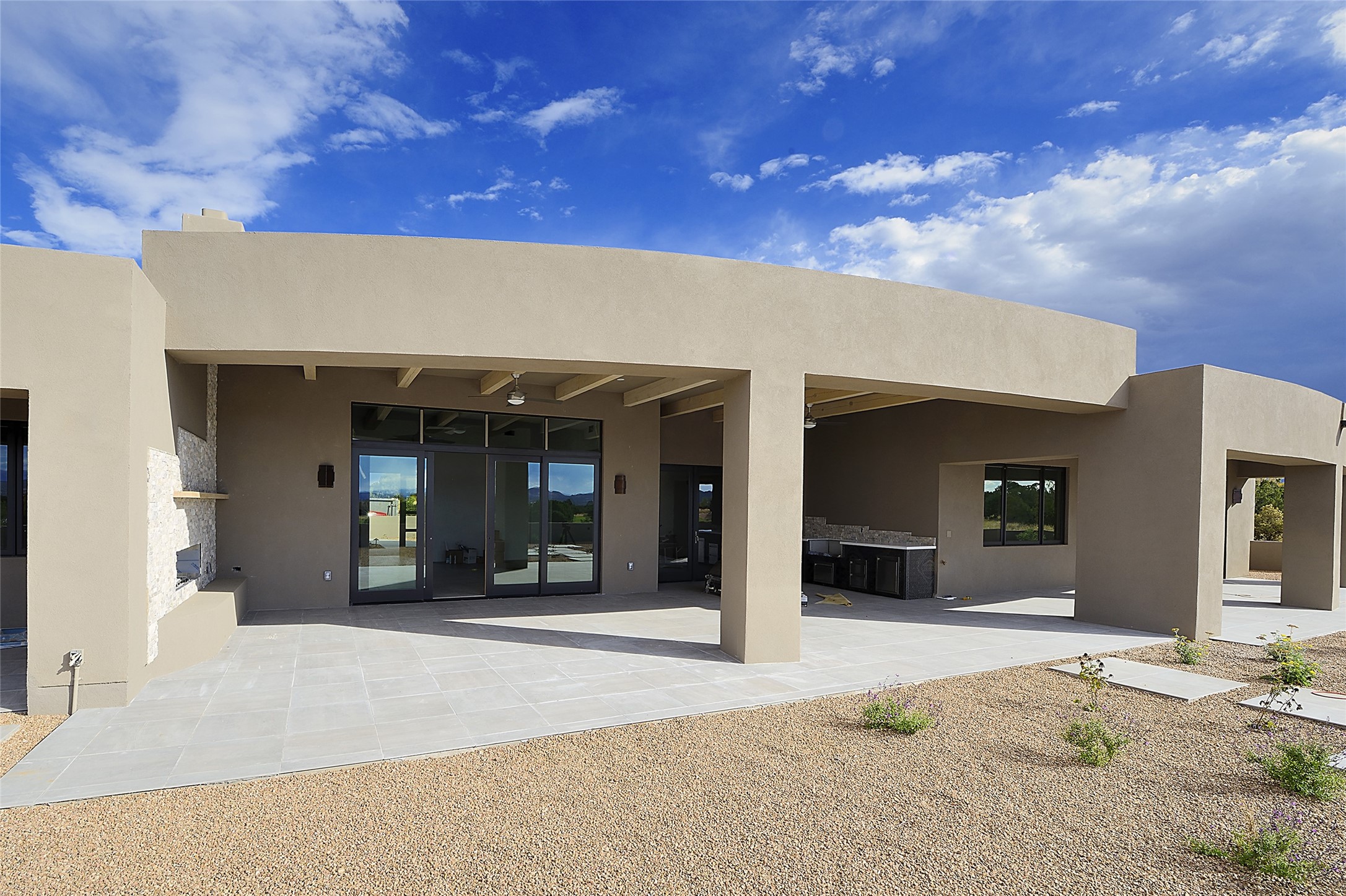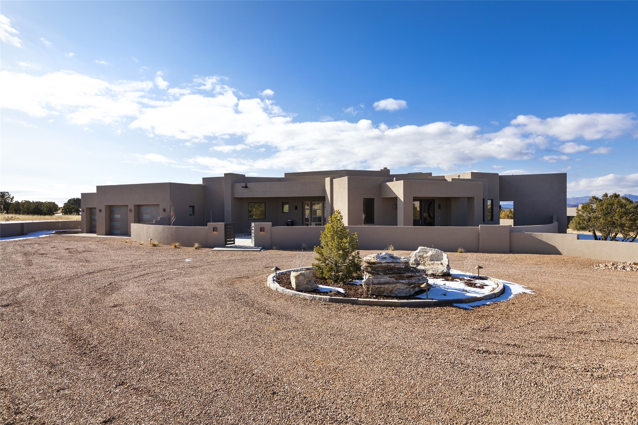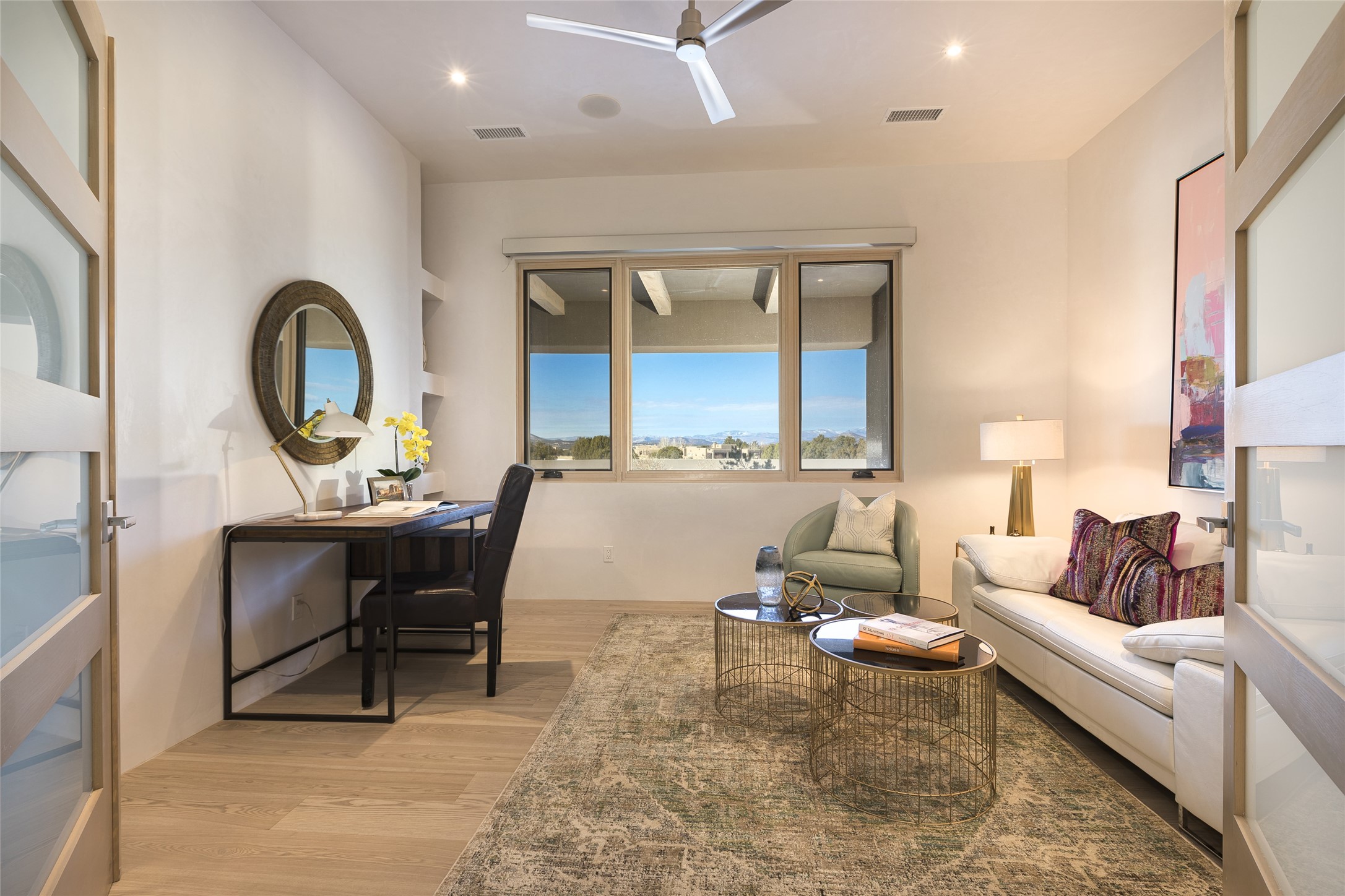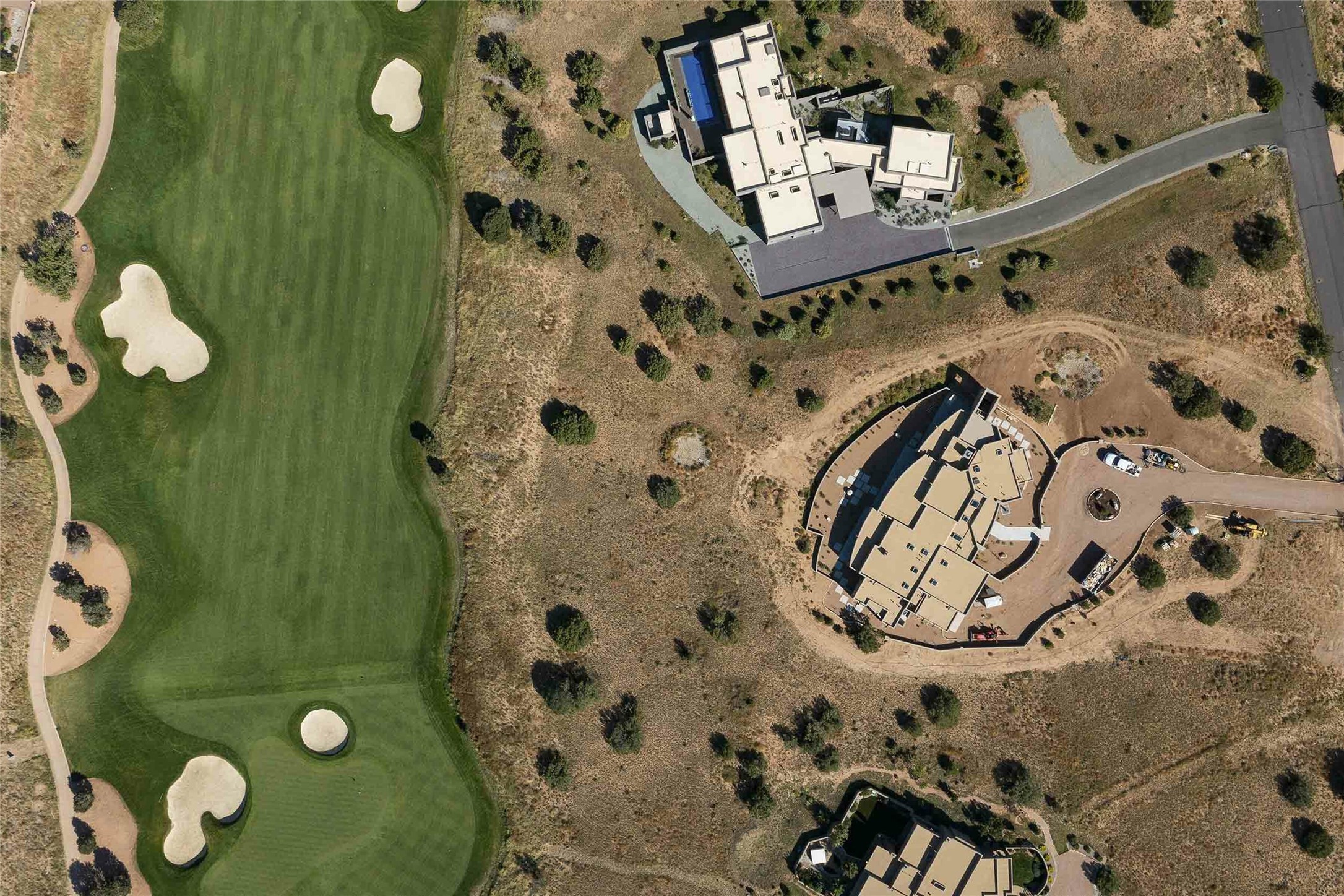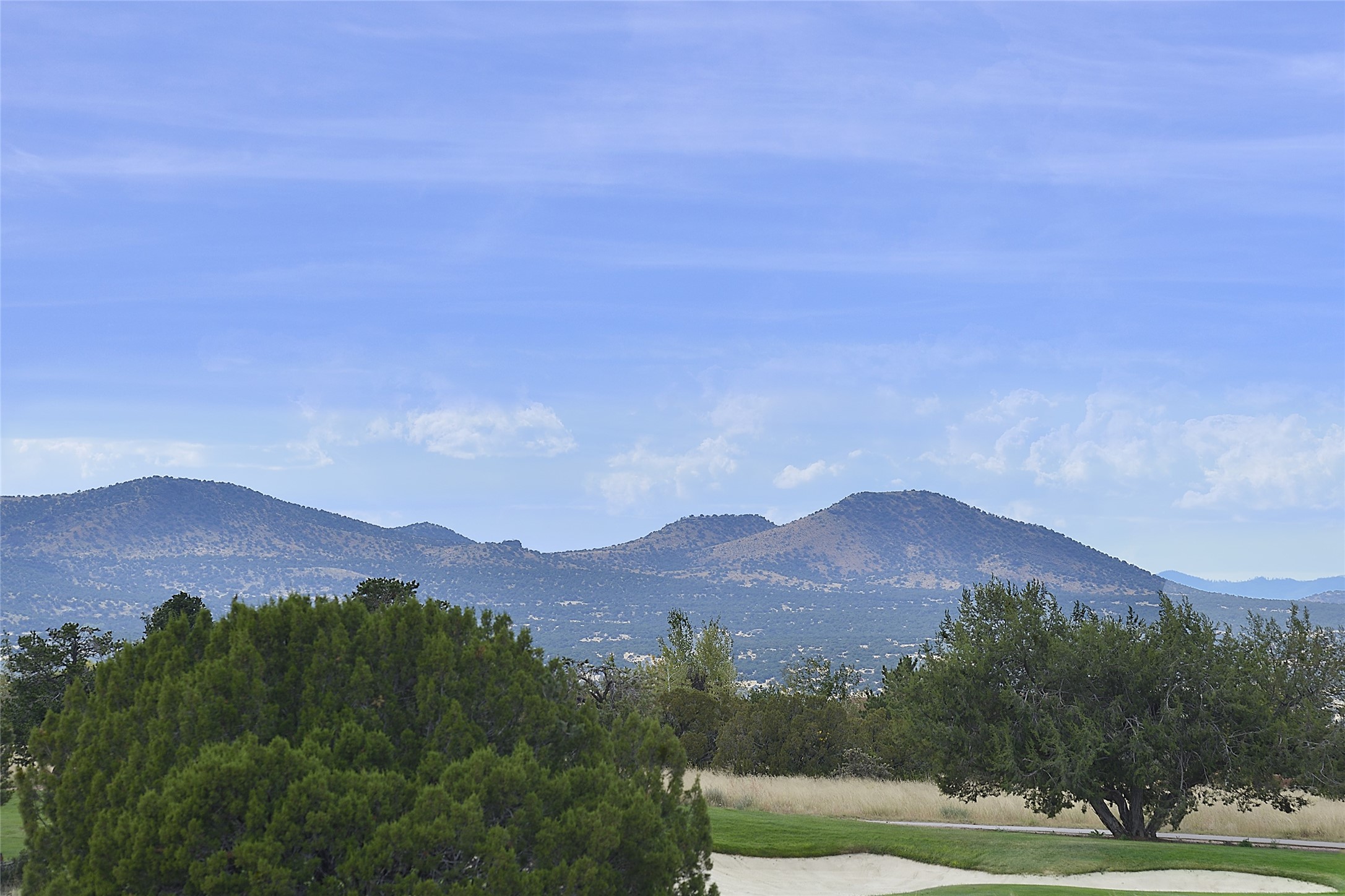 Las Campanas luxury at its finest. This rare, triumphant 2022-built Tour de Force residence excites with the ultimate blend of sophisticated design and spectacular Sunset Golf Course, Jemez Mountain, sunset, and Sangre de Cristo Mountain views. Thoughtfully designed, this exceptional residence offers an ideal entertainment experience with expansive interior and exterior entertainment areas. Privately accessed through a front entrance courtyard with a tranquil water feature, this exquisite home offers a professional designer chef's island kitchen with Wolf and Subzero appliances, a walk-in pantry, breakfast bar, and custom cabinetry. The open concept living areas include a spacious living and dining room with dramatic Jemez Mountain and golf course views, fireplace with stacked stone accents, and back portal access. The owner's suite offers golf course views, fireplace, portal access, and a spacious spa-like bath with a sauna, soaking tub, custom shower, dual vanities, and dual closets. Adjacent to the owner's suite is a private office or ideal exercise room. Guests enjoy true independence with a separate guest wing which offers two spacious ensuite bedrooms with private entrances, separated by a secondary office or living room. Luxury finishes include a roof top deck, white oak hardwood and porcelain flooring throughout, plaster walls, a Sonos sound system, built-in BBQ, designer landscape, and a 3 car garage with a heated 3rd bay.