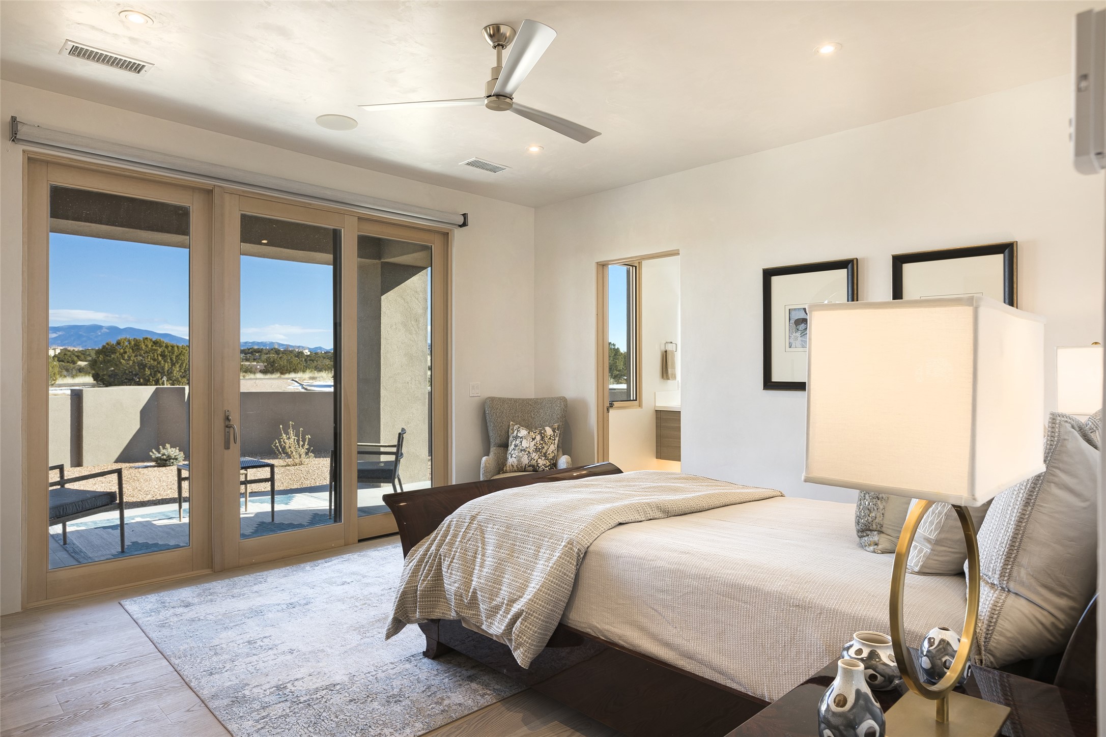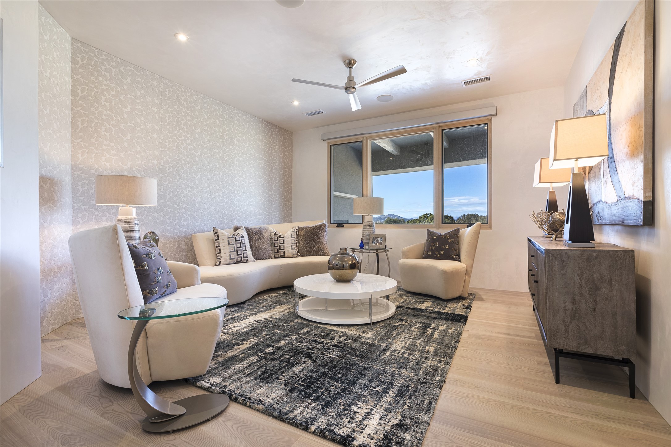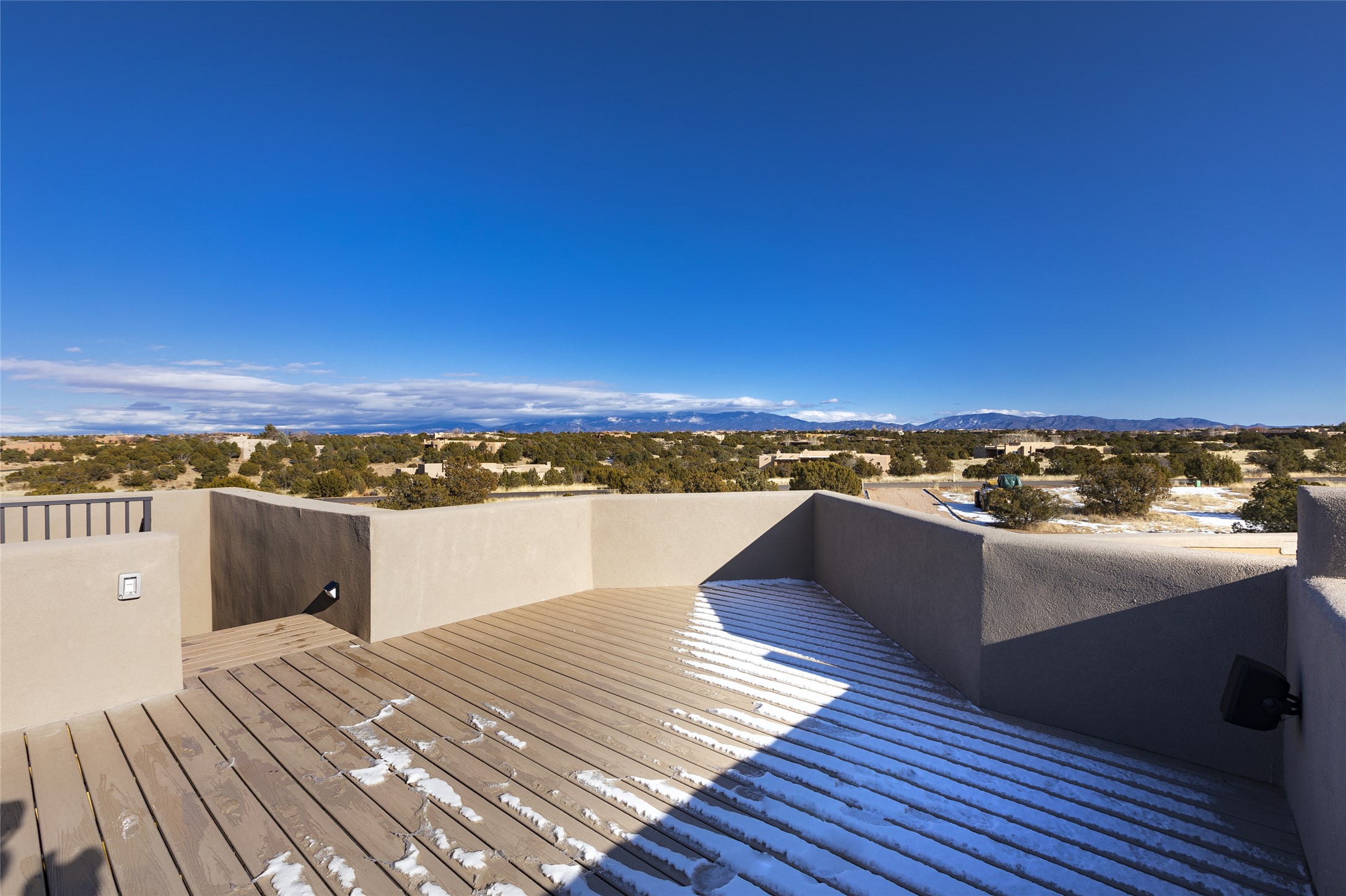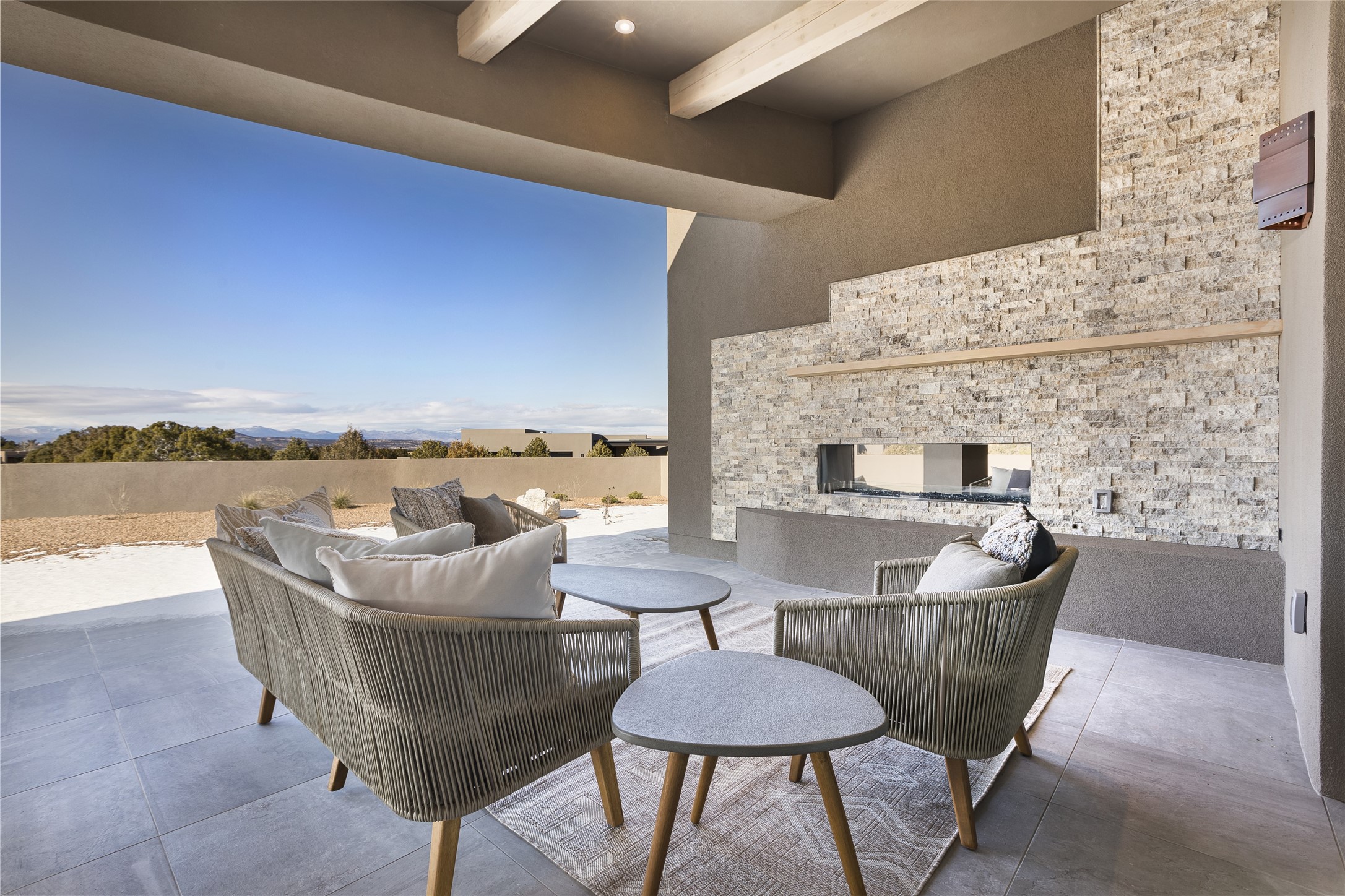 Las Campanas luxury at its finest. This rare, triumphant 2022-built Tour de Force residence excites with the ultimate blend of sophisticated design and spectacular Sunset Golf Course, Jemez Mountain, sunset, and Sangre de Cristo Mountain views. Thoughtfully designed, this exceptional residence offers an ideal entertainment experience with expansive interior and exterior entertainment areas. Privately accessed through a front entrance courtyard with a tranquil water feature, this exquisite home offers a professional designer chef's island kitchen with Wolf and Subzero appliances, a walk-in pantry, breakfast bar, and custom cabinetry. The open concept living areas include a spacious living and dining room with dramatic Jemez Mountain and golf course views, fireplace with stacked stone accents, and back portal access. The owner's suite offers golf course views, fireplace, portal access, and a spacious spa-like bath with a sauna, soaking tub, custom shower, dual vanities, and dual closets. Adjacent to the owner's suite is a private office or ideal exercise room. Guests enjoy true independence with a separate guest wing which offers two spacious ensuite bedrooms with private entrances, separated by a secondary office or living room. Luxury finishes include a roof top deck, white oak hardwood and porcelain flooring throughout, plaster walls, a Sonos sound system, built-in BBQ, designer landscape, and a 3 car garage with a heated 3rd bay.