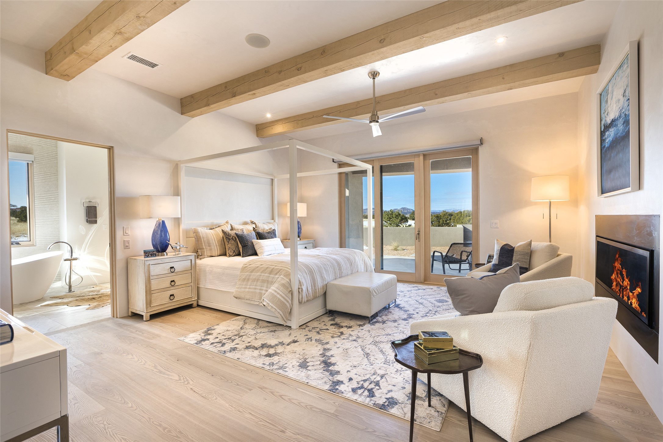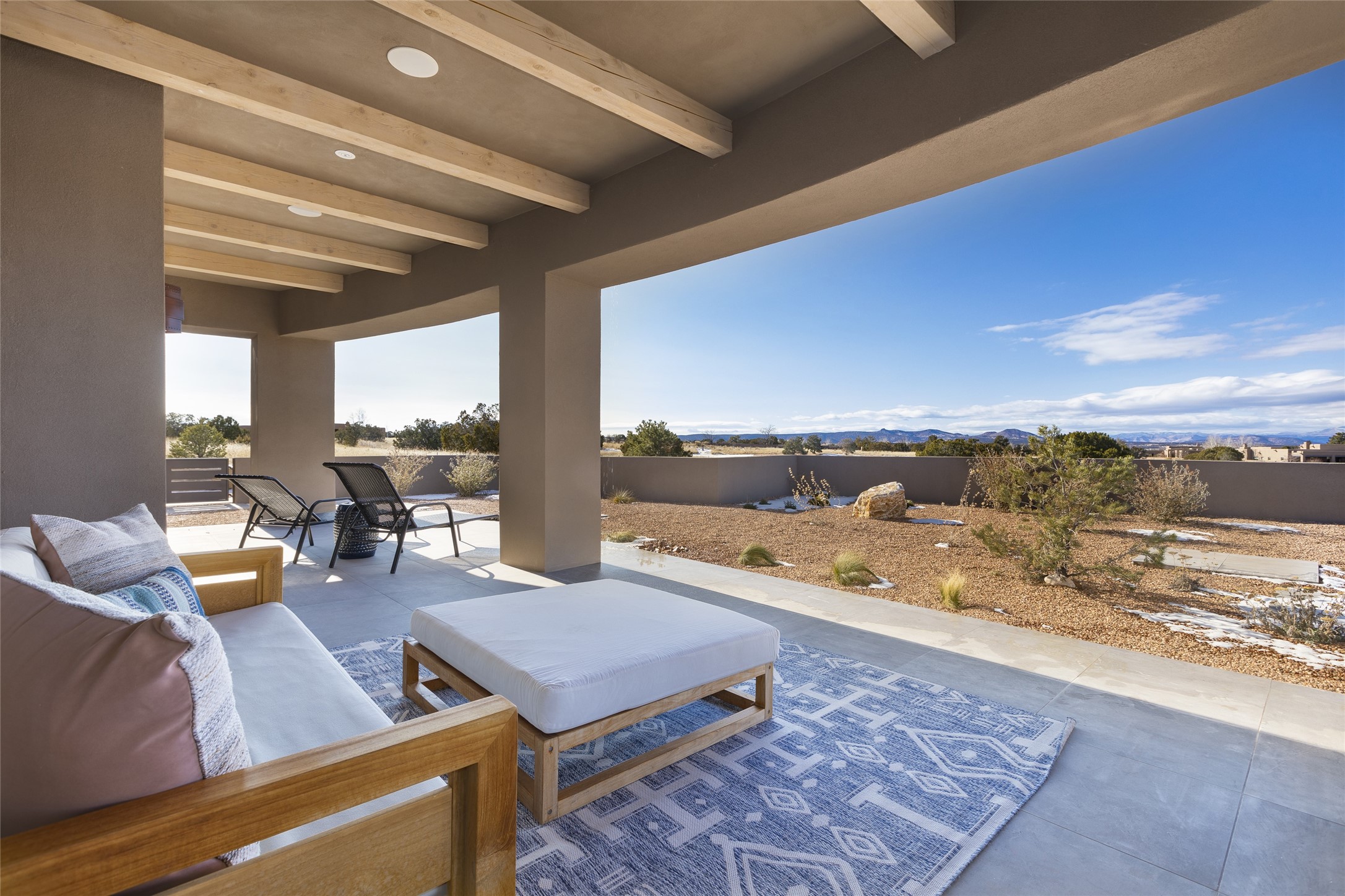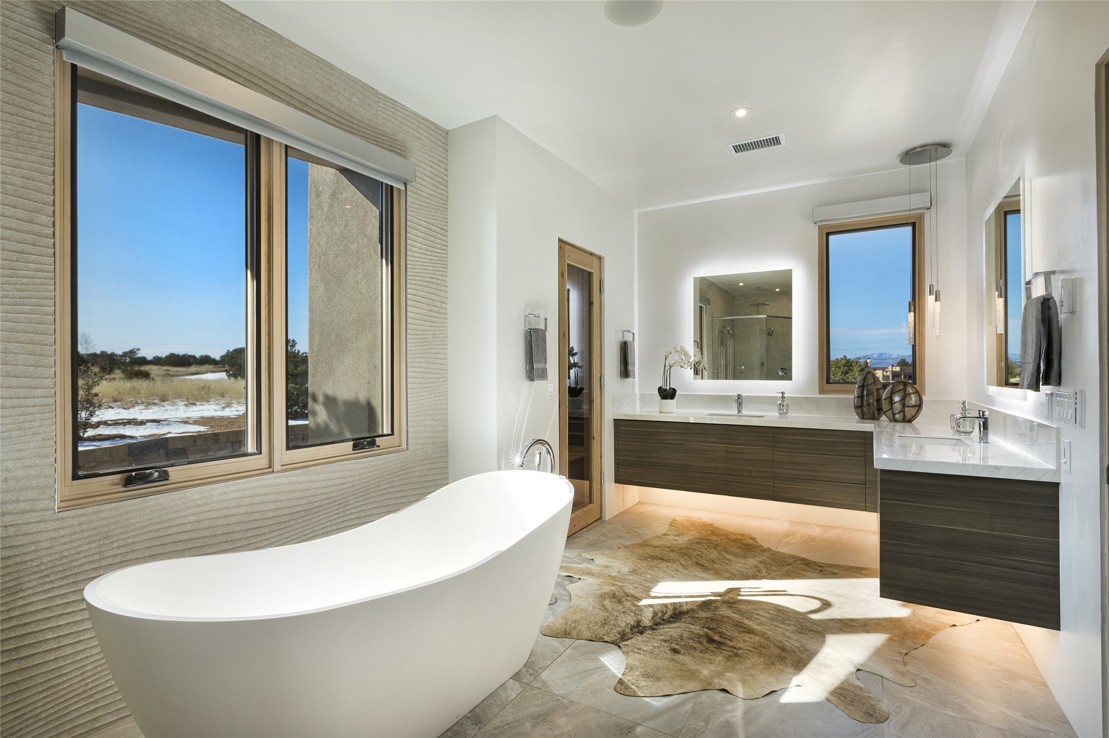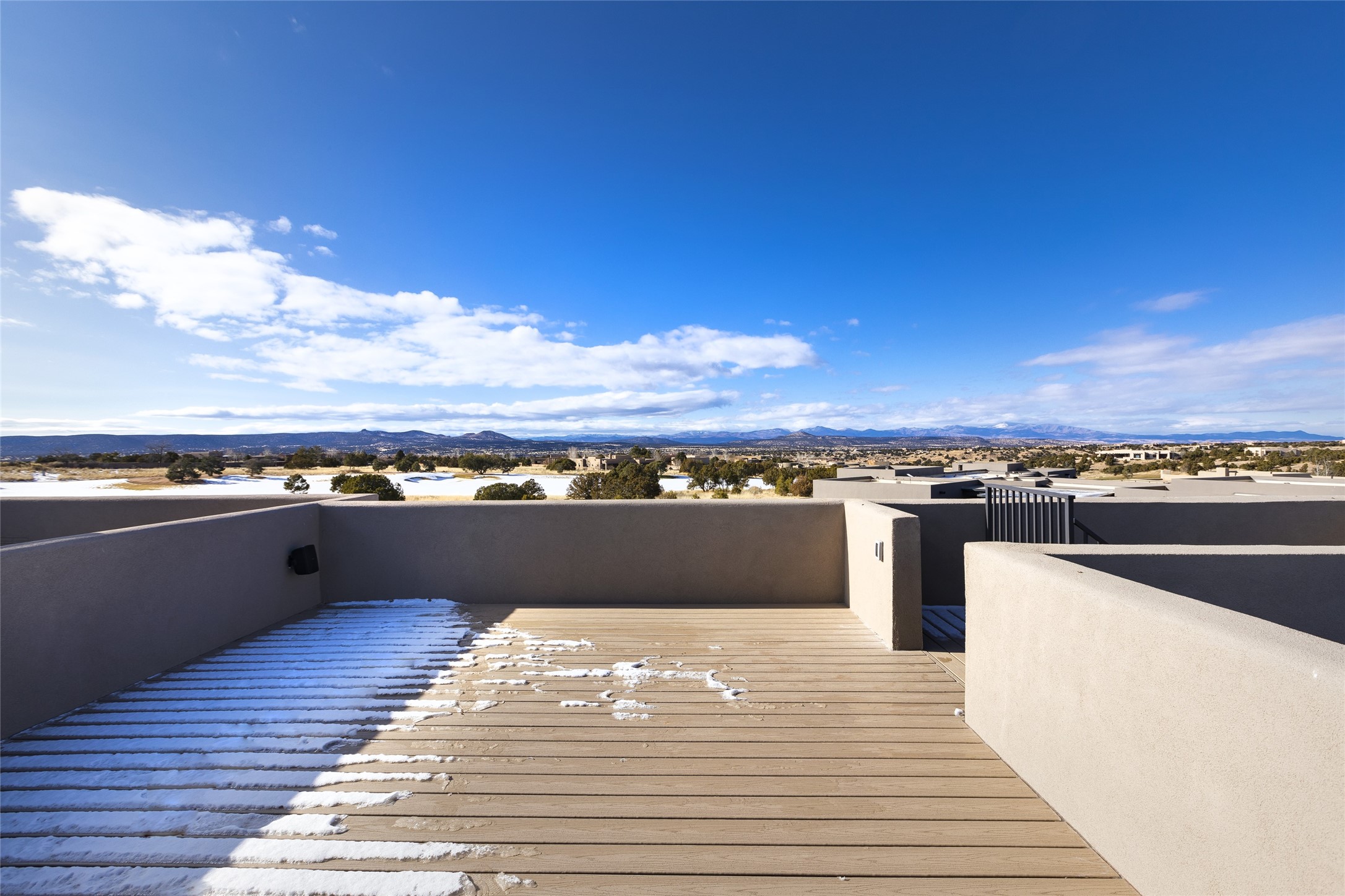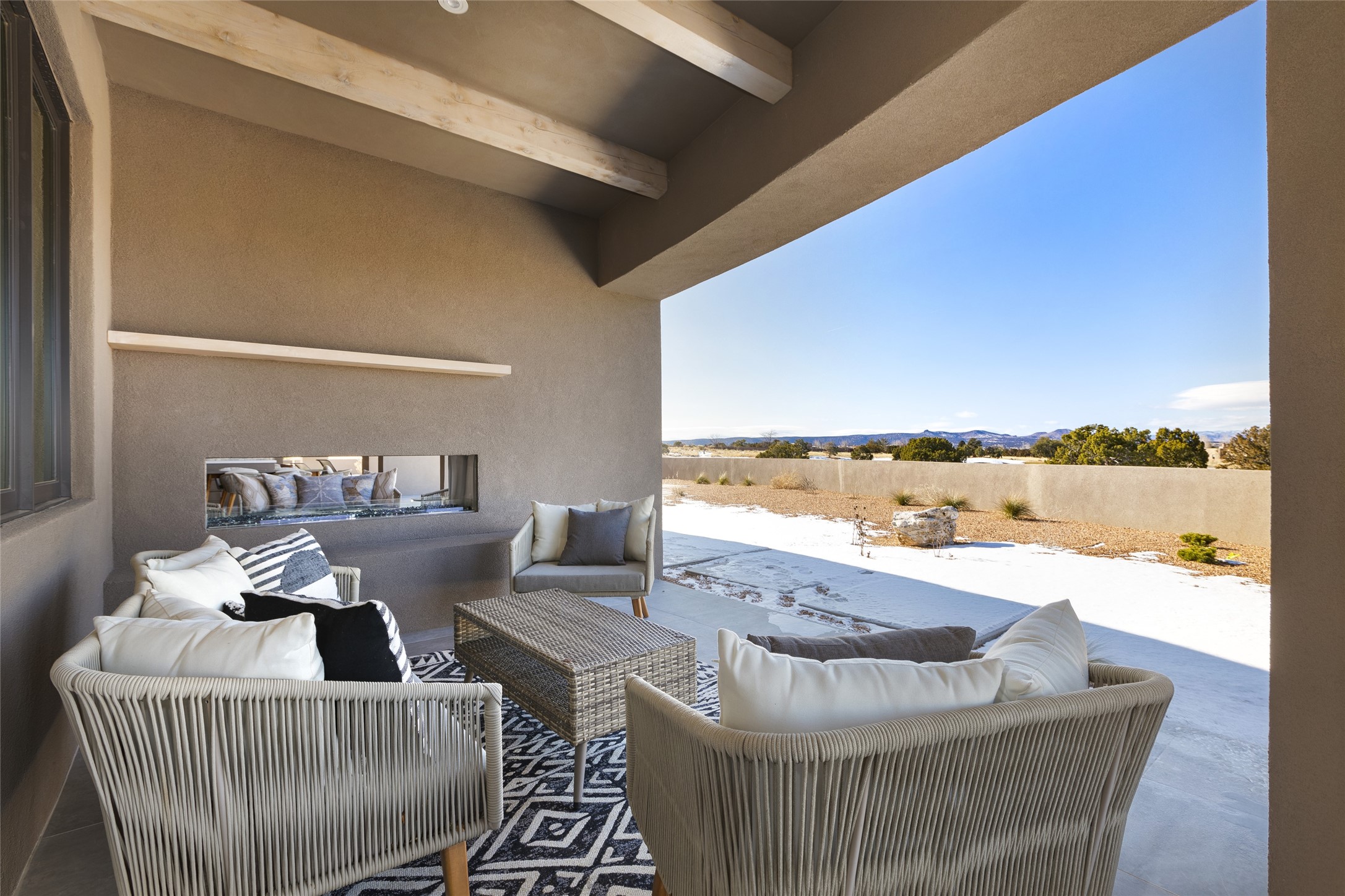 Las Campanas luxury at its finest. This rare, triumphant 2022-built Tour de Force residence excites with the ultimate blend of sophisticated design and spectacular Sunset Golf Course, Jemez Mountain, sunset, and Sangre de Cristo Mountain views. Thoughtfully designed, this exceptional residence offers an ideal entertainment experience with expansive interior and exterior entertainment areas. Privately accessed through a front entrance courtyard with a tranquil water feature, this exquisite home offers a professional designer chef's island kitchen with Wolf and Subzero appliances, a walk-in pantry, breakfast bar, and custom cabinetry. The open concept living areas include a spacious living and dining room with dramatic Jemez Mountain and golf course views, fireplace with stacked stone accents, and back portal access. The owner's suite offers golf course views, fireplace, portal access, and a spacious spa-like bath with a sauna, soaking tub, custom shower, dual vanities, and dual closets. Adjacent to the owner's suite is a private office or ideal exercise room. Guests enjoy true independence with a separate guest wing which offers two spacious ensuite bedrooms with private entrances, separated by a secondary office or living room. Luxury finishes include a roof top deck, white oak hardwood and porcelain flooring throughout, plaster walls, a Sonos sound system, built-in BBQ, designer landscape, and a 3 car garage with a heated 3rd bay.