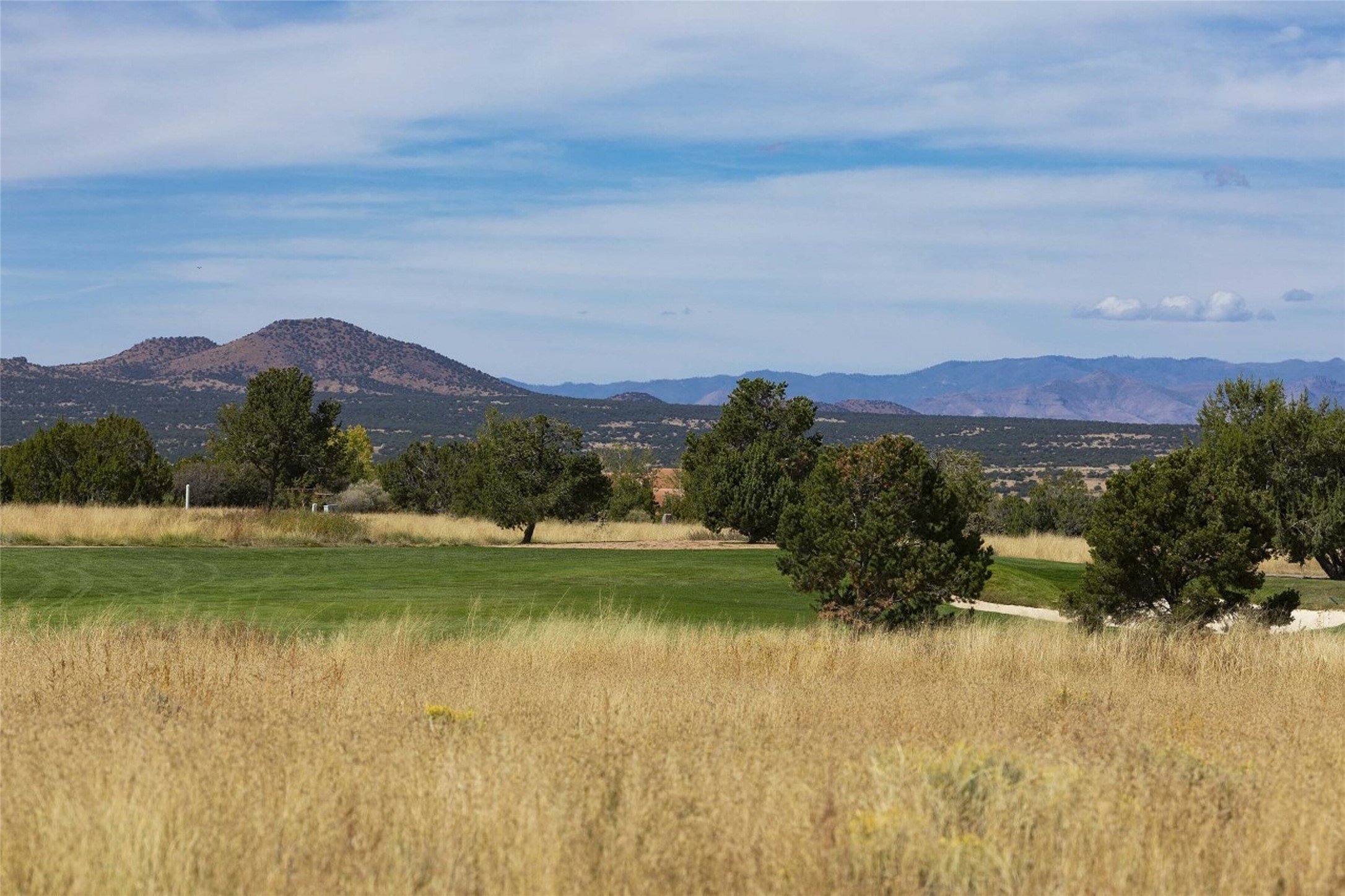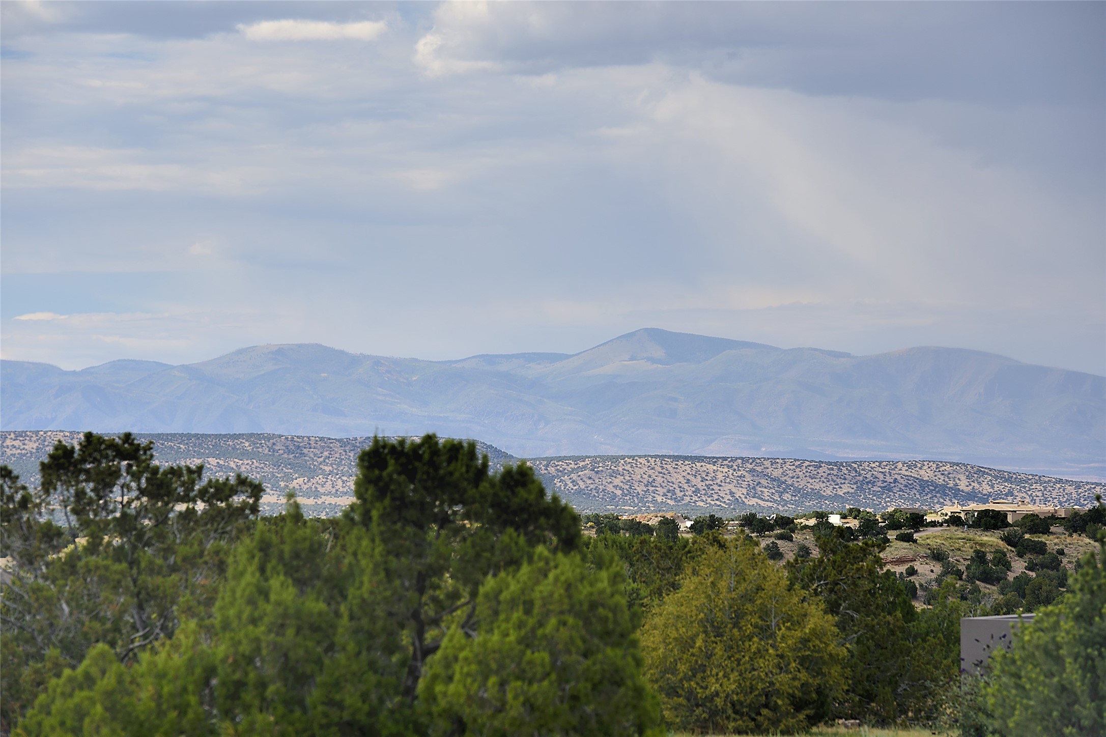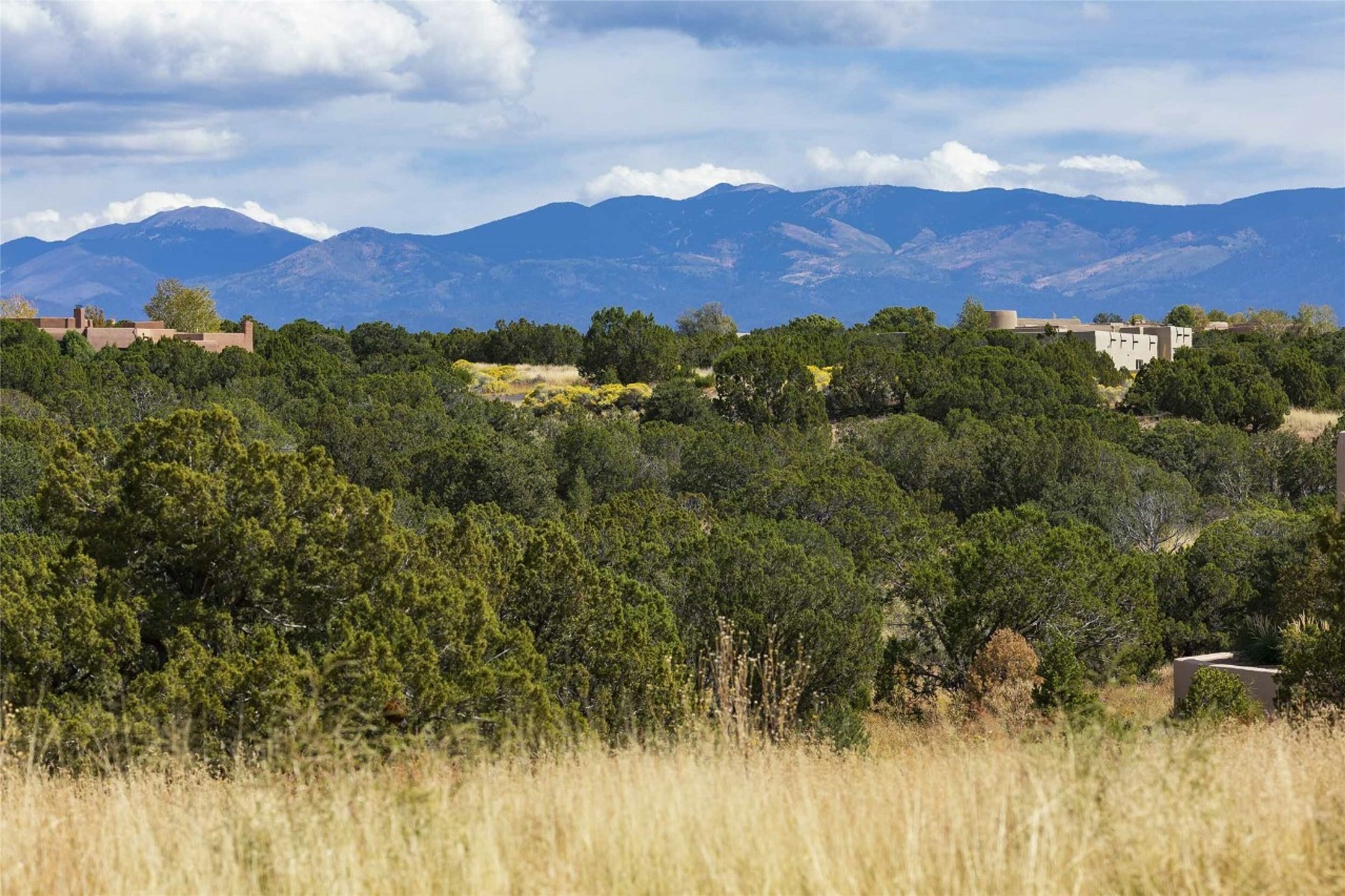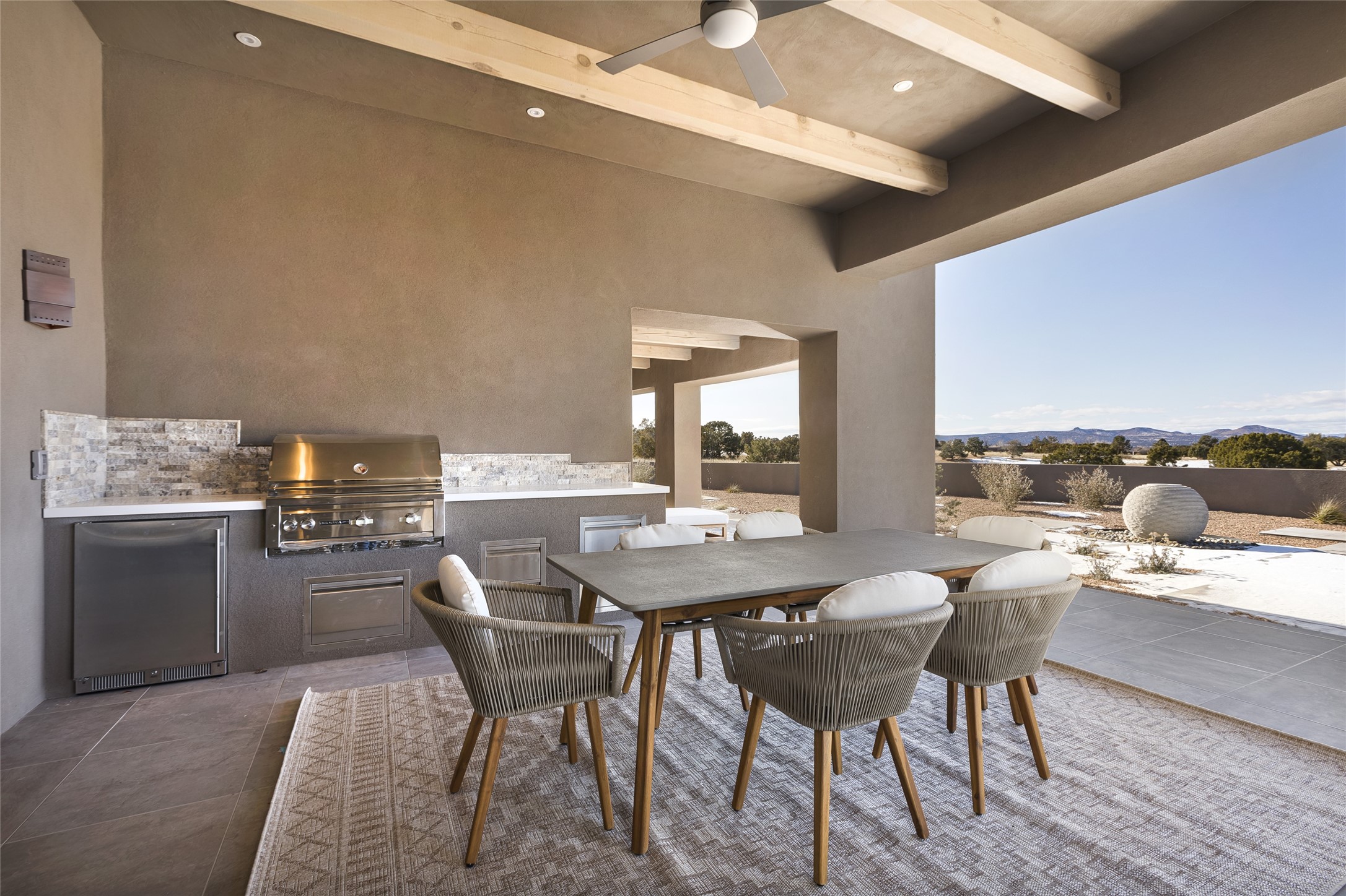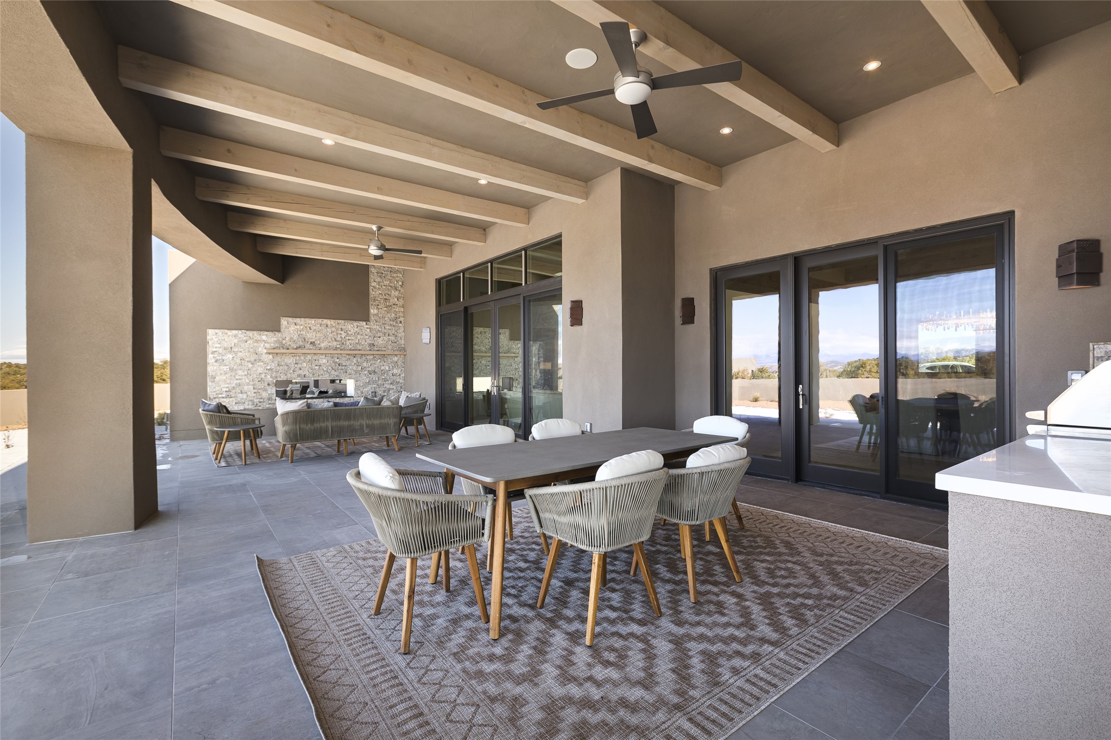 Las Campanas luxury at its finest. This rare, triumphant 2022-built Tour de Force residence excites with the ultimate blend of sophisticated design and spectacular Sunset Golf Course, Jemez Mountain, sunset, and Sangre de Cristo Mountain views. Thoughtfully designed, this exceptional residence offers an ideal entertainment experience with expansive interior and exterior entertainment areas. Privately accessed through a front entrance courtyard with a tranquil water feature, this exquisite home offers a professional designer chef's island kitchen with Wolf and Subzero appliances, a walk-in pantry, breakfast bar, and custom cabinetry. The open concept living areas include a spacious living and dining room with dramatic Jemez Mountain and golf course views, fireplace with stacked stone accents, and back portal access. The owner's suite offers golf course views, fireplace, portal access, and a spacious spa-like bath with a sauna, soaking tub, custom shower, dual vanities, and dual closets. Adjacent to the owner's suite is a private office or ideal exercise room. Guests enjoy true independence with a separate guest wing which offers two spacious ensuite bedrooms with private entrances, separated by a secondary office or living room. Luxury finishes include a roof top deck, white oak hardwood and porcelain flooring throughout, plaster walls, a Sonos sound system, built-in BBQ, designer landscape, and a 3 car garage with a heated 3rd bay.