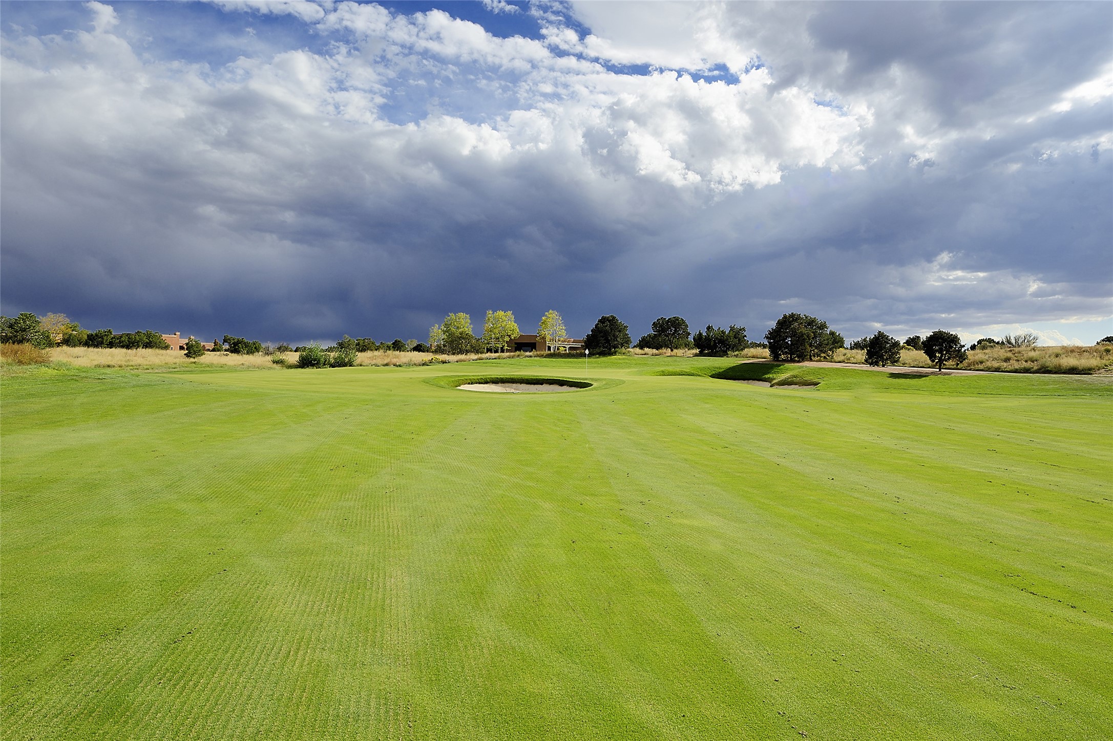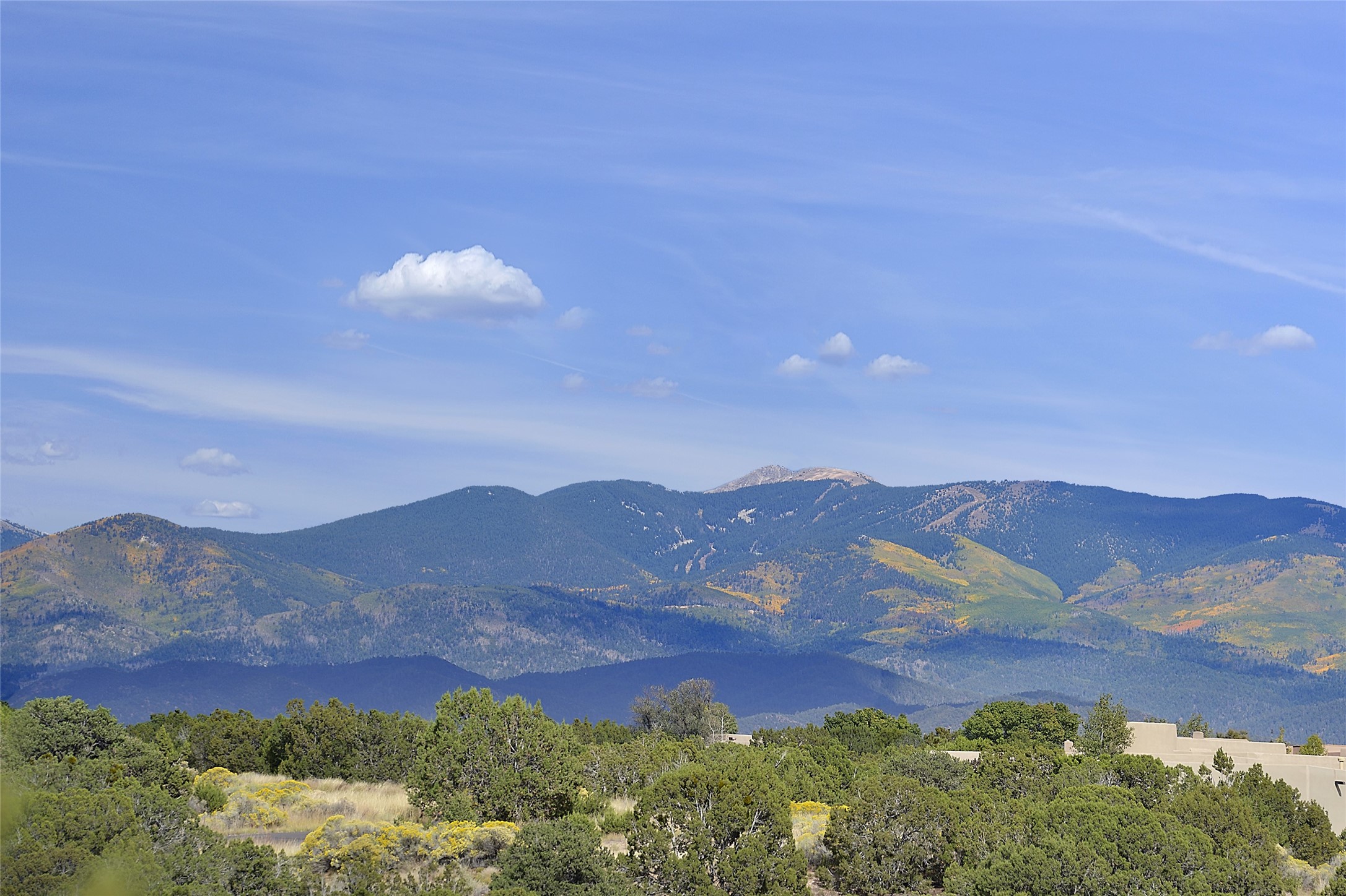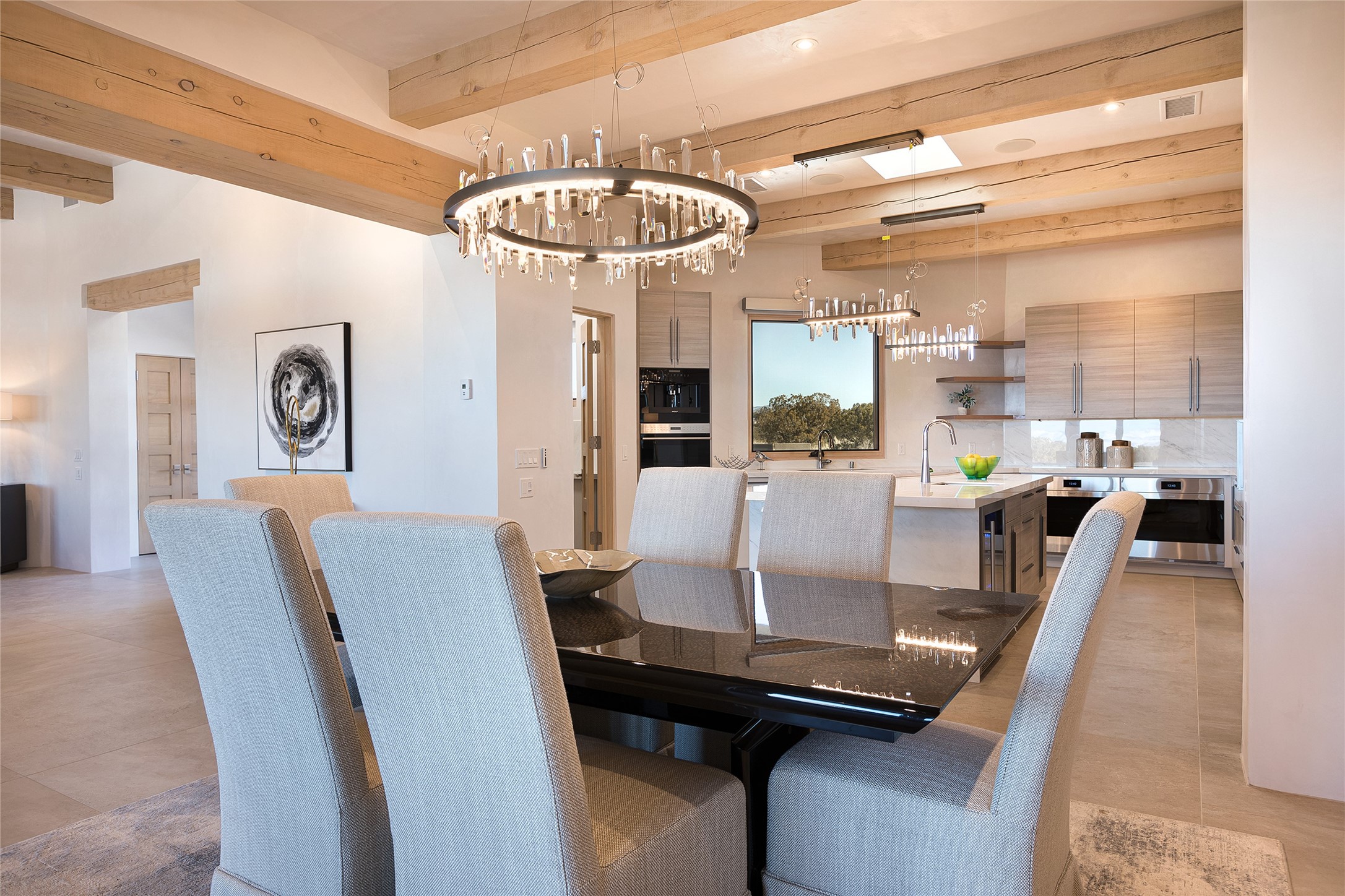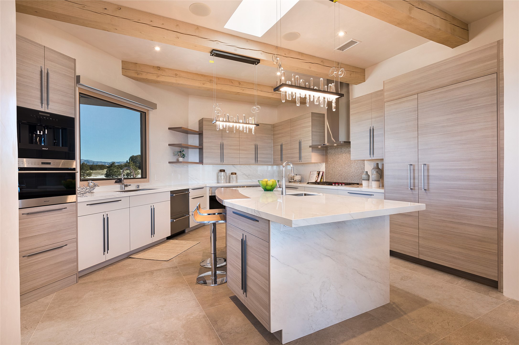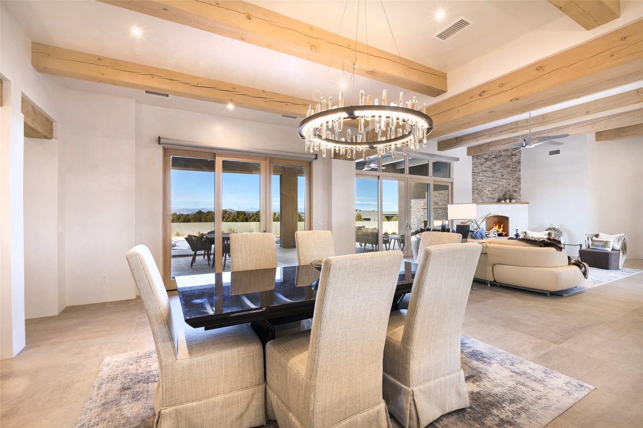 Las Campanas luxury at its finest. This rare, triumphant 2022-built Tour de Force residence excites with the ultimate blend of sophisticated design and spectacular Sunset Golf Course, Jemez Mountain, sunset, and Sangre de Cristo Mountain views. Thoughtfully designed, this exceptional residence offers an ideal entertainment experience with expansive interior and exterior entertainment areas. Privately accessed through a front entrance courtyard with a tranquil water feature, this exquisite home offers a professional designer chef's island kitchen with Wolf and Subzero appliances, a walk-in pantry, breakfast bar, and custom cabinetry. The open concept living areas include a spacious living and dining room with dramatic Jemez Mountain and golf course views, fireplace with stacked stone accents, and back portal access. The owner's suite offers golf course views, fireplace, portal access, and a spacious spa-like bath with a sauna, soaking tub, custom shower, dual vanities, and dual closets. Adjacent to the owner's suite is a private office or ideal exercise room. Guests enjoy true independence with a separate guest wing which offers two spacious ensuite bedrooms with private entrances, separated by a secondary office or living room. Luxury finishes include a roof top deck, white oak hardwood and porcelain flooring throughout, plaster walls, a Sonos sound system, built-in BBQ, designer landscape, and a 3 car garage with a heated 3rd bay.