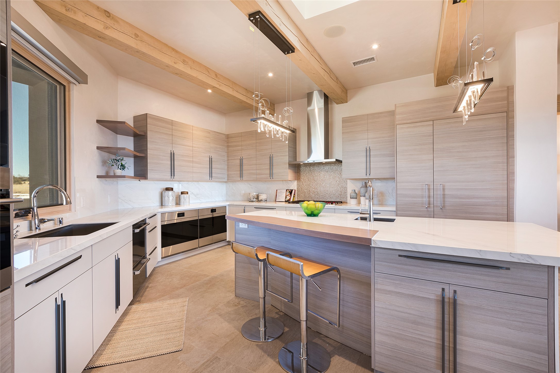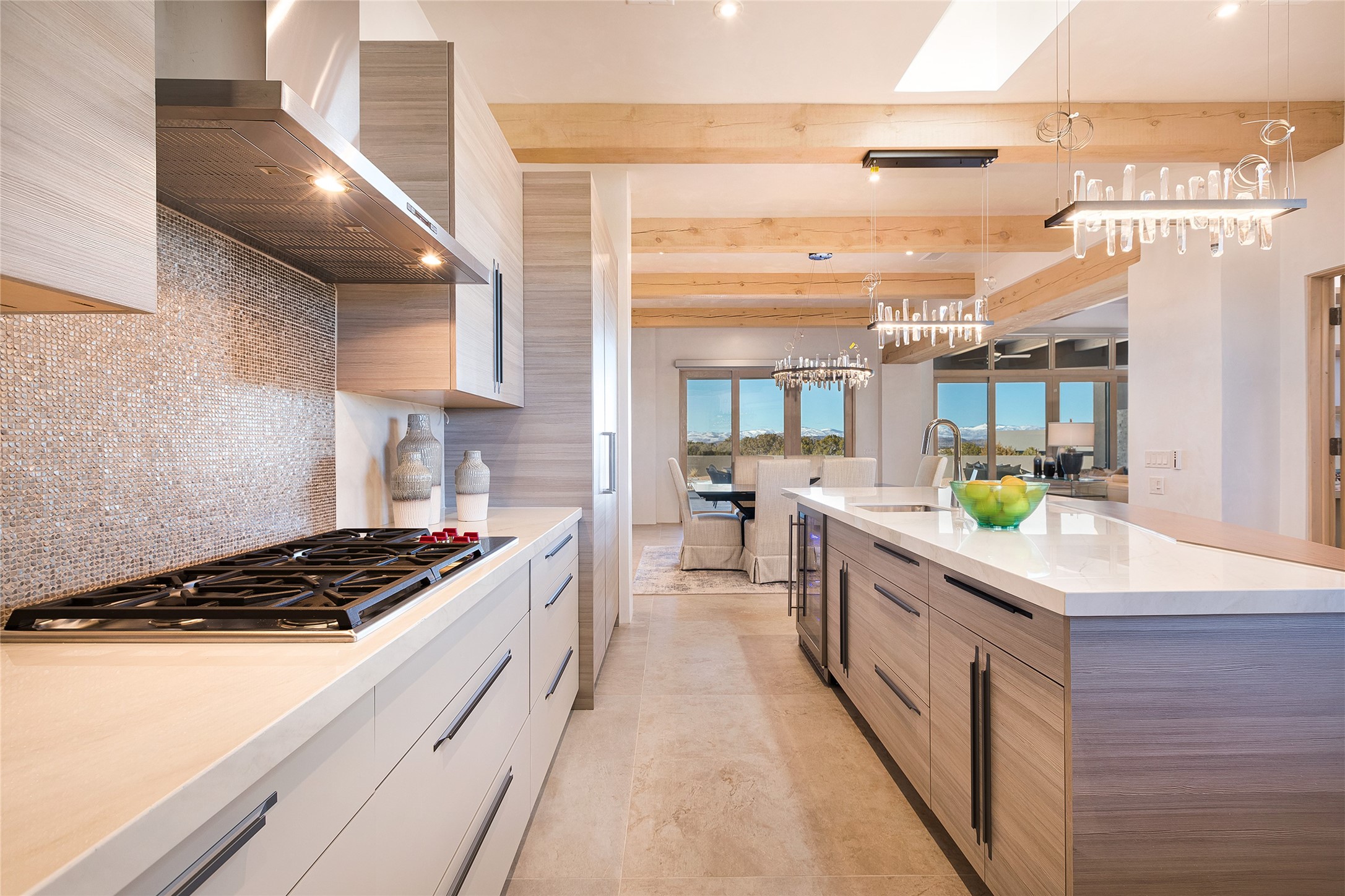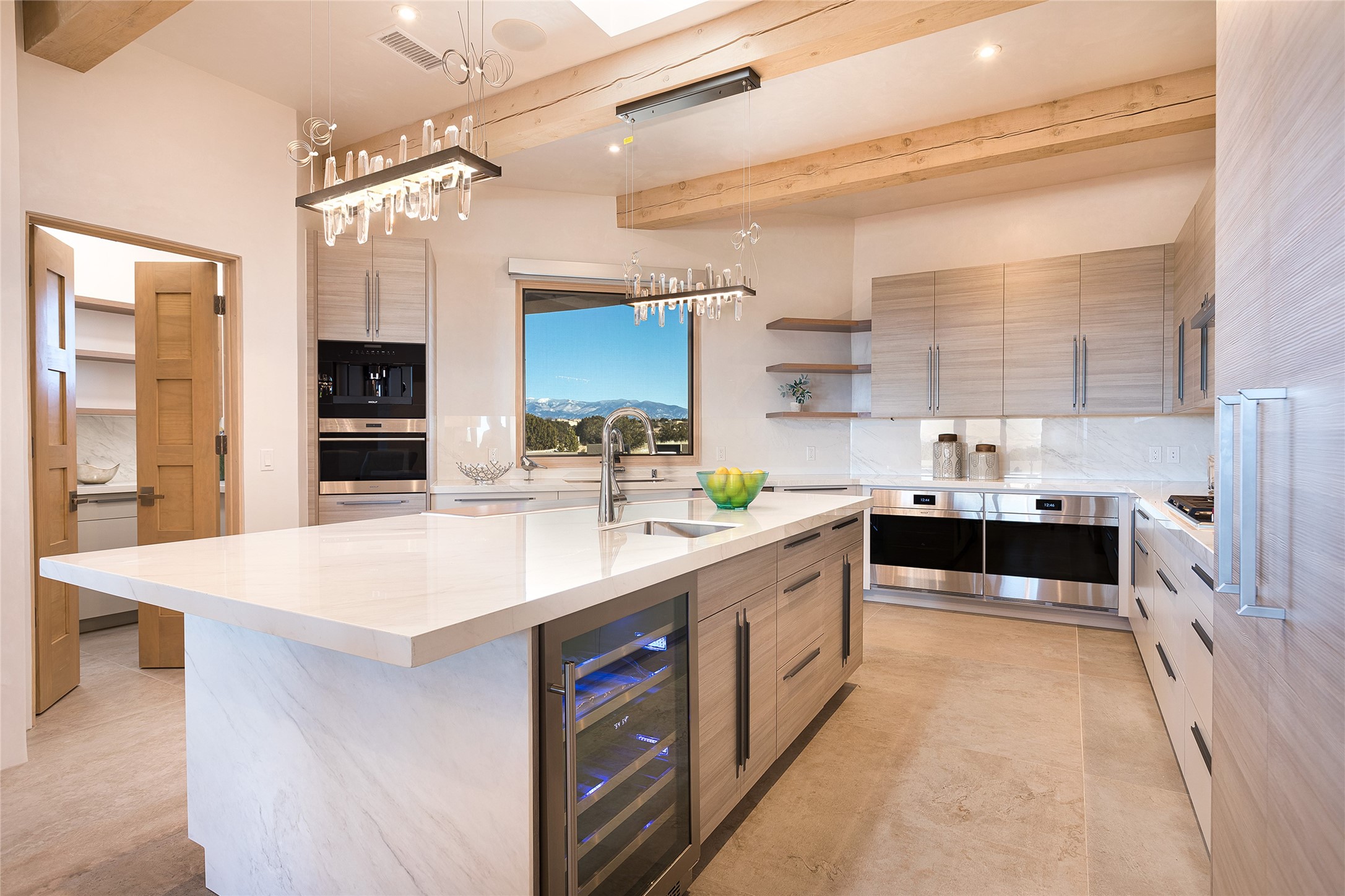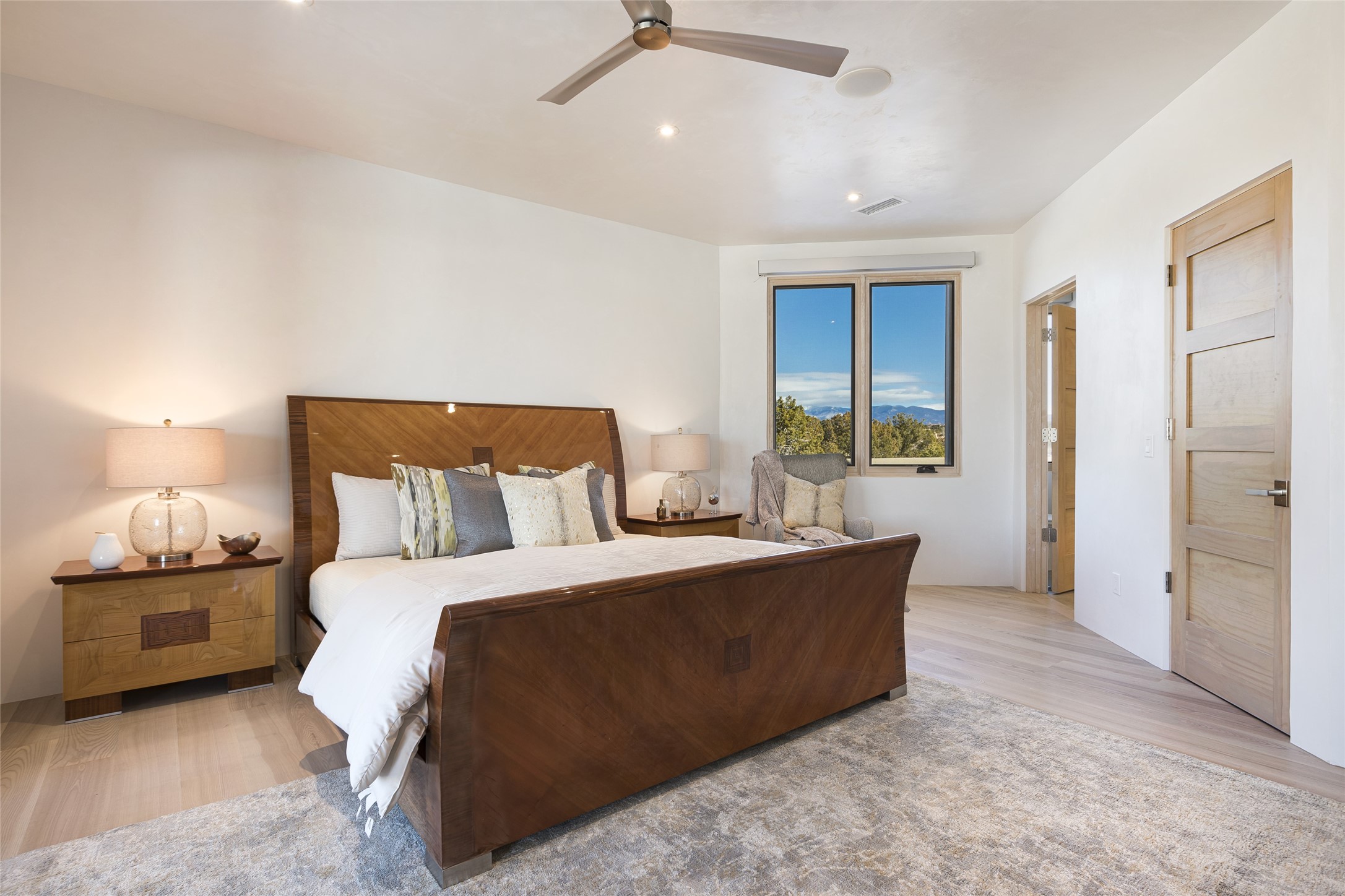 Las Campanas luxury at its finest. This rare, triumphant 2022-built Tour de Force residence excites with the ultimate blend of sophisticated design and spectacular Sunset Golf Course, Jemez Mountain, sunset, and Sangre de Cristo Mountain views. Thoughtfully designed, this exceptional residence offers an ideal entertainment experience with expansive interior and exterior entertainment areas. Privately accessed through a front entrance courtyard with a tranquil water feature, this exquisite home offers a professional designer chef's island kitchen with Wolf and Subzero appliances, a walk-in pantry, breakfast bar, and custom cabinetry. The open concept living areas include a spacious living and dining room with dramatic Jemez Mountain and golf course views, fireplace with stacked stone accents, and back portal access. The owner's suite offers golf course views, fireplace, portal access, and a spacious spa-like bath with a sauna, soaking tub, custom shower, dual vanities, and dual closets. Adjacent to the owner's suite is a private office or ideal exercise room. Guests enjoy true independence with a separate guest wing which offers two spacious ensuite bedrooms with private entrances, separated by a secondary office or living room. Luxury finishes include a roof top deck, white oak hardwood and porcelain flooring throughout, plaster walls, a Sonos sound system, built-in BBQ, designer landscape, and a 3 car garage with a heated 3rd bay.