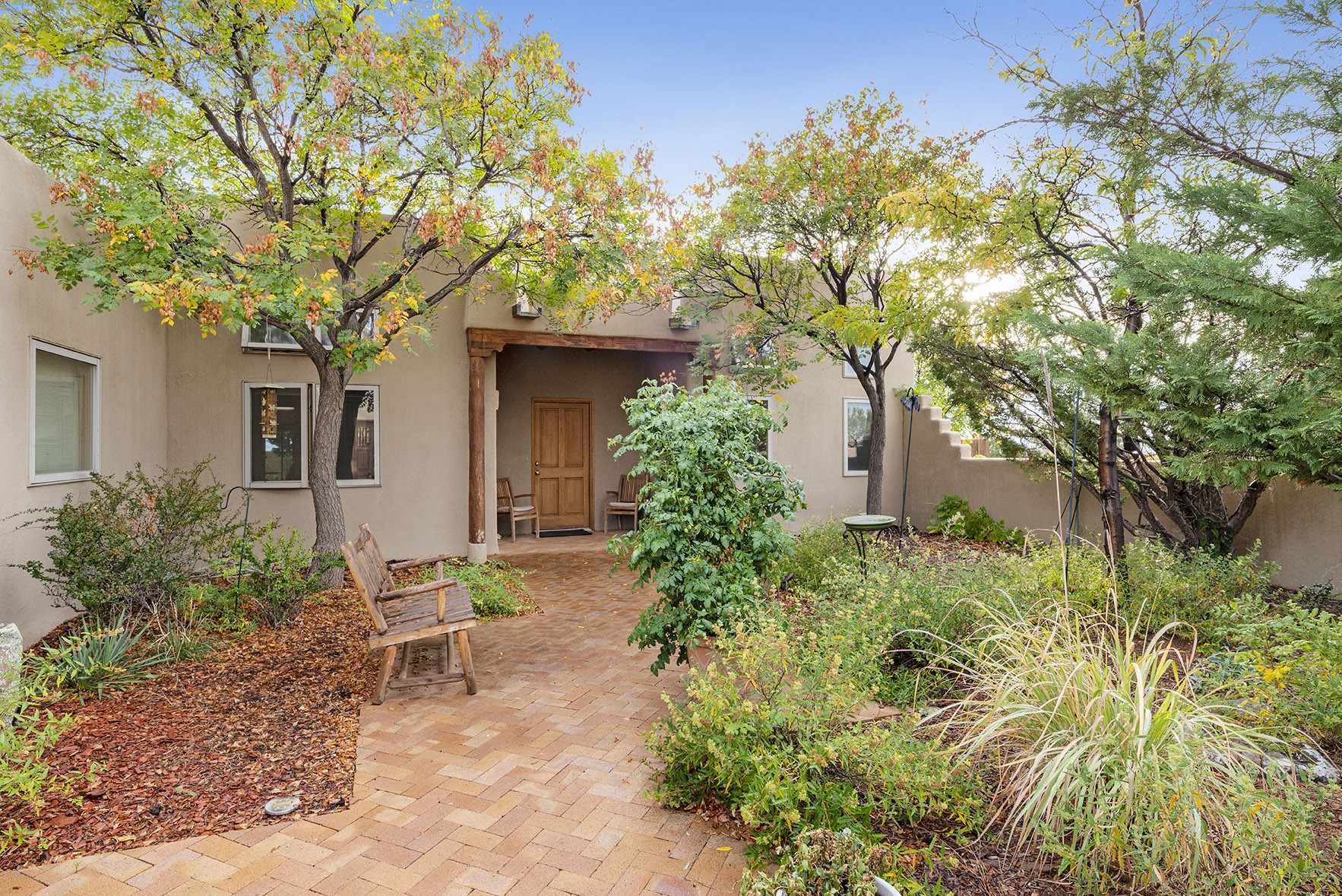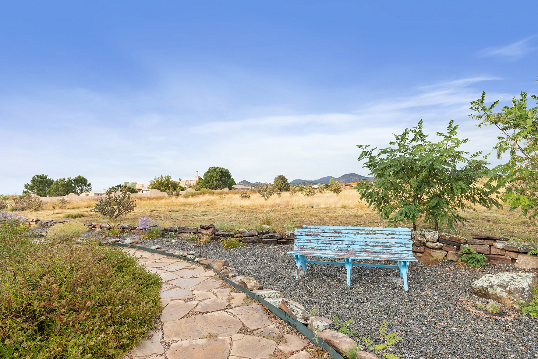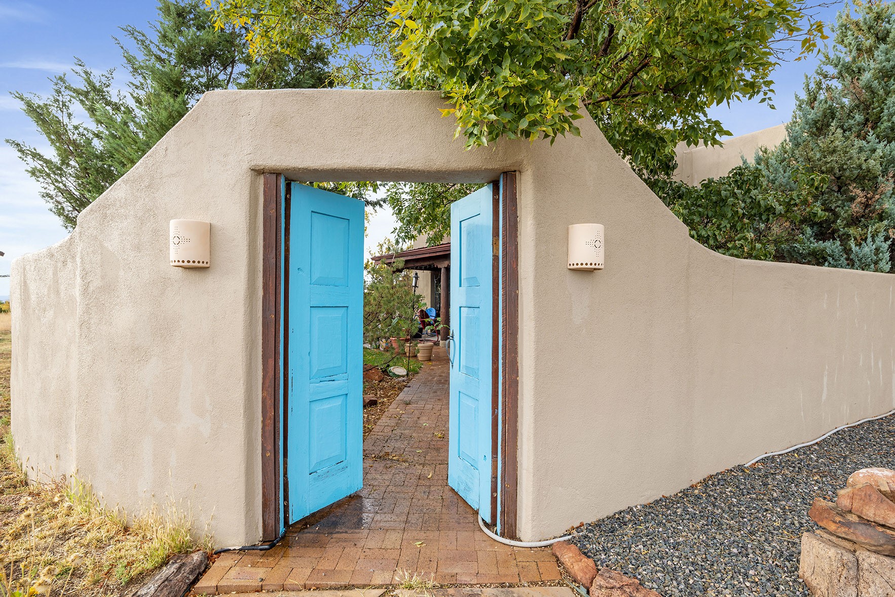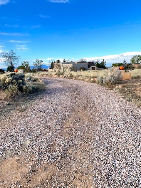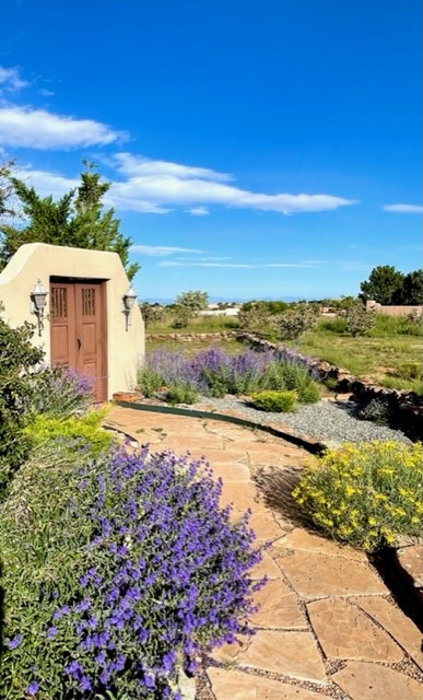You see the charm of this Eldorado home as soon as you drive up to it. Not one, but two courtyards for beautifully landscaped and private outdoor living space. Enter the house from the front courtyard and you are met with Santa Fe style decorative touches, including vigas and nichos. Everyone remarks on the spacious high ceilings, which are throughout the house. A gas fireplace warms the living room, which opens into the roomy dining area, which in turn leads to the back courtyard (hot tub conveys). The kitchen comes with stainless appliances, including a 5-burner gas stove and hood vent, and lots of counter space and cabinets. The common living areas separate the primary suite from the two guest bedrooms. The primary suite consist of a bedroom that opens onto the back courtyard, spacious walk-in closet, and bathroom with two sinks, separate shower, separate toilet stall, and garden tub. On this end of the house, a large laundry room has extra pantry space and comes with washer and dryer. It leads out to the attached 2-car garage, with insulated walls, 3 skylights, and a huge storeroom. There is additional parking in the circle driveway. Open space around the house reveals the beautiful mountain views. Great location on Avenida Eldorado with easy access to US 285 into Santa Fe and to Eldorado's shopping at the Agora and La Tienda. Right next to Eldorado's extensive walking path system, so you don't need to join the gym! House comes with a 14-month home warranty, start 3/6/23