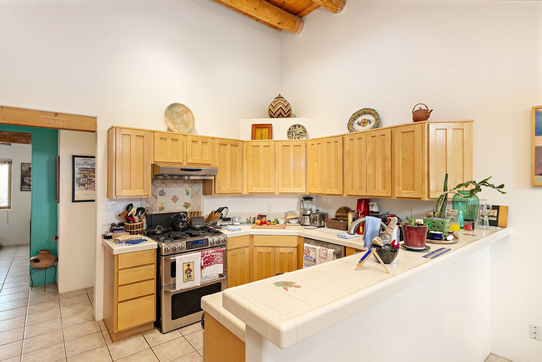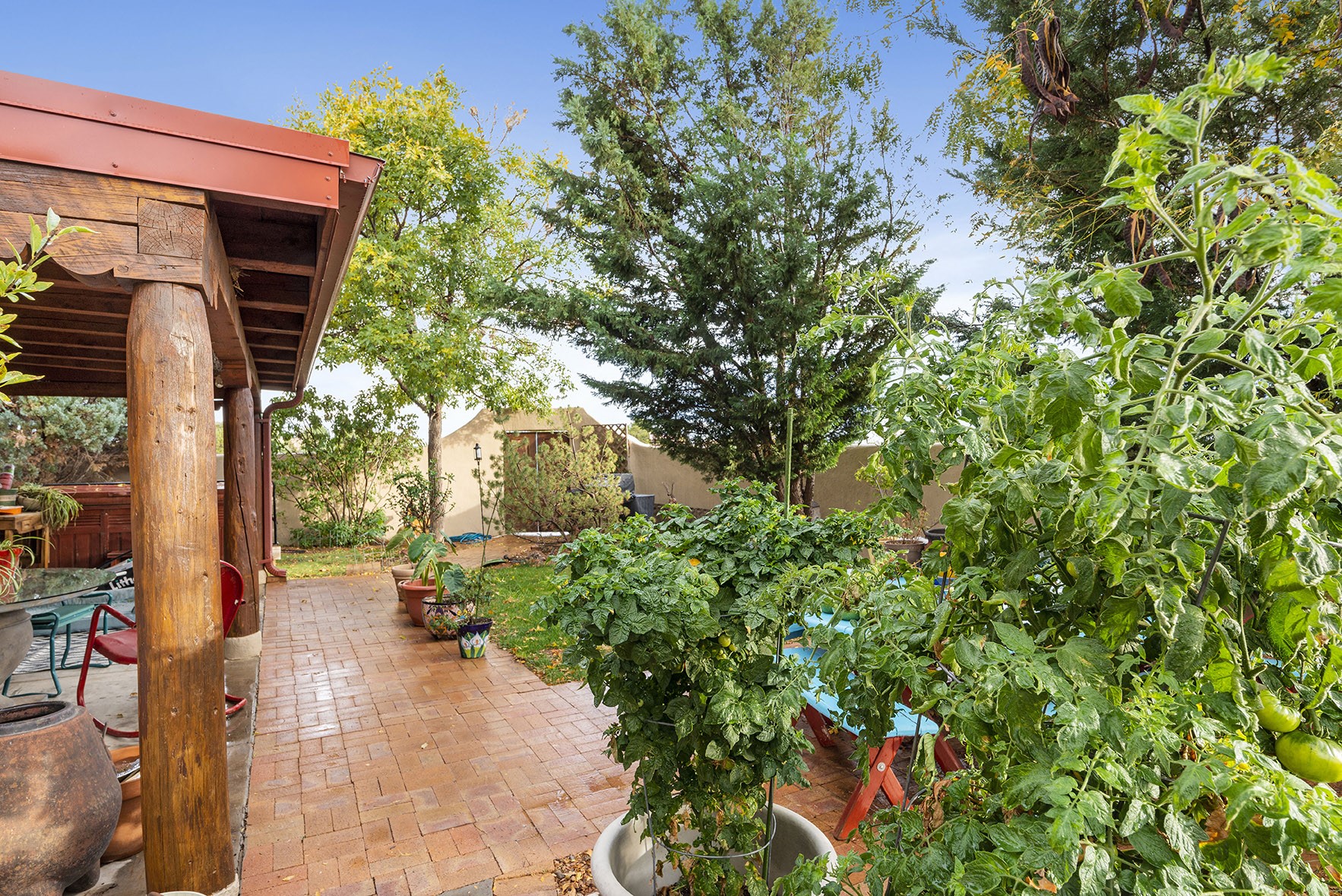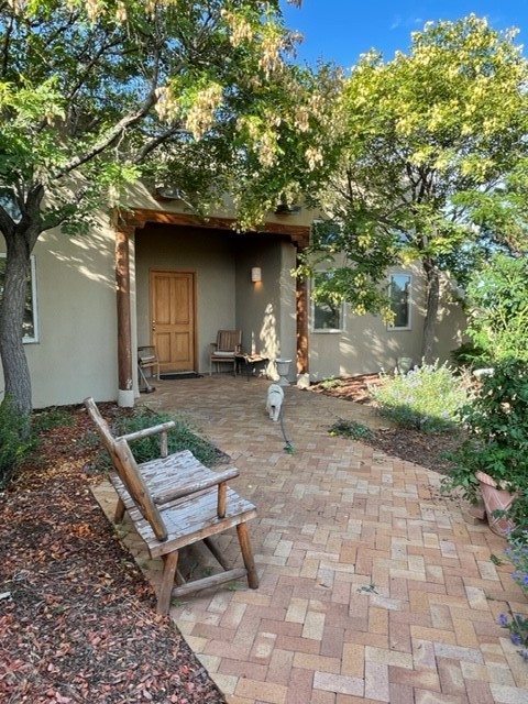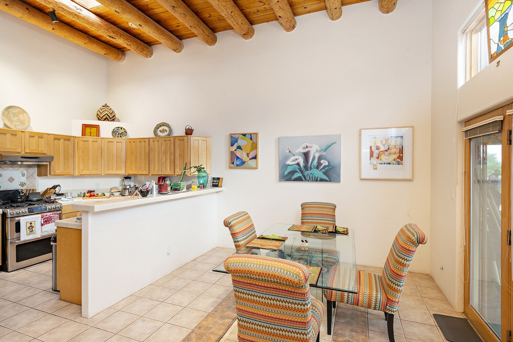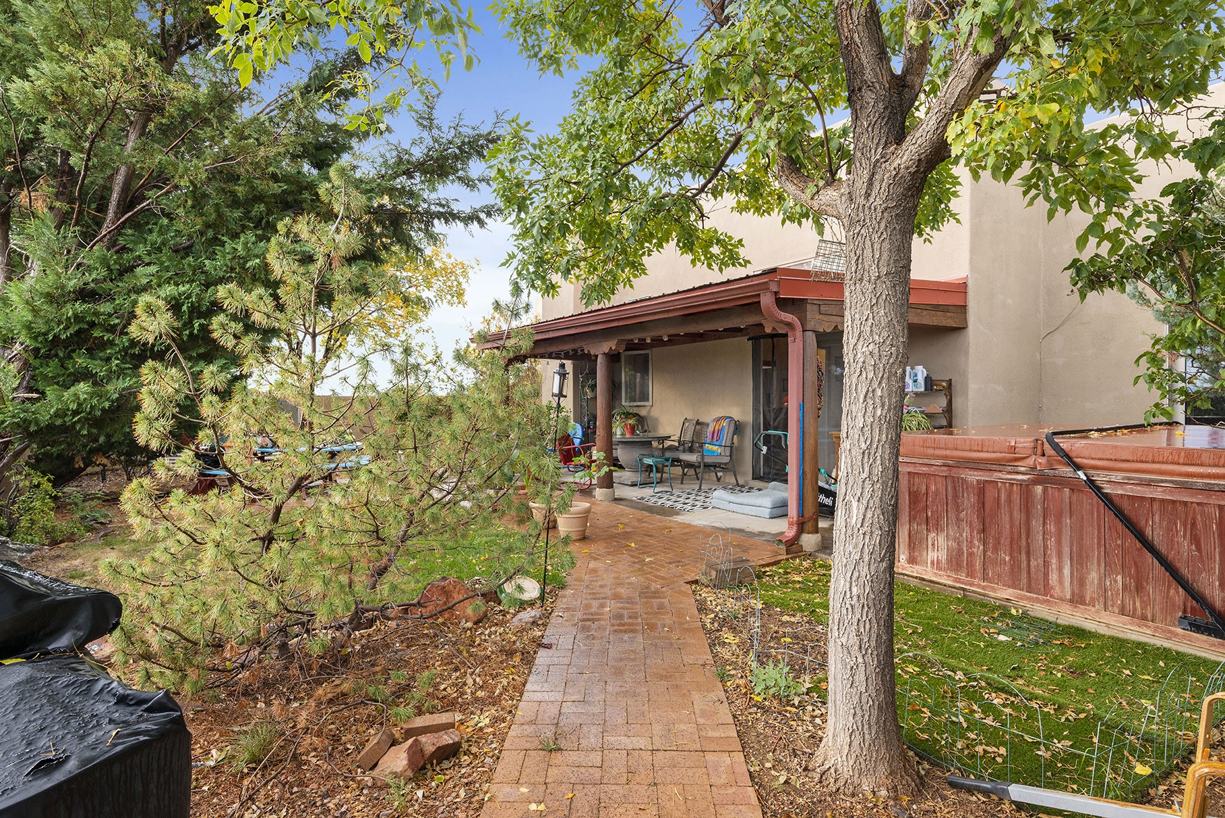 You see the charm of this Eldorado home as soon as you drive up to it. Not one, but two courtyards for beautifully landscaped and private outdoor living space. Enter the house from the front courtyard and you are met with Santa Fe style decorative touches, including vigas and nichos. Everyone remarks on the spacious high ceilings, which are throughout the house. A gas fireplace warms the living room, which opens into the roomy dining area, which in turn leads to the back courtyard (hot tub conveys). The kitchen comes with stainless appliances, including a 5-burner gas stove and hood vent, and lots of counter space and cabinets. The common living areas separate the primary suite from the two guest bedrooms. The primary suite consist of a bedroom that opens onto the back courtyard, spacious walk-in closet, and bathroom with two sinks, separate shower, separate toilet stall, and garden tub. On this end of the house, a large laundry room has extra pantry space and comes with washer and dryer. It leads out to the attached 2-car garage, with insulated walls, 3 skylights, and a huge storeroom. There is additional parking in the circle driveway. Open space around the house reveals the beautiful mountain views. Great location on Avenida Eldorado with easy access to US 285 into Santa Fe and to Eldorado's shopping at the Agora and La Tienda. Right next to Eldorado's extensive walking path system, so you don't need to join the gym! House comes with a 14-month home warranty, start 3/6/23