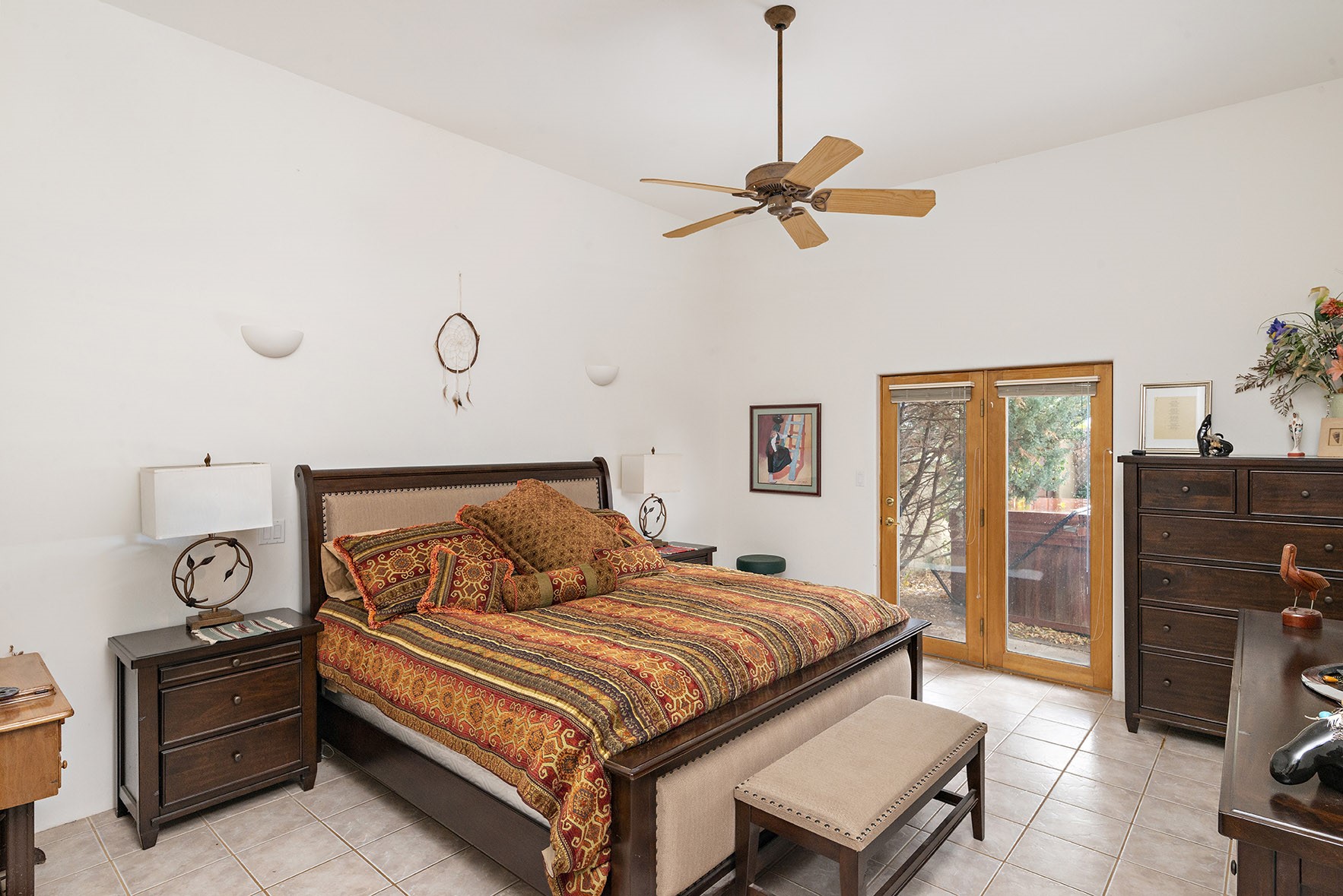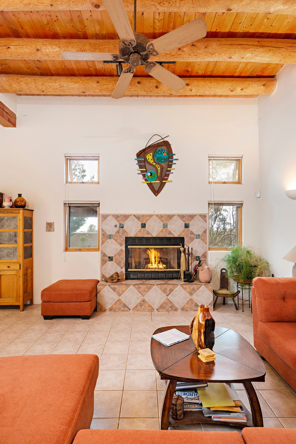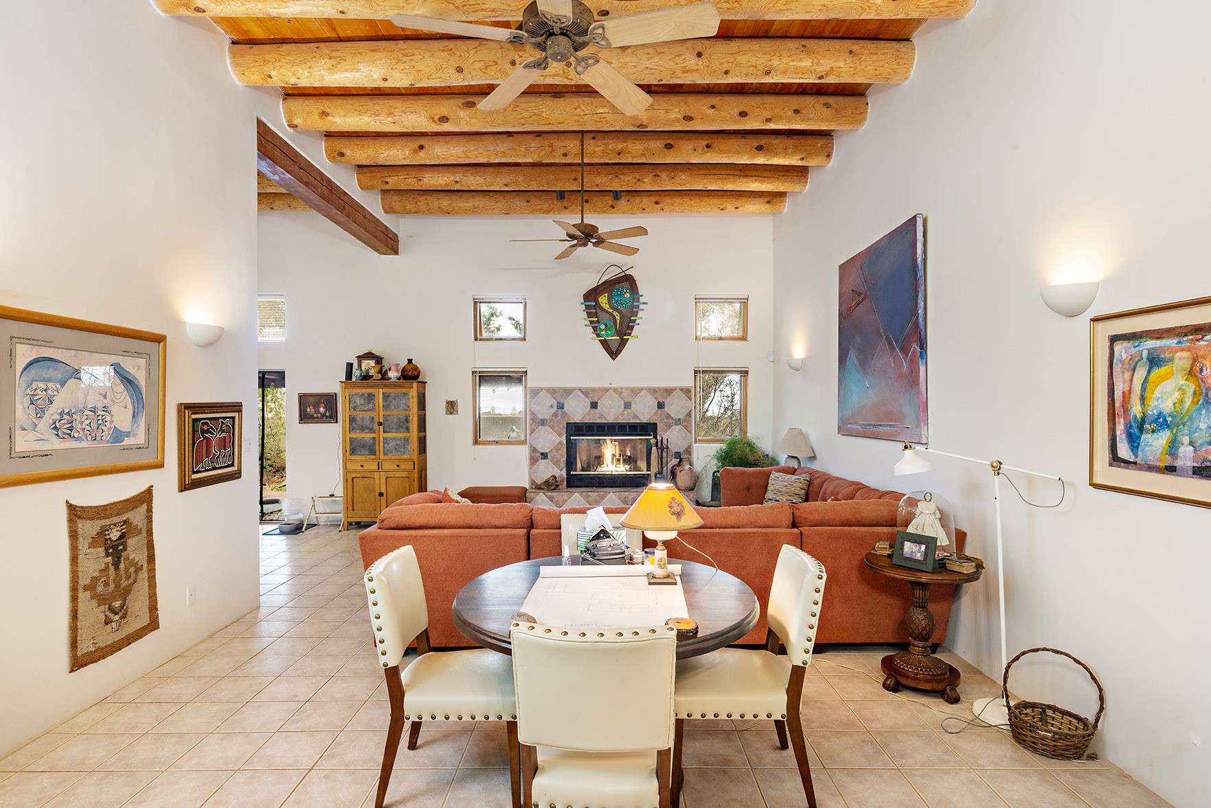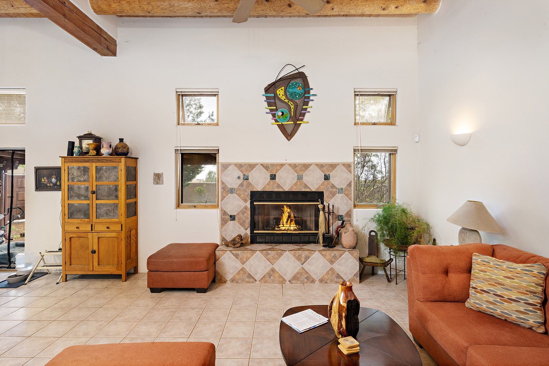 You see the charm of this Eldorado home as soon as you drive up to it. Not one, but two courtyards for beautifully landscaped and private outdoor living space. Enter the house from the front courtyard and you are met with Santa Fe style decorative touches, including vigas and nichos. Everyone remarks on the spacious high ceilings, which are throughout the house. A gas fireplace warms the living room, which opens into the roomy dining area, which in turn leads to the back courtyard (hot tub conveys). The kitchen comes with stainless appliances, including a 5-burner gas stove and hood vent, and lots of counter space and cabinets. The common living areas separate the primary suite from the two guest bedrooms. The primary suite consist of a bedroom that opens onto the back courtyard, spacious walk-in closet, and bathroom with two sinks, separate shower, separate toilet stall, and garden tub. On this end of the house, a large laundry room has extra pantry space and comes with washer and dryer. It leads out to the attached 2-car garage, with insulated walls, 3 skylights, and a huge storeroom. There is additional parking in the circle driveway. Open space around the house reveals the beautiful mountain views. Great location on Avenida Eldorado with easy access to US 285 into Santa Fe and to Eldorado's shopping at the Agora and La Tienda. Right next to Eldorado's extensive walking path system, so you don't need to join the gym! House comes with a 14-month home warranty, start 3/6/23