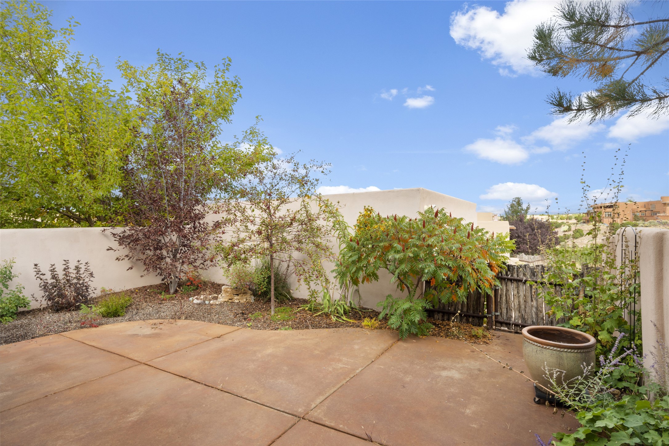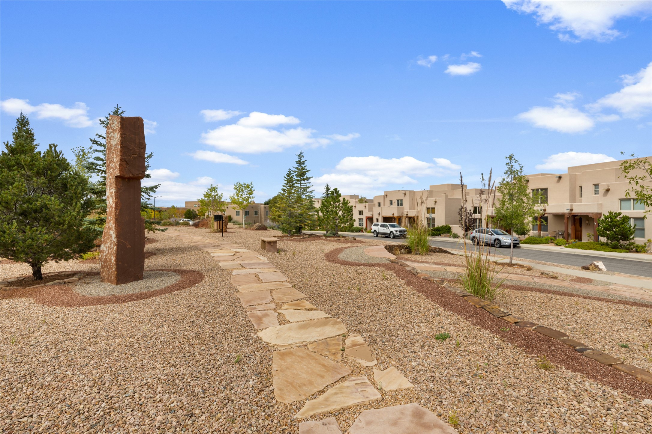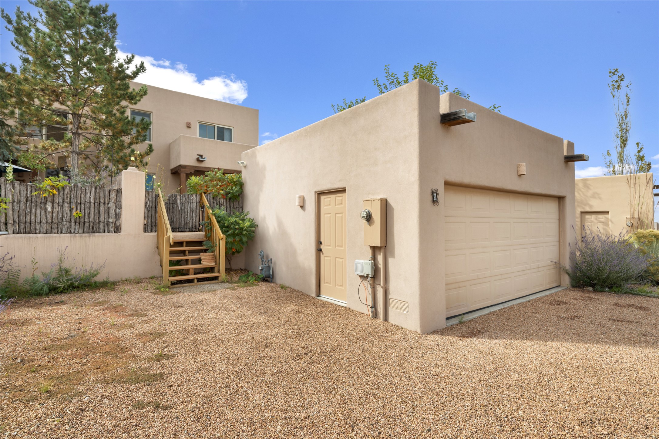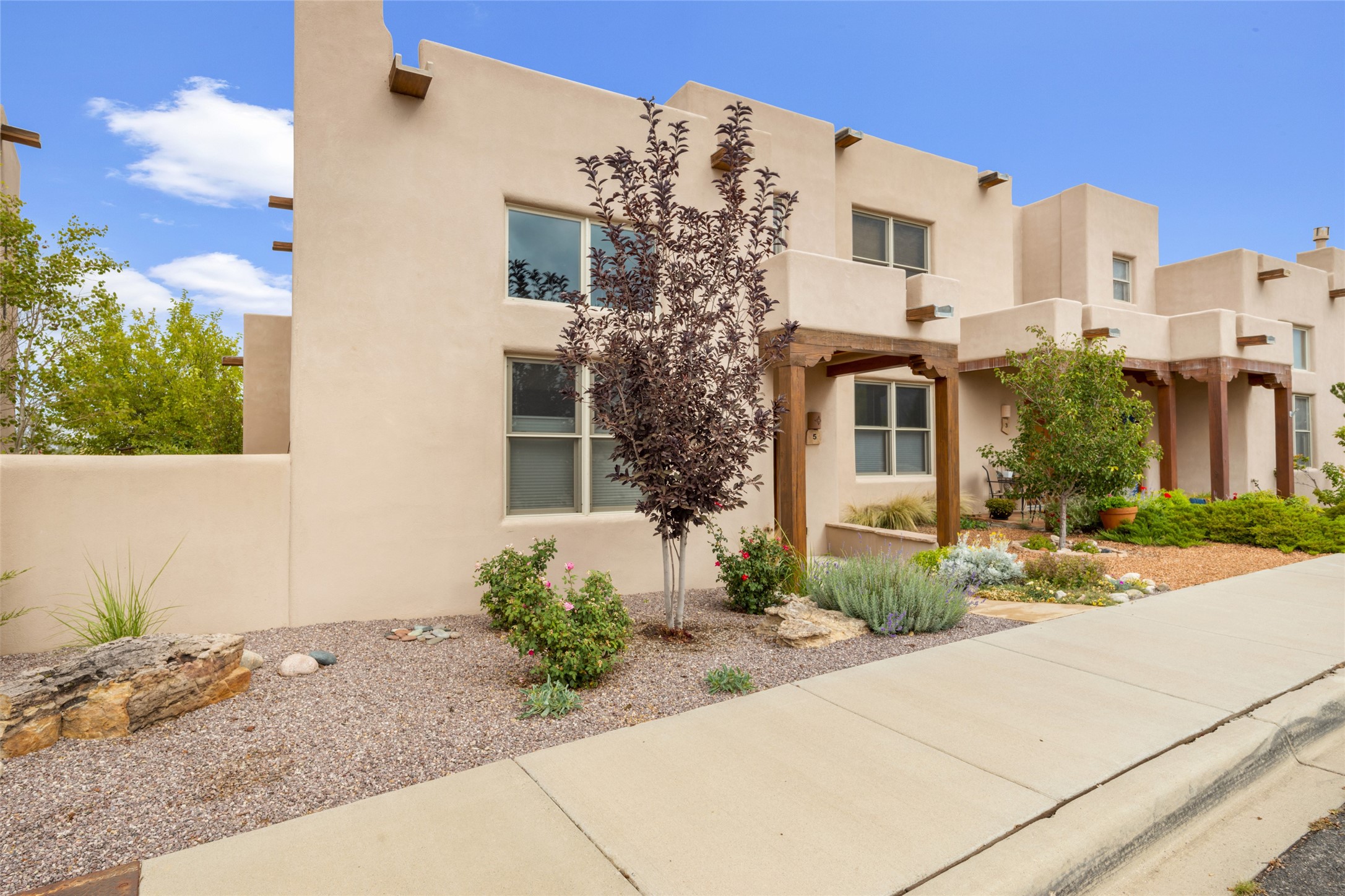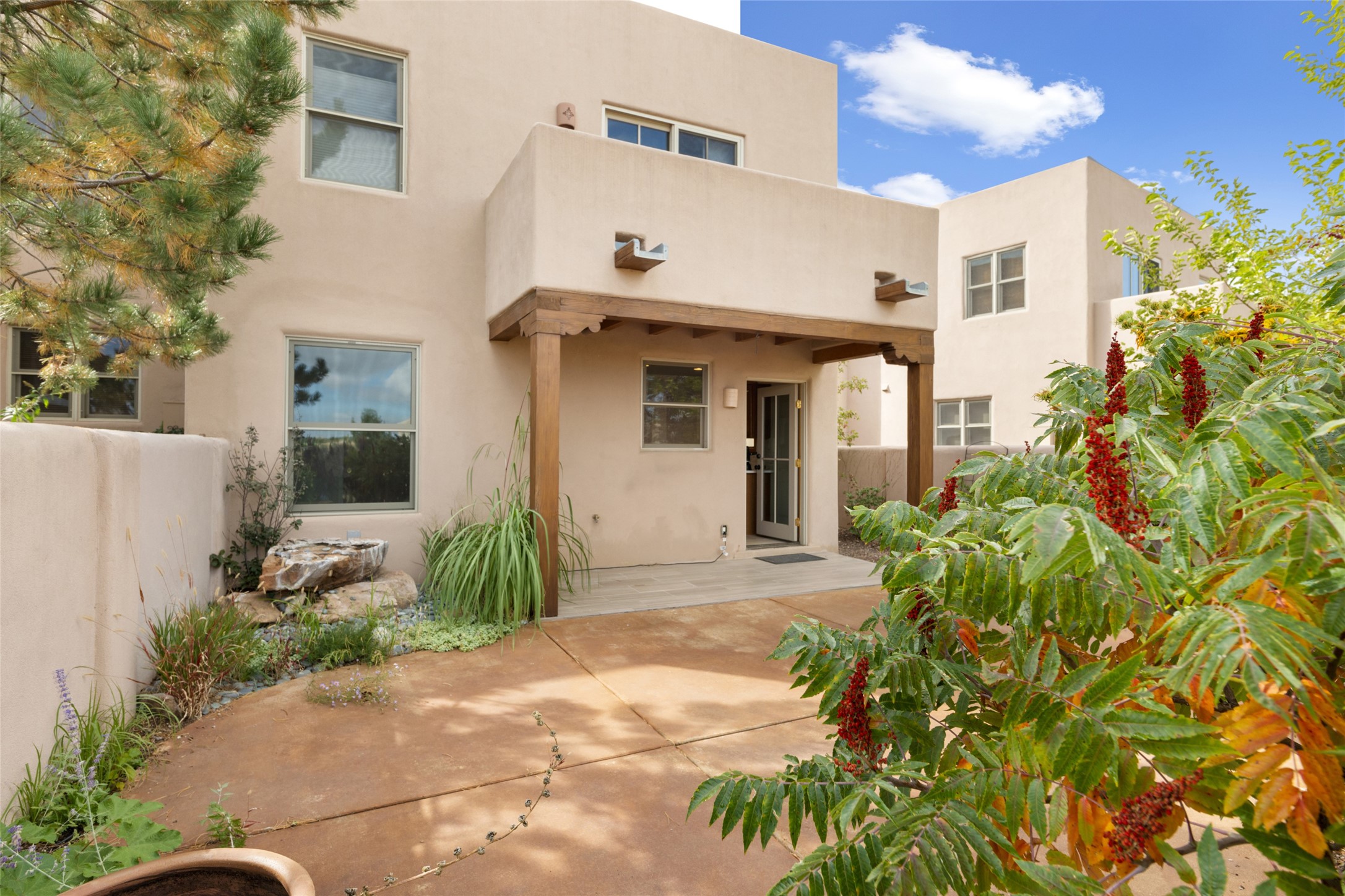 Lovely 2 story Aldea townhome located near the main entrance available.Downstairs main living area contains a living room with gas fireplace, dining room, and kitchen with niceupgrades. Downstairs bedroom and 1/2 bath complete the lower level floor plan. Upstairs are 2 bedrooms, eachwith their own bathroom. Off the primary bedroom is a deck with fantastic views to the north and west.Lovely back courtyard/garden area for sitting and relaxing has views and a water feature. Also access to thedetached 2 car garage in the rear of the property. Aldea has over 200 acres of open space,tennis/pickleball, & basketball courts, playground, community center and plaza. 15 minutes to the Santa FePlaza, 10 minutes to the north end of town/shopping.