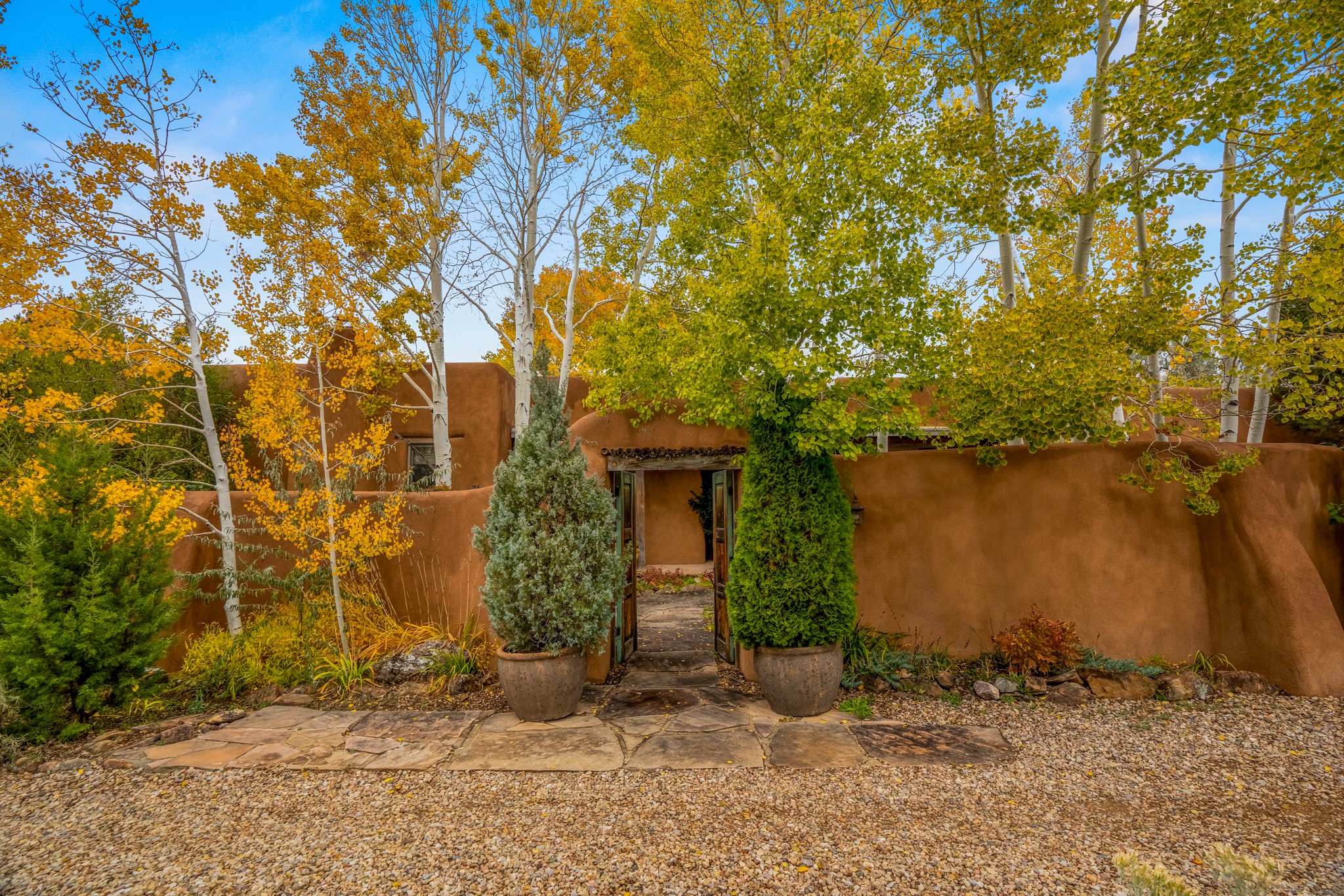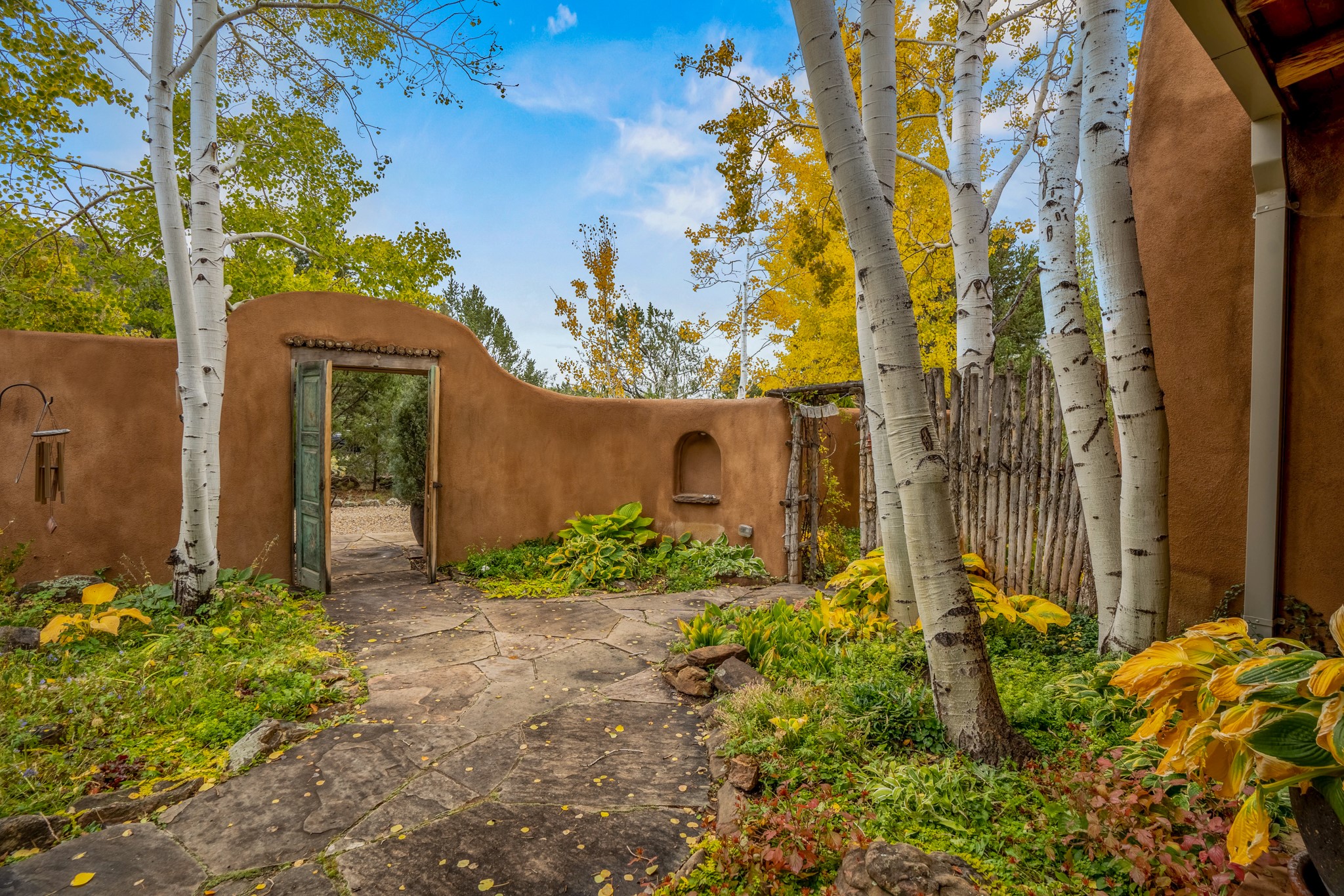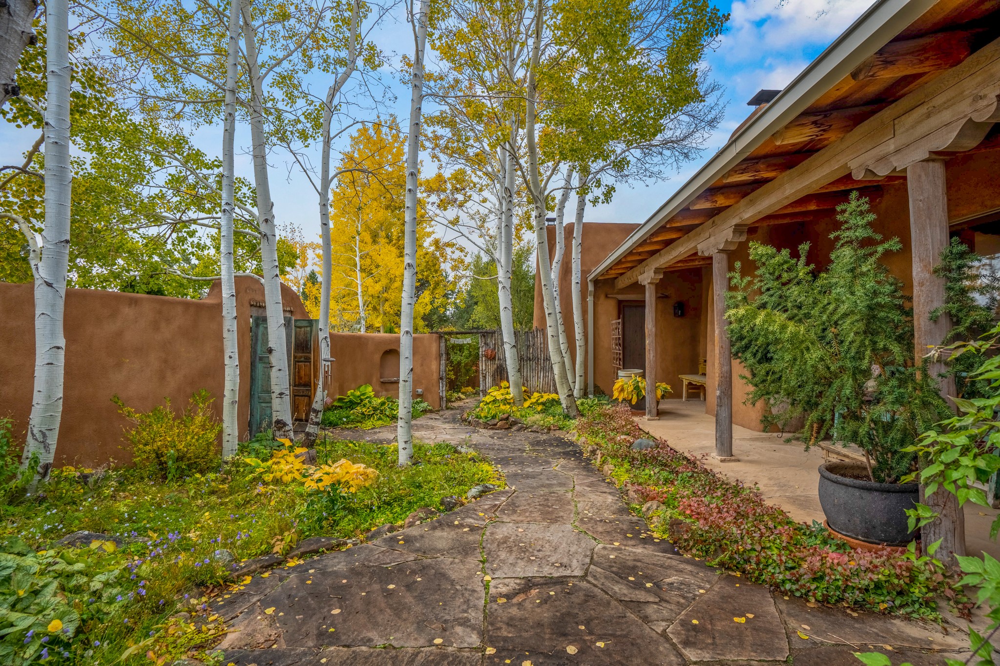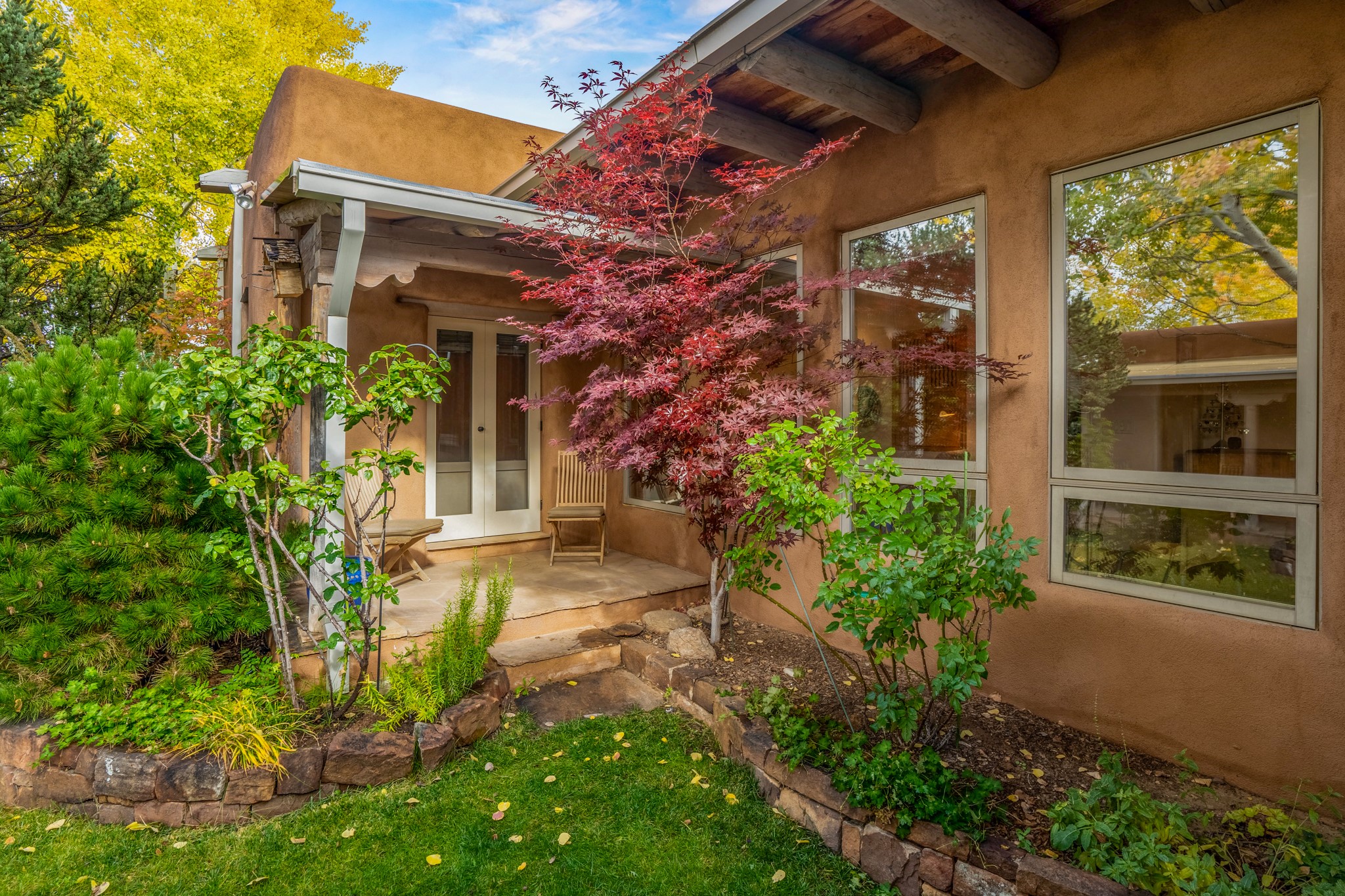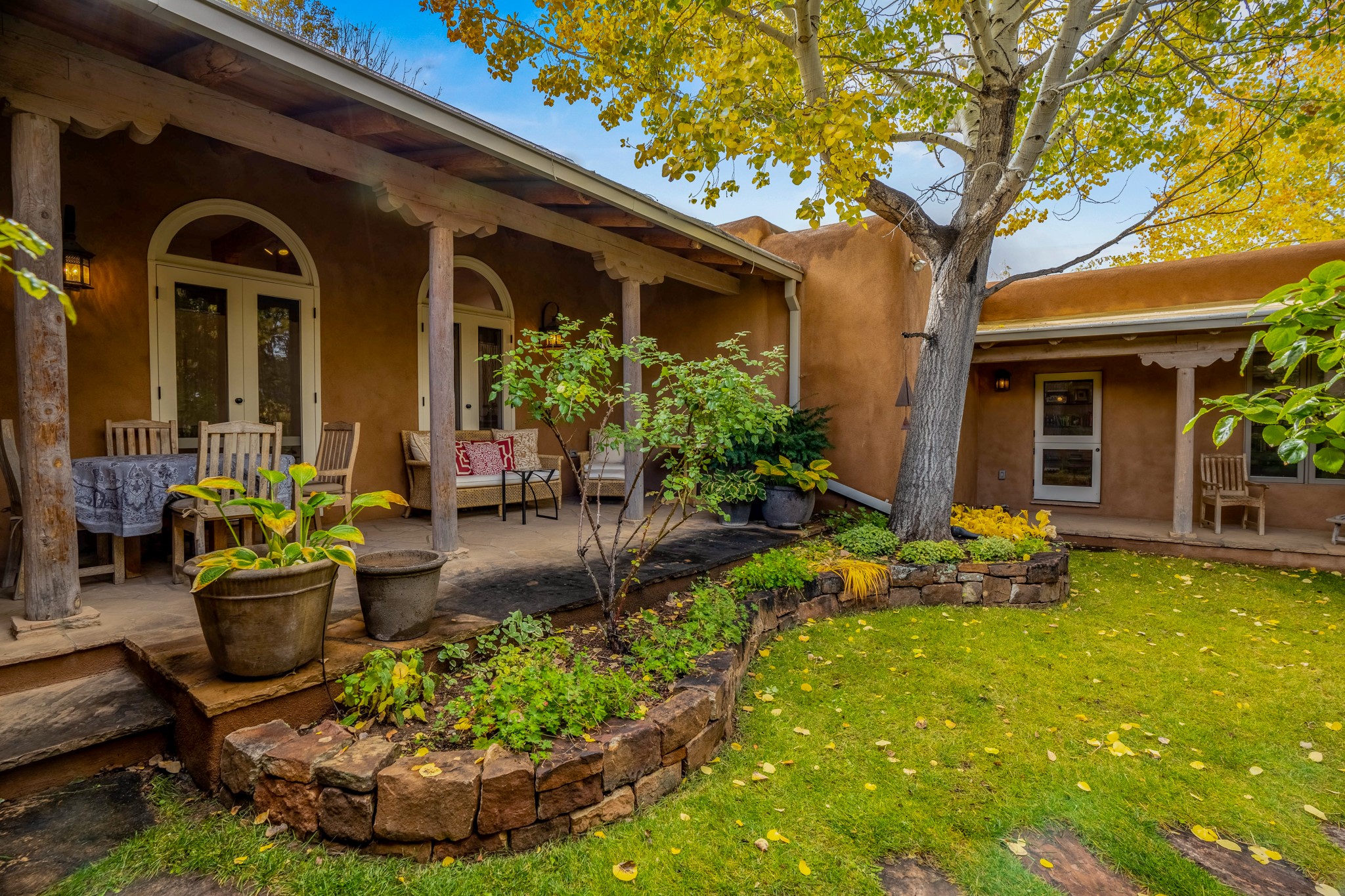 A peaceful, mostly adobe home and oasis with gorgeous living spaces both inside and out! 4 bedrooms and 3 full baths and 2 half baths with 3880sf create the foundation for a warm, inviting home with a great entertaining layout; living room and kitchen have french doors to the lush backyard and there is a fantastic butler's pantry, Sub Zero and DCS appliances and large island. The floorplan is nicely separated with two guest bedrooms (one with ensuite bath and its own exterior entry) on the opposite side of the house from the owner's suite. The backyard is its own secret garden - lush plants on a drip system, an arbor, hot tub and an outdoor fireplace - and backs onto several acres of common space behind the Museums. Other great features are a library with built-in shelves, diamond plaster finish throughout, a mud room between the 2-car garage and kitchen, a total of 5 fireplaces, fenced dog enclosure with large dog house, and an inviting front garden/patio. This home is a must see!