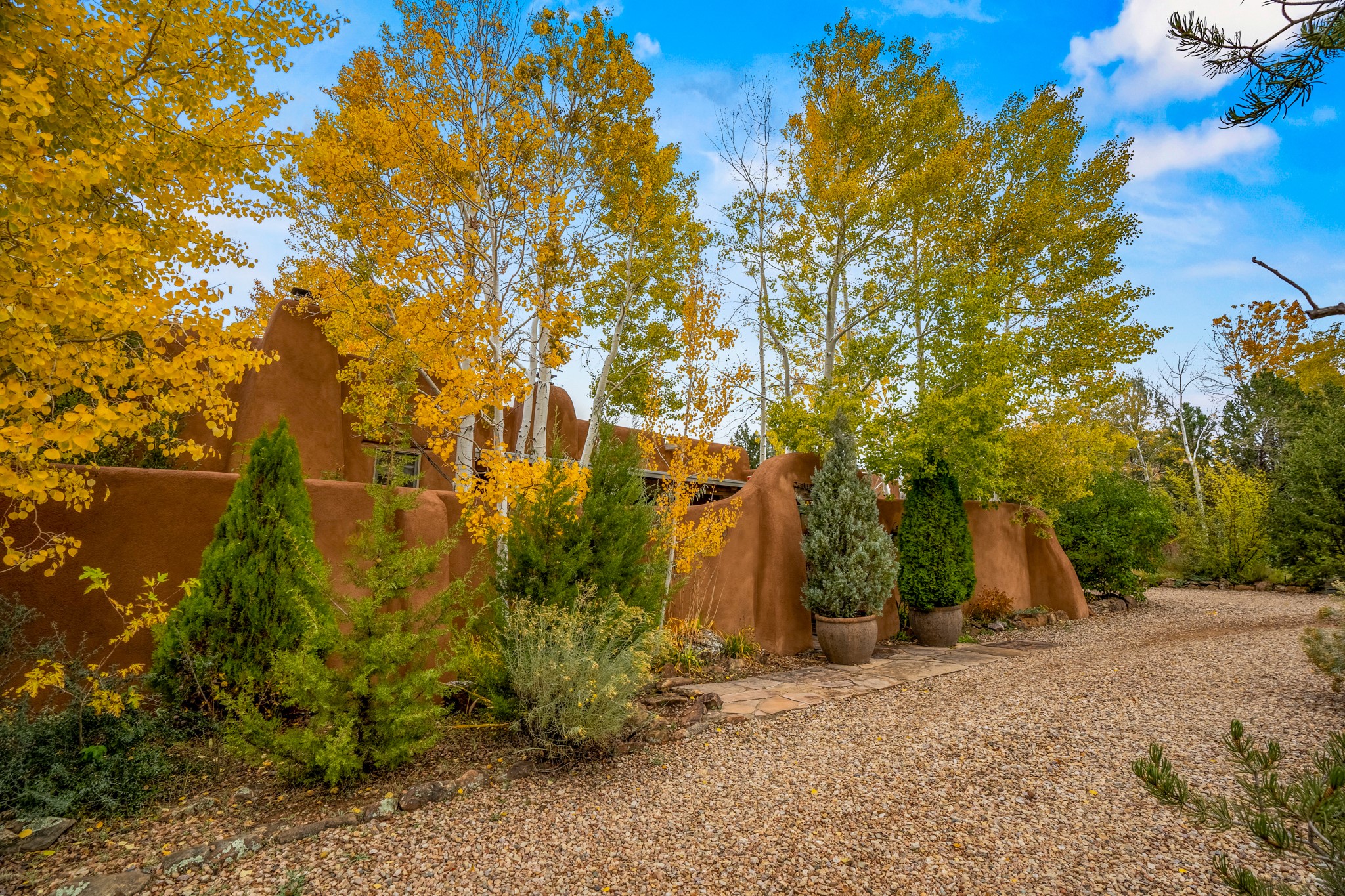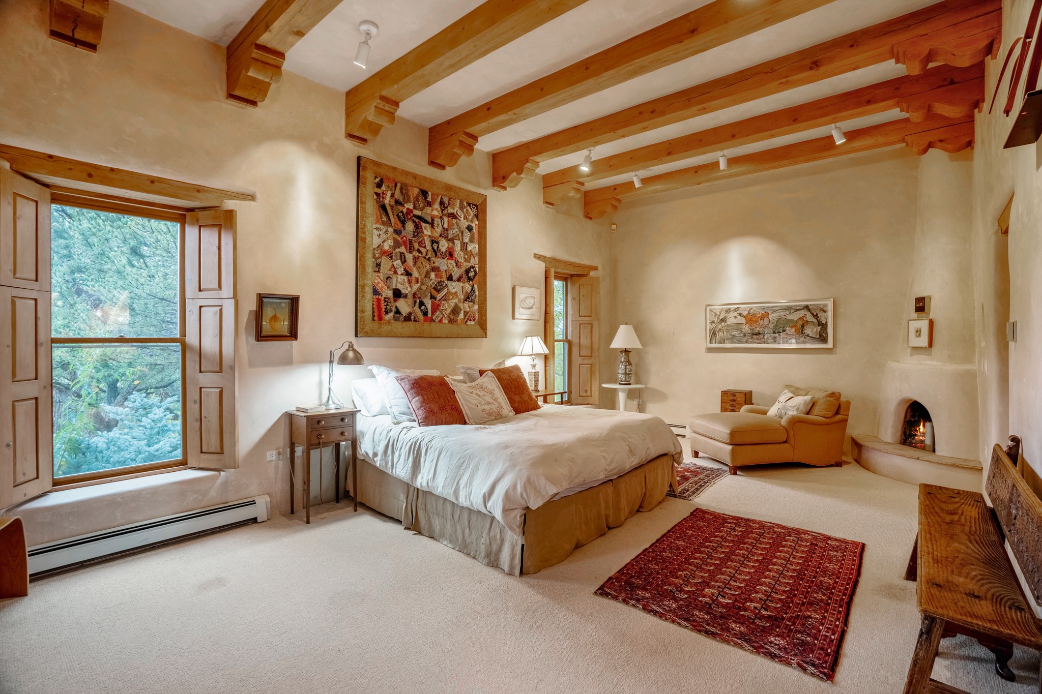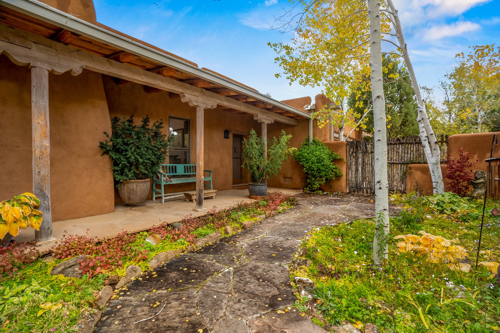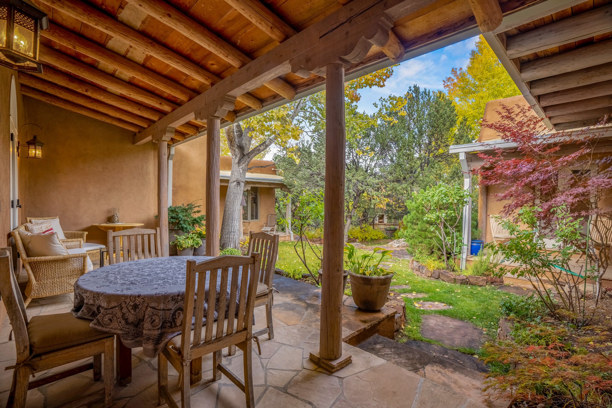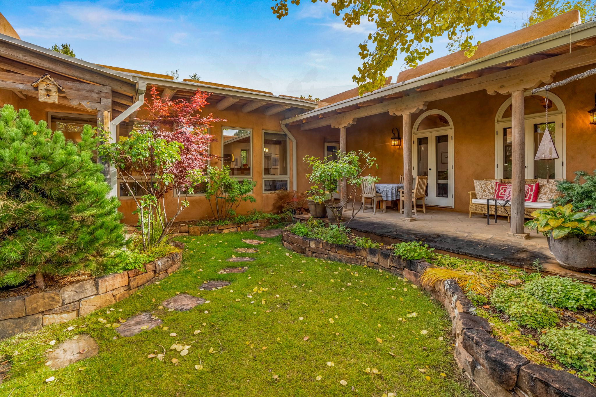 A peaceful, mostly adobe home and oasis with gorgeous living spaces both inside and out! 4 bedrooms and 3 full baths and 2 half baths with 3880sf create the foundation for a warm, inviting home with a great entertaining layout; living room and kitchen have french doors to the lush backyard and there is a fantastic butler's pantry, Sub Zero and DCS appliances and large island. The floorplan is nicely separated with two guest bedrooms (one with ensuite bath and its own exterior entry) on the opposite side of the house from the owner's suite. The backyard is its own secret garden - lush plants on a drip system, an arbor, hot tub and an outdoor fireplace - and backs onto several acres of common space behind the Museums. Other great features are a library with built-in shelves, diamond plaster finish throughout, a mud room between the 2-car garage and kitchen, a total of 5 fireplaces, fenced dog enclosure with large dog house, and an inviting front garden/patio. This home is a must see!