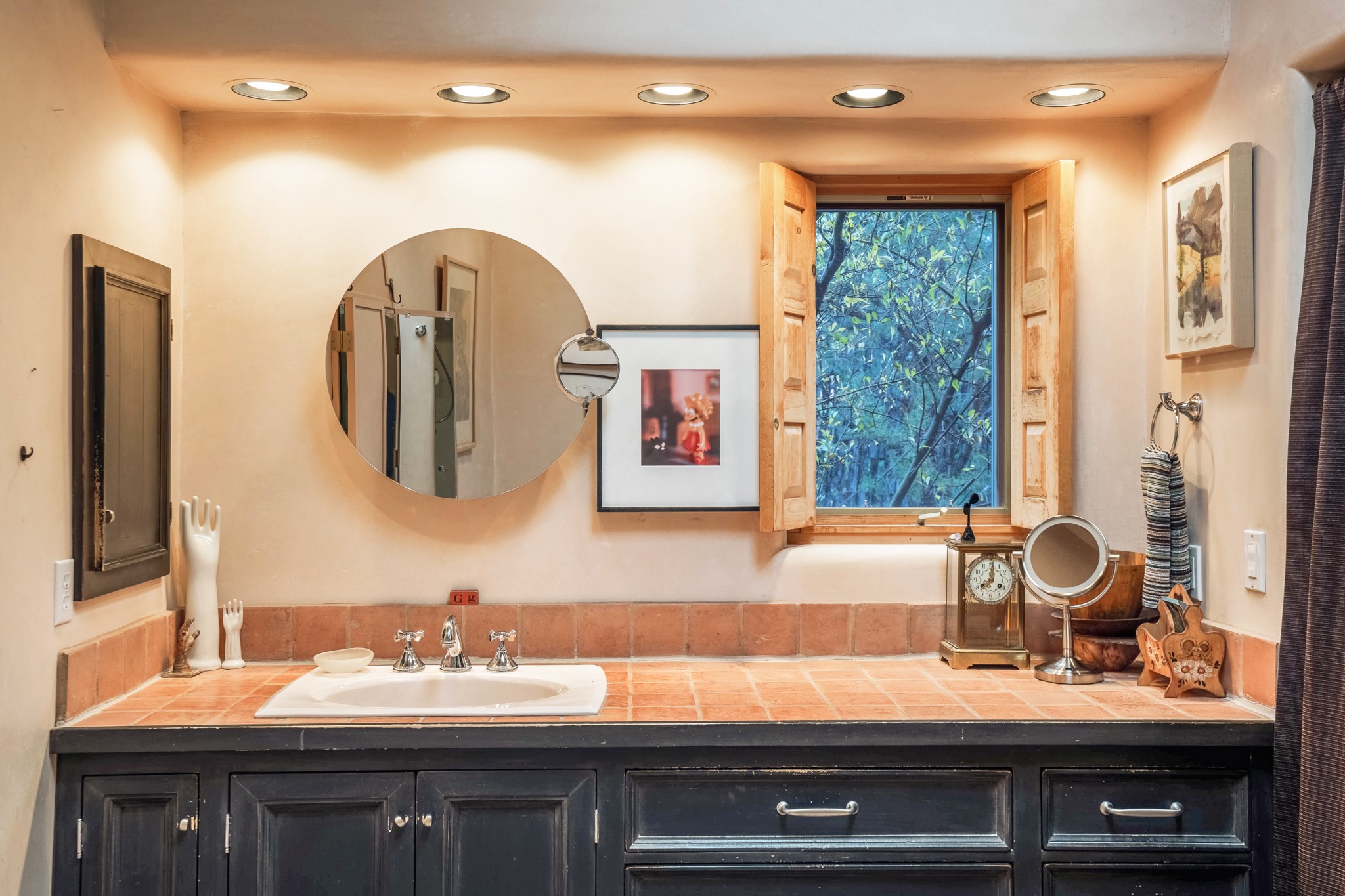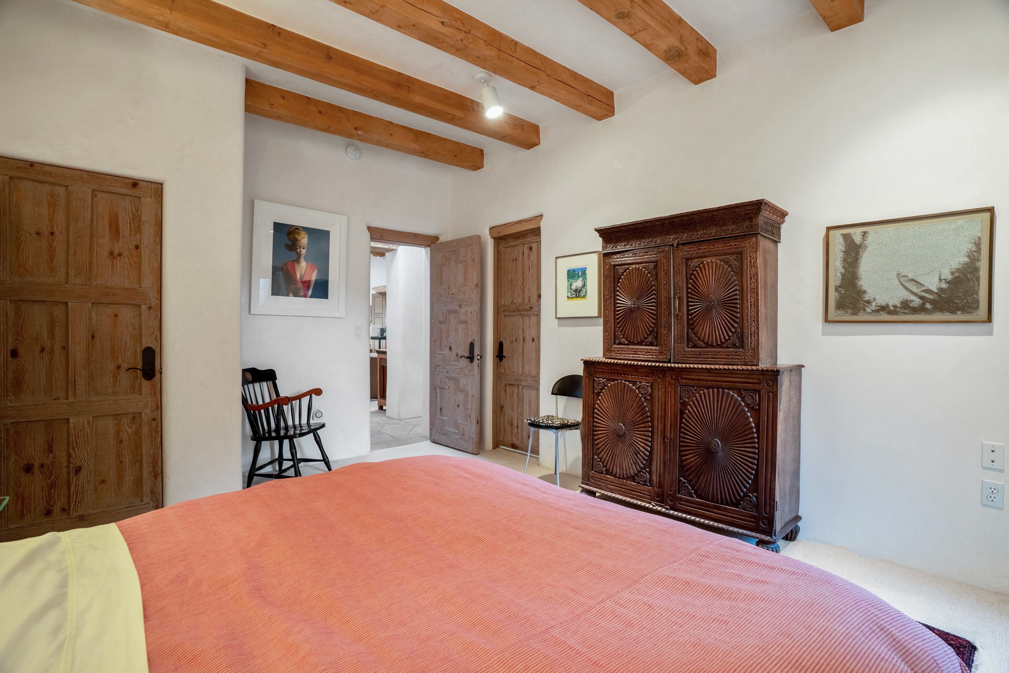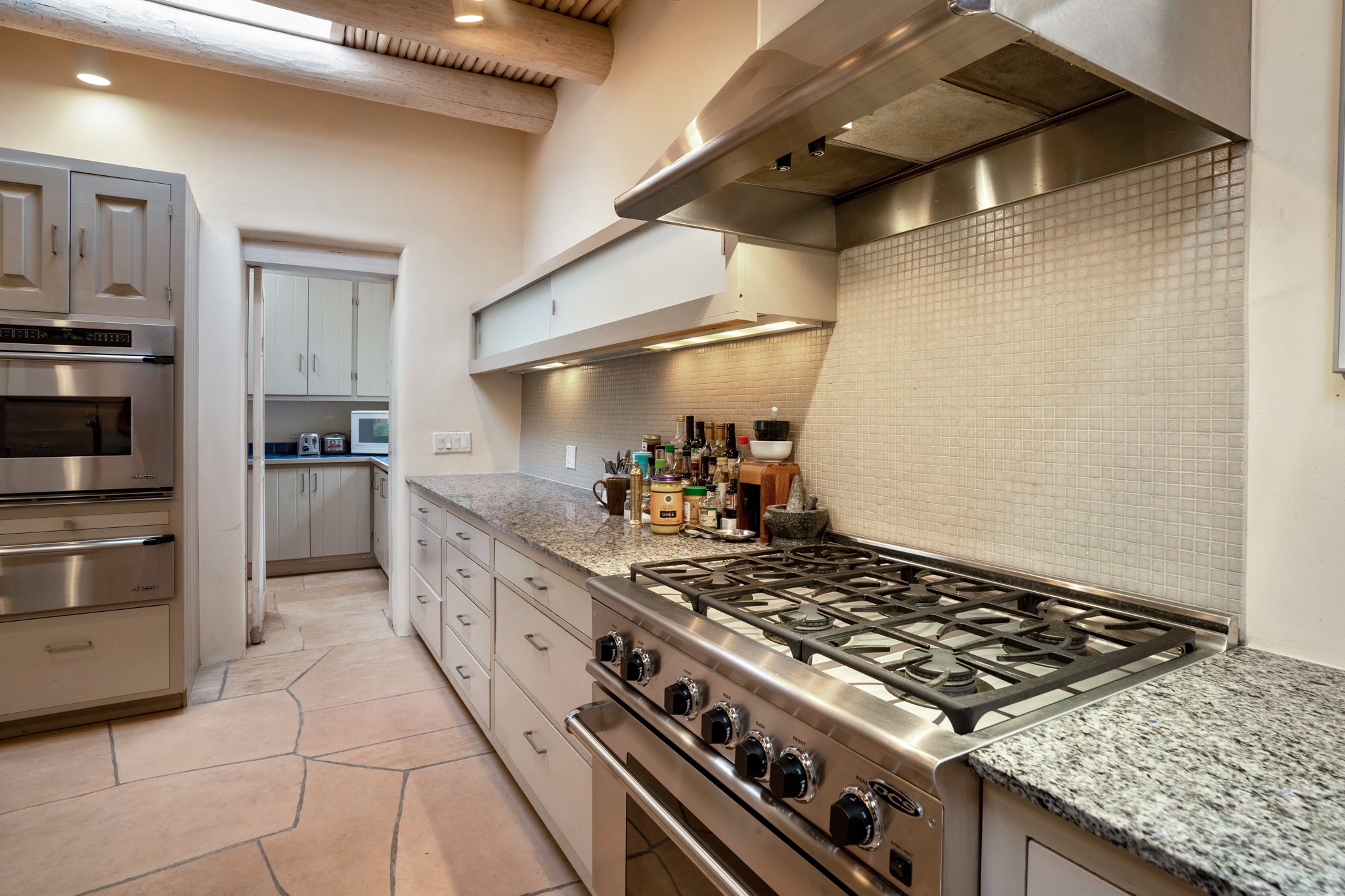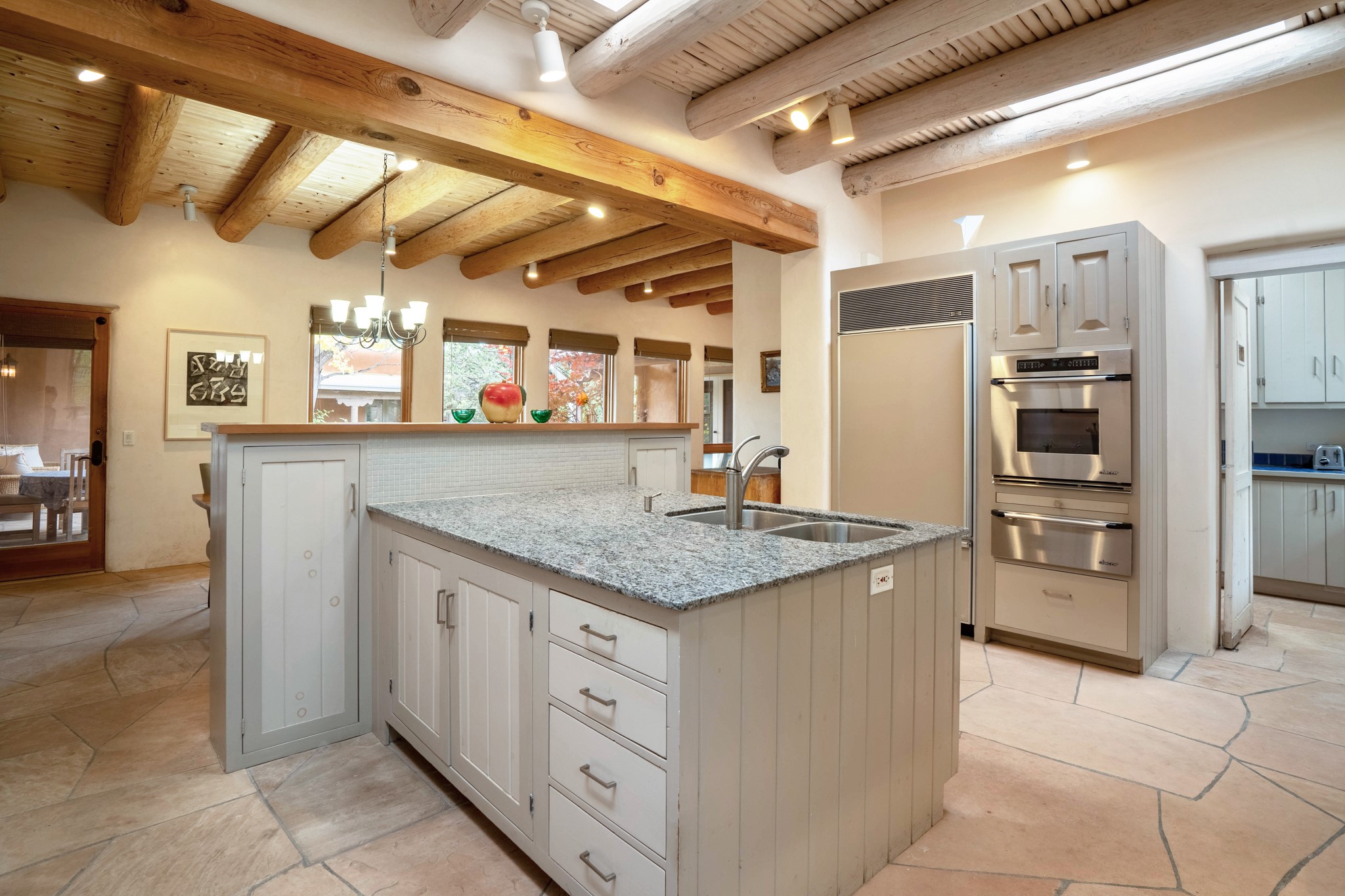 A peaceful, mostly adobe home and oasis with gorgeous living spaces both inside and out! 4 bedrooms and 3 full baths and 2 half baths with 3880sf create the foundation for a warm, inviting home with a great entertaining layout; living room and kitchen have french doors to the lush backyard and there is a fantastic butler's pantry, Sub Zero and DCS appliances and large island. The floorplan is nicely separated with two guest bedrooms (one with ensuite bath and its own exterior entry) on the opposite side of the house from the owner's suite. The backyard is its own secret garden - lush plants on a drip system, an arbor, hot tub and an outdoor fireplace - and backs onto several acres of common space behind the Museums. Other great features are a library with built-in shelves, diamond plaster finish throughout, a mud room between the 2-car garage and kitchen, a total of 5 fireplaces, fenced dog enclosure with large dog house, and an inviting front garden/patio. This home is a must see!