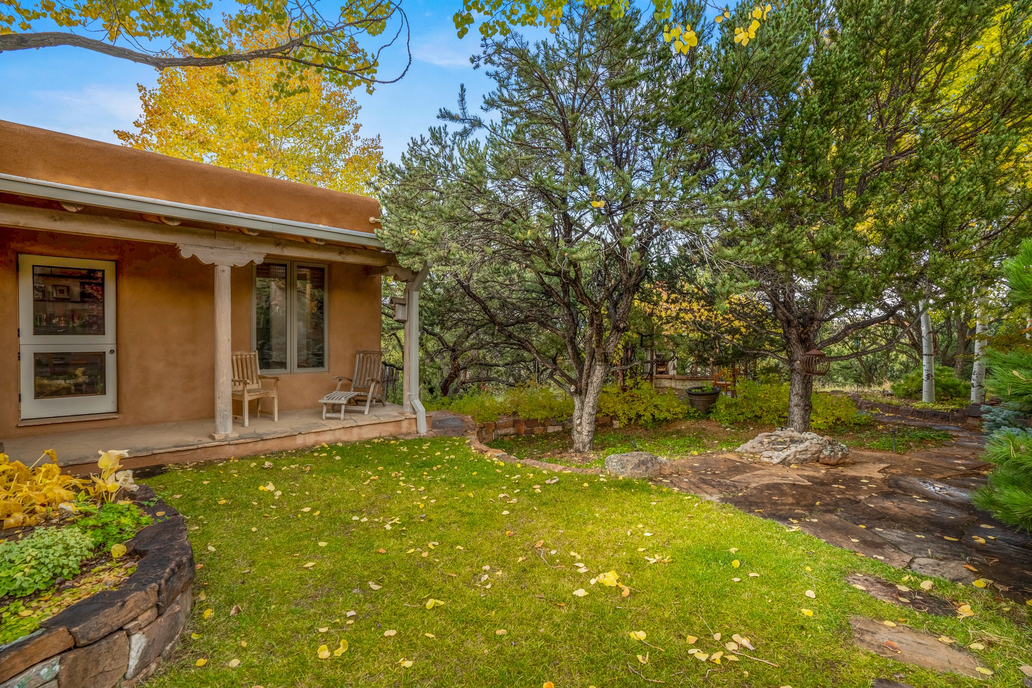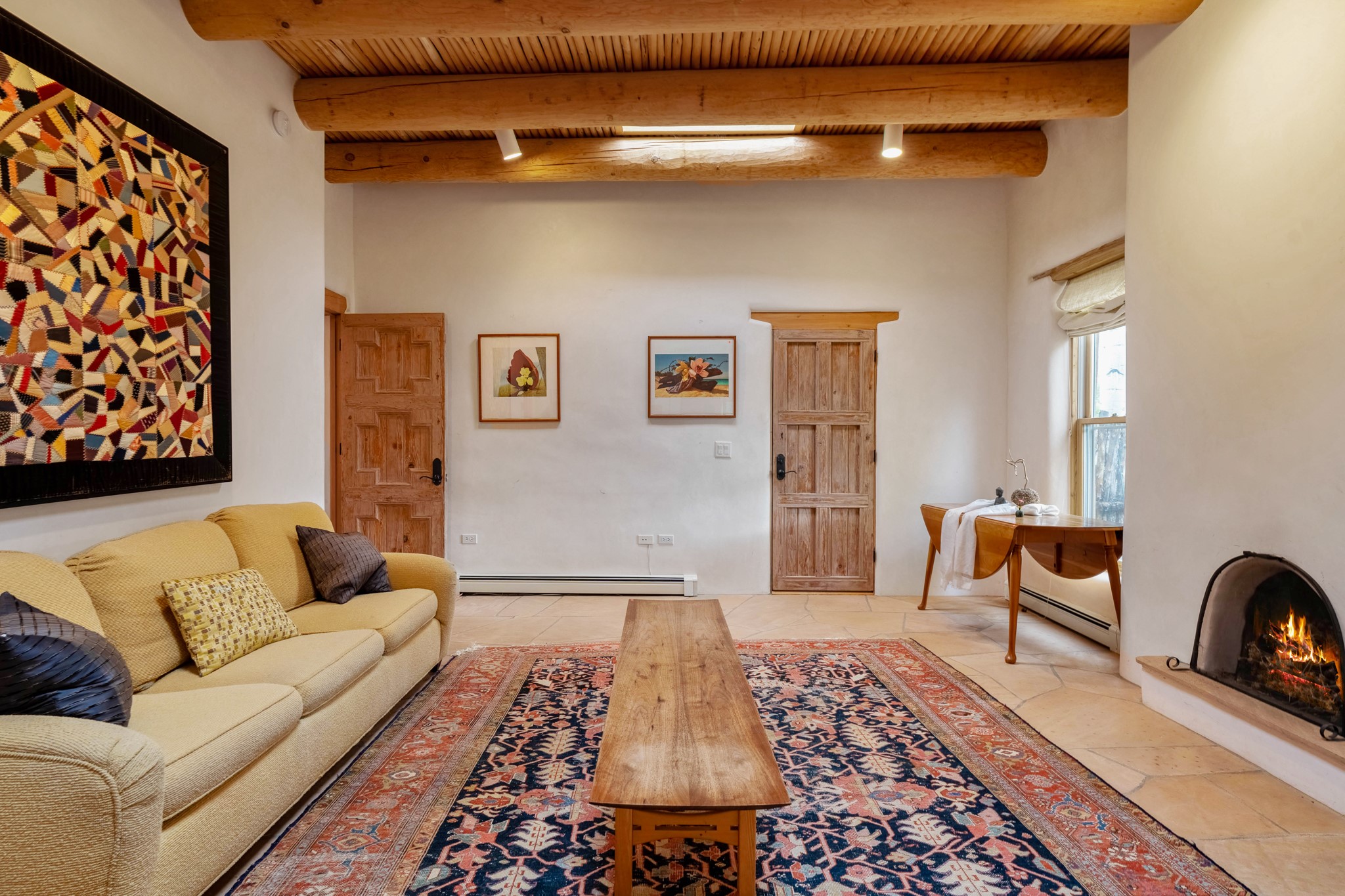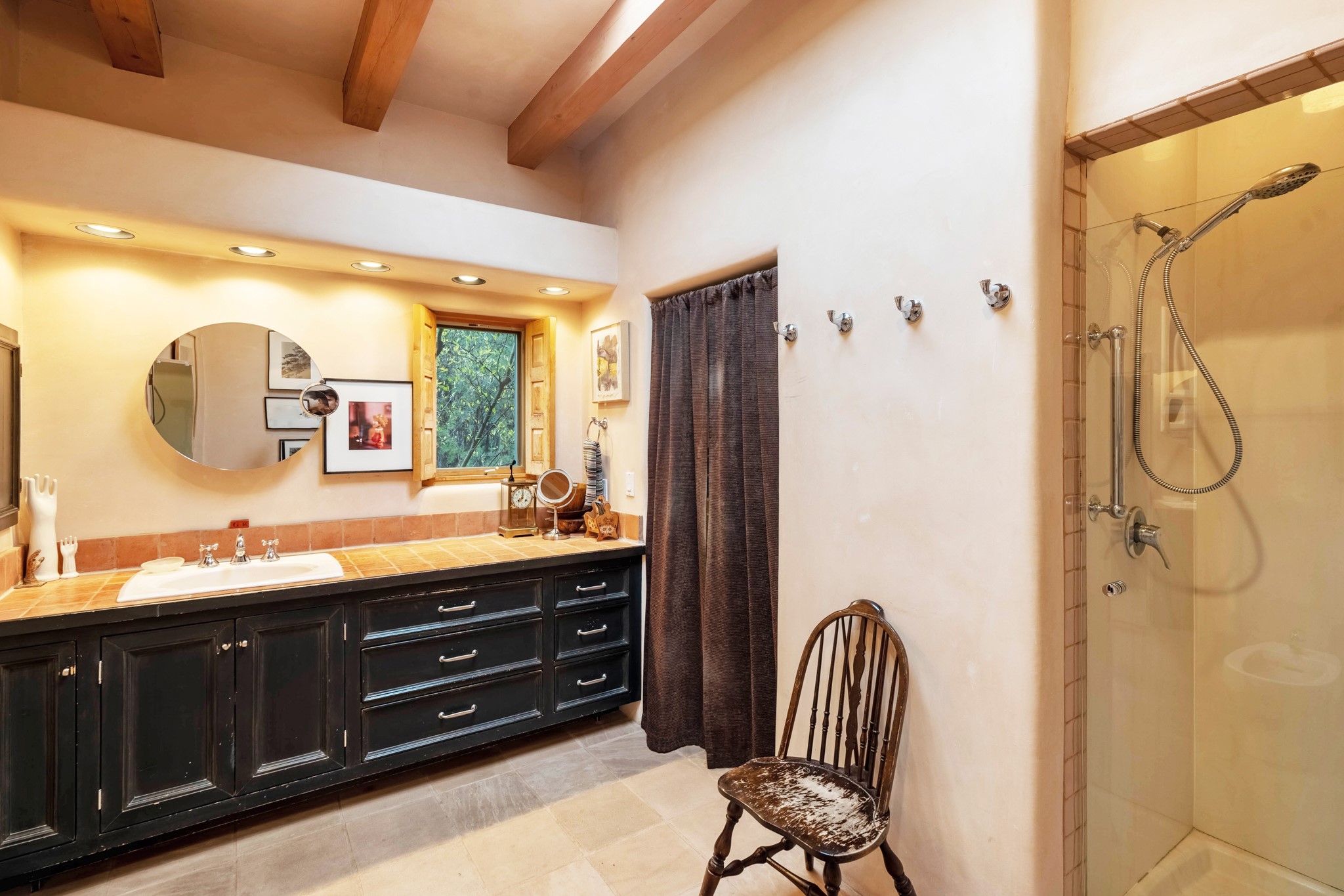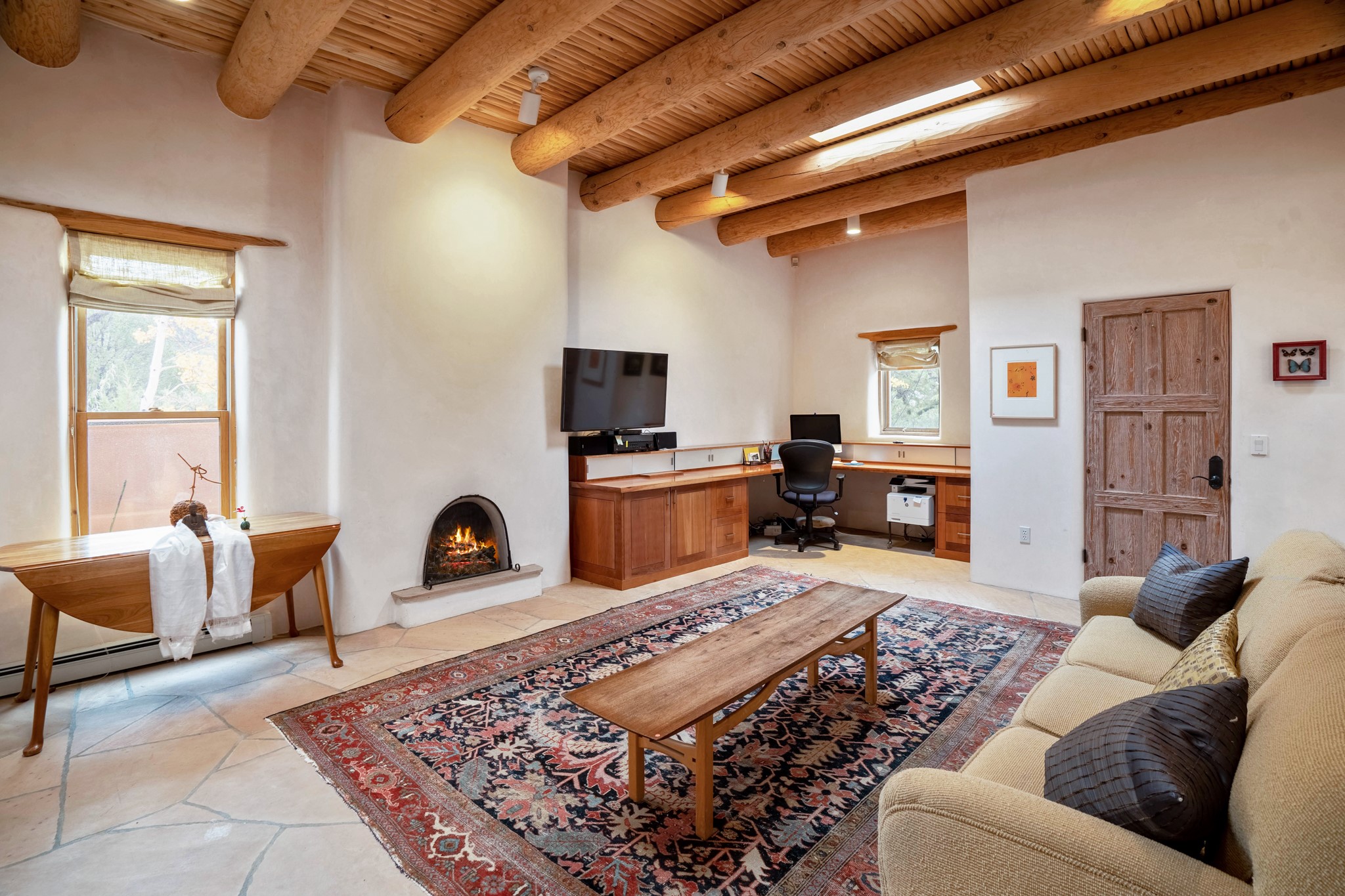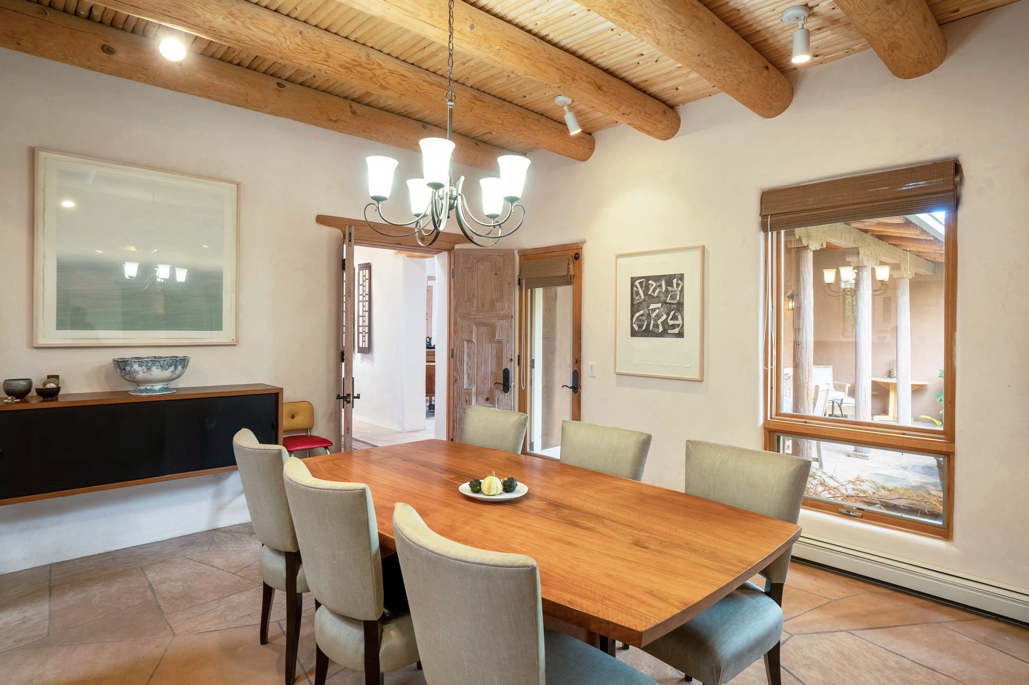 A peaceful, mostly adobe home and oasis with gorgeous living spaces both inside and out! 4 bedrooms and 3 full baths and 2 half baths with 3880sf create the foundation for a warm, inviting home with a great entertaining layout; living room and kitchen have french doors to the lush backyard and there is a fantastic butler's pantry, Sub Zero and DCS appliances and large island. The floorplan is nicely separated with two guest bedrooms (one with ensuite bath and its own exterior entry) on the opposite side of the house from the owner's suite. The backyard is its own secret garden - lush plants on a drip system, an arbor, hot tub and an outdoor fireplace - and backs onto several acres of common space behind the Museums. Other great features are a library with built-in shelves, diamond plaster finish throughout, a mud room between the 2-car garage and kitchen, a total of 5 fireplaces, fenced dog enclosure with large dog house, and an inviting front garden/patio. This home is a must see!