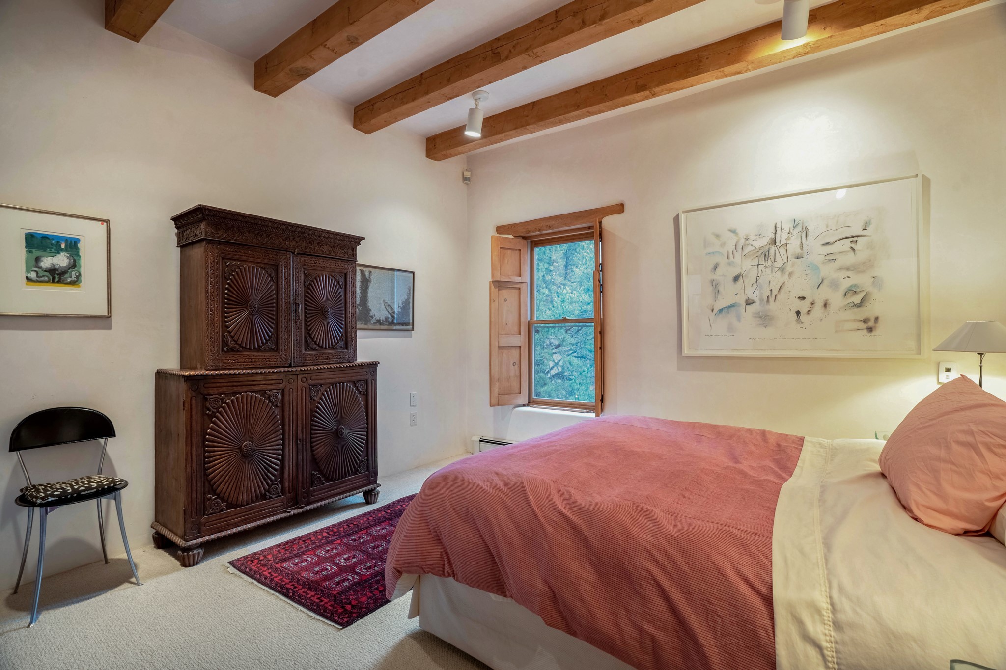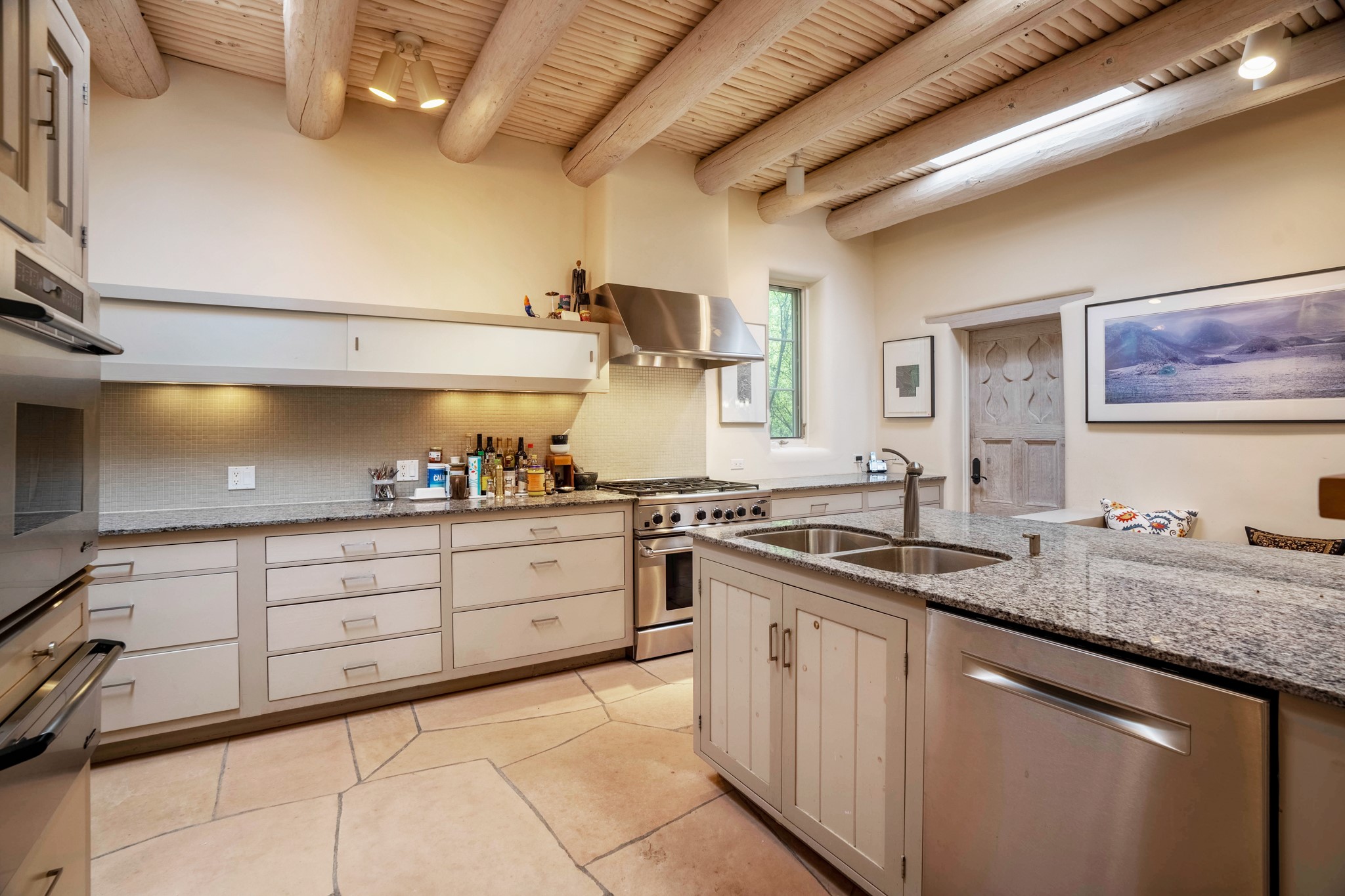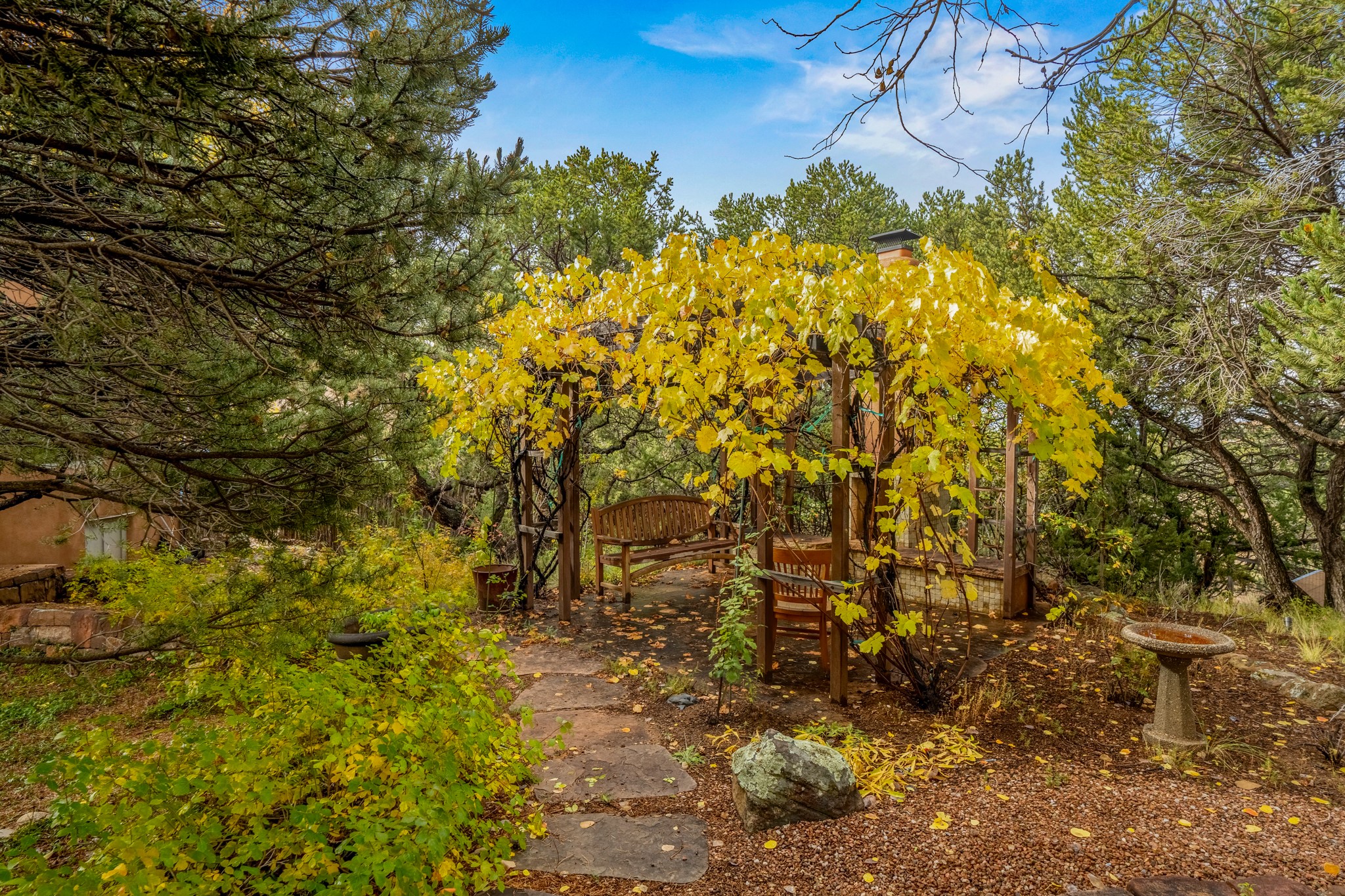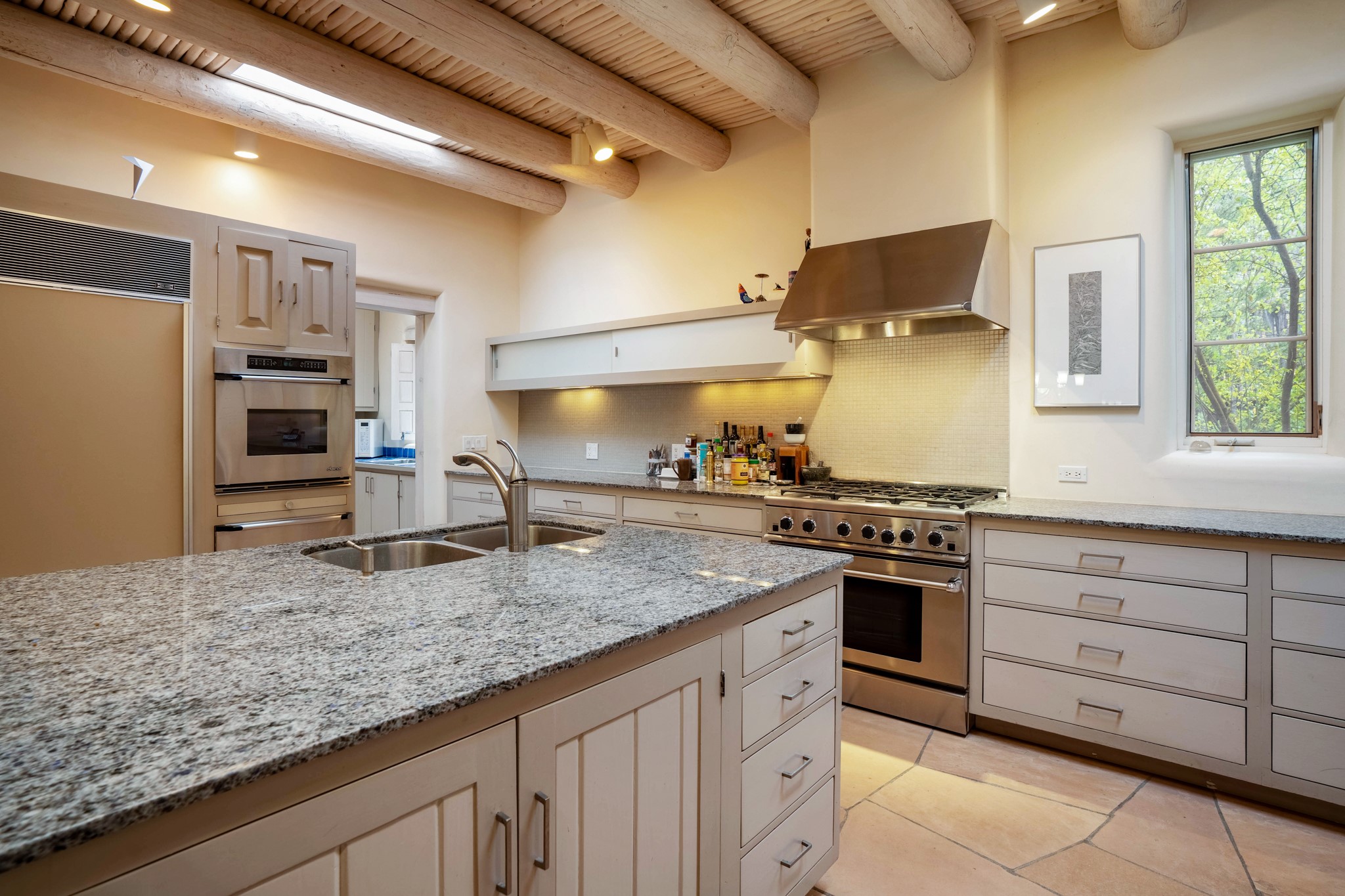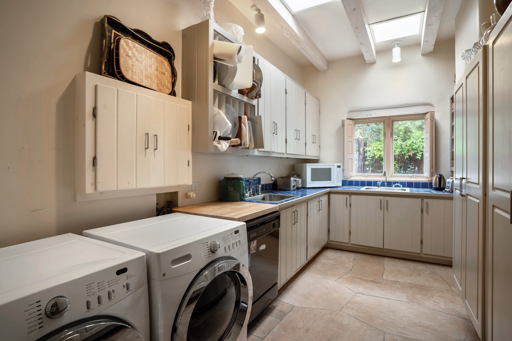 A peaceful, mostly adobe home and oasis with gorgeous living spaces both inside and out! 4 bedrooms and 3 full baths and 2 half baths with 3880sf create the foundation for a warm, inviting home with a great entertaining layout; living room and kitchen have french doors to the lush backyard and there is a fantastic butler's pantry, Sub Zero and DCS appliances and large island. The floorplan is nicely separated with two guest bedrooms (one with ensuite bath and its own exterior entry) on the opposite side of the house from the owner's suite. The backyard is its own secret garden - lush plants on a drip system, an arbor, hot tub and an outdoor fireplace - and backs onto several acres of common space behind the Museums. Other great features are a library with built-in shelves, diamond plaster finish throughout, a mud room between the 2-car garage and kitchen, a total of 5 fireplaces, fenced dog enclosure with large dog house, and an inviting front garden/patio. This home is a must see!