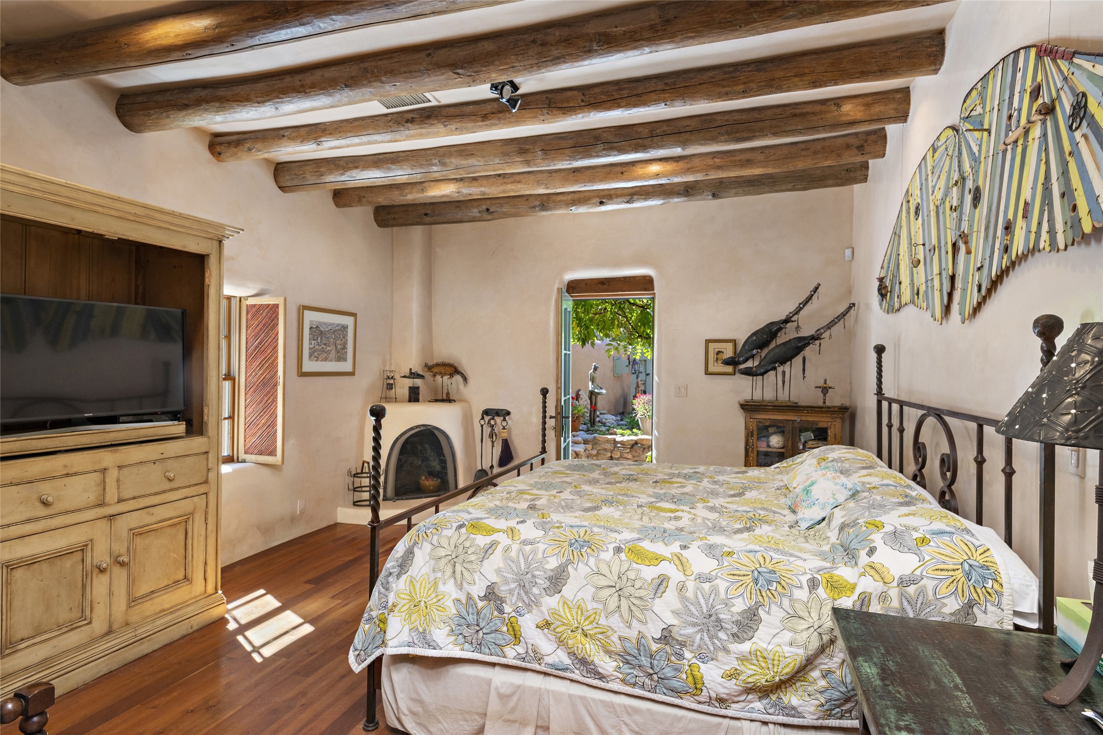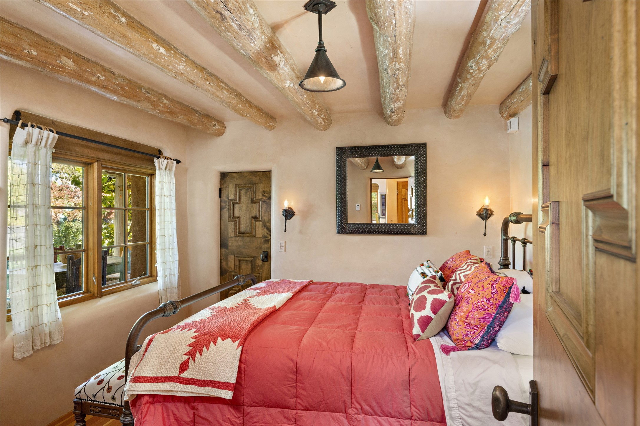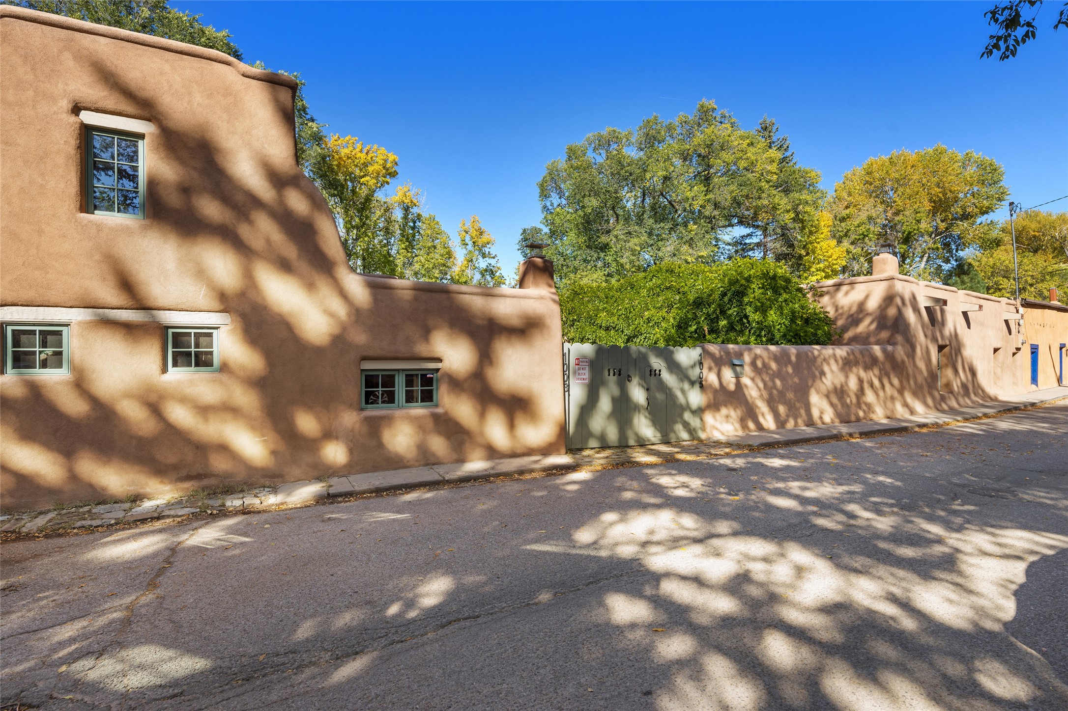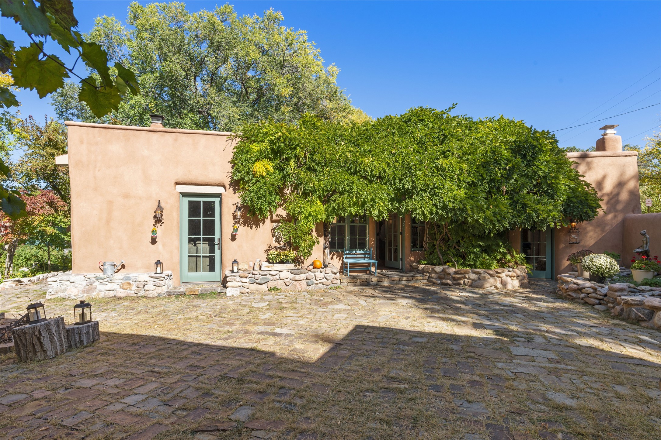This authentic historic Eastside compound, completely remodeled by the well-respected builder Sharon Woods, is situated in an area close to world-class dining, art galleries, and shopping along one of the best-known addresses in downtown Santa Fe. The property consists of s single level 2 bedroom, 1,968 sq.ft. main house and two-story, 4 bedroom, 1,528 sq.ft. guest house, both adobe and frame construction. Classically Santa Fe styled, the compound is surrounded by 0.208 acres of completely lush and mature landscaping behind private, walled, and gated spaces. Ideal for entertaining, the formal living areas create an open and airy place for guests and family to mingle and enjoy the mature gardens, bubbling fountain, and hot tub. The legendary and timeless Acequia Madre still runs through the back of the compound. Smooth plaster walls, vigas, brick, flagstone, and wood floors, as well as detailed ironwork throughout the homes, help to exude a refined and sophisticated lifestyle. Both homes have their own full kitchens, perfect for guests and families. Zoned RAC in the Historic Eastside, acequia water rights also convey with the property. This ideal location property is just down the street from The Teahouse, Geronimos and El Farol making it a desirable Santa Fe destination. Come open one of the two "truth doors" to step back in time to when the homes were first imagined.