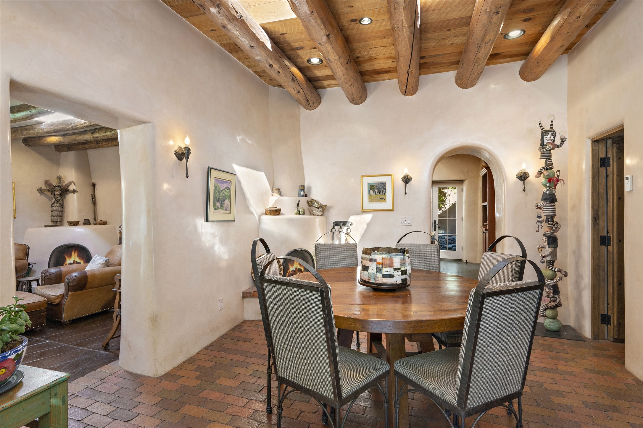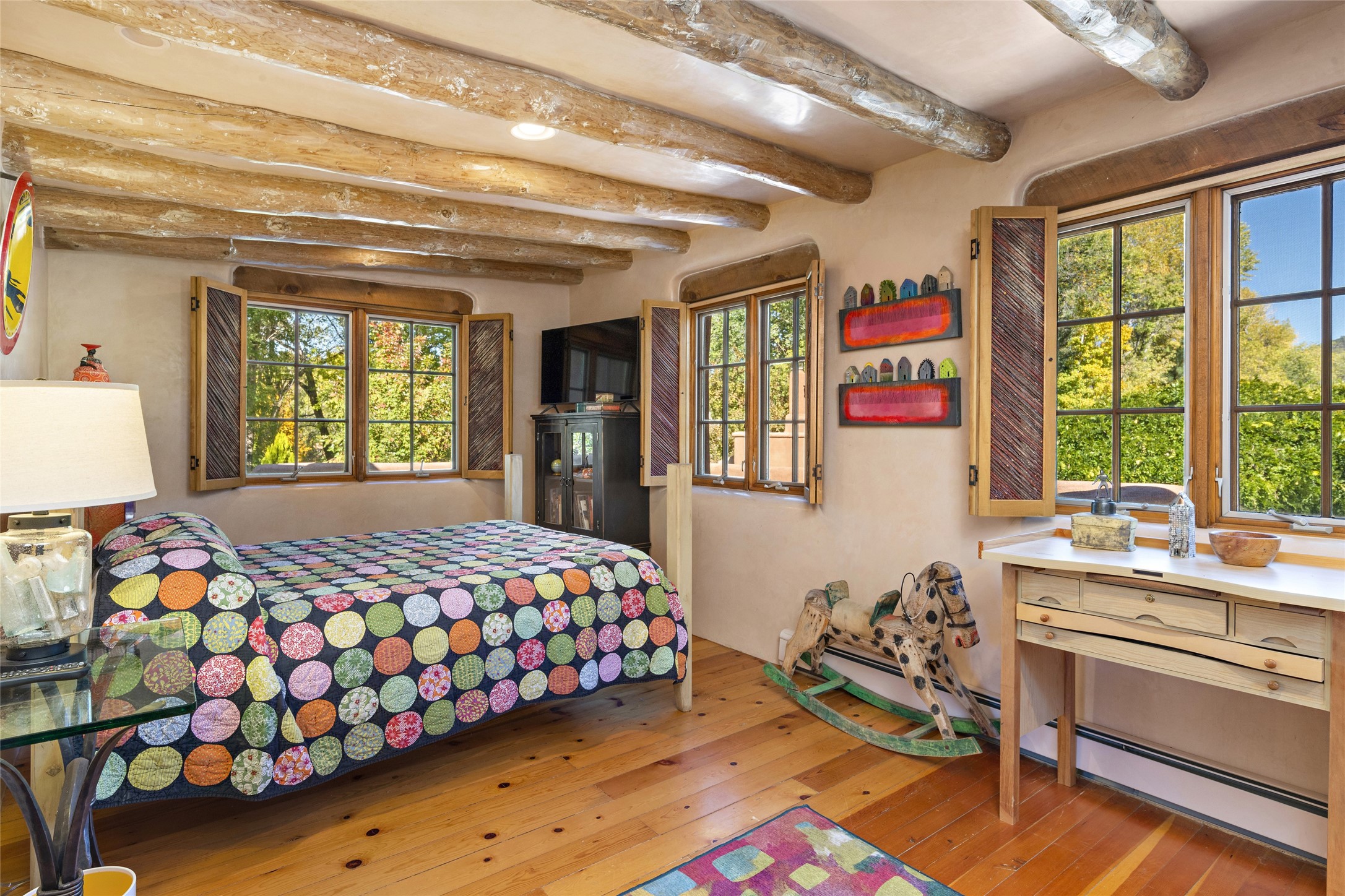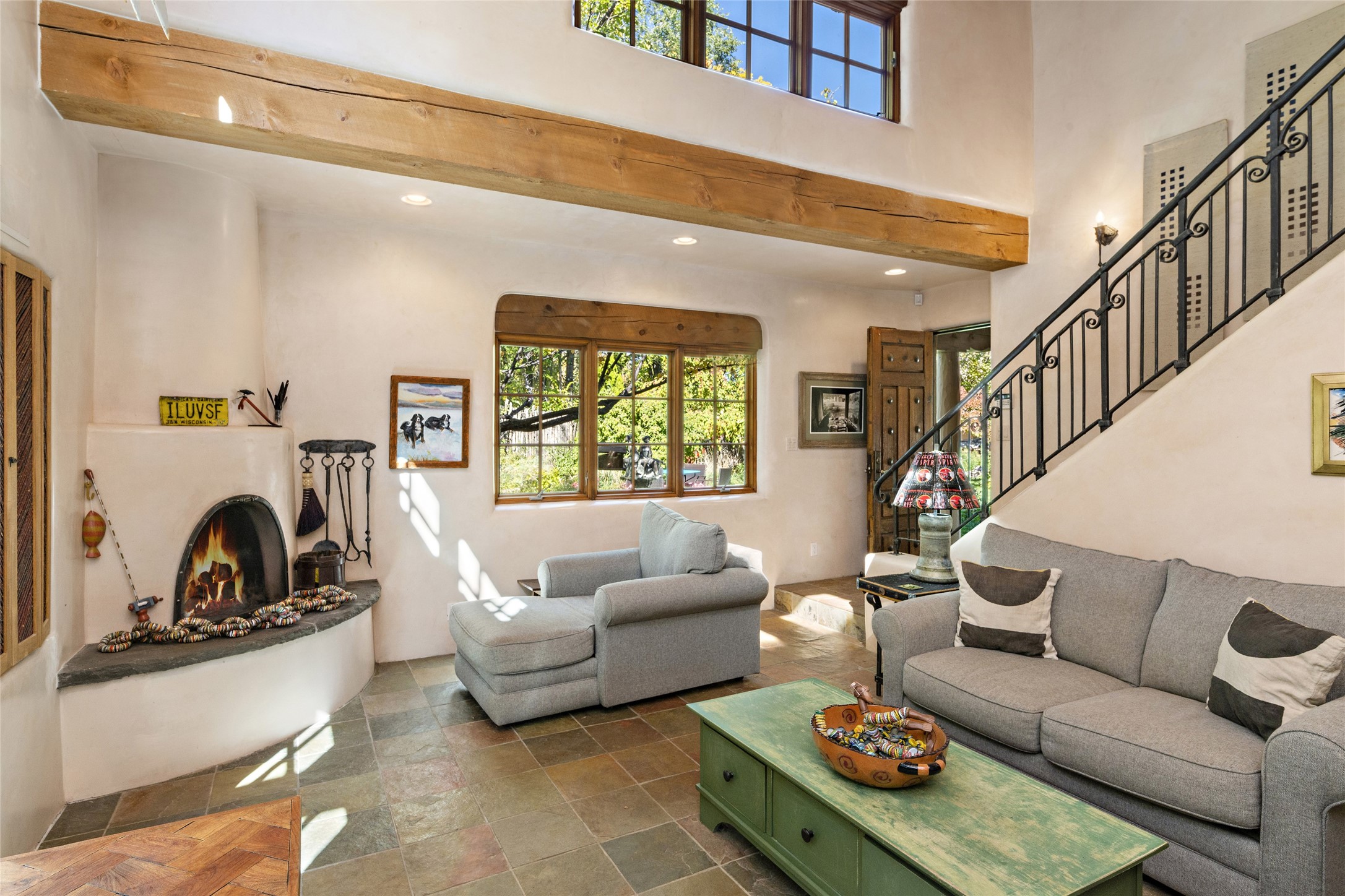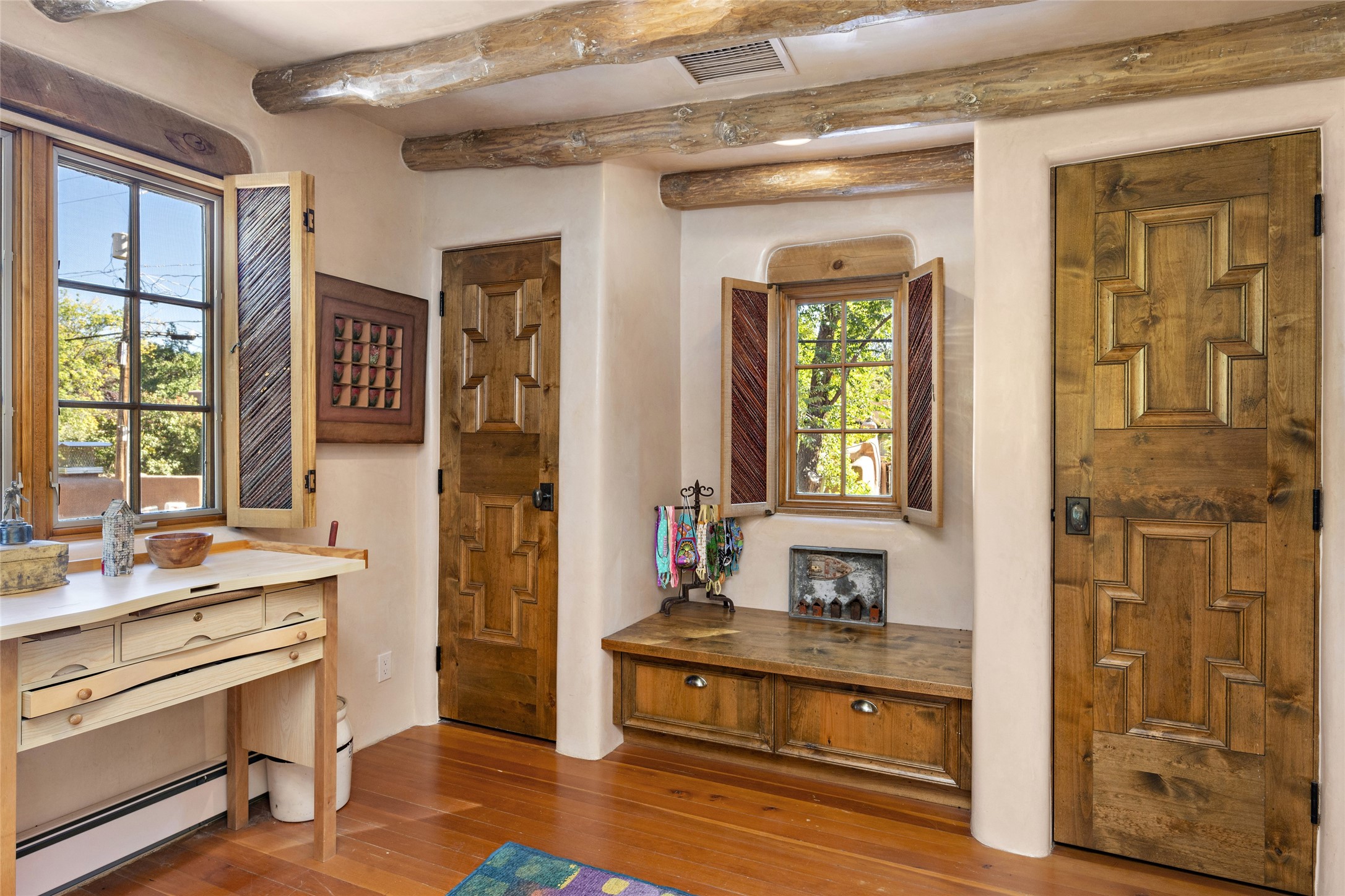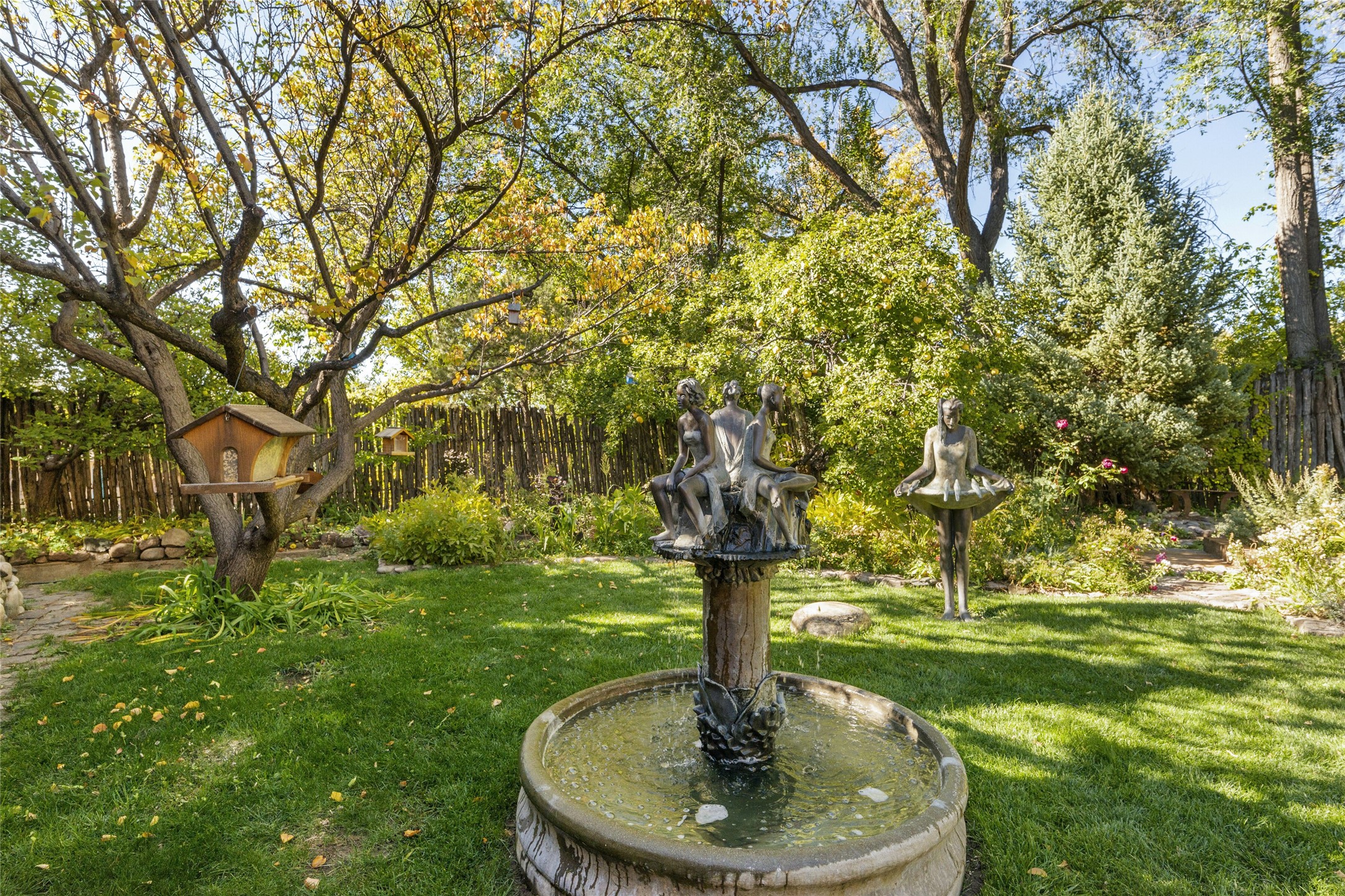This authentic historic Eastside compound, completely remodeled by the well-respected builder Sharon Woods, is situated in an area close to world-class dining, art galleries, and shopping along one of the best-known addresses in downtown Santa Fe. The property consists of s single level 2 bedroom, 1,968 sq.ft. main house and two-story, 4 bedroom, 1,528 sq.ft. guest house, both adobe and frame construction. Classically Santa Fe styled, the compound is surrounded by 0.208 acres of completely lush and mature landscaping behind private, walled, and gated spaces. Ideal for entertaining, the formal living areas create an open and airy place for guests and family to mingle and enjoy the mature gardens, bubbling fountain, and hot tub. The legendary and timeless Acequia Madre still runs through the back of the compound. Smooth plaster walls, vigas, brick, flagstone, and wood floors, as well as detailed ironwork throughout the homes, help to exude a refined and sophisticated lifestyle. Both homes have their own full kitchens, perfect for guests and families. Zoned RAC in the Historic Eastside, acequia water rights also convey with the property. This ideal location property is just down the street from The Teahouse, Geronimos and El Farol making it a desirable Santa Fe destination. Come open one of the two "truth doors" to step back in time to when the homes were first imagined.