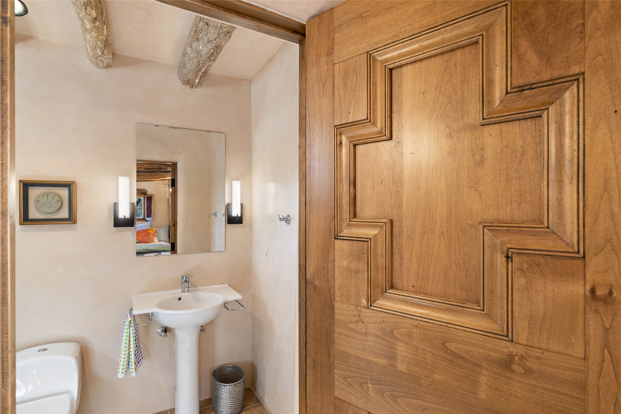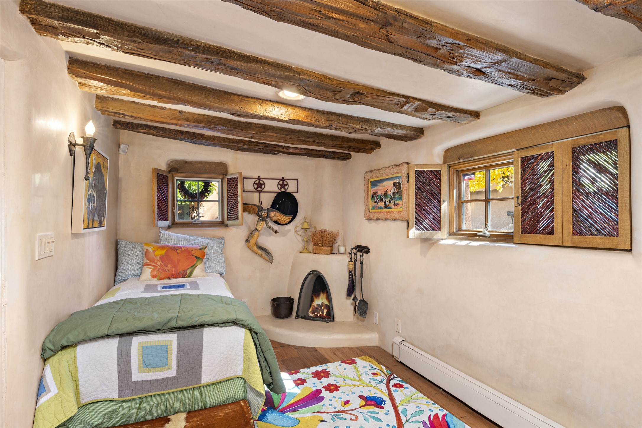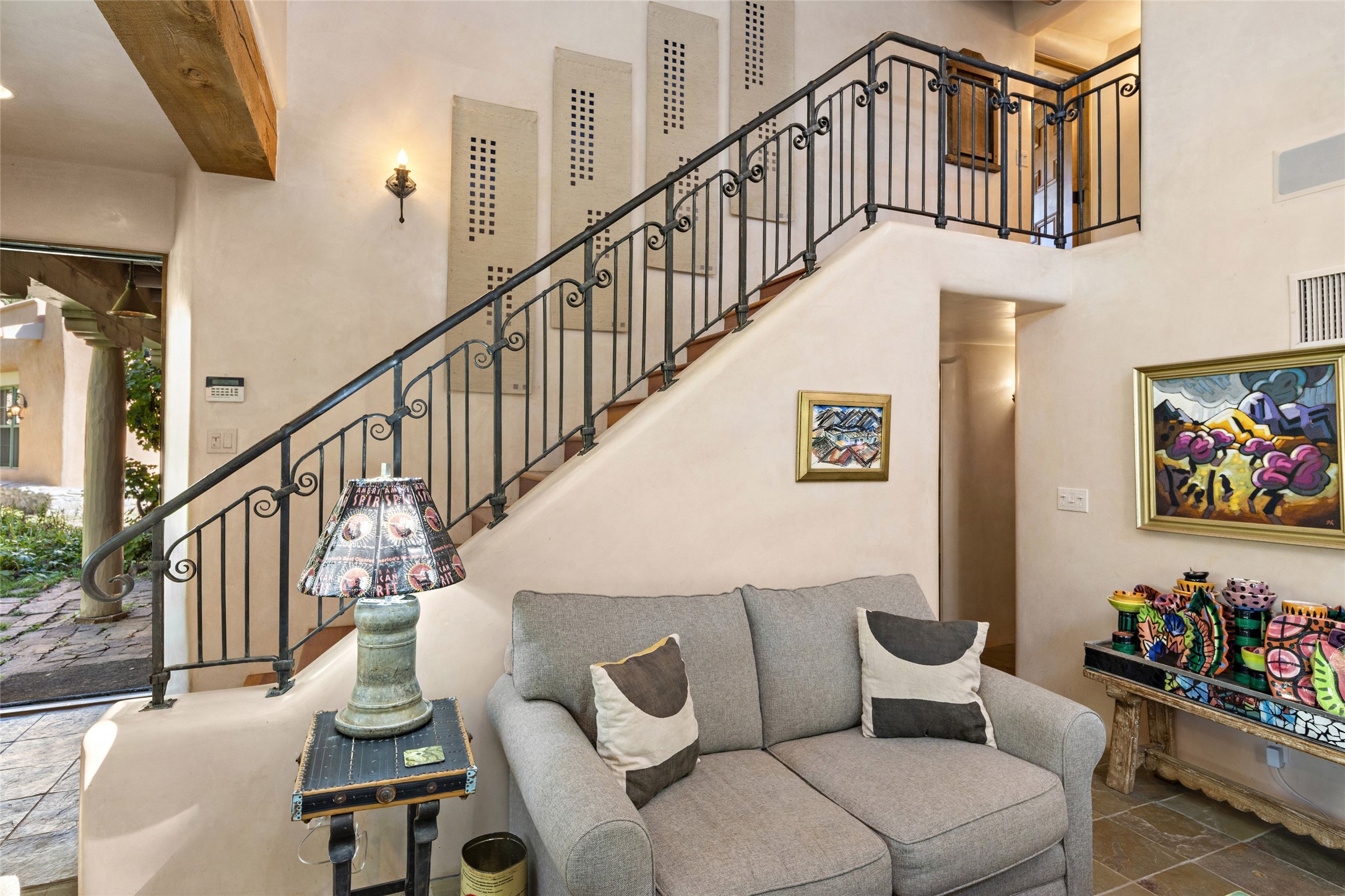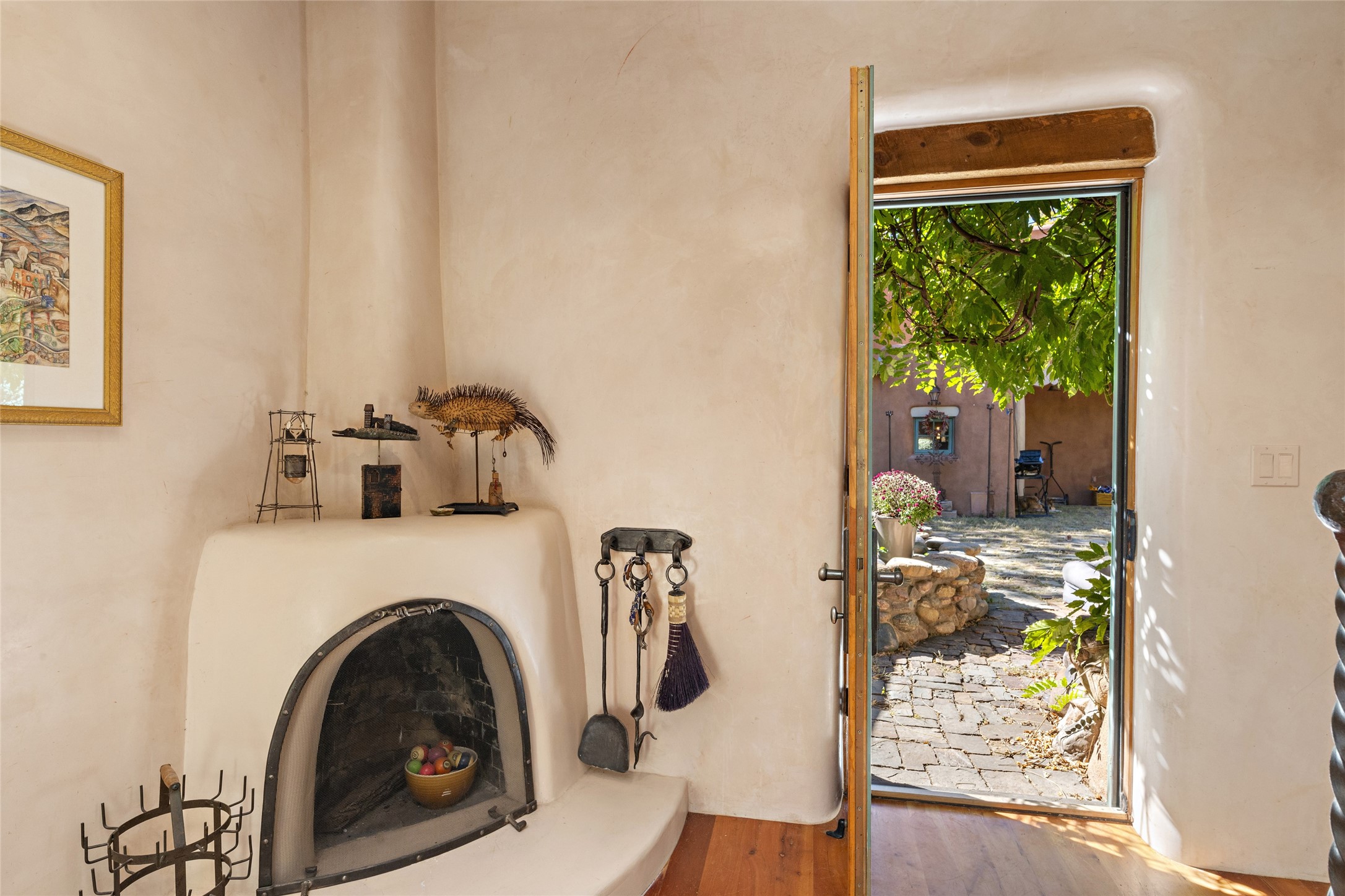 This authentic historic Eastside compound, completely remodeled by the well-respected builder Sharon Woods, is situated in an area close to world-class dining, art galleries, and shopping along one of the best-known addresses in downtown Santa Fe. The property consists of s single level 2 bedroom, 1,968 sq.ft. main house and two-story, 4 bedroom, 1,528 sq.ft. guest house, both adobe and frame construction. Classically Santa Fe styled, the compound is surrounded by 0.208 acres of completely lush and mature landscaping behind private, walled, and gated spaces. Ideal for entertaining, the formal living areas create an open and airy place for guests and family to mingle and enjoy the mature gardens, bubbling fountain, and hot tub. The legendary and timeless Acequia Madre still runs through the back of the compound. Smooth plaster walls, vigas, brick, flagstone, and wood floors, as well as detailed ironwork throughout the homes, help to exude a refined and sophisticated lifestyle. Both homes have their own full kitchens, perfect for guests and families. Zoned RAC in the Historic Eastside, acequia water rights also convey with the property. This ideal location property is just down the street from The Teahouse, Geronimos and El Farol making it a desirable Santa Fe destination. Come open one of the two "truth doors" to step back in time to when the homes were first imagined.