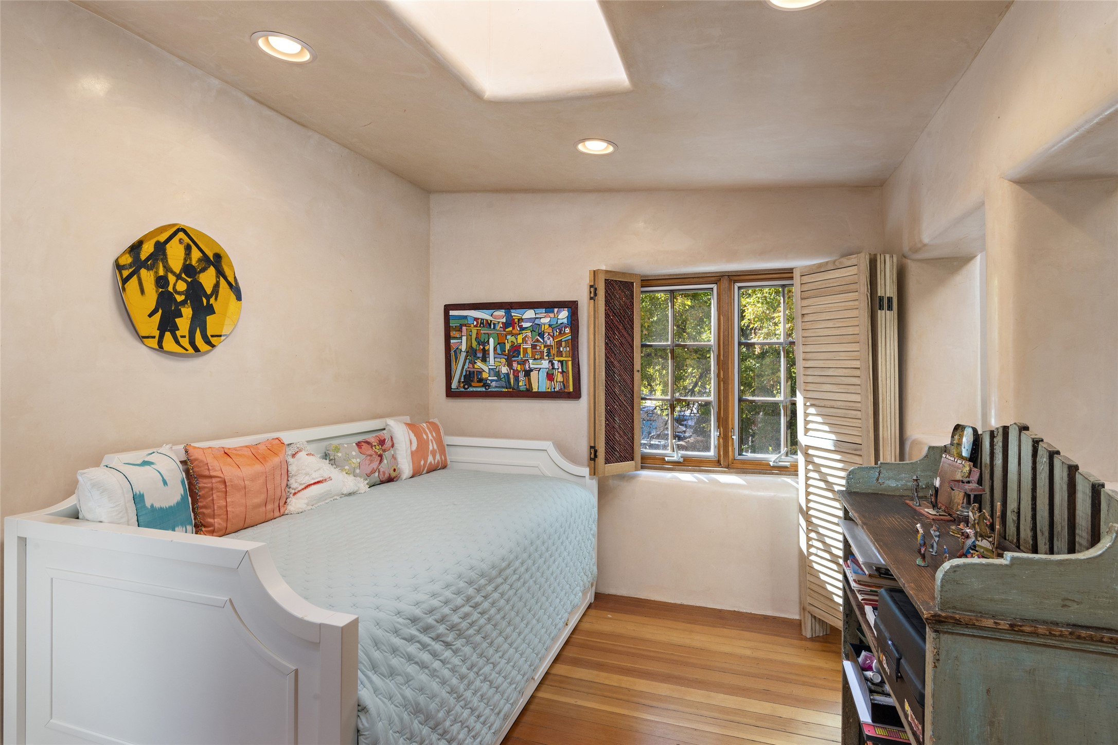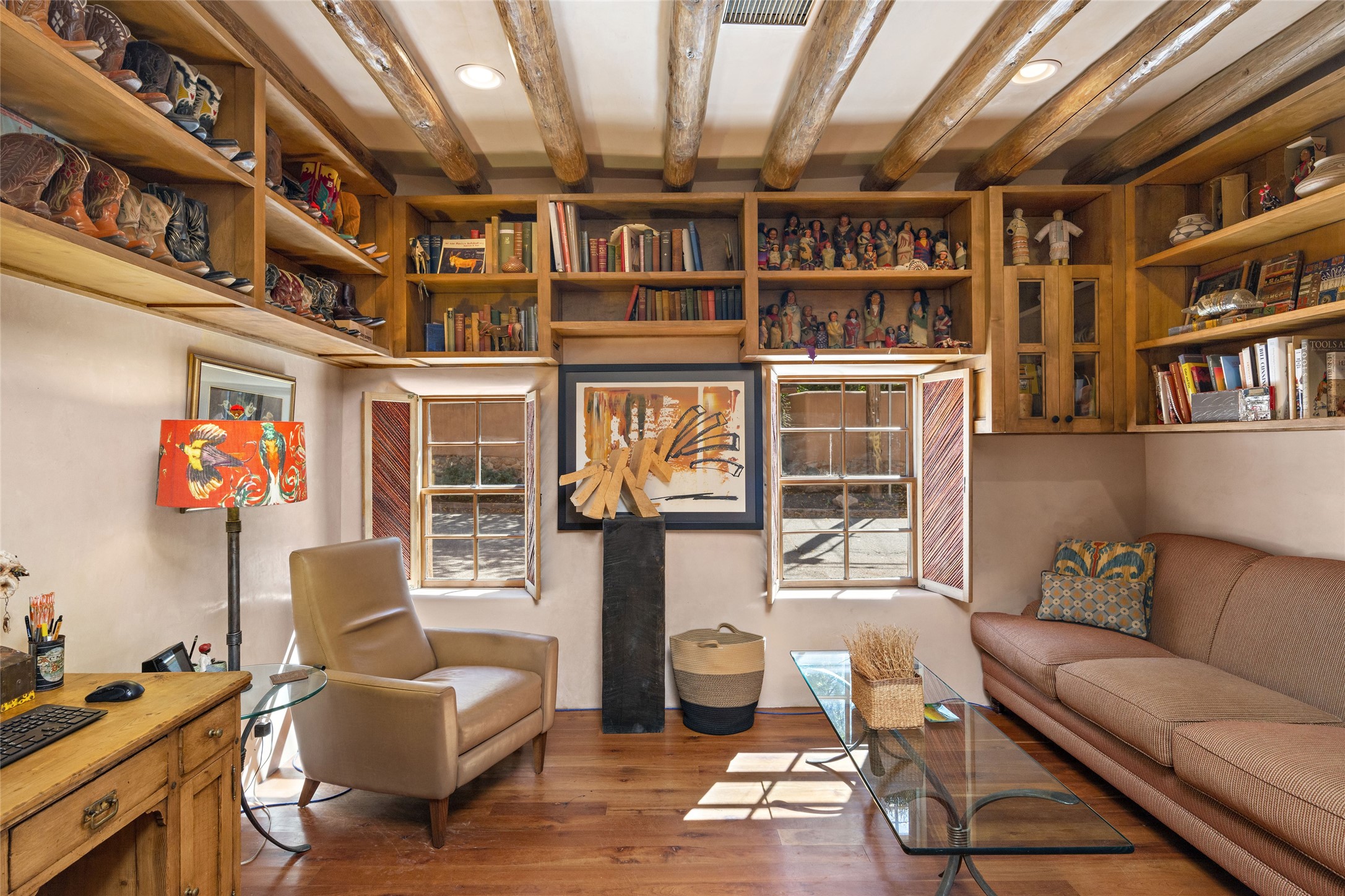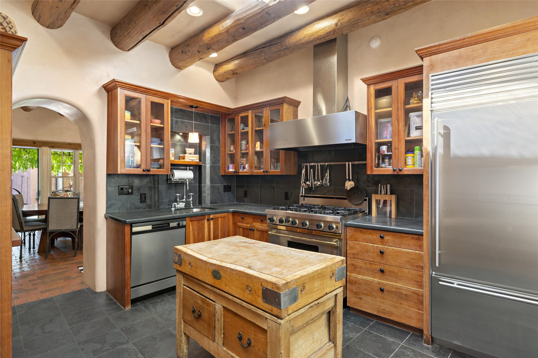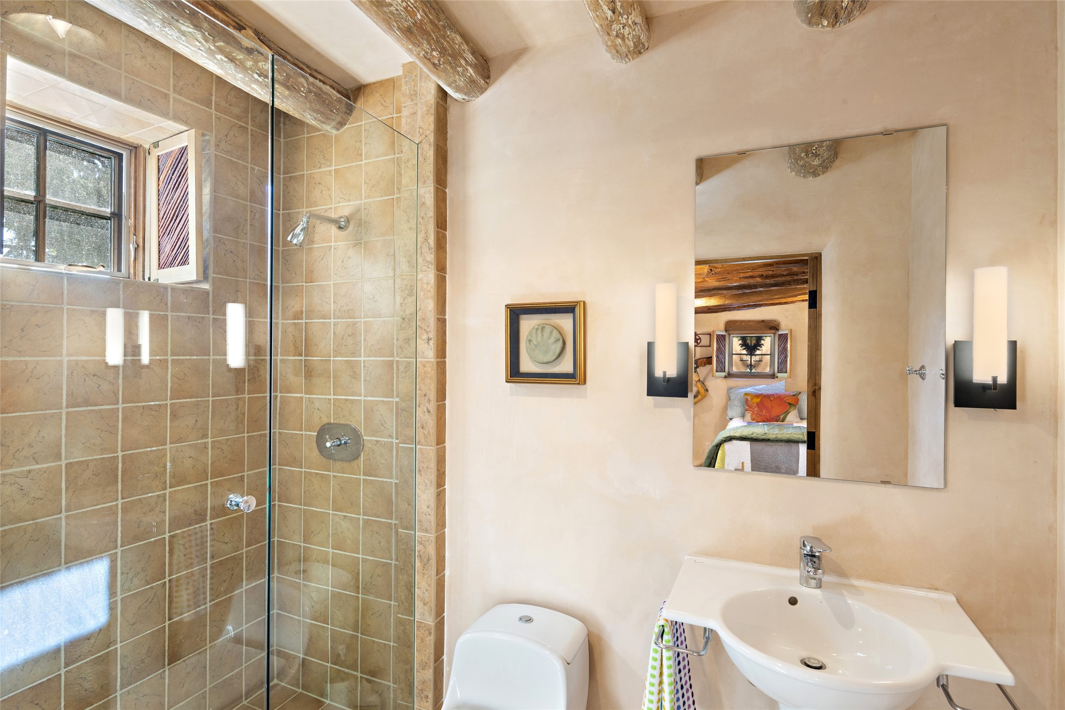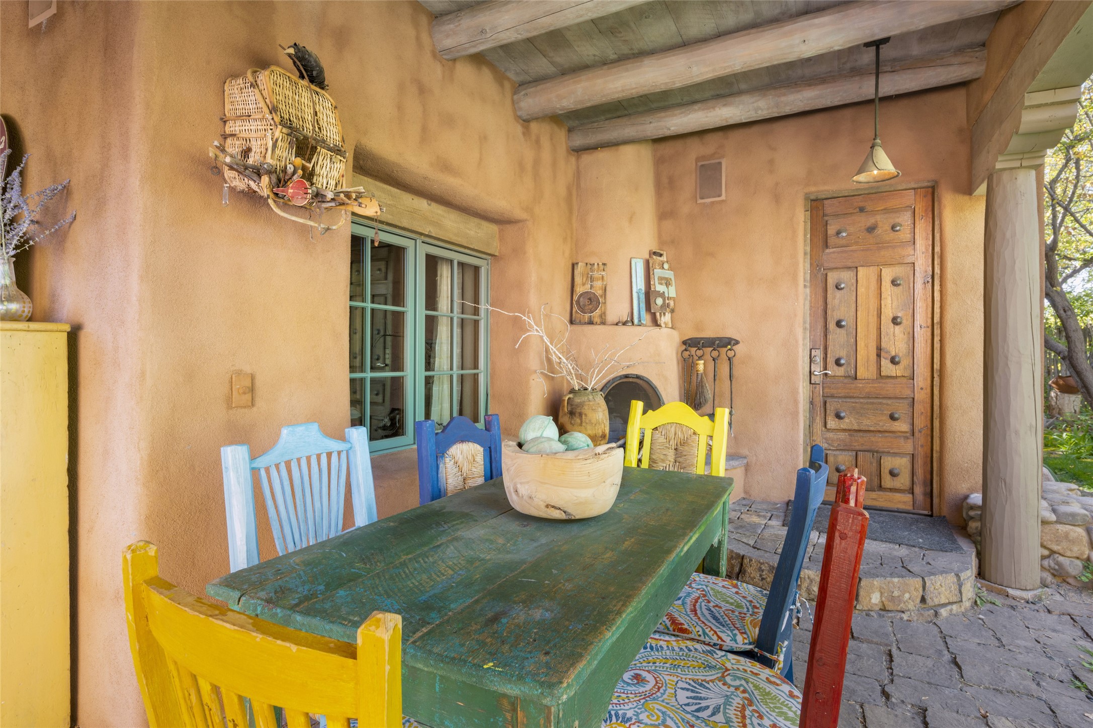This authentic historic Eastside compound, completely remodeled by the well-respected builder Sharon Woods, is situated in an area close to world-class dining, art galleries, and shopping along one of the best-known addresses in downtown Santa Fe. The property consists of s single level 2 bedroom, 1,968 sq.ft. main house and two-story, 4 bedroom, 1,528 sq.ft. guest house, both adobe and frame construction. Classically Santa Fe styled, the compound is surrounded by 0.208 acres of completely lush and mature landscaping behind private, walled, and gated spaces. Ideal for entertaining, the formal living areas create an open and airy place for guests and family to mingle and enjoy the mature gardens, bubbling fountain, and hot tub. The legendary and timeless Acequia Madre still runs through the back of the compound. Smooth plaster walls, vigas, brick, flagstone, and wood floors, as well as detailed ironwork throughout the homes, help to exude a refined and sophisticated lifestyle. Both homes have their own full kitchens, perfect for guests and families. Zoned RAC in the Historic Eastside, acequia water rights also convey with the property. This ideal location property is just down the street from The Teahouse, Geronimos and El Farol making it a desirable Santa Fe destination. Come open one of the two "truth doors" to step back in time to when the homes were first imagined.