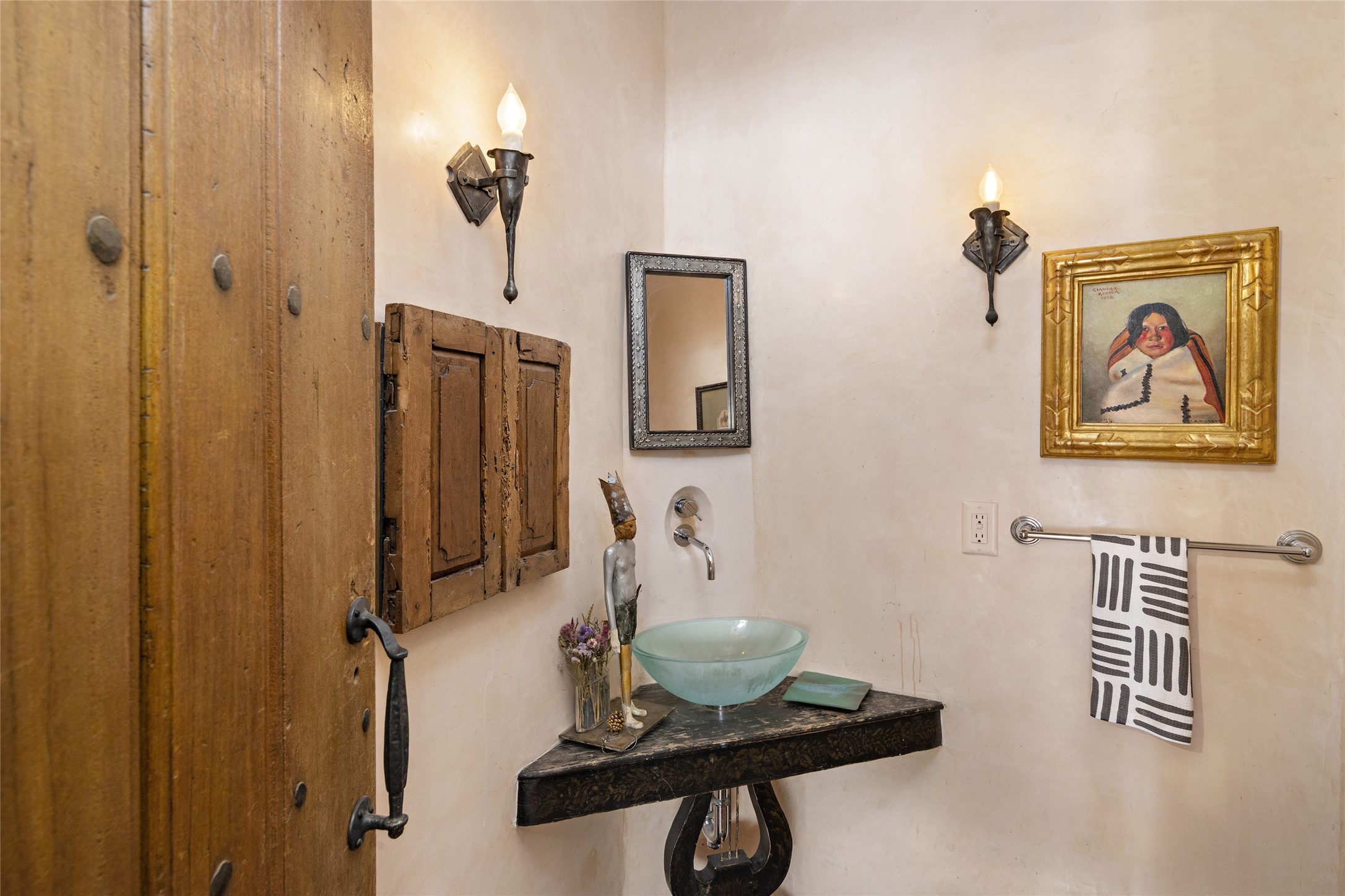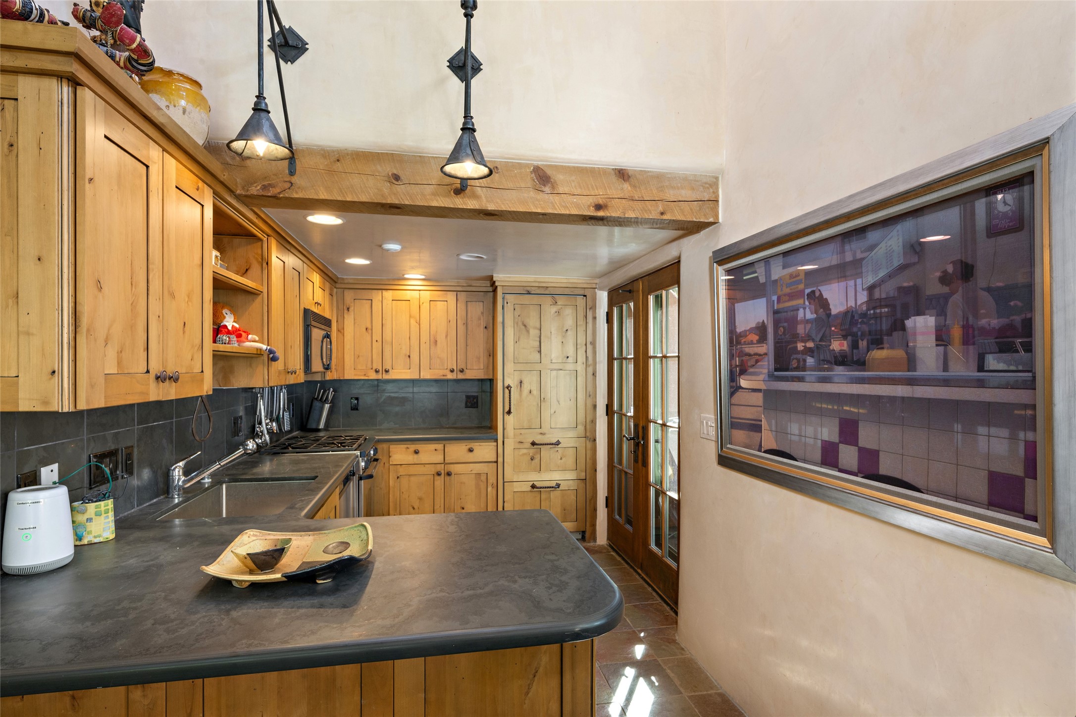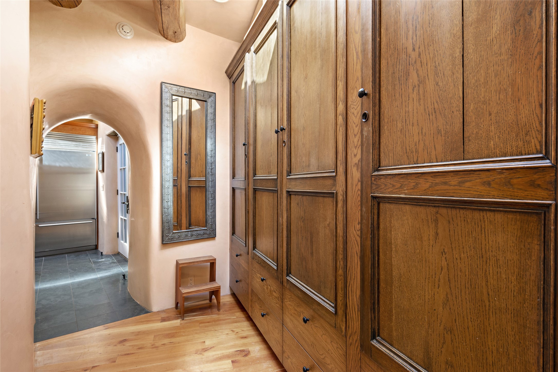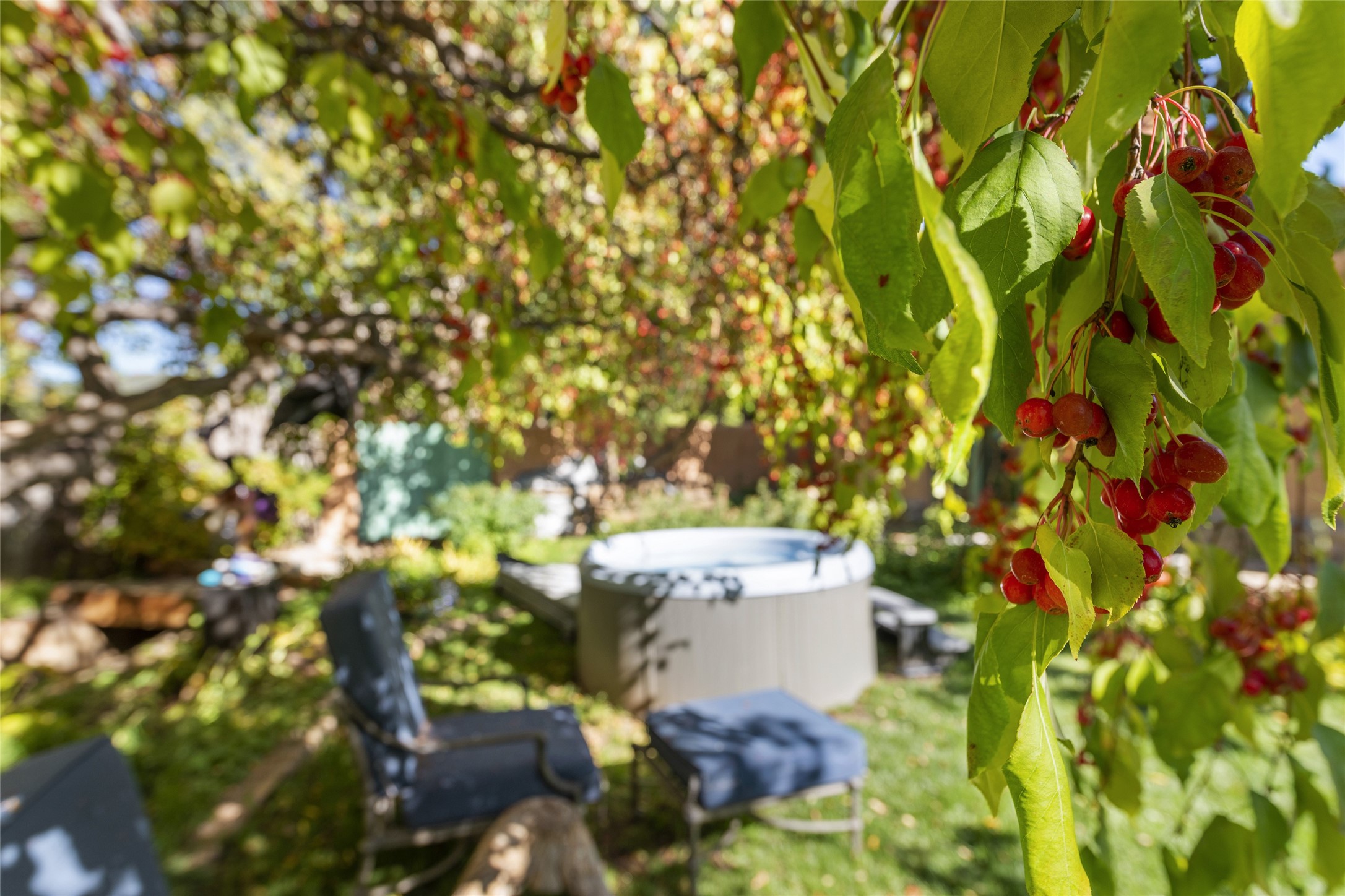 This authentic historic Eastside compound, completely remodeled by the well-respected builder Sharon Woods, is situated in an area close to world-class dining, art galleries, and shopping along one of the best-known addresses in downtown Santa Fe. The property consists of s single level 2 bedroom, 1,968 sq.ft. main house and two-story, 4 bedroom, 1,528 sq.ft. guest house, both adobe and frame construction. Classically Santa Fe styled, the compound is surrounded by 0.208 acres of completely lush and mature landscaping behind private, walled, and gated spaces. Ideal for entertaining, the formal living areas create an open and airy place for guests and family to mingle and enjoy the mature gardens, bubbling fountain, and hot tub. The legendary and timeless Acequia Madre still runs through the back of the compound. Smooth plaster walls, vigas, brick, flagstone, and wood floors, as well as detailed ironwork throughout the homes, help to exude a refined and sophisticated lifestyle. Both homes have their own full kitchens, perfect for guests and families. Zoned RAC in the Historic Eastside, acequia water rights also convey with the property. This ideal location property is just down the street from The Teahouse, Geronimos and El Farol making it a desirable Santa Fe destination. Come open one of the two "truth doors" to step back in time to when the homes were first imagined.