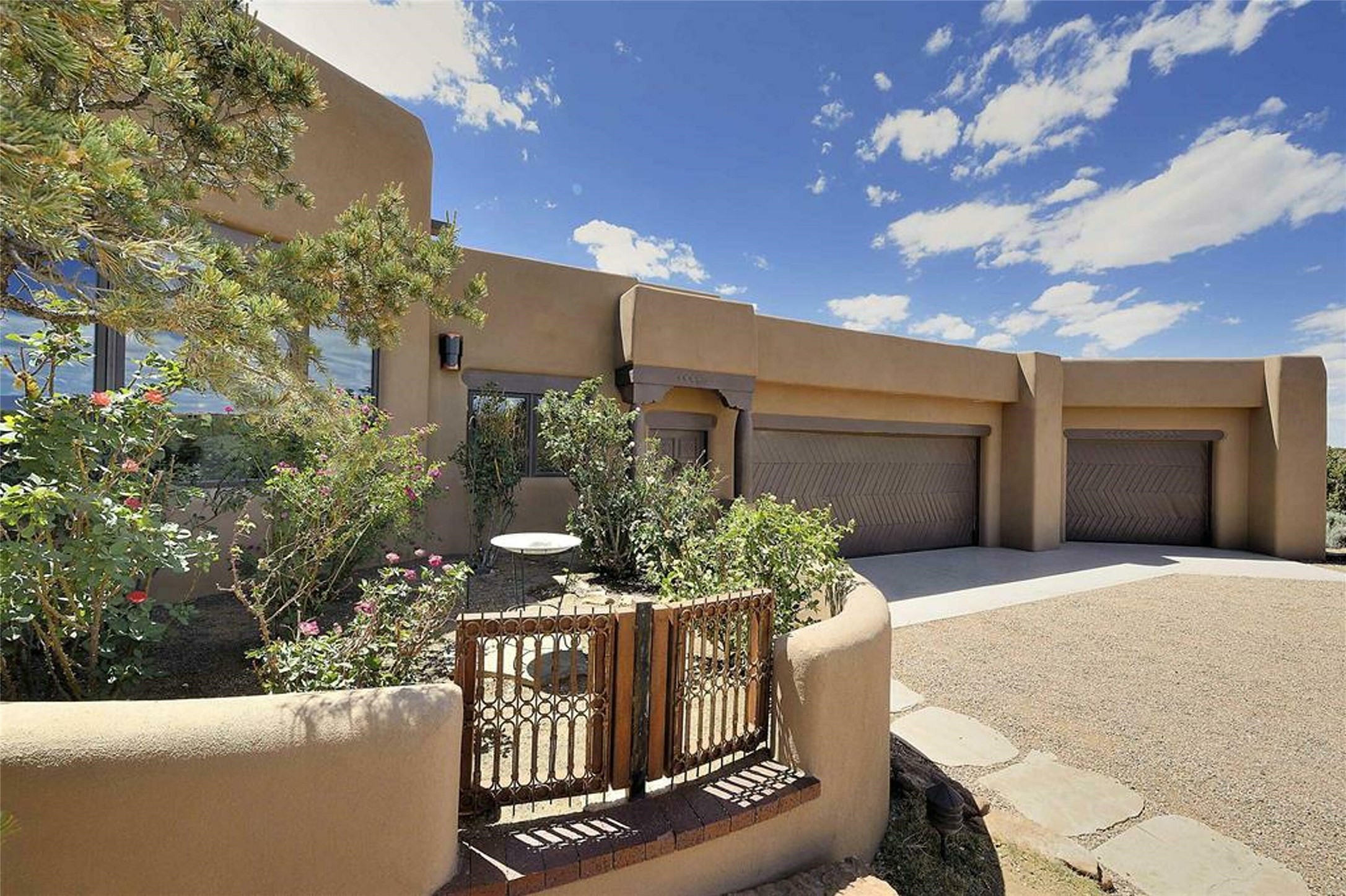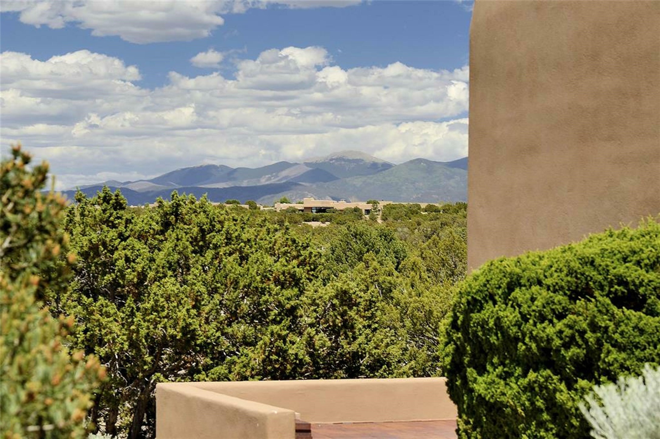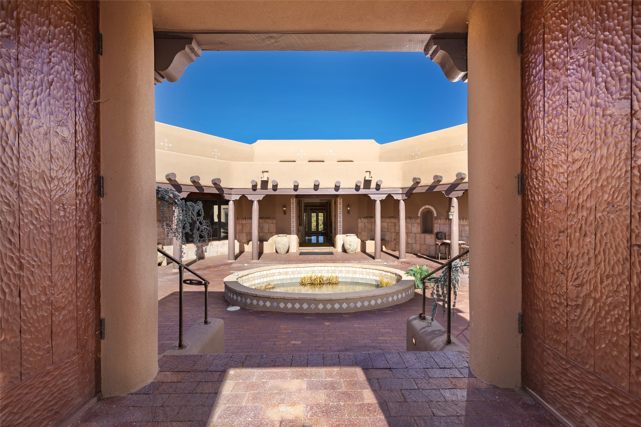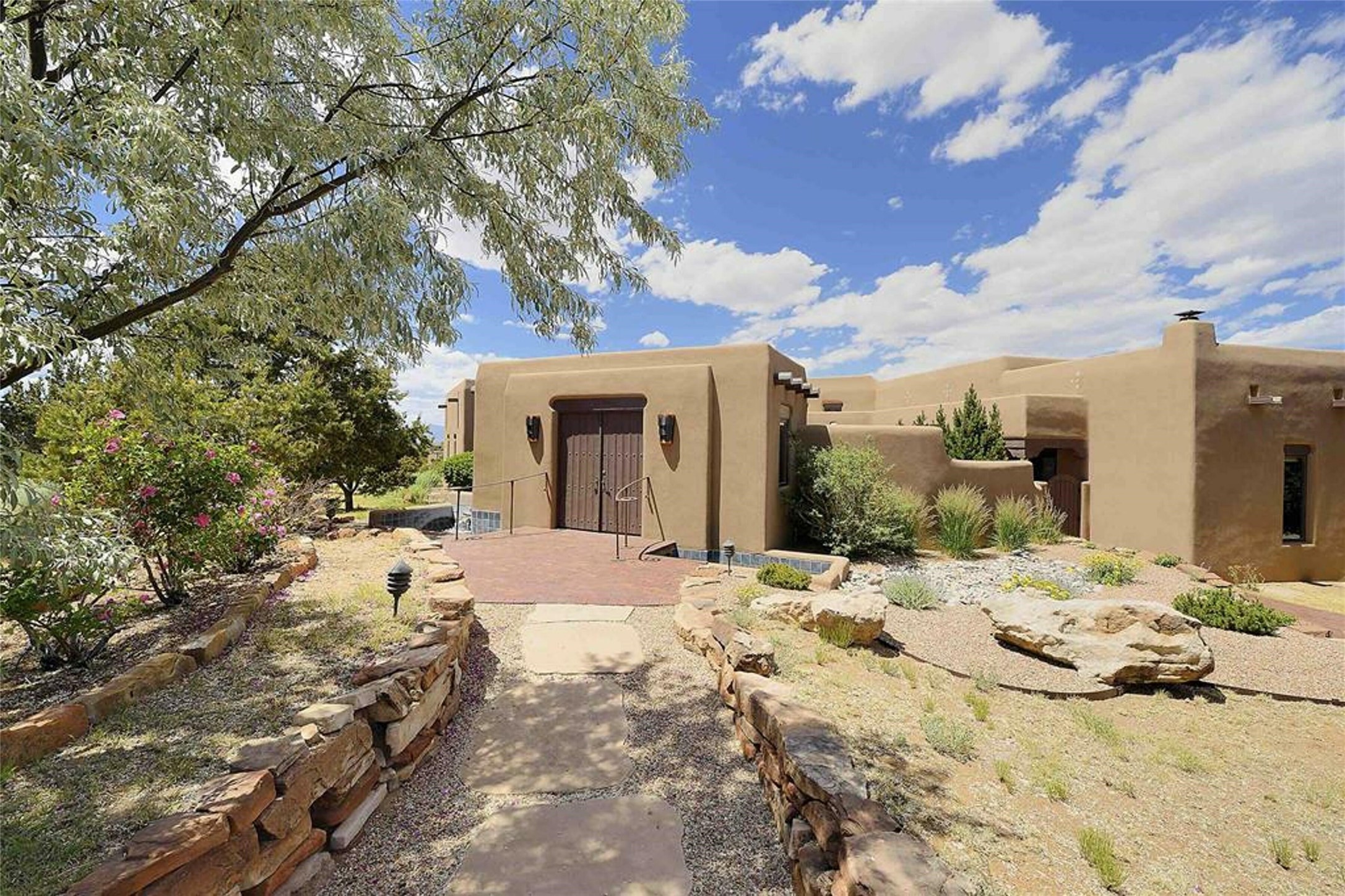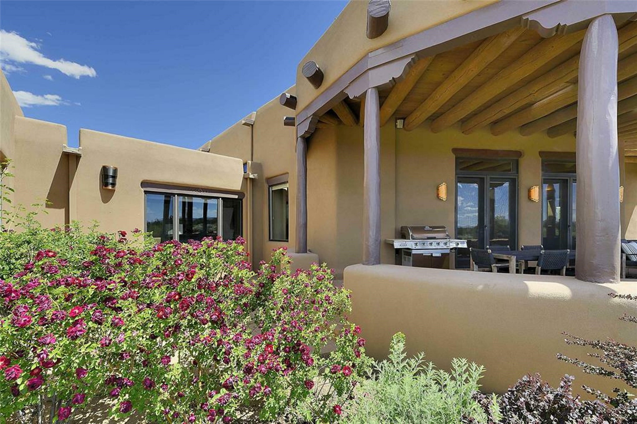Las Campanas architectural masterpiece with impressive Jemez Mountain, Sangre de Cristo Mountain, golf course lake, and sunset views! Sited on a premiere 2.2-acre view lot, this exquisite Las Campanas home exemplifies the unique blend of modern design with the true essence of Santa Fe. Thoughtfully designed with an open concept, this exceptional 4,444 square foot home with 3 bedrooms + plus an office, offers the ultimate flexible floor plan. This exciting home, with welcoming front entrance water features, delights with a tranquil koi pond within the fully enclosed front entrance courtyard, ideal for entertaining and pets. Design features include an expansive great room with Jemez Mountain and lake views, a formal dining area, grand fireplace, and portal access. Additional features include a well-appointed chef's island kitchen with Wolf and Sub Zero appliances, Sangre Di Cristo Mountain views, a casual dining area, and generous pantry. The owner's suite impresses with Sangre views, an intimate sitting area with a fireplace, front courtyard access, two walk-in closets, and an elegant bath. Two private guest bedrooms located within their independent guest wing both offer views, a shared bath and privacy. Luxury finishes include vigas, custom cabinetry, natural stone flooring, plastered walls, a spacious 3 car garage with one heated bay or an ideal art studio/exercise room, and vibrant rose gardens. This home has been well maintained and the roof and stucco are both under warranty.