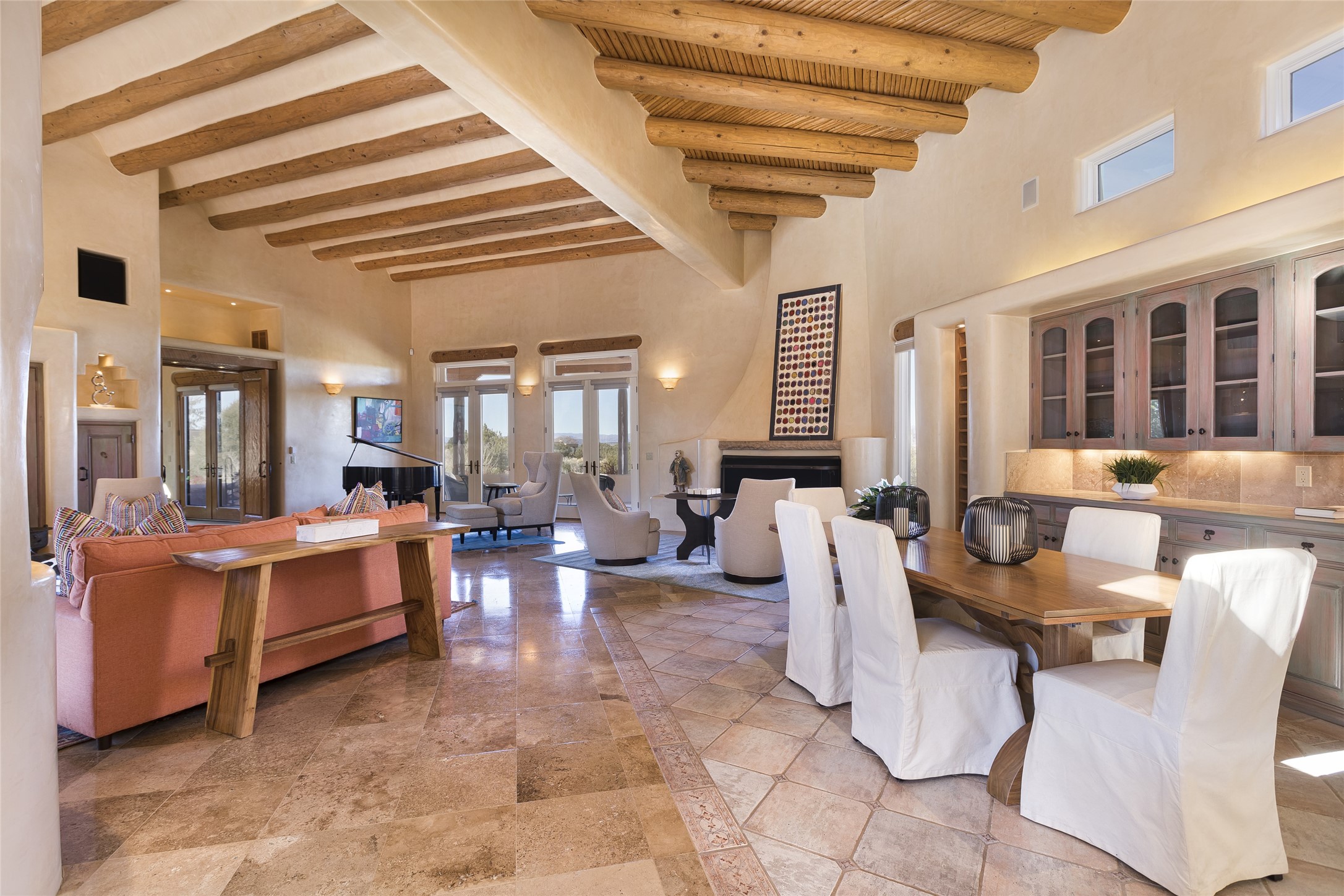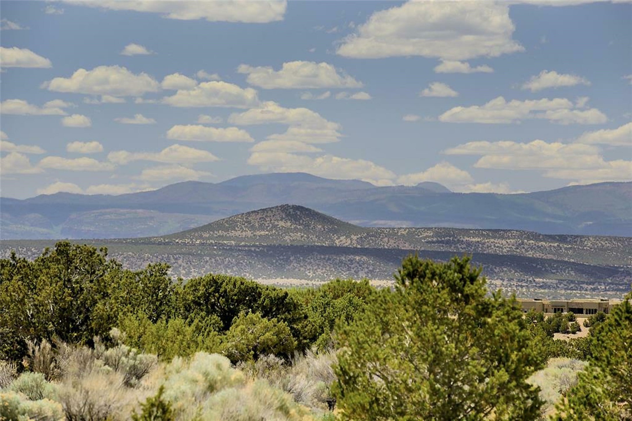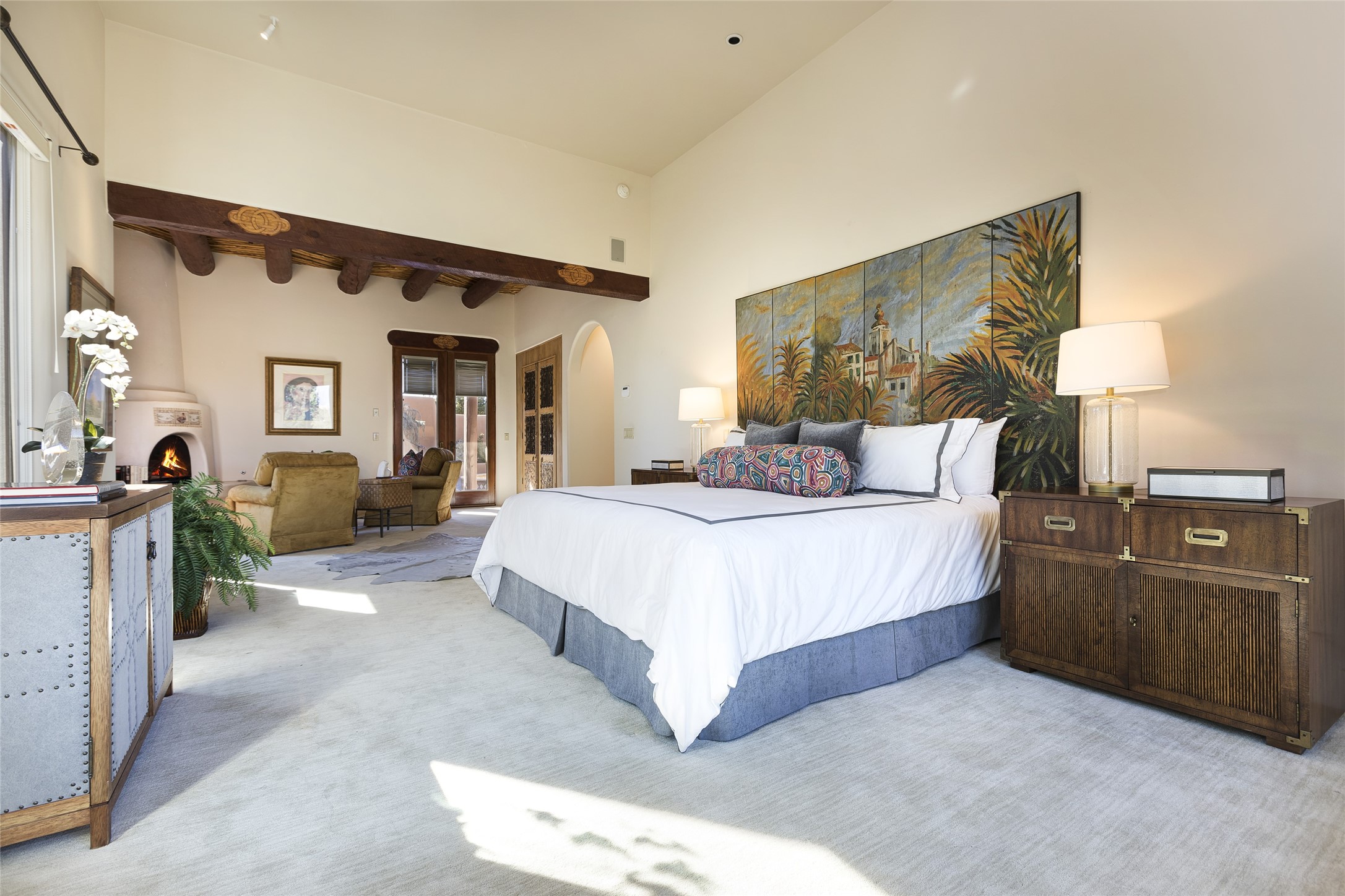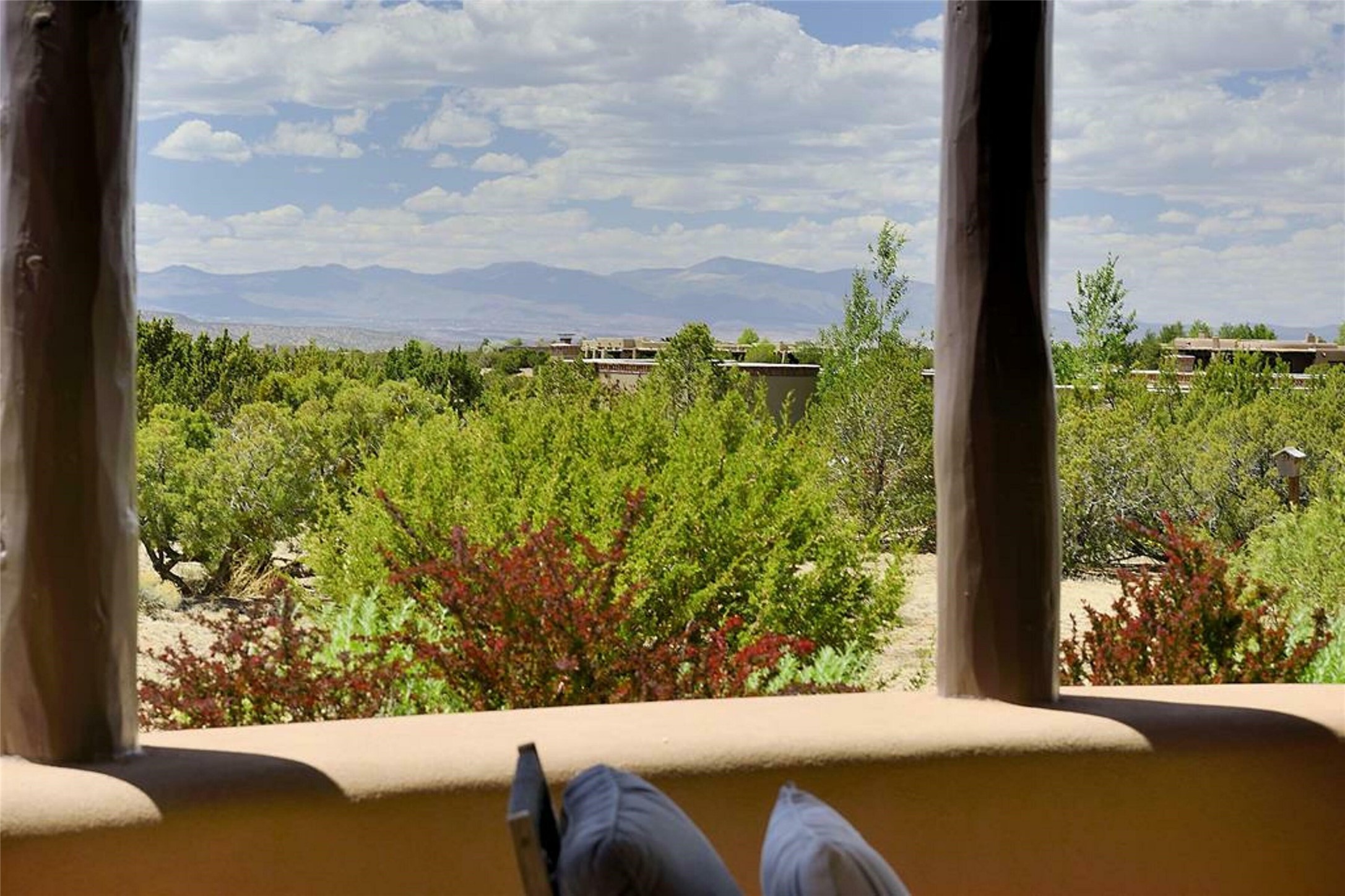 Las Campanas architectural masterpiece with impressive Jemez Mountain, Sangre de Cristo Mountain, golf course lake, and sunset views! Sited on a premiere 2.2-acre view lot, this exquisite Las Campanas home exemplifies the unique blend of modern design with the true essence of Santa Fe. Thoughtfully designed with an open concept, this exceptional 4,444 square foot home with 3 bedrooms + plus an office, offers the ultimate flexible floor plan. This exciting home, with welcoming front entrance water features, delights with a tranquil koi pond within the fully enclosed front entrance courtyard, ideal for entertaining and pets. Design features include an expansive great room with Jemez Mountain and lake views, a formal dining area, grand fireplace, and portal access. Additional features include a well-appointed chef's island kitchen with Wolf and Sub Zero appliances, Sangre Di Cristo Mountain views, a casual dining area, and generous pantry. The owner's suite impresses with Sangre views, an intimate sitting area with a fireplace, front courtyard access, two walk-in closets, and an elegant bath. Two private guest bedrooms located within their independent guest wing both offer views, a shared bath and privacy. Luxury finishes include vigas, custom cabinetry, natural stone flooring, plastered walls, a spacious 3 car garage with one heated bay or an ideal art studio/exercise room, and vibrant rose gardens. This home has been well maintained and the roof and stucco are both under warranty.