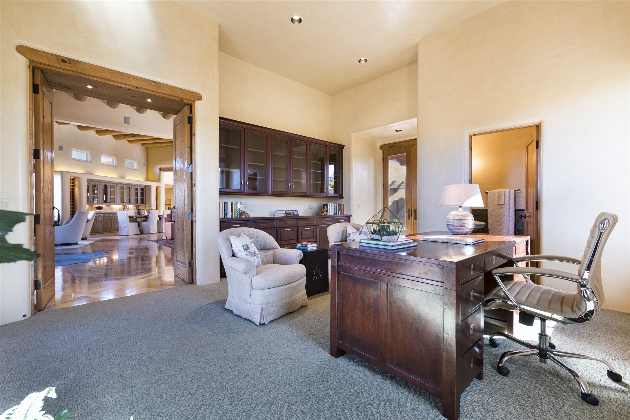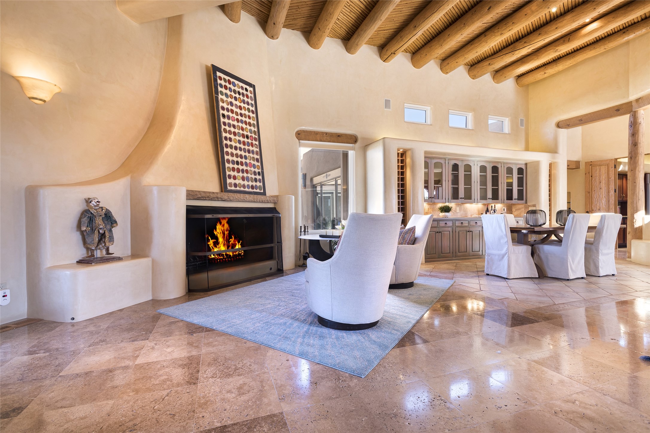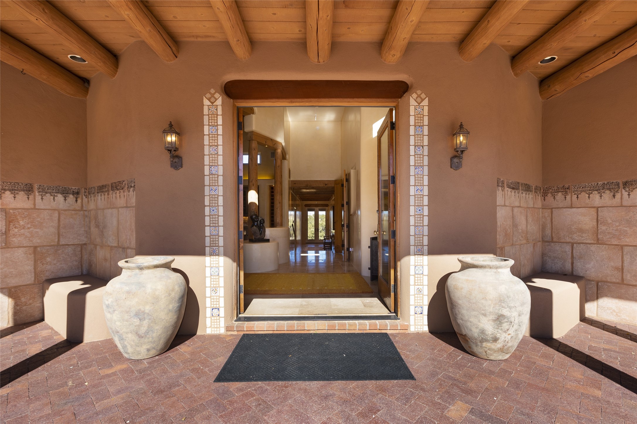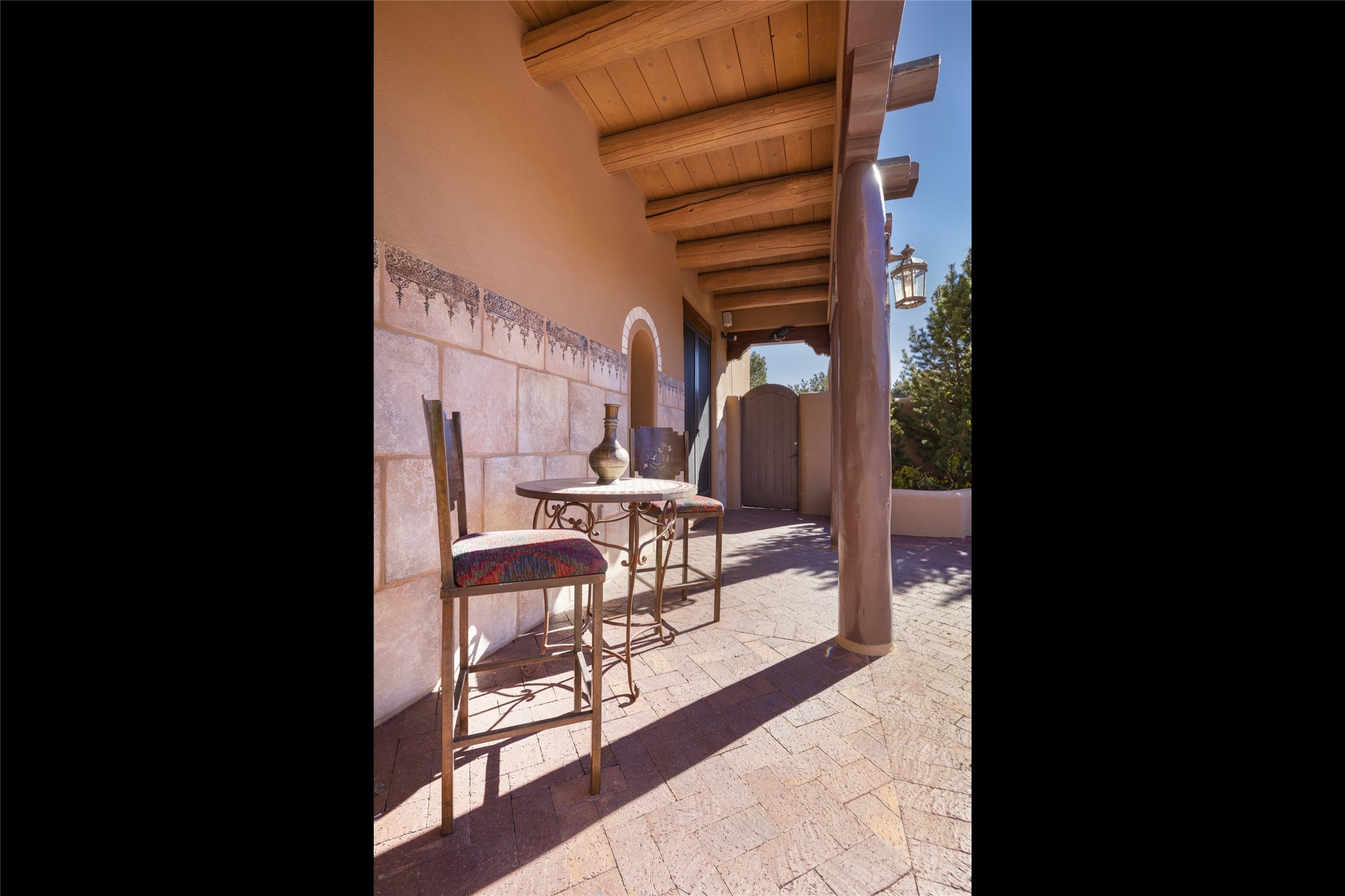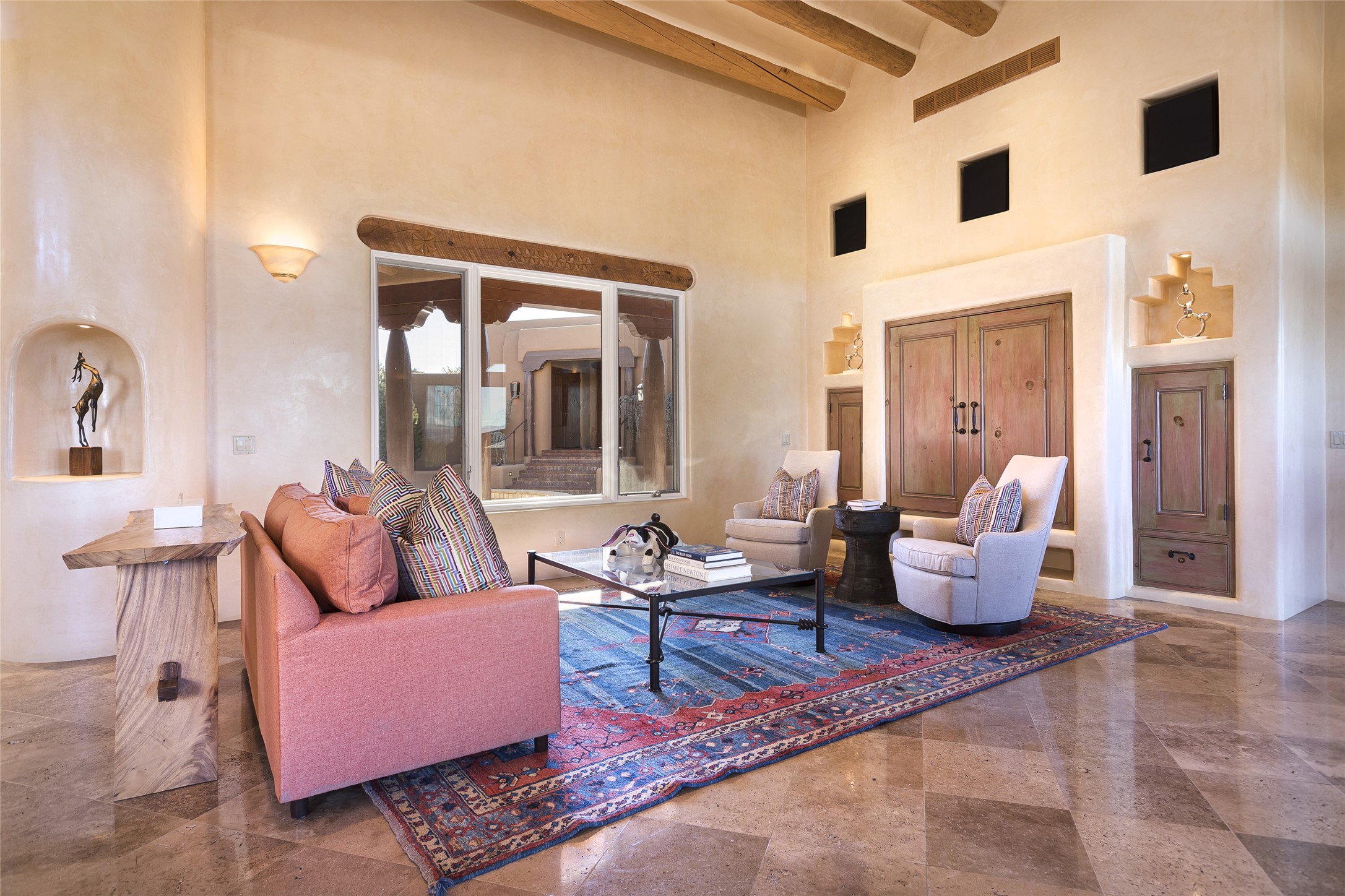 Las Campanas architectural masterpiece with impressive Jemez Mountain, Sangre de Cristo Mountain, golf course lake, and sunset views! Sited on a premiere 2.2-acre view lot, this exquisite Las Campanas home exemplifies the unique blend of modern design with the true essence of Santa Fe. Thoughtfully designed with an open concept, this exceptional 4,444 square foot home with 3 bedrooms + plus an office, offers the ultimate flexible floor plan. This exciting home, with welcoming front entrance water features, delights with a tranquil koi pond within the fully enclosed front entrance courtyard, ideal for entertaining and pets. Design features include an expansive great room with Jemez Mountain and lake views, a formal dining area, grand fireplace, and portal access. Additional features include a well-appointed chef's island kitchen with Wolf and Sub Zero appliances, Sangre Di Cristo Mountain views, a casual dining area, and generous pantry. The owner's suite impresses with Sangre views, an intimate sitting area with a fireplace, front courtyard access, two walk-in closets, and an elegant bath. Two private guest bedrooms located within their independent guest wing both offer views, a shared bath and privacy. Luxury finishes include vigas, custom cabinetry, natural stone flooring, plastered walls, a spacious 3 car garage with one heated bay or an ideal art studio/exercise room, and vibrant rose gardens. This home has been well maintained and the roof and stucco are both under warranty.
