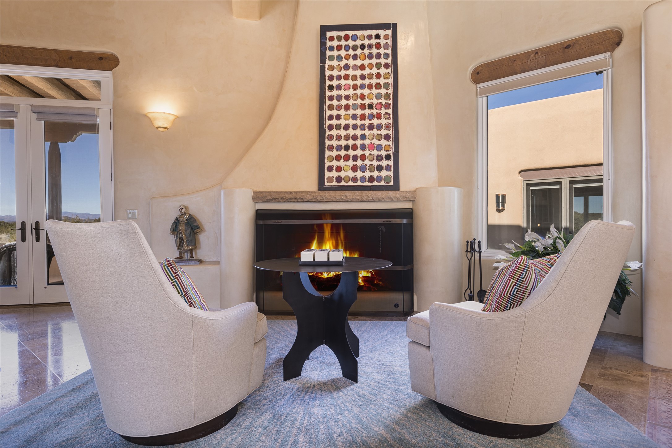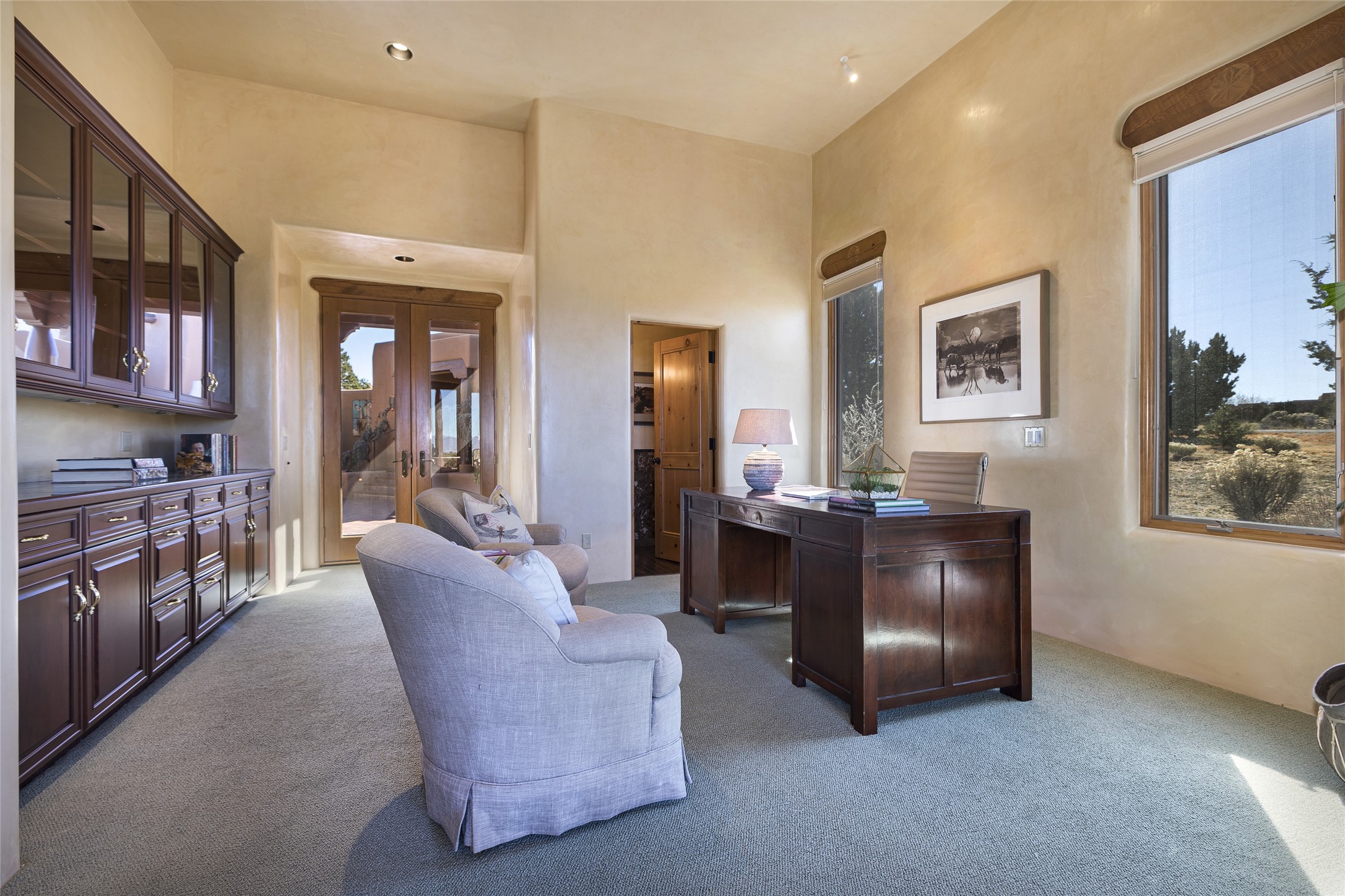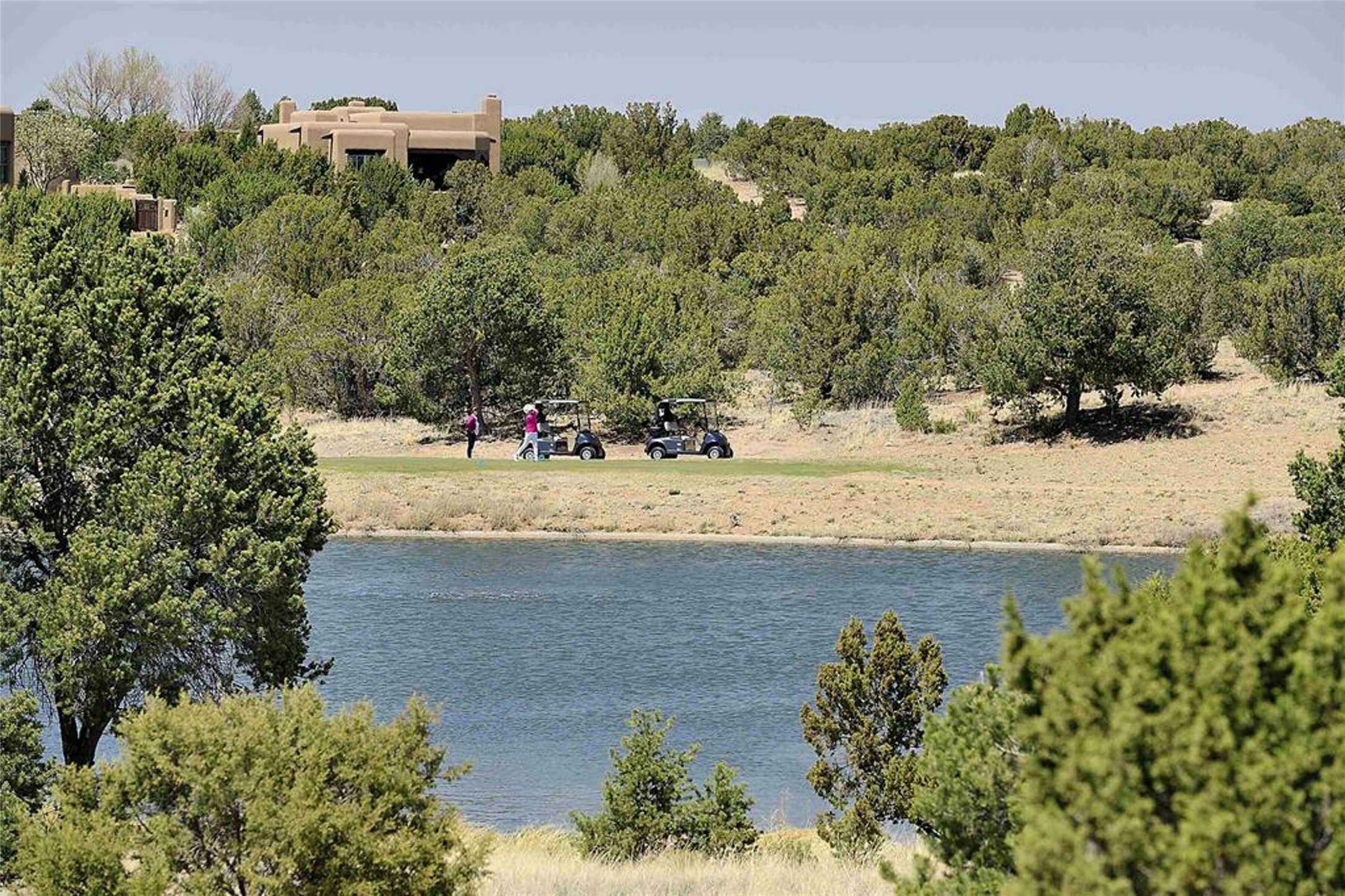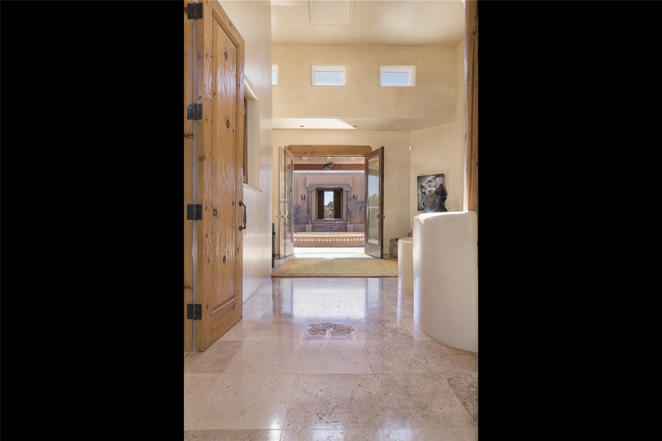 Las Campanas architectural masterpiece with impressive Jemez Mountain, Sangre de Cristo Mountain, golf course lake, and sunset views! Sited on a premiere 2.2-acre view lot, this exquisite Las Campanas home exemplifies the unique blend of modern design with the true essence of Santa Fe. Thoughtfully designed with an open concept, this exceptional 4,444 square foot home with 3 bedrooms + plus an office, offers the ultimate flexible floor plan. This exciting home, with welcoming front entrance water features, delights with a tranquil koi pond within the fully enclosed front entrance courtyard, ideal for entertaining and pets. Design features include an expansive great room with Jemez Mountain and lake views, a formal dining area, grand fireplace, and portal access. Additional features include a well-appointed chef's island kitchen with Wolf and Sub Zero appliances, Sangre Di Cristo Mountain views, a casual dining area, and generous pantry. The owner's suite impresses with Sangre views, an intimate sitting area with a fireplace, front courtyard access, two walk-in closets, and an elegant bath. Two private guest bedrooms located within their independent guest wing both offer views, a shared bath and privacy. Luxury finishes include vigas, custom cabinetry, natural stone flooring, plastered walls, a spacious 3 car garage with one heated bay or an ideal art studio/exercise room, and vibrant rose gardens. This home has been well maintained and the roof and stucco are both under warranty.