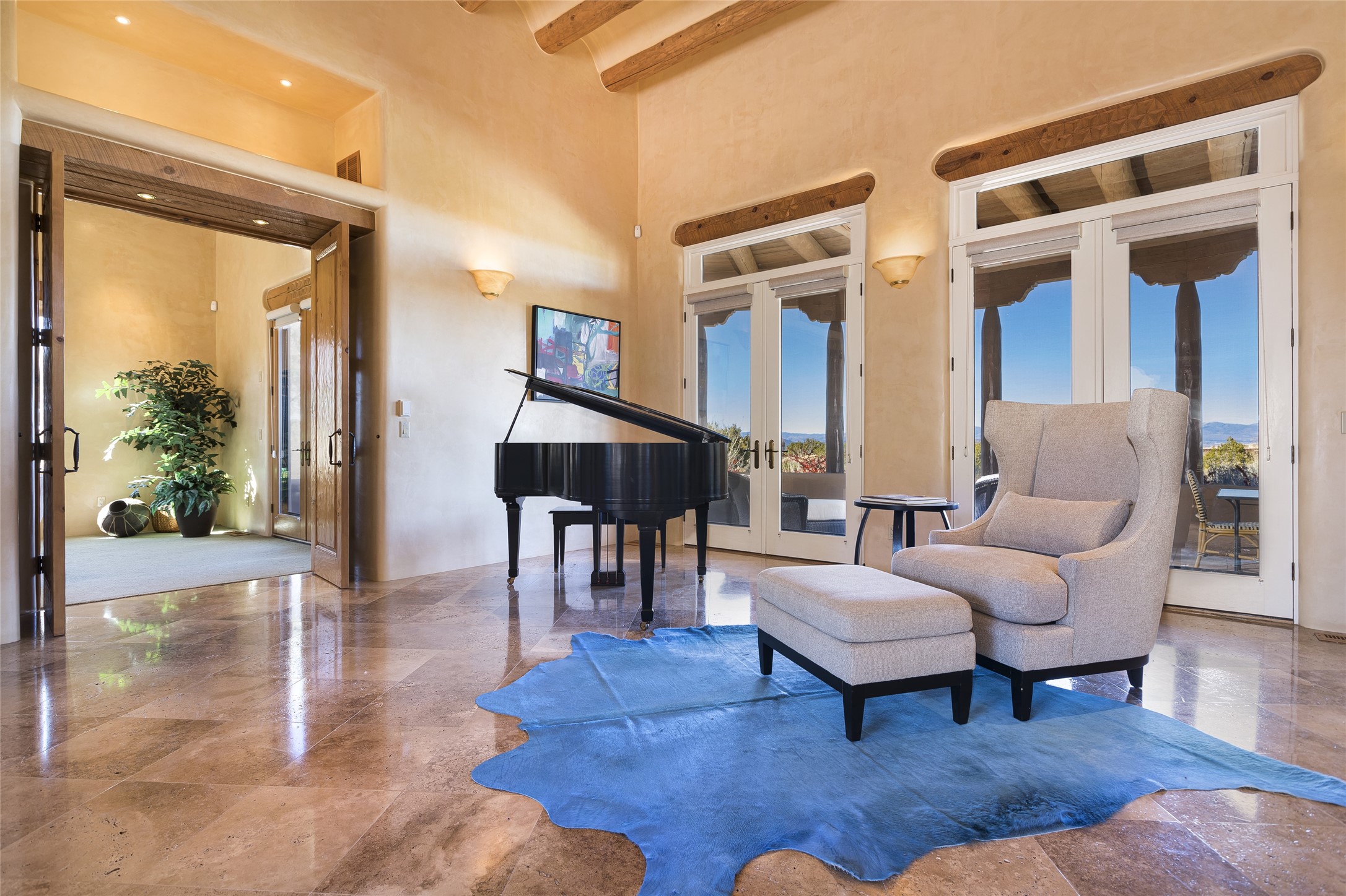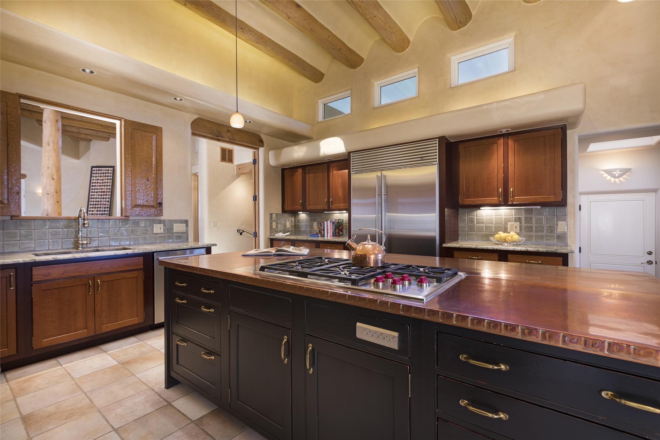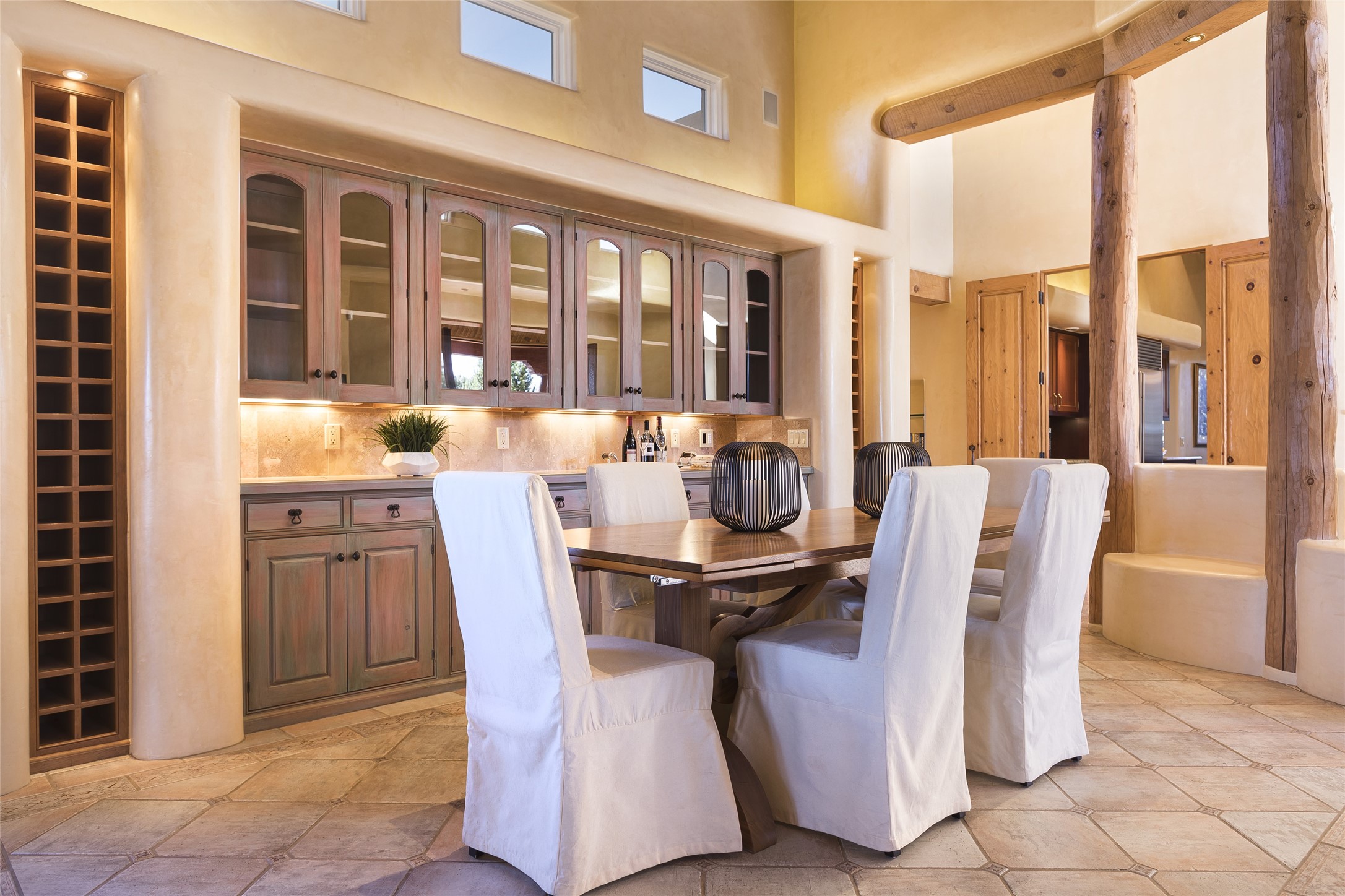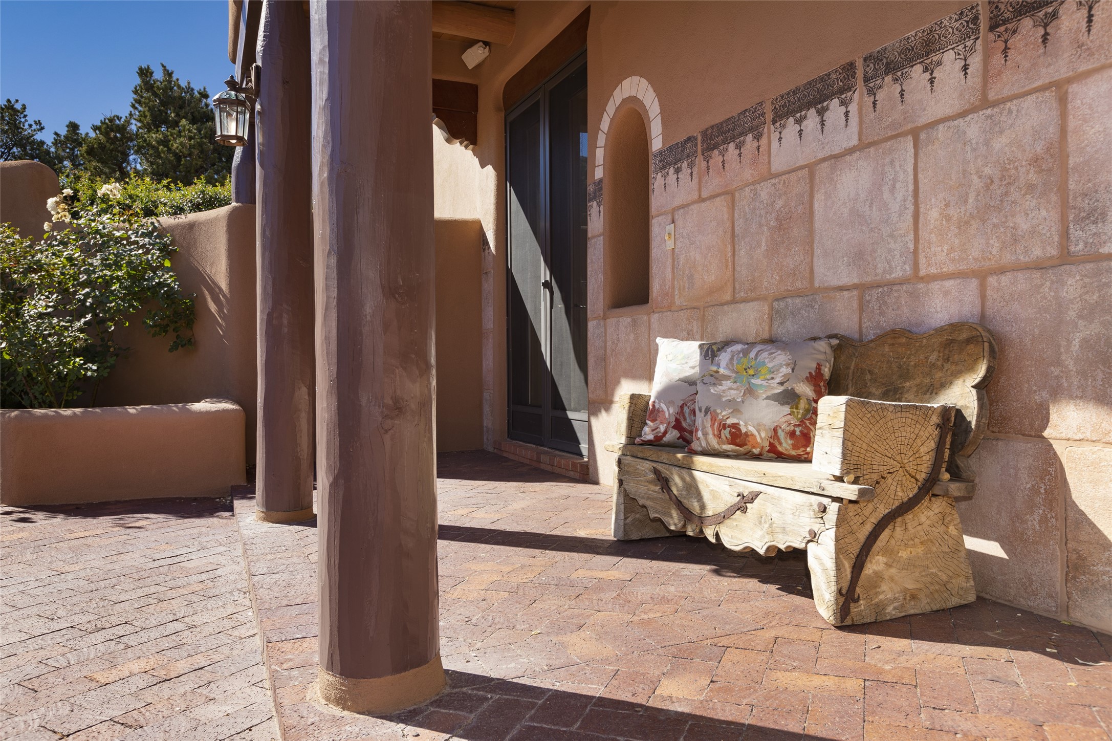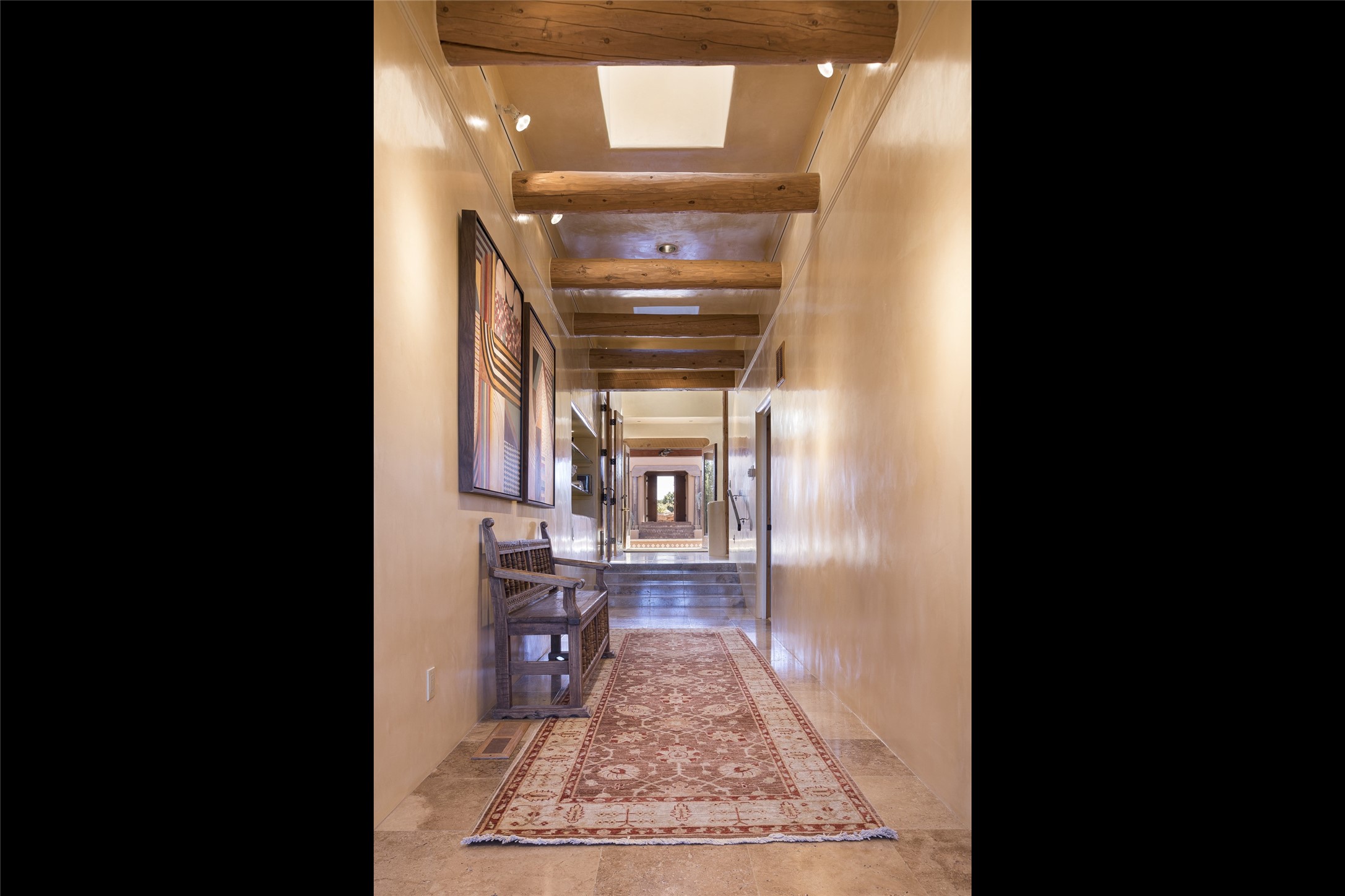 Las Campanas architectural masterpiece with impressive Jemez Mountain, Sangre de Cristo Mountain, golf course lake, and sunset views! Sited on a premiere 2.2-acre view lot, this exquisite Las Campanas home exemplifies the unique blend of modern design with the true essence of Santa Fe. Thoughtfully designed with an open concept, this exceptional 4,444 square foot home with 3 bedrooms + plus an office, offers the ultimate flexible floor plan. This exciting home, with welcoming front entrance water features, delights with a tranquil koi pond within the fully enclosed front entrance courtyard, ideal for entertaining and pets. Design features include an expansive great room with Jemez Mountain and lake views, a formal dining area, grand fireplace, and portal access. Additional features include a well-appointed chef's island kitchen with Wolf and Sub Zero appliances, Sangre Di Cristo Mountain views, a casual dining area, and generous pantry. The owner's suite impresses with Sangre views, an intimate sitting area with a fireplace, front courtyard access, two walk-in closets, and an elegant bath. Two private guest bedrooms located within their independent guest wing both offer views, a shared bath and privacy. Luxury finishes include vigas, custom cabinetry, natural stone flooring, plastered walls, a spacious 3 car garage with one heated bay or an ideal art studio/exercise room, and vibrant rose gardens. This home has been well maintained and the roof and stucco are both under warranty.