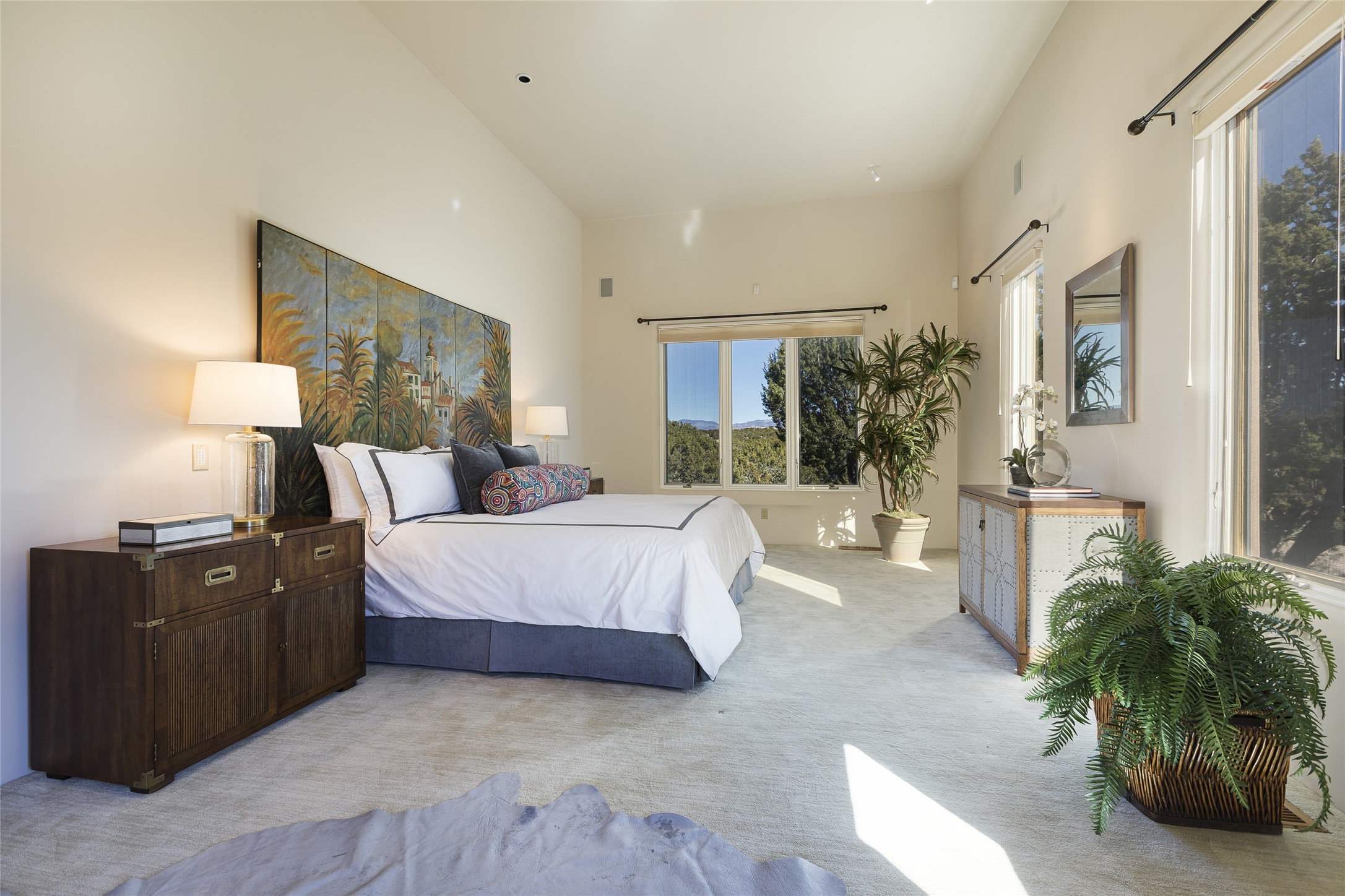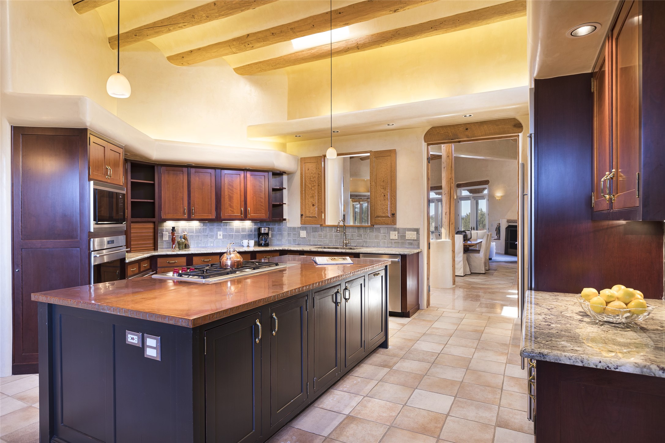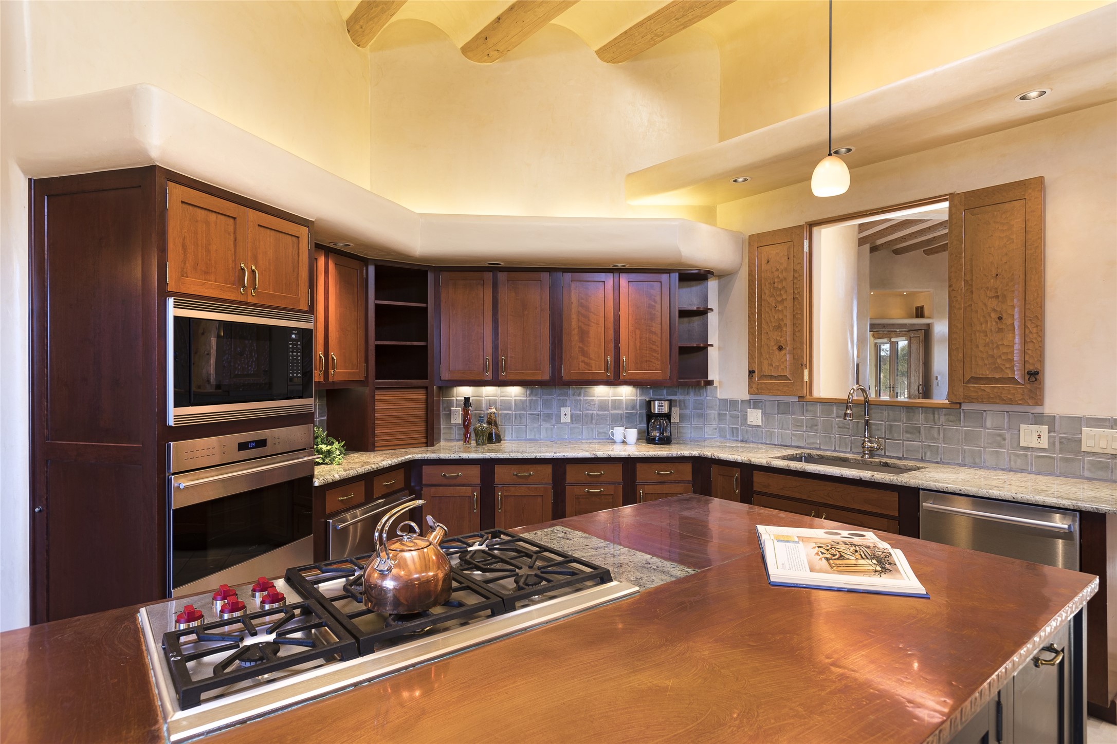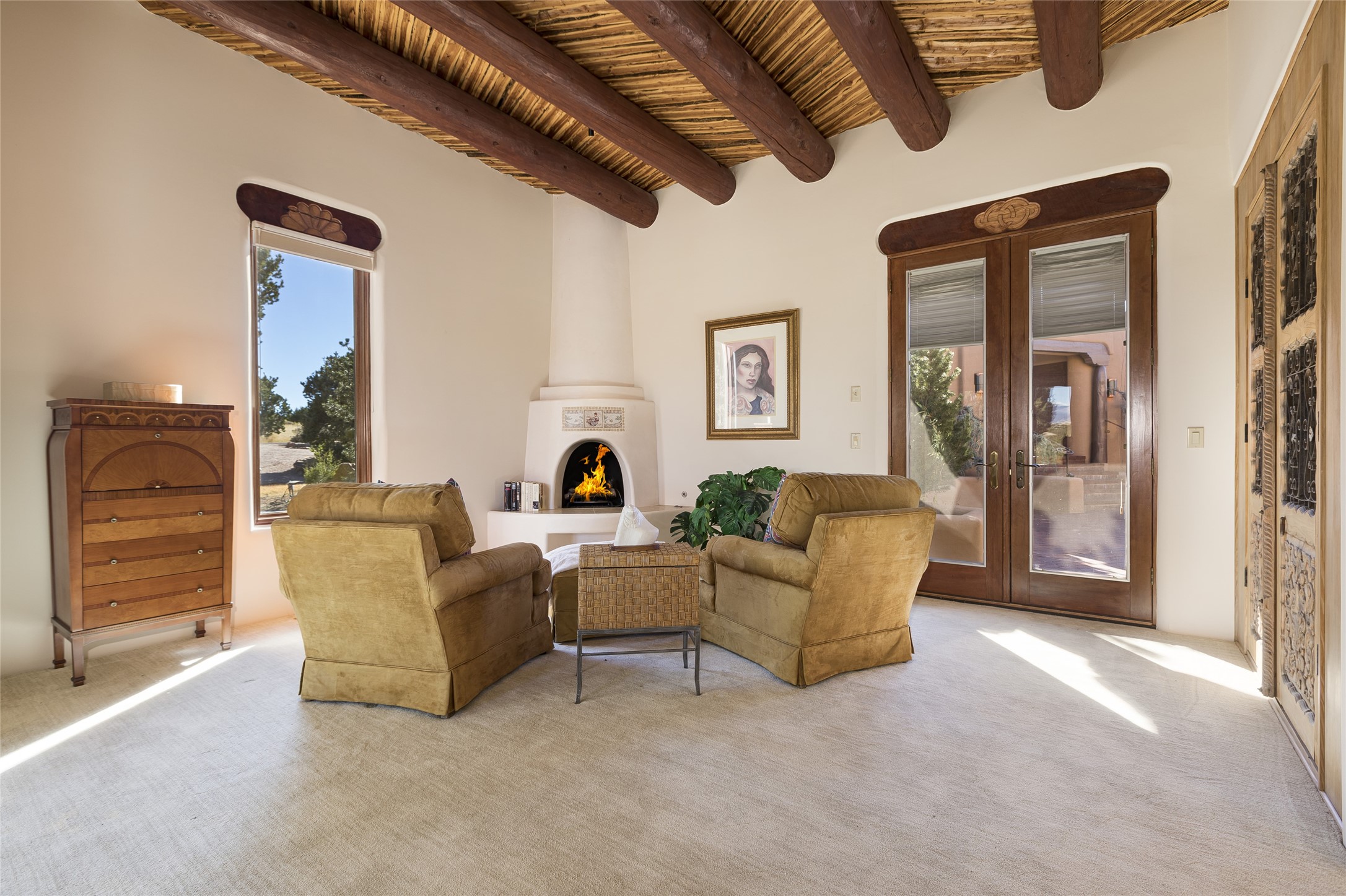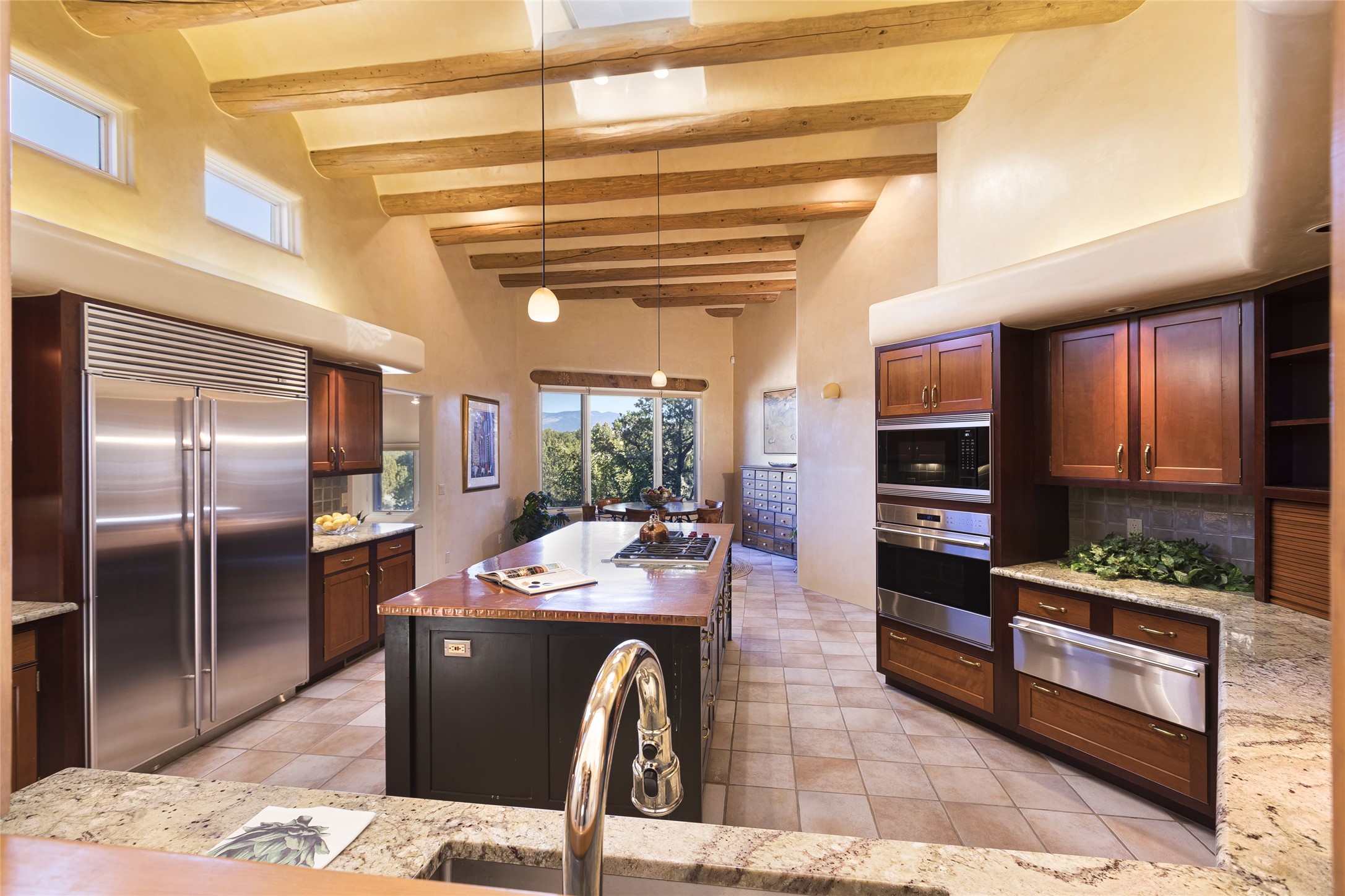 Las Campanas architectural masterpiece with impressive Jemez Mountain, Sangre de Cristo Mountain, golf course lake, and sunset views! Sited on a premiere 2.2-acre view lot, this exquisite Las Campanas home exemplifies the unique blend of modern design with the true essence of Santa Fe. Thoughtfully designed with an open concept, this exceptional 4,444 square foot home with 3 bedrooms + plus an office, offers the ultimate flexible floor plan. This exciting home, with welcoming front entrance water features, delights with a tranquil koi pond within the fully enclosed front entrance courtyard, ideal for entertaining and pets. Design features include an expansive great room with Jemez Mountain and lake views, a formal dining area, grand fireplace, and portal access. Additional features include a well-appointed chef's island kitchen with Wolf and Sub Zero appliances, Sangre Di Cristo Mountain views, a casual dining area, and generous pantry. The owner's suite impresses with Sangre views, an intimate sitting area with a fireplace, front courtyard access, two walk-in closets, and an elegant bath. Two private guest bedrooms located within their independent guest wing both offer views, a shared bath and privacy. Luxury finishes include vigas, custom cabinetry, natural stone flooring, plastered walls, a spacious 3 car garage with one heated bay or an ideal art studio/exercise room, and vibrant rose gardens. This home has been well maintained and the roof and stucco are both under warranty.