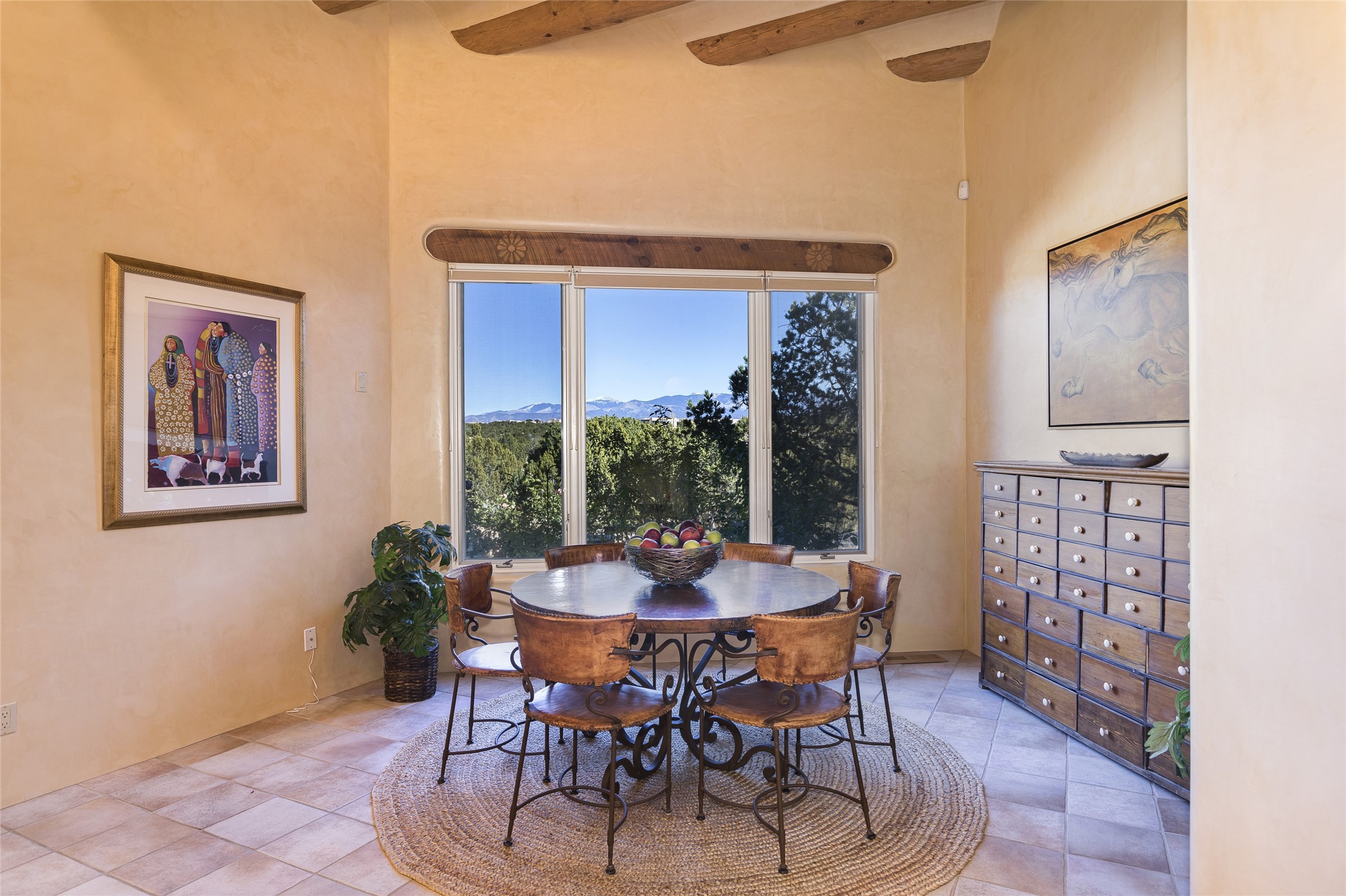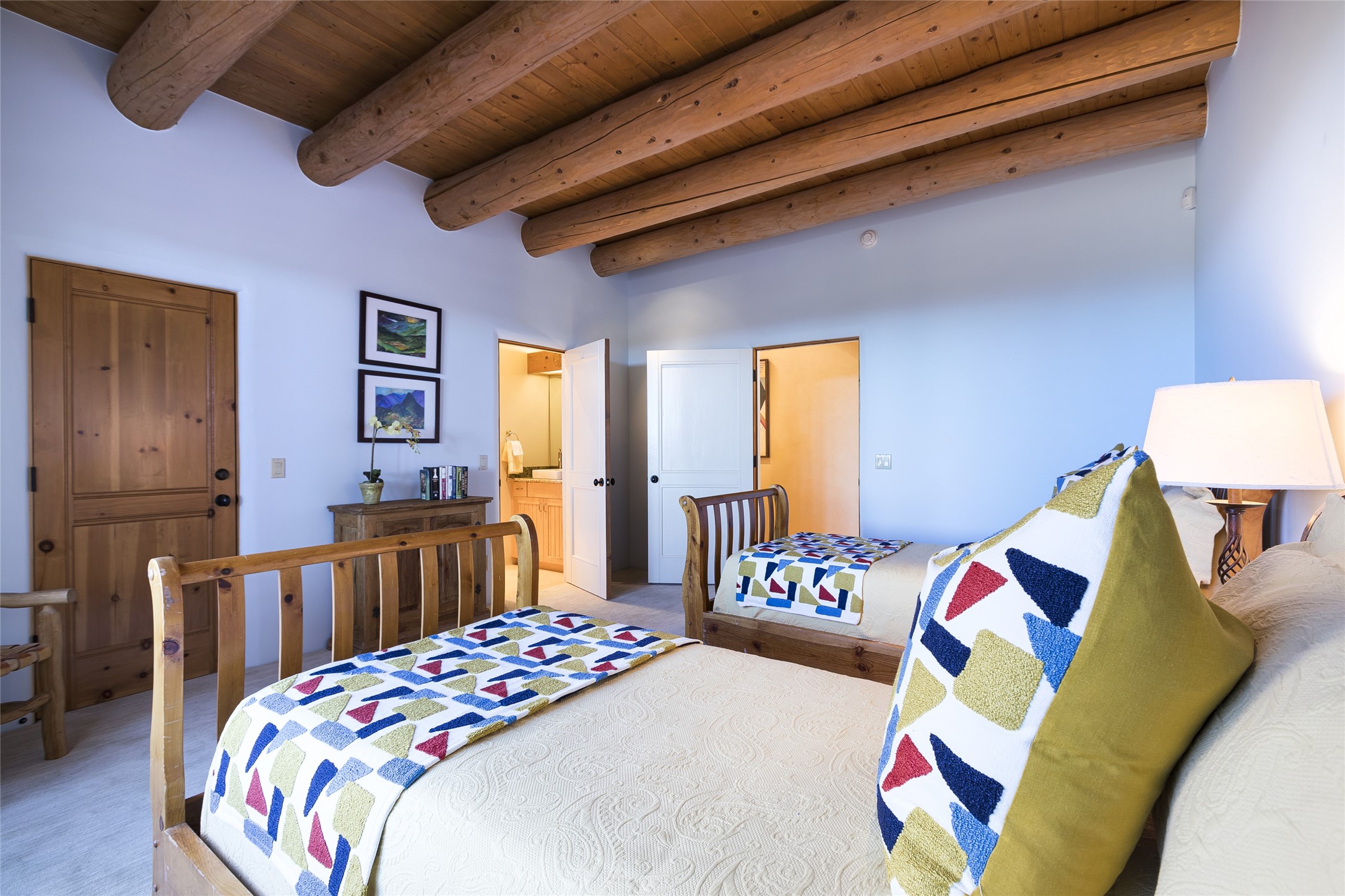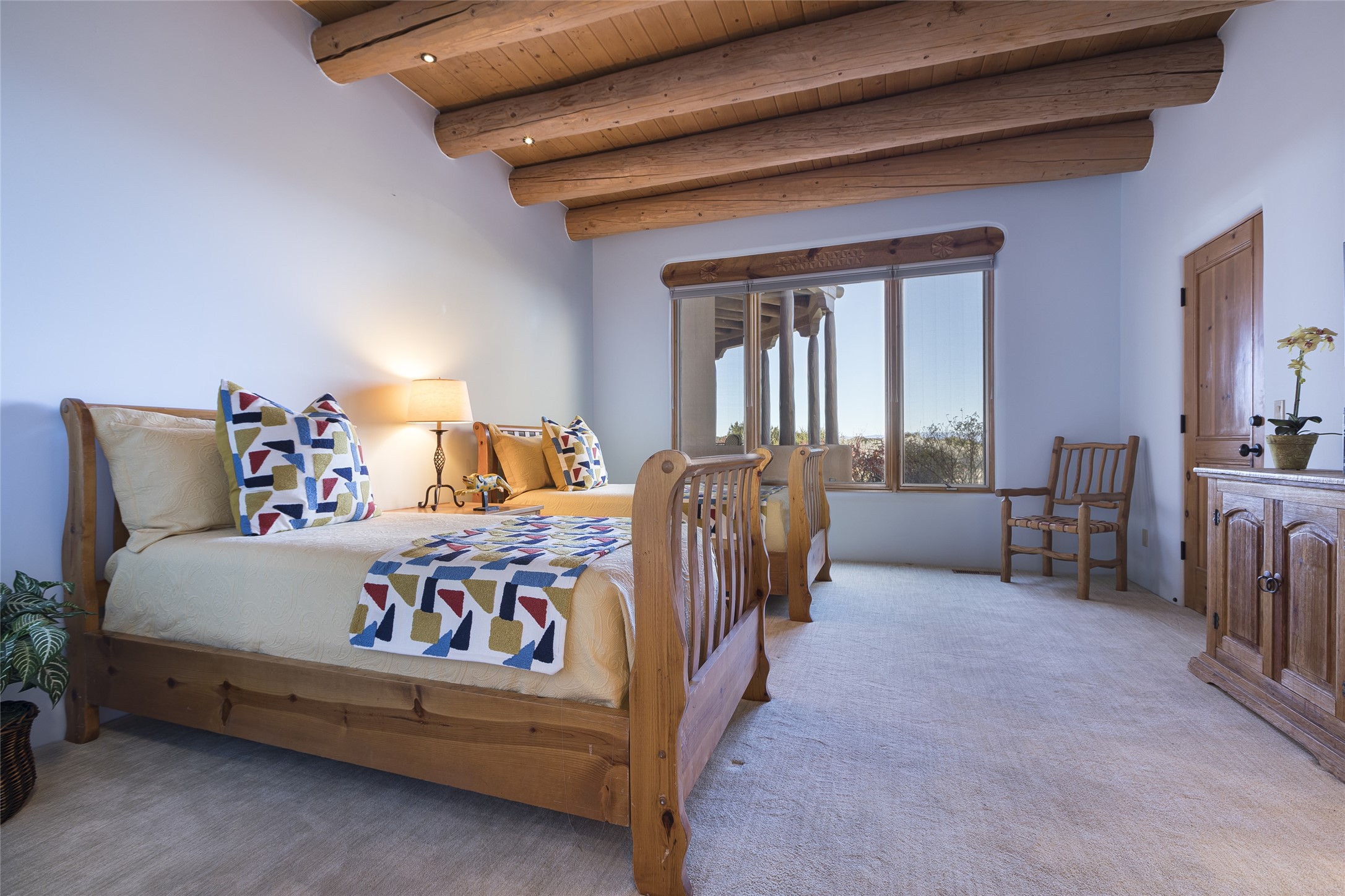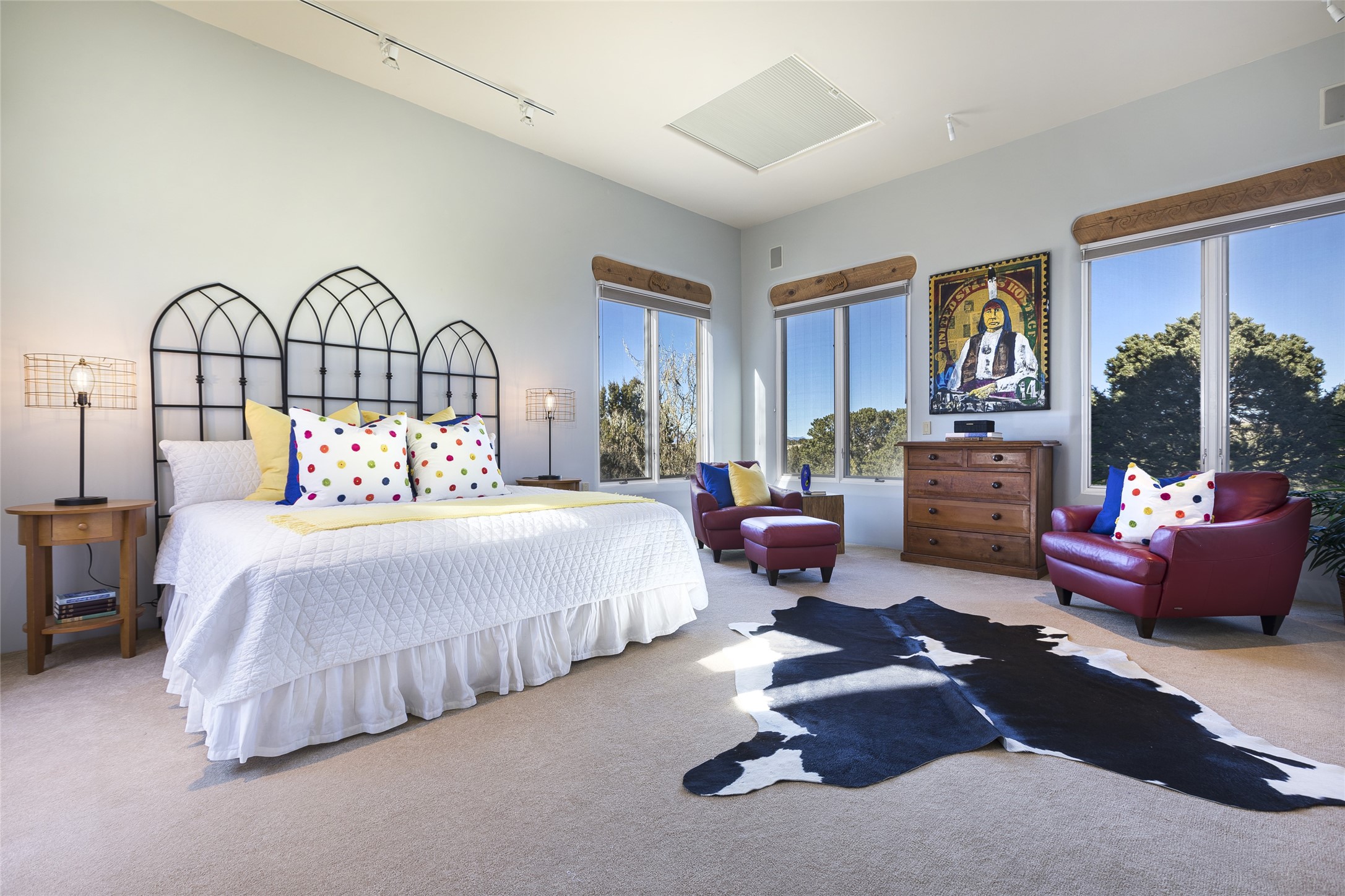 Las Campanas architectural masterpiece with impressive Jemez Mountain, Sangre de Cristo Mountain, golf course lake, and sunset views! Sited on a premiere 2.2-acre view lot, this exquisite Las Campanas home exemplifies the unique blend of modern design with the true essence of Santa Fe. Thoughtfully designed with an open concept, this exceptional 4,444 square foot home with 3 bedrooms + plus an office, offers the ultimate flexible floor plan. This exciting home, with welcoming front entrance water features, delights with a tranquil koi pond within the fully enclosed front entrance courtyard, ideal for entertaining and pets. Design features include an expansive great room with Jemez Mountain and lake views, a formal dining area, grand fireplace, and portal access. Additional features include a well-appointed chef's island kitchen with Wolf and Sub Zero appliances, Sangre Di Cristo Mountain views, a casual dining area, and generous pantry. The owner's suite impresses with Sangre views, an intimate sitting area with a fireplace, front courtyard access, two walk-in closets, and an elegant bath. Two private guest bedrooms located within their independent guest wing both offer views, a shared bath and privacy. Luxury finishes include vigas, custom cabinetry, natural stone flooring, plastered walls, a spacious 3 car garage with one heated bay or an ideal art studio/exercise room, and vibrant rose gardens. This home has been well maintained and the roof and stucco are both under warranty.
