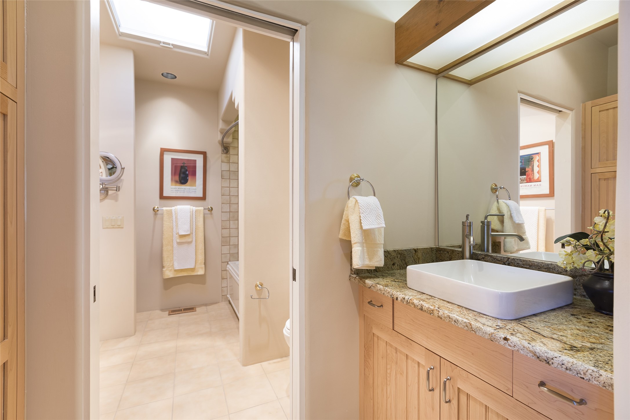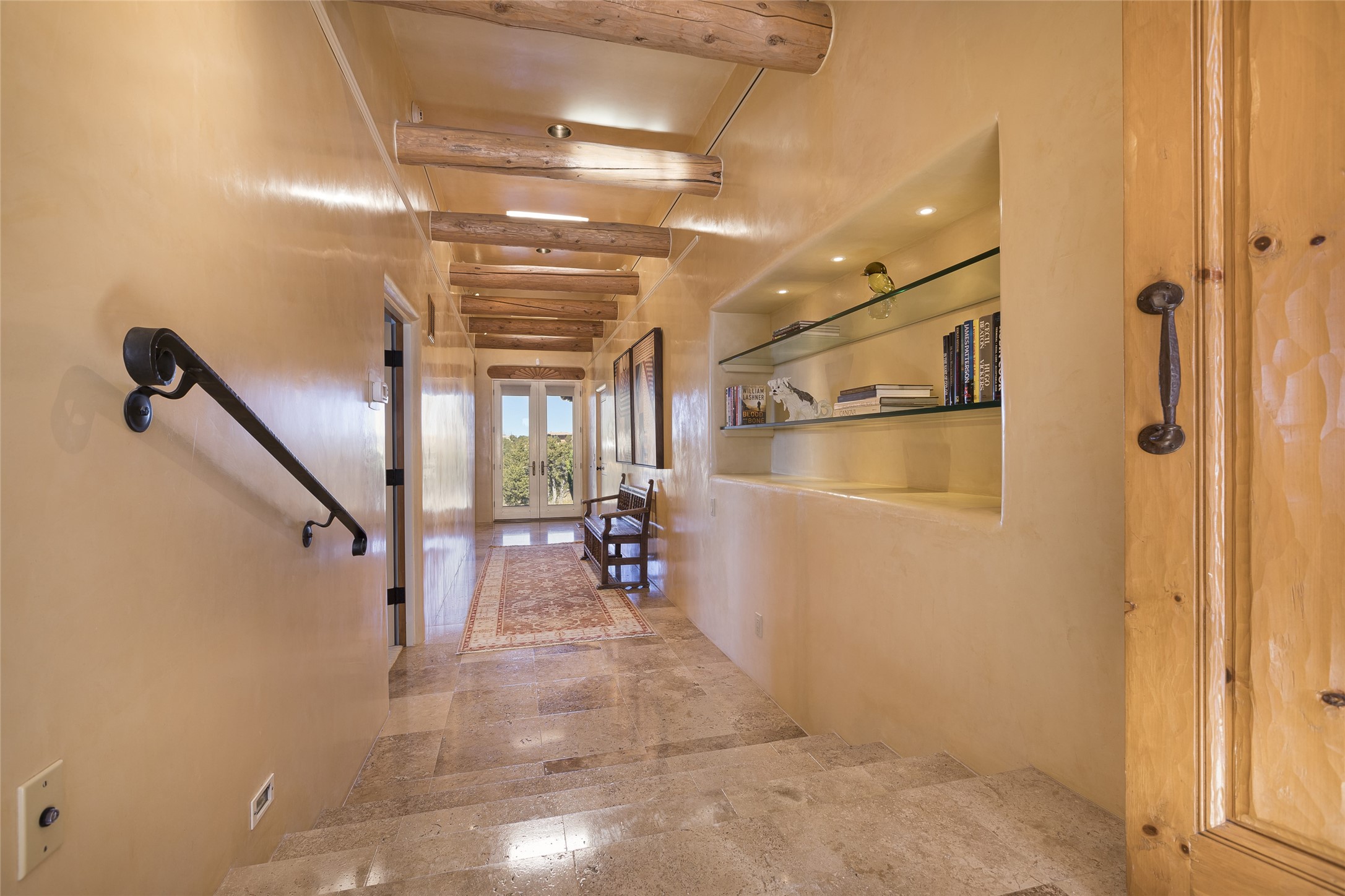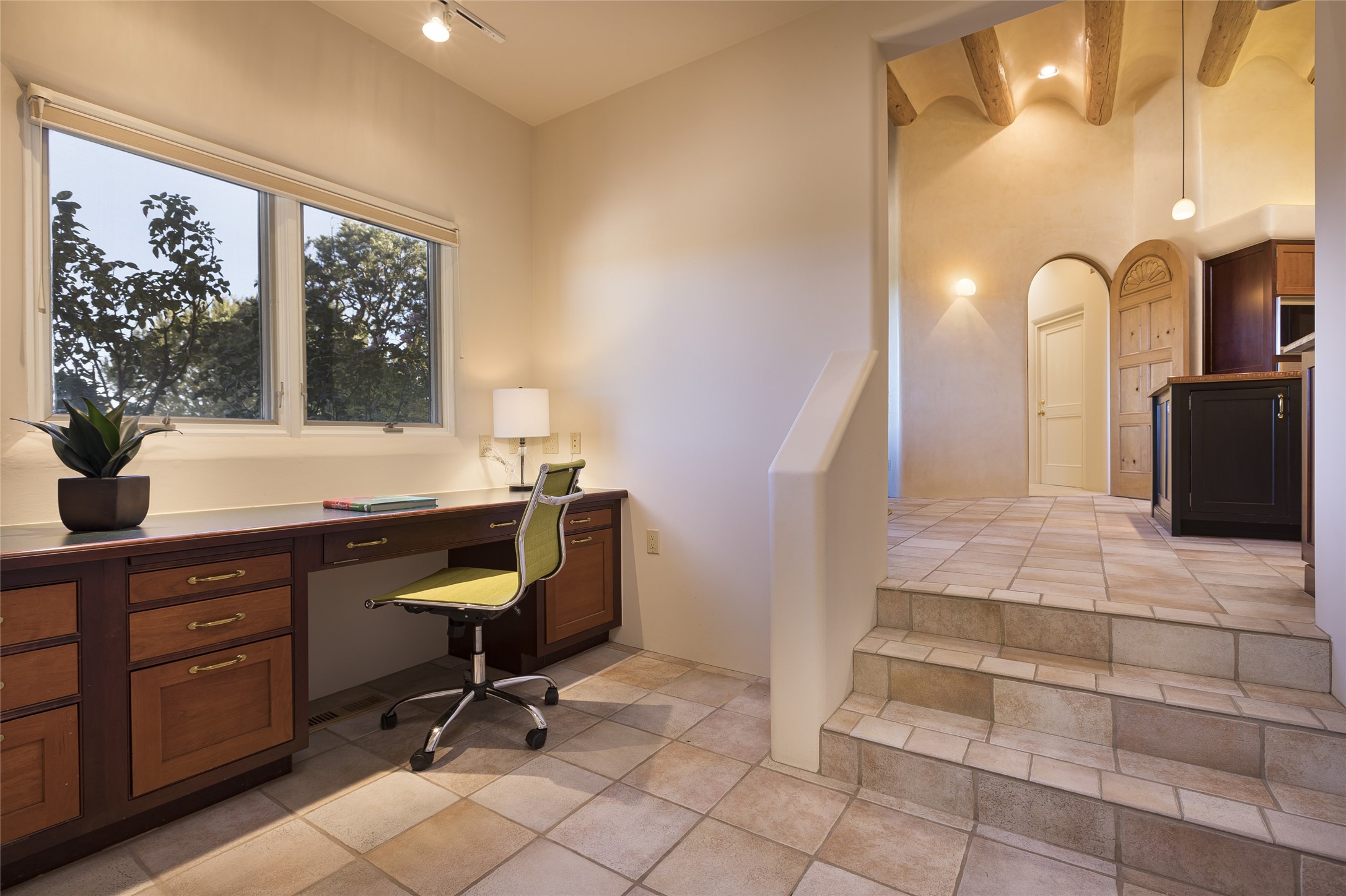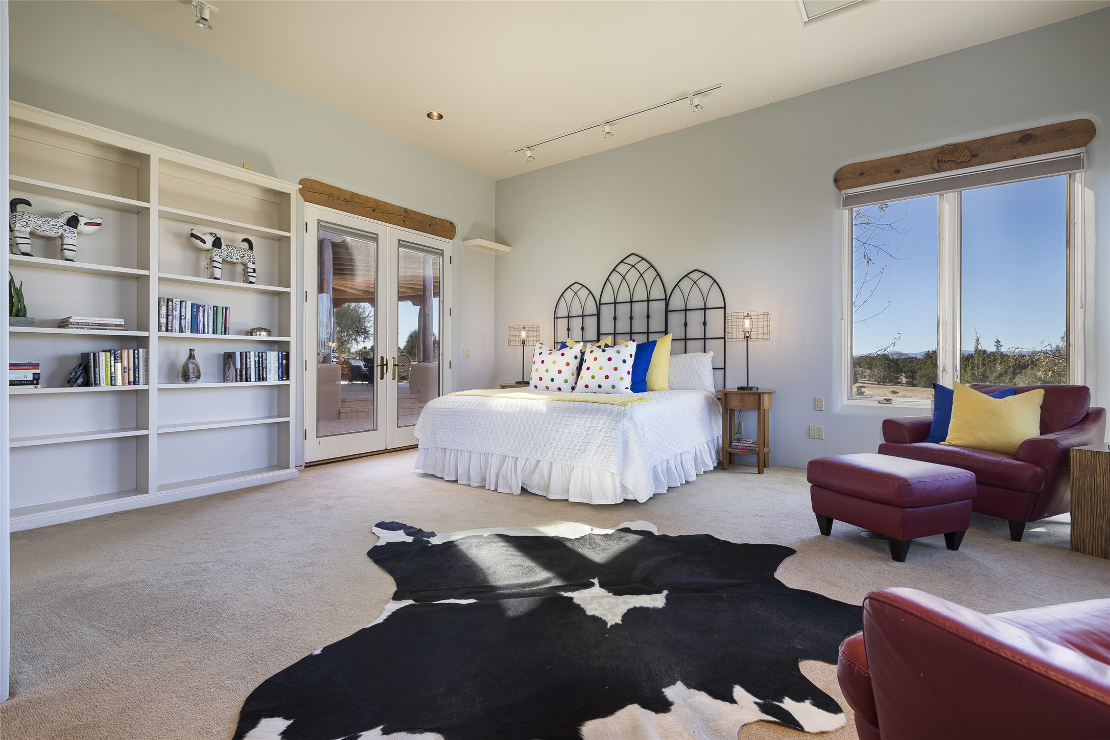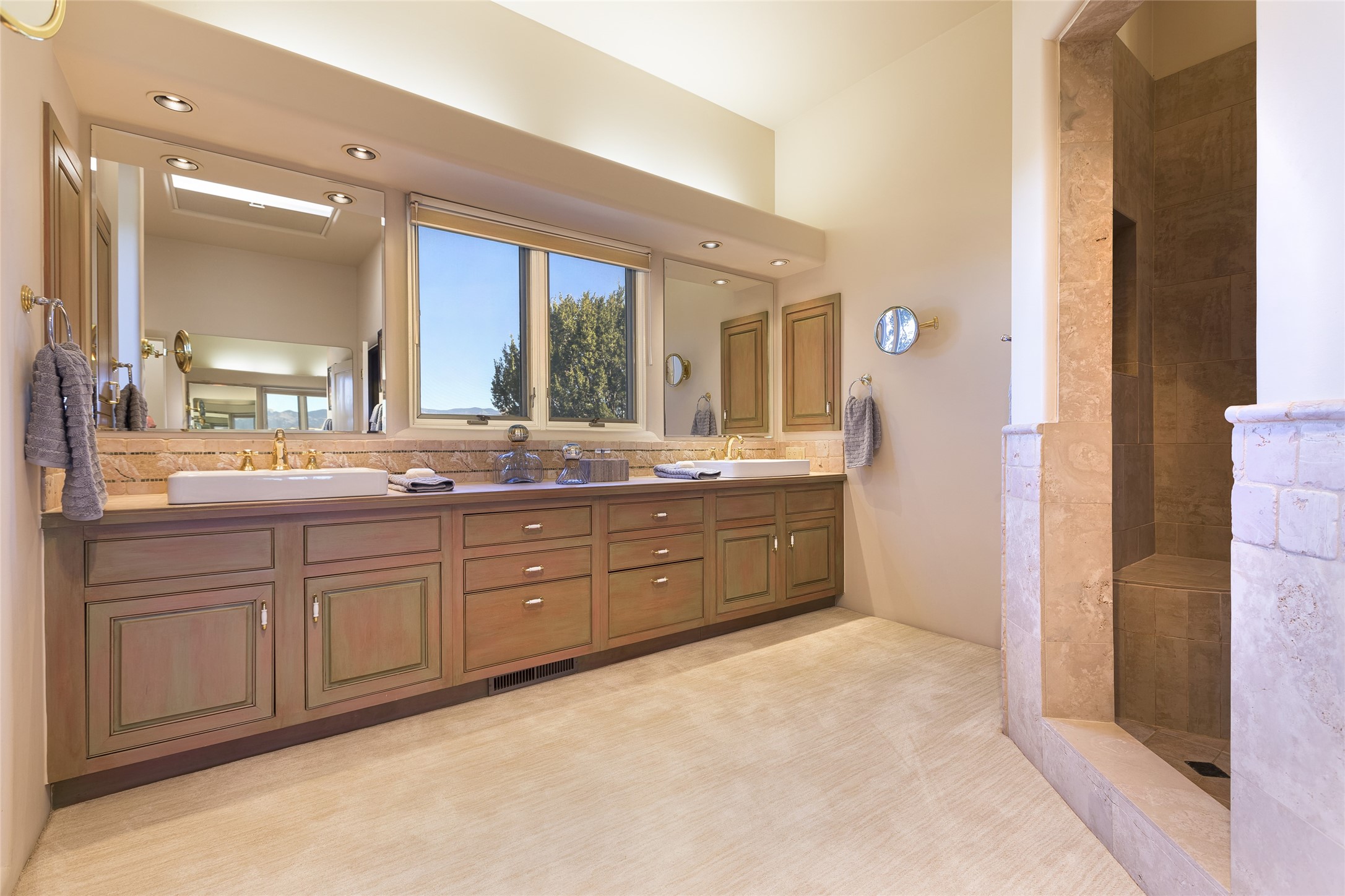 Las Campanas architectural masterpiece with impressive Jemez Mountain, Sangre de Cristo Mountain, golf course lake, and sunset views! Sited on a premiere 2.2-acre view lot, this exquisite Las Campanas home exemplifies the unique blend of modern design with the true essence of Santa Fe. Thoughtfully designed with an open concept, this exceptional 4,444 square foot home with 3 bedrooms + plus an office, offers the ultimate flexible floor plan. This exciting home, with welcoming front entrance water features, delights with a tranquil koi pond within the fully enclosed front entrance courtyard, ideal for entertaining and pets. Design features include an expansive great room with Jemez Mountain and lake views, a formal dining area, grand fireplace, and portal access. Additional features include a well-appointed chef's island kitchen with Wolf and Sub Zero appliances, Sangre Di Cristo Mountain views, a casual dining area, and generous pantry. The owner's suite impresses with Sangre views, an intimate sitting area with a fireplace, front courtyard access, two walk-in closets, and an elegant bath. Two private guest bedrooms located within their independent guest wing both offer views, a shared bath and privacy. Luxury finishes include vigas, custom cabinetry, natural stone flooring, plastered walls, a spacious 3 car garage with one heated bay or an ideal art studio/exercise room, and vibrant rose gardens. This home has been well maintained and the roof and stucco are both under warranty.