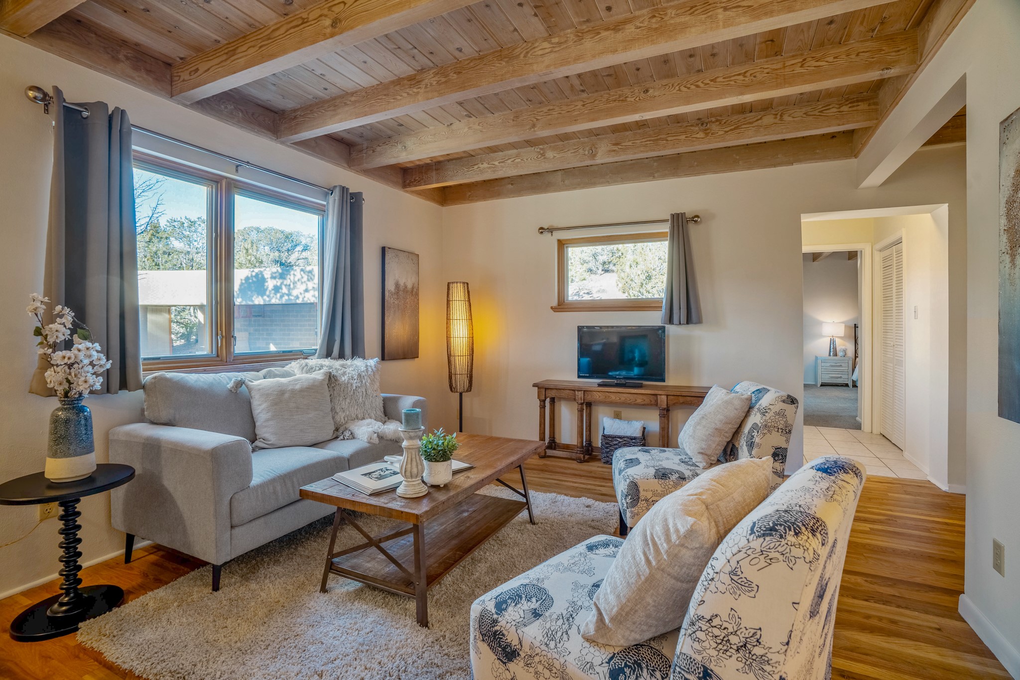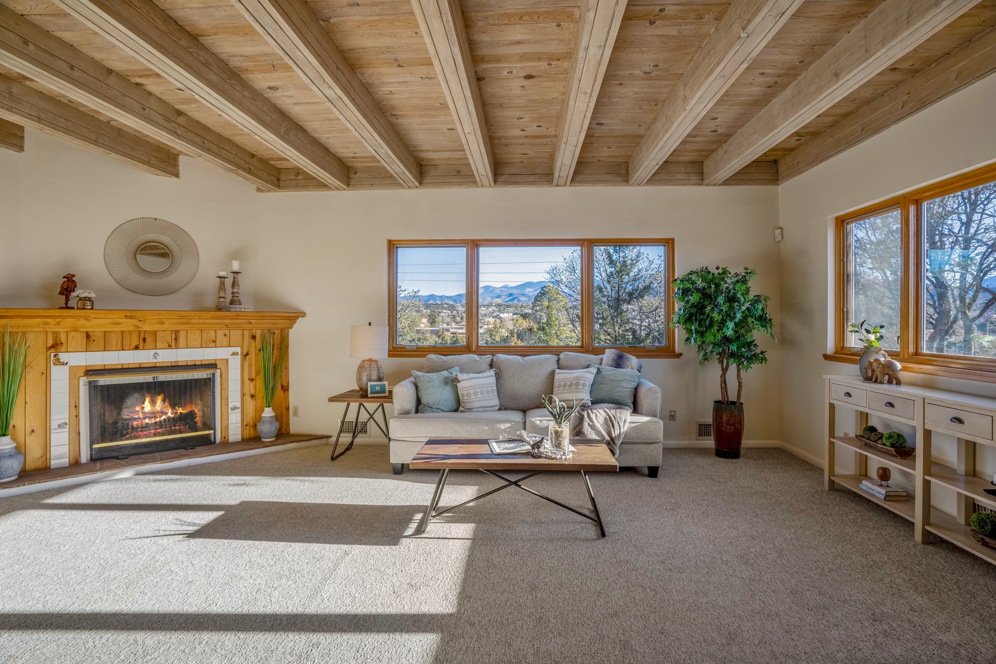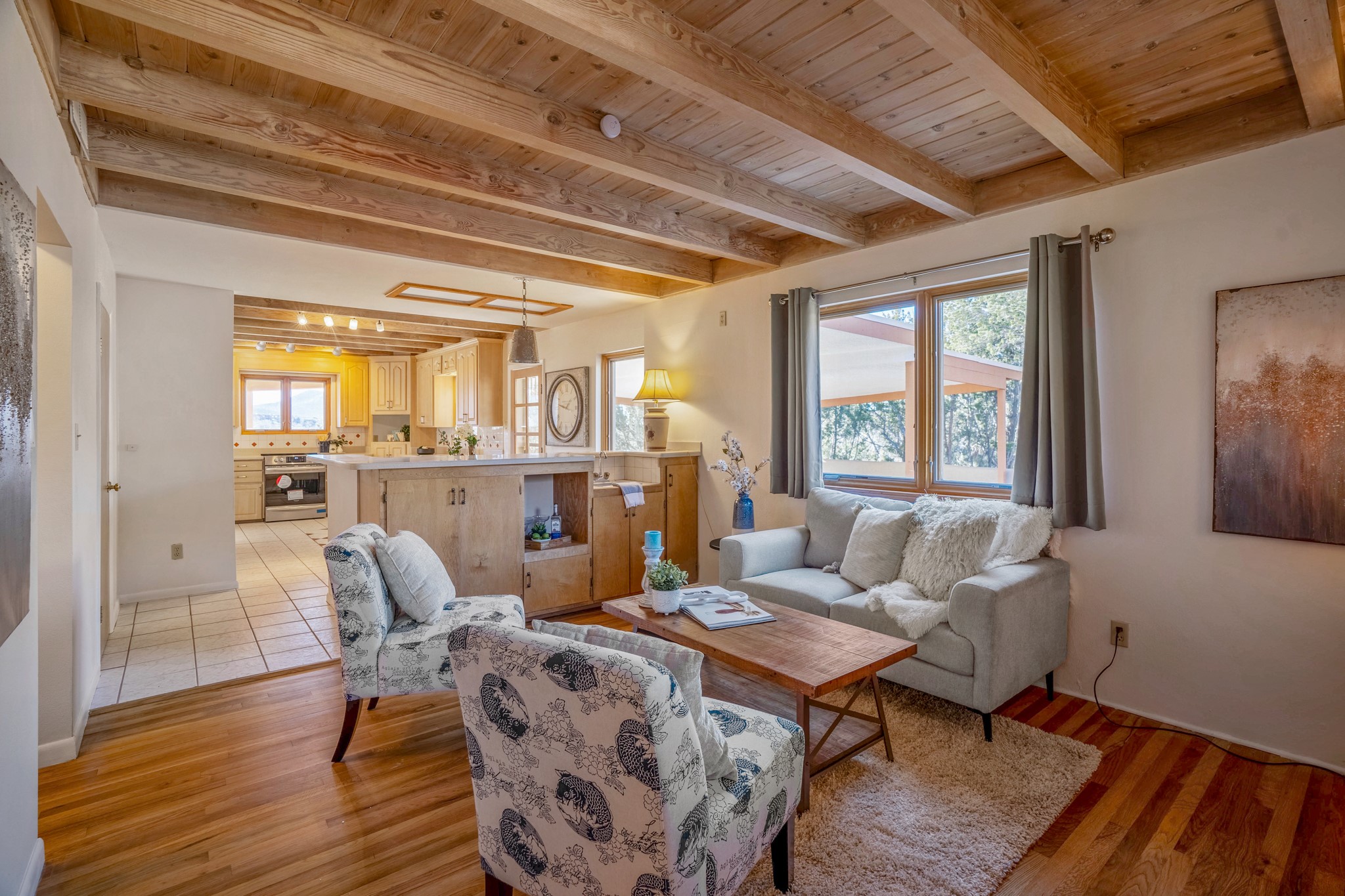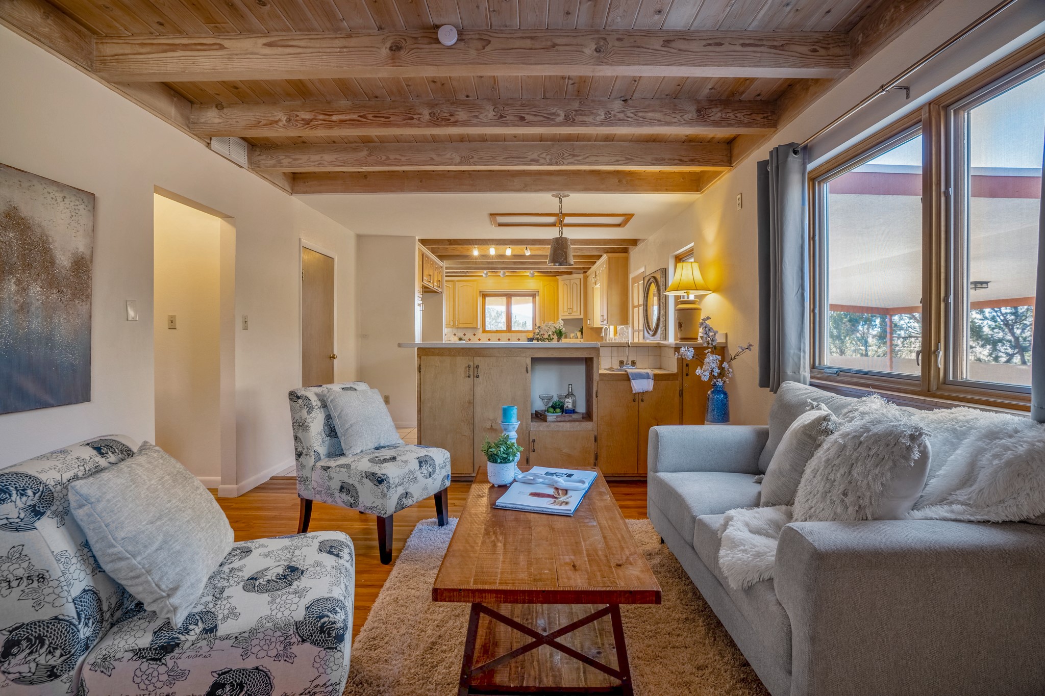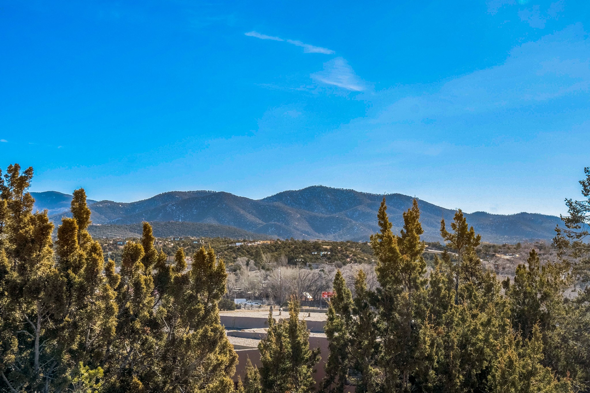 Nestled in the hills overlooking Fort Marcy Park, downtown Santa Fe, and with clear views of the Sangre de Cristo Mountain Range all the way to Atalaya Hill and Sun & Moon Mountain, this home sits on 3/4 acres of prime downtown Santa Fe real estate. A very short distance to Santa Fe Plaza, Canyon Rd, Artist Rd, and more, there is not a gallery or restaurant in Santa Fe more than a few minutes away. Wood beams and hardwood floors adorn this very well maintained house. A beautiful sitting area just outside the front door into the yard, and deck off of one of the carports offer some great outdoor living spaces. With updated bathrooms, new stucco, and a membrane roof replaced in 2020, this home is ready for you to make it your own. Pride of ownership is evident in this sweet, beautiful home. Imagine the possibilities and schedule your showing today!