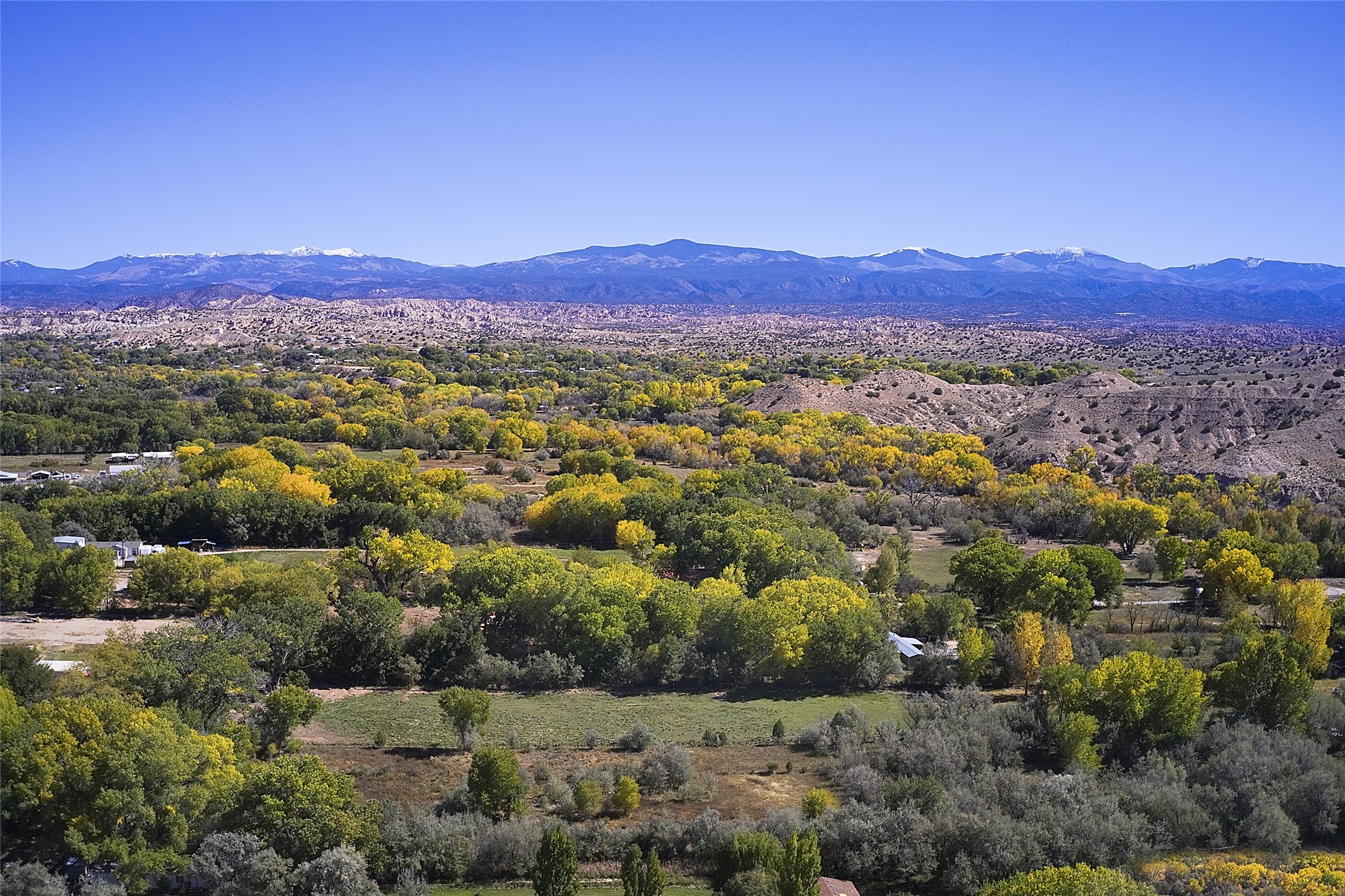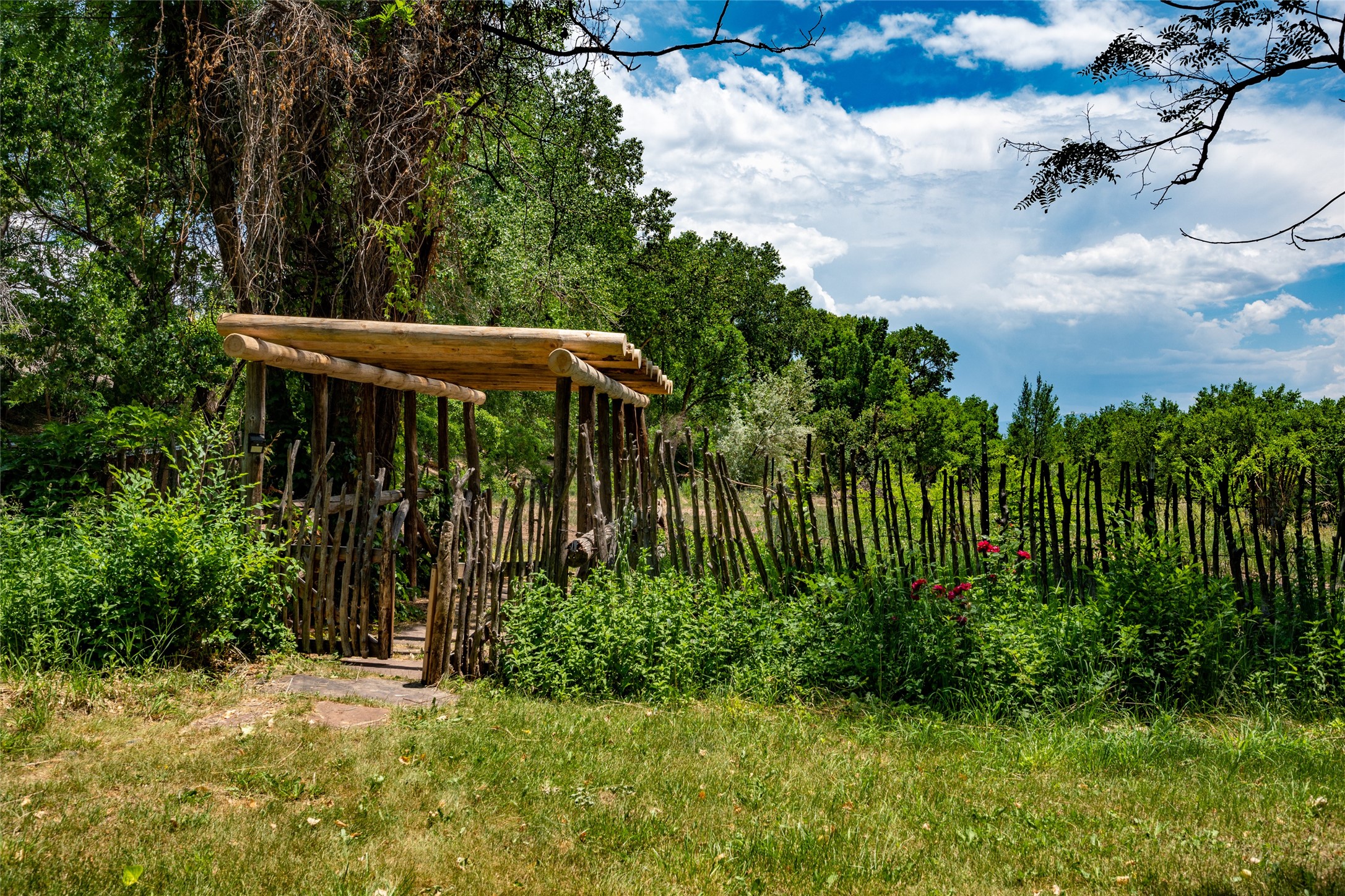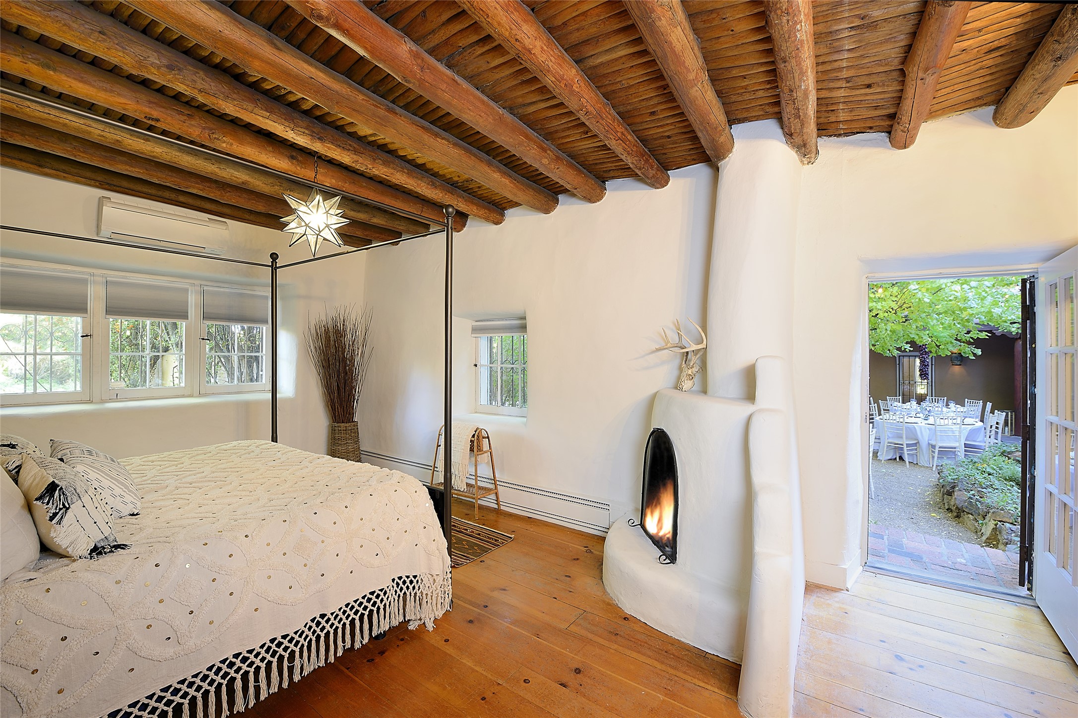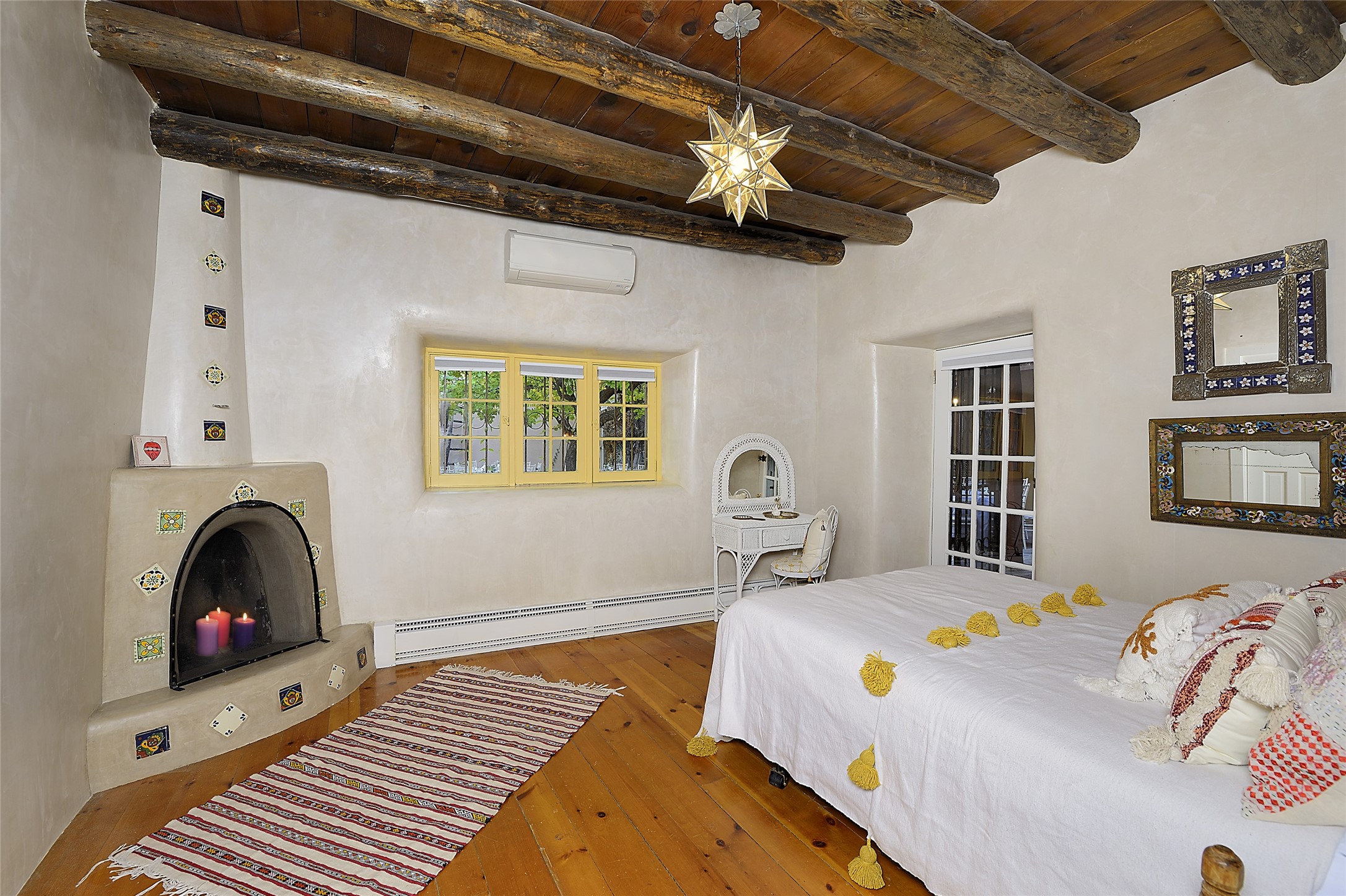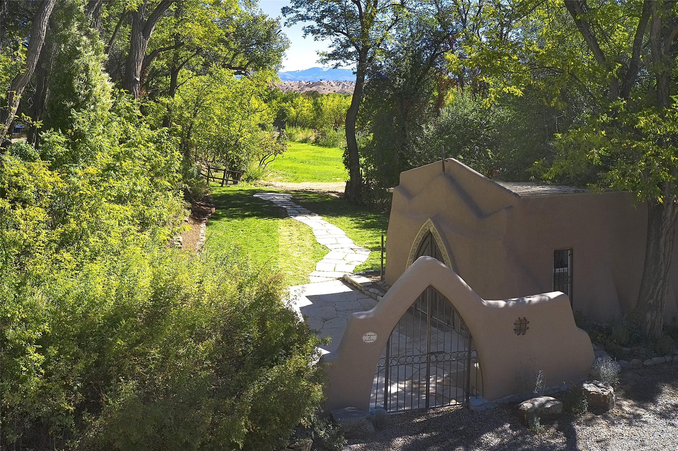 This historic estate is a one-of-a-kind New Mexico classic. The entire property has been extensively and lovingly updated with careful attention paid to conserving all the beauty, features and charm that has made it so enchanting since it was built. This over 4,300 square foot triple adobe estate sits behind a private gated entrance and is situated amongst over fifty 200+ year old cottonwoods, weeping willows, colorful gardens and meadows. The property sits on 3 lush acres in the Santa Cruz River Valley with pristine views of the Sangra de Cristo mountains. The property is conveniently located just 25 minutes north of Santa Fe.Full of amenities, the estate offers four large bedrooms, 5 1/2 bathrooms, 7 fireplaces, library, sunroom, bar, swimming pool, hot-tub, private creek, veranda and a nearly 2,000 sf courtyard. The courtyard offers easy access to all wings of the main building and is centered by a water feature and sheltered by an old apricot tree. One of the bedrooms is detached from the home and offers another layer of seclusion and escape. This room is fitted with a sitting area, kiva fireplace, soaking bathtub, and spacious shower.The estate has multiple possibilities as an excellent home, retreat, or possibly a Bed & Breakfast. The adjacent chapel building also has many potential uses.