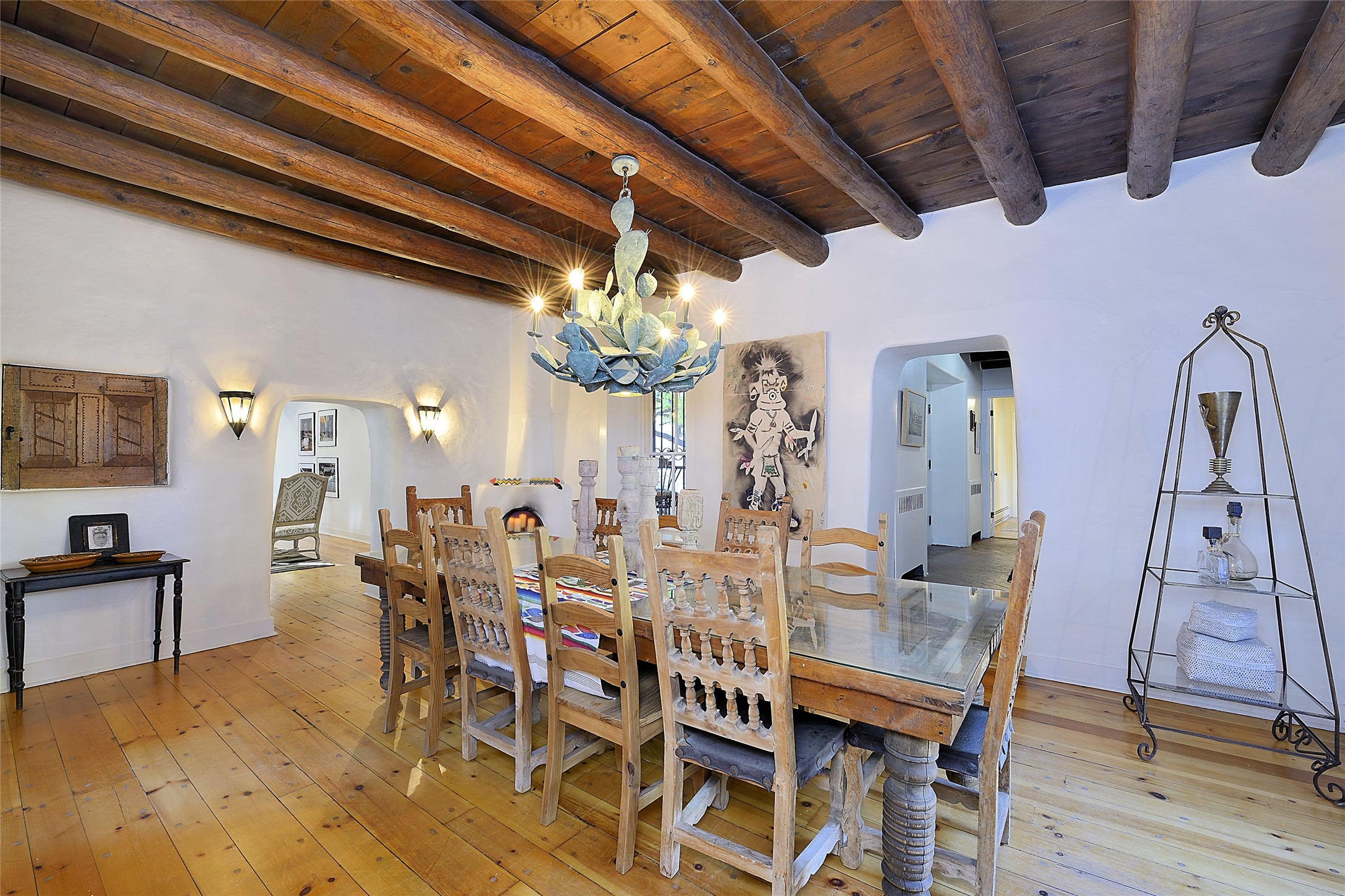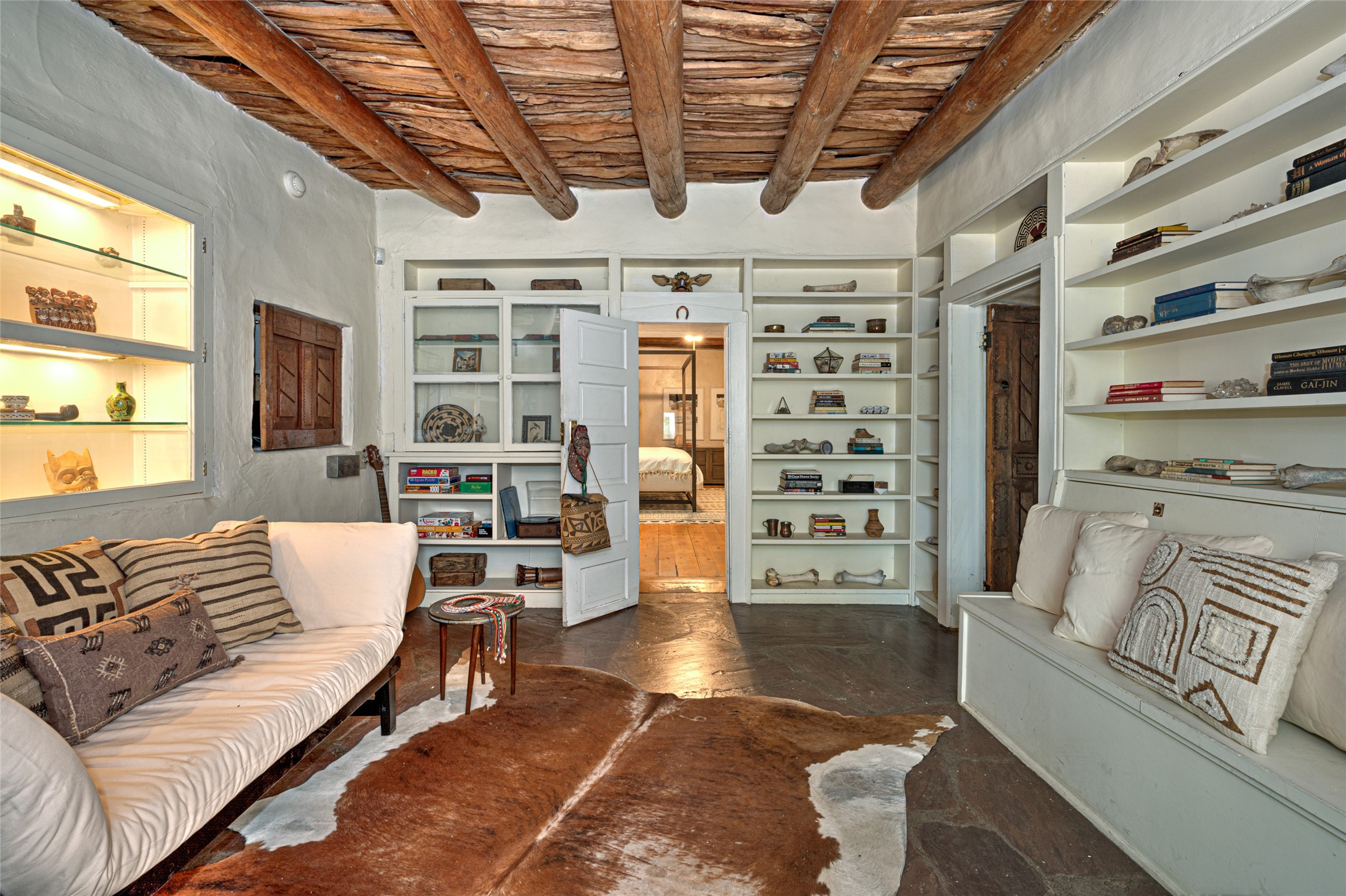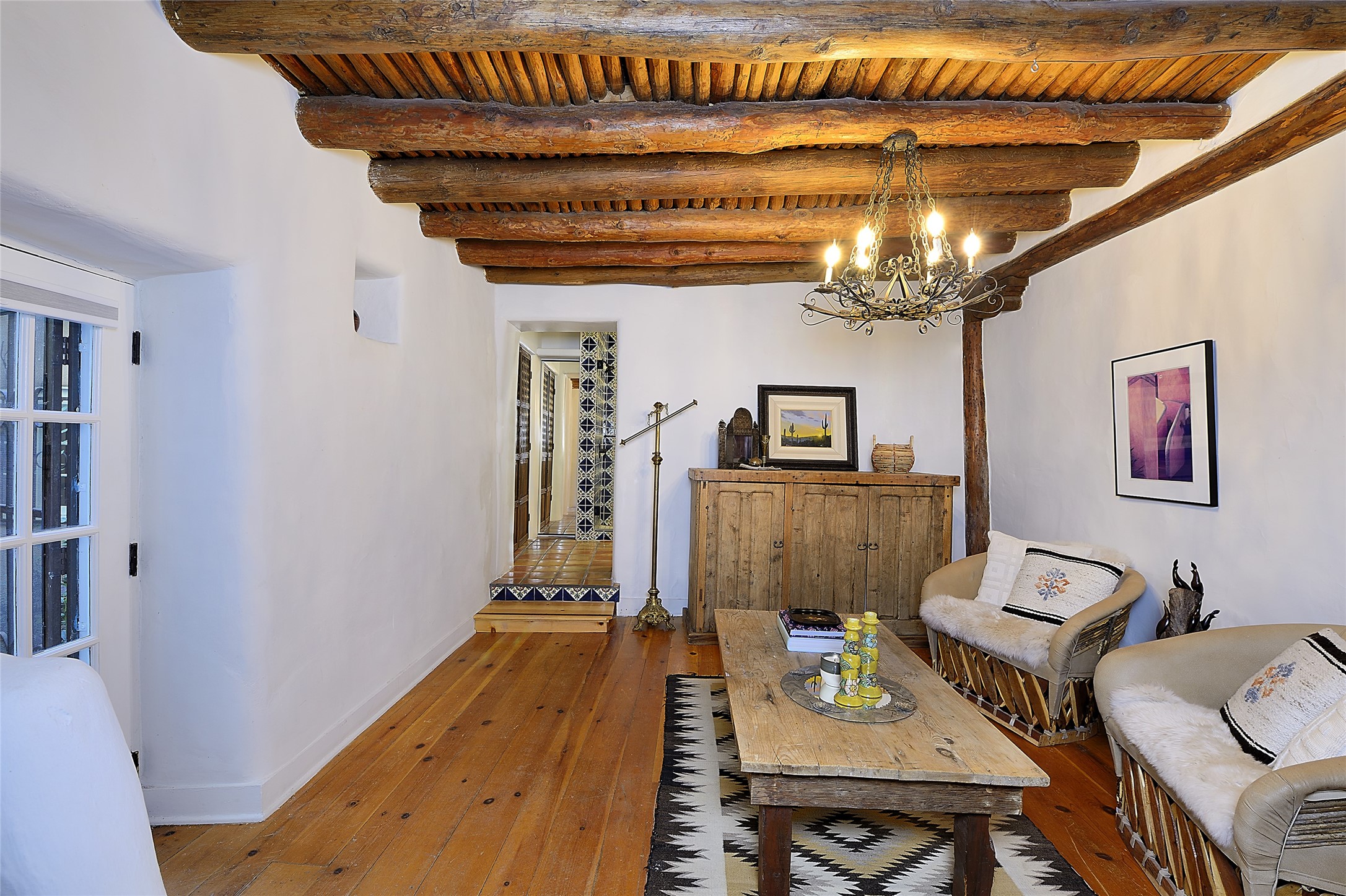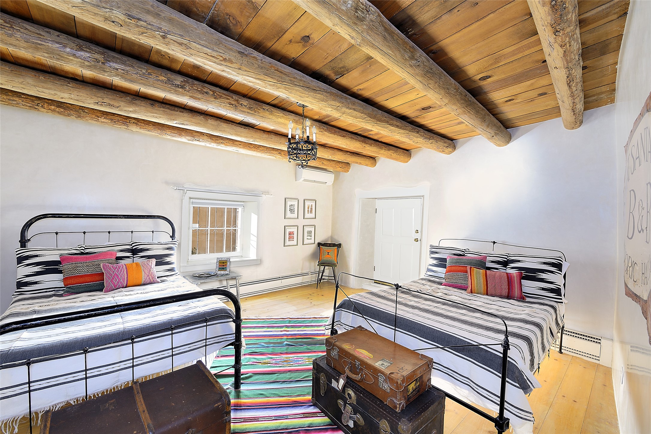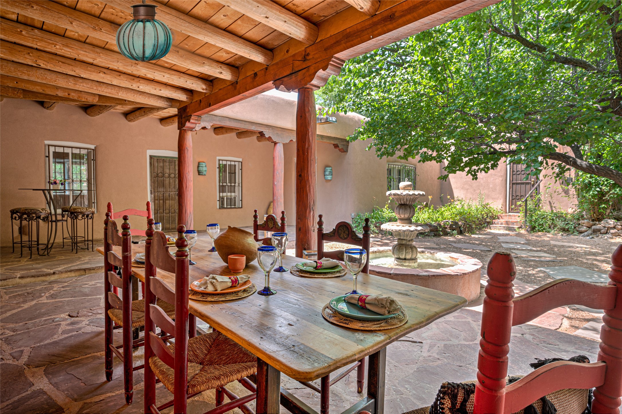 This historic estate is a one-of-a-kind New Mexico classic. The entire property has been extensively and lovingly updated with careful attention paid to conserving all the beauty, features and charm that has made it so enchanting since it was built. This over 4,300 square foot triple adobe estate sits behind a private gated entrance and is situated amongst over fifty 200+ year old cottonwoods, weeping willows, colorful gardens and meadows. The property sits on 3 lush acres in the Santa Cruz River Valley with pristine views of the Sangra de Cristo mountains. The property is conveniently located just 25 minutes north of Santa Fe.Full of amenities, the estate offers four large bedrooms, 5 1/2 bathrooms, 7 fireplaces, library, sunroom, bar, swimming pool, hot-tub, private creek, veranda and a nearly 2,000 sf courtyard. The courtyard offers easy access to all wings of the main building and is centered by a water feature and sheltered by an old apricot tree. One of the bedrooms is detached from the home and offers another layer of seclusion and escape. This room is fitted with a sitting area, kiva fireplace, soaking bathtub, and spacious shower.The estate has multiple possibilities as an excellent home, retreat, or possibly a Bed & Breakfast. The adjacent chapel building also has many potential uses.