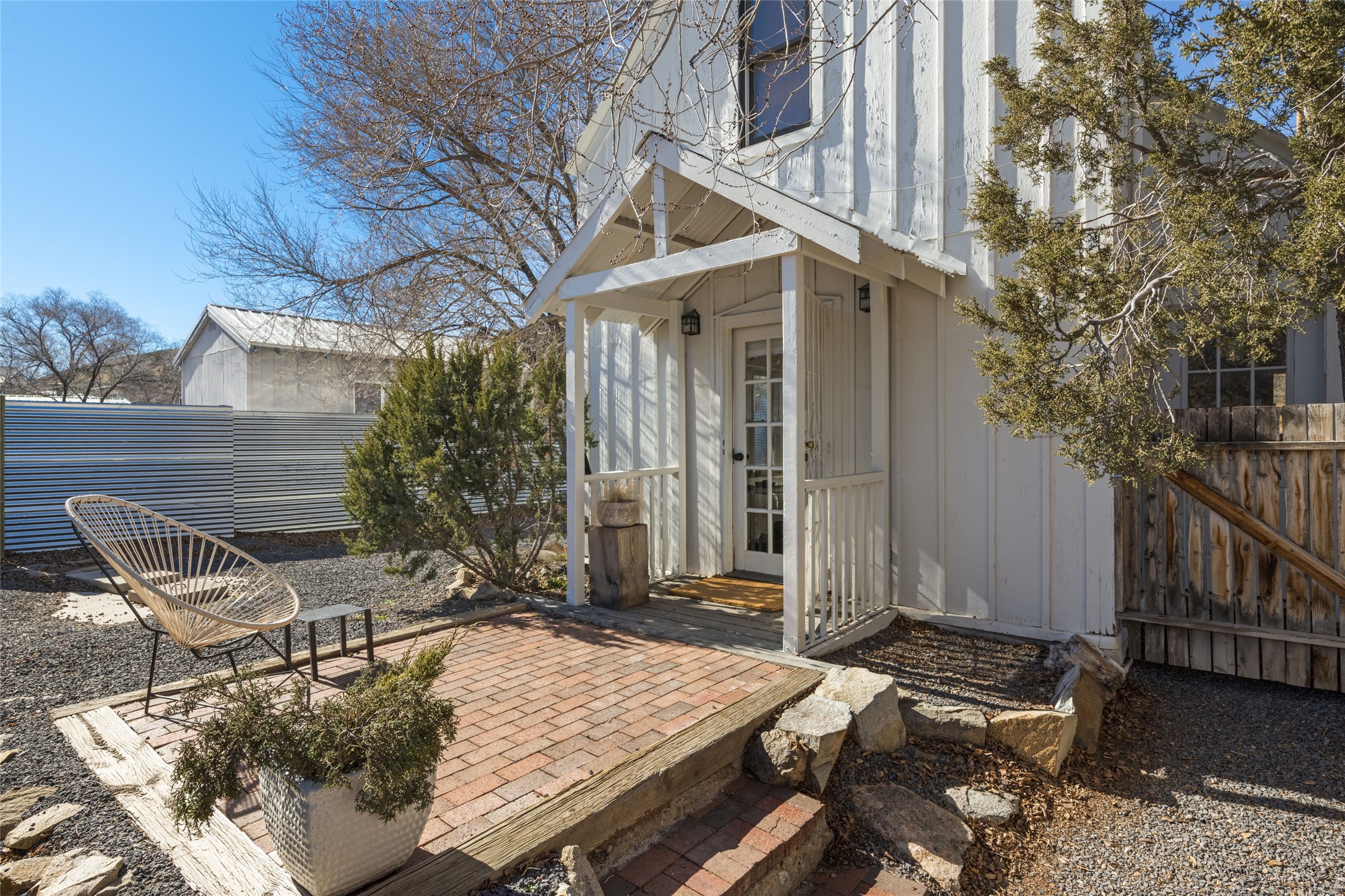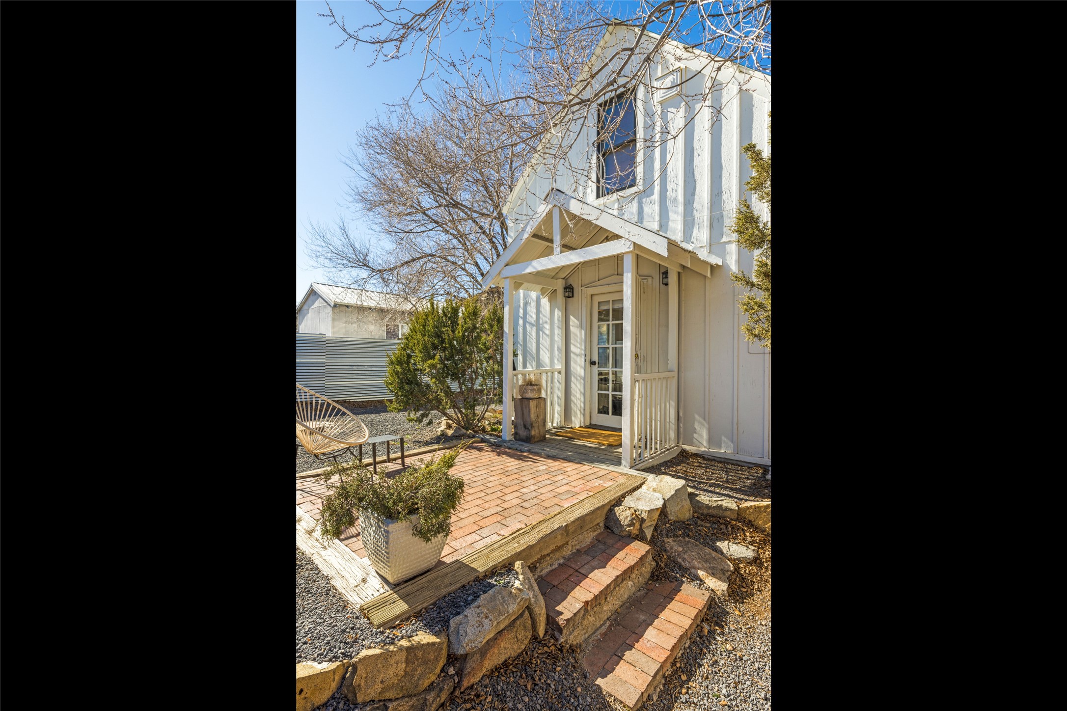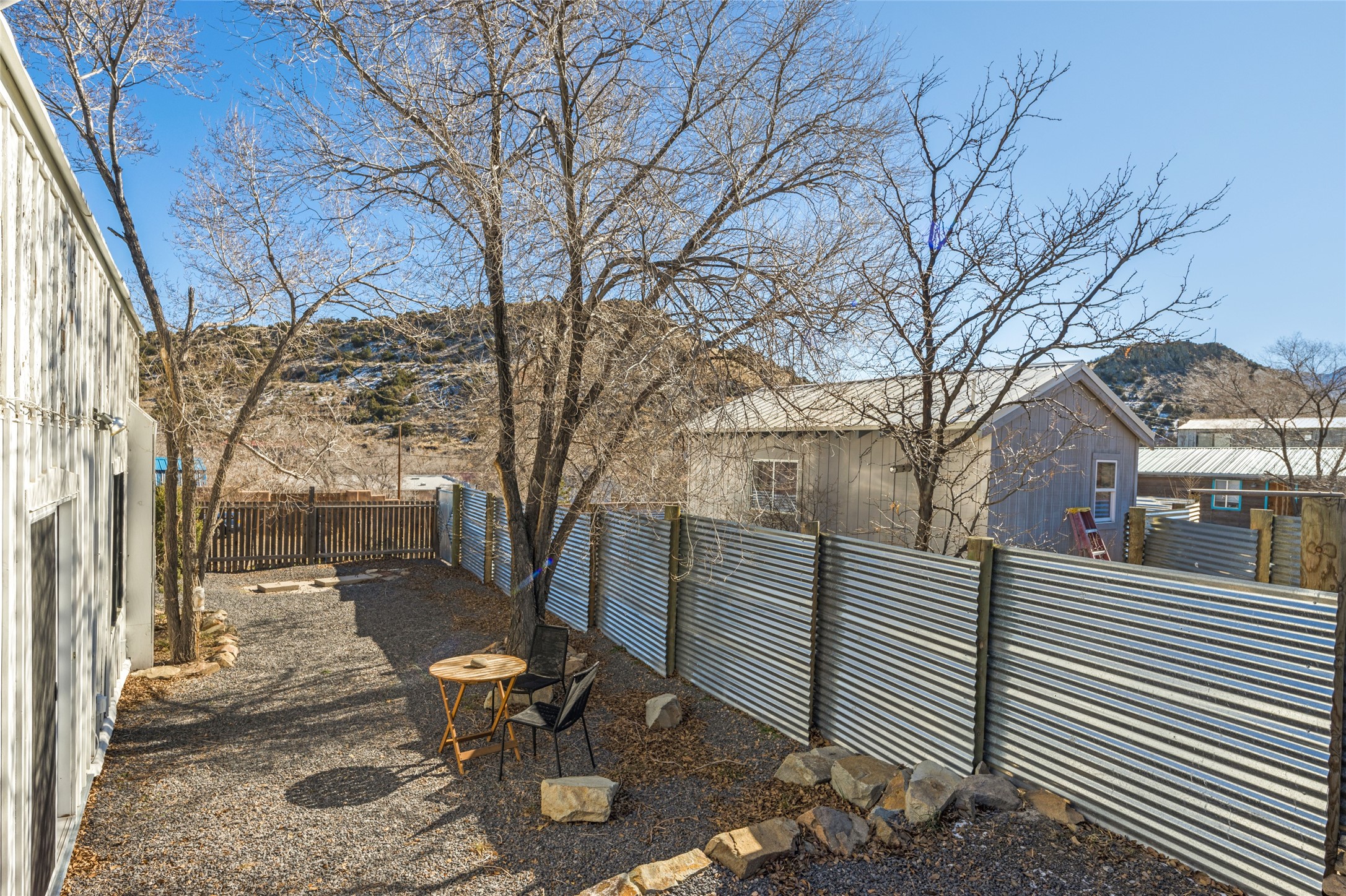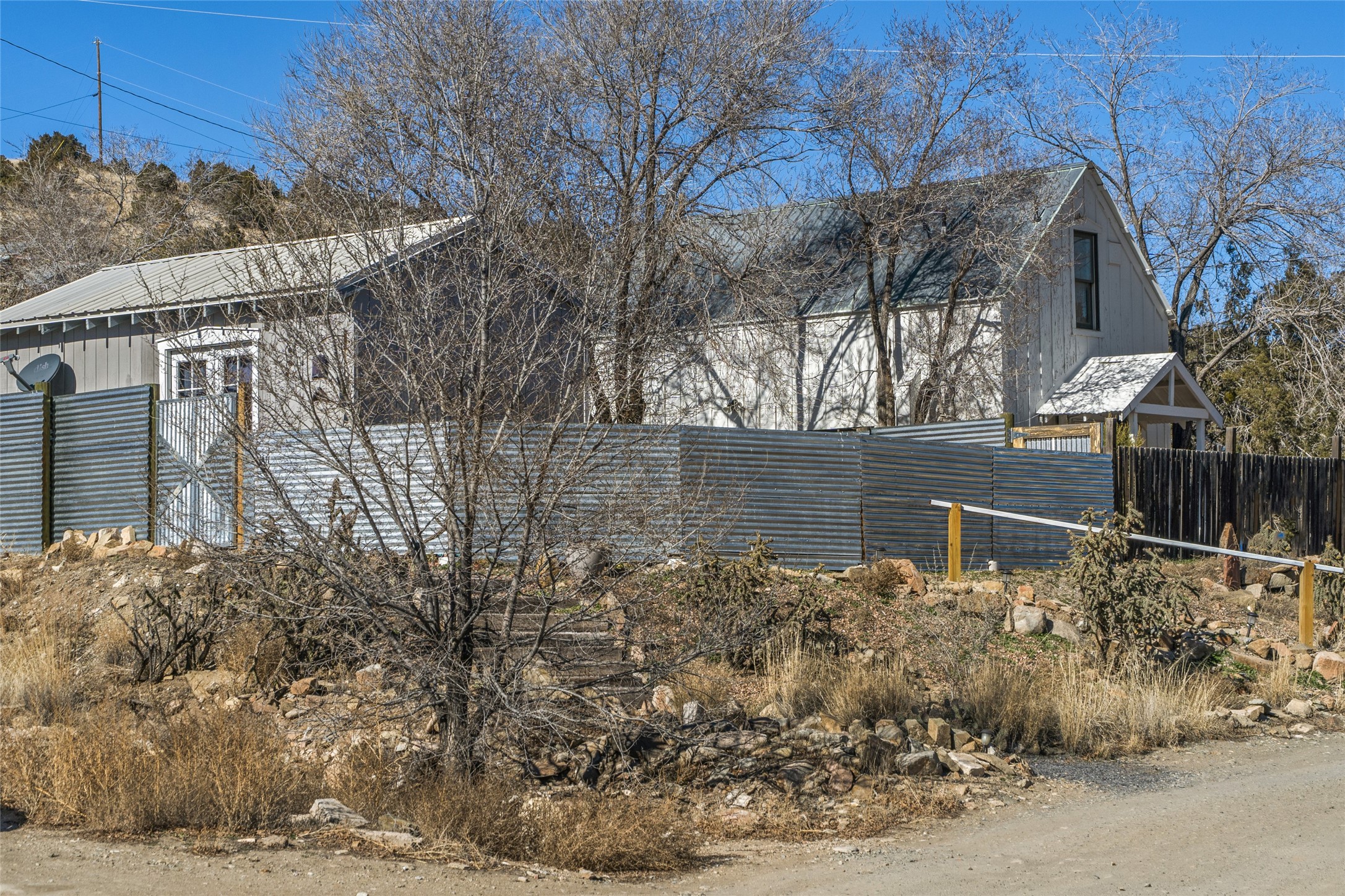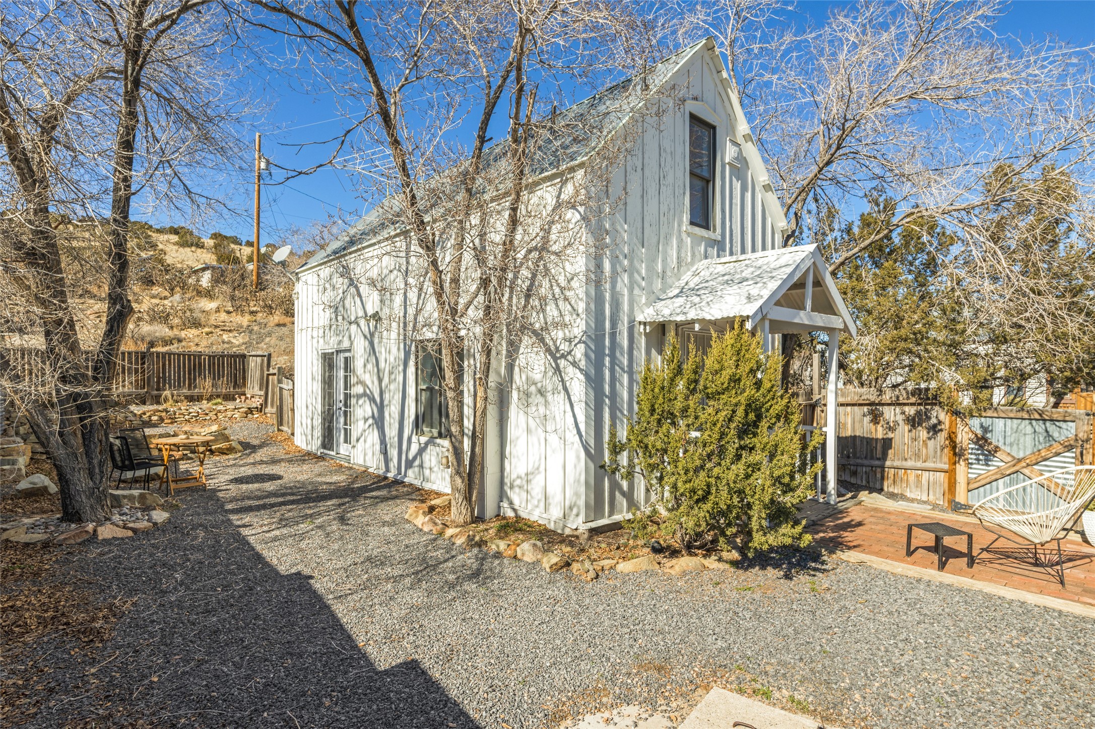 A charming house in great condition and detached guest house make this versatile property a great opportunity for home and studio, home with rental income or home with appealing guest quarters. The main home is nestled within a private fenced yard with entry gate and sits just above Madrid Main Street with views to the surrounding hillside and walking access to all that this vibrant, historic community has to offer. The wood beamed ceiling and lovely brick and wood floors in the main home add a warm and comfortable feel to the home. Patio doors from the living room allow for easy access to the outdoor courtyard. The upstairs bedroom and bath include updated tile, hardwood floors, and vaulted ceiling. The guest house is complete with kitchen, bath and lovely patio doors. Located just south of Santa Fe off the Scenic Turquoise Trail in Madrid village with restaurants, general store, coffee shop, live music, galleries and easy access to open space. The 1,100-acre Cerrillos Hills Park is only minutes away. Enjoy rural village living with easy access to Santa Fe and Albuquerque.