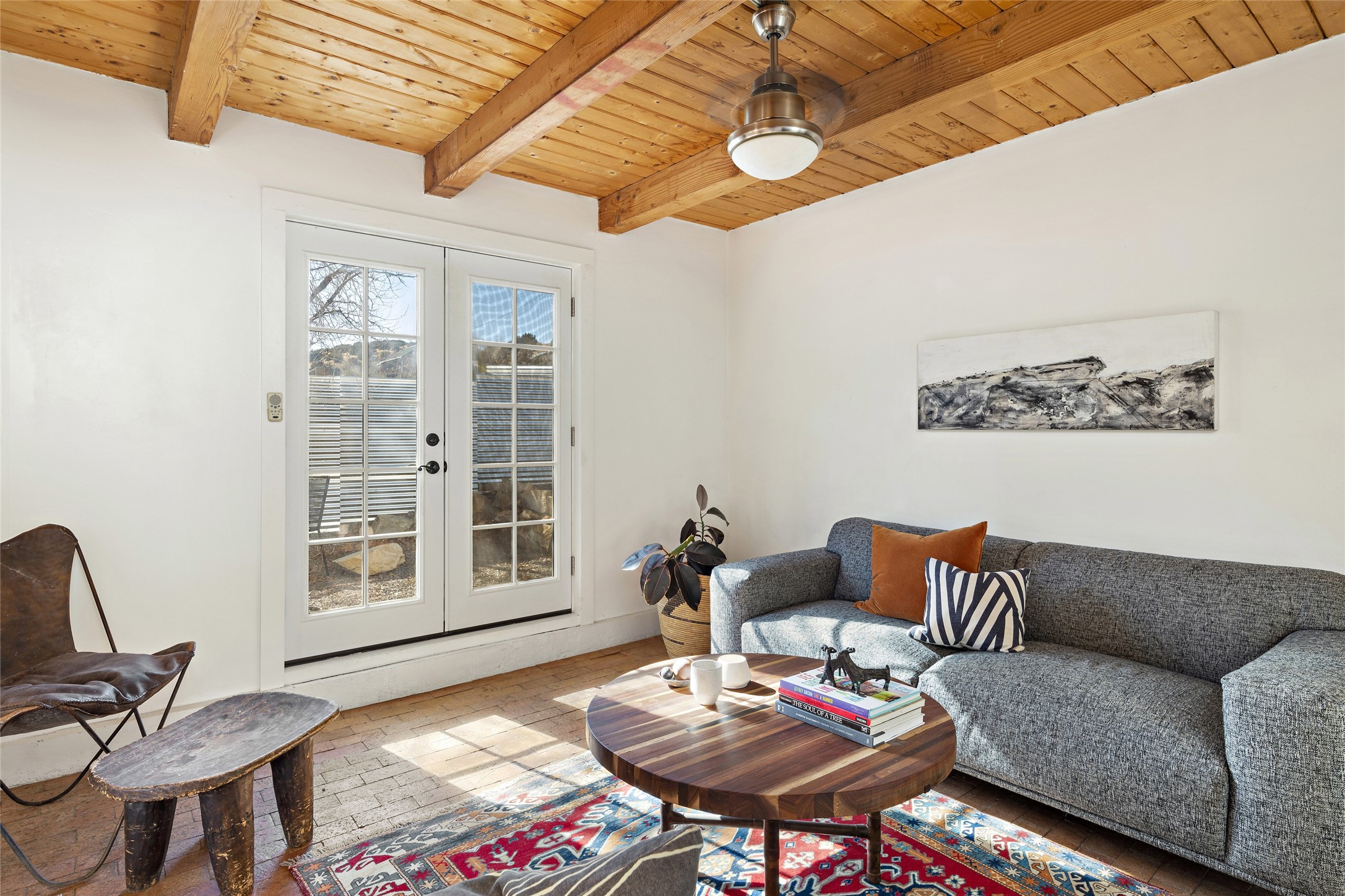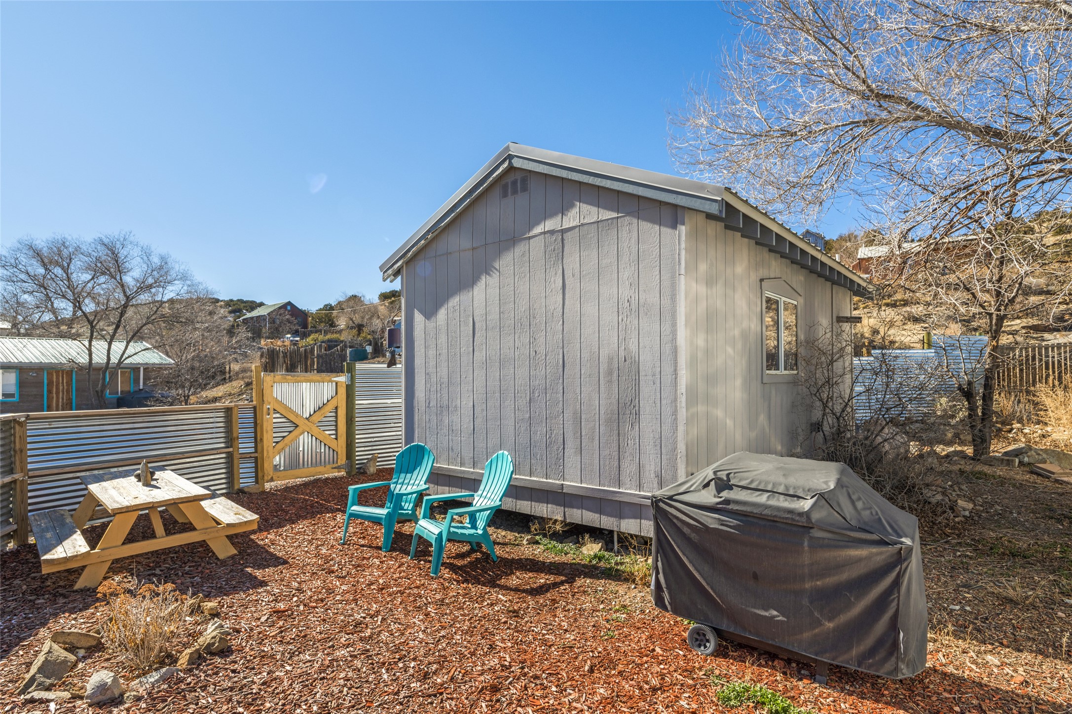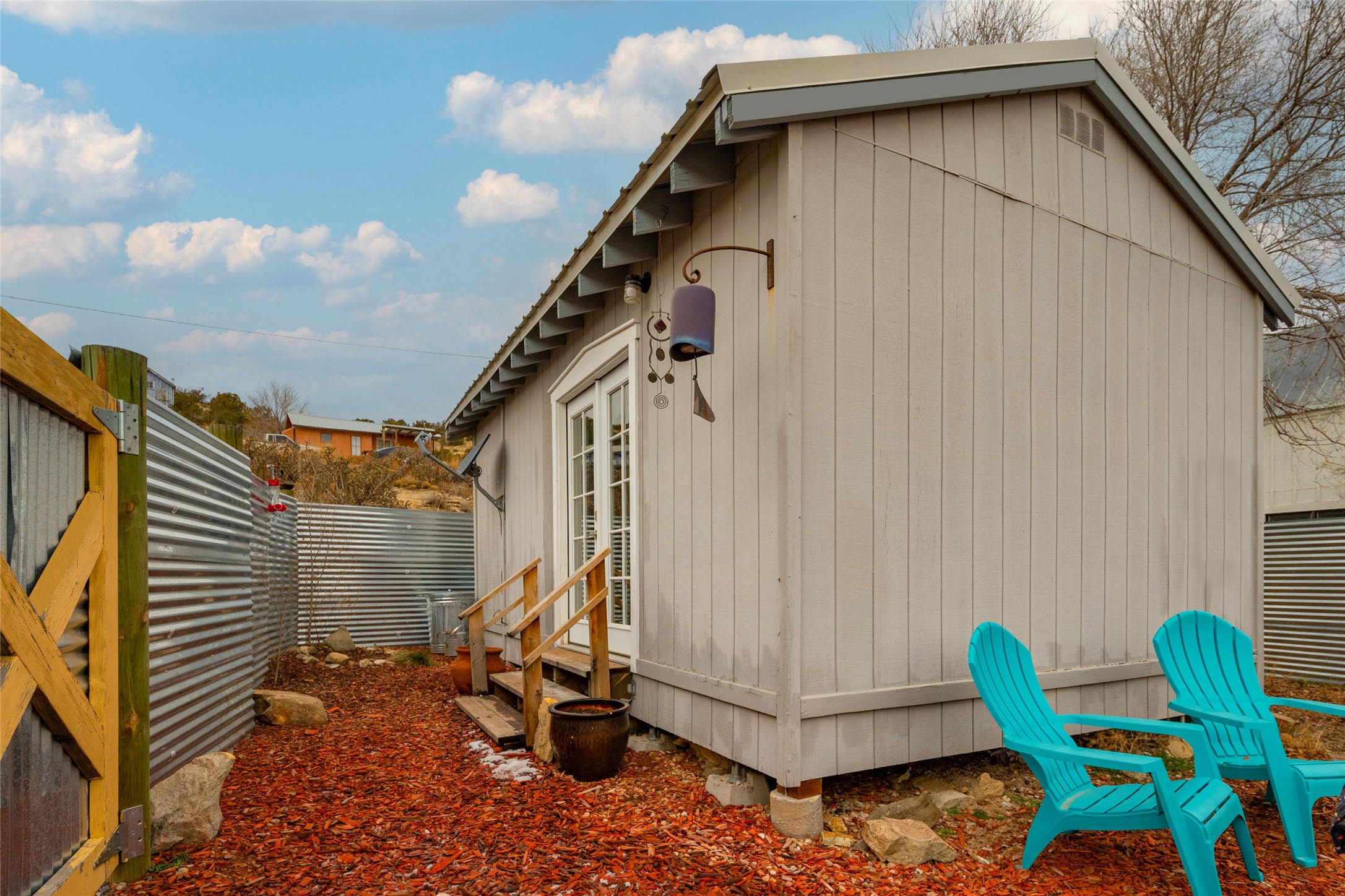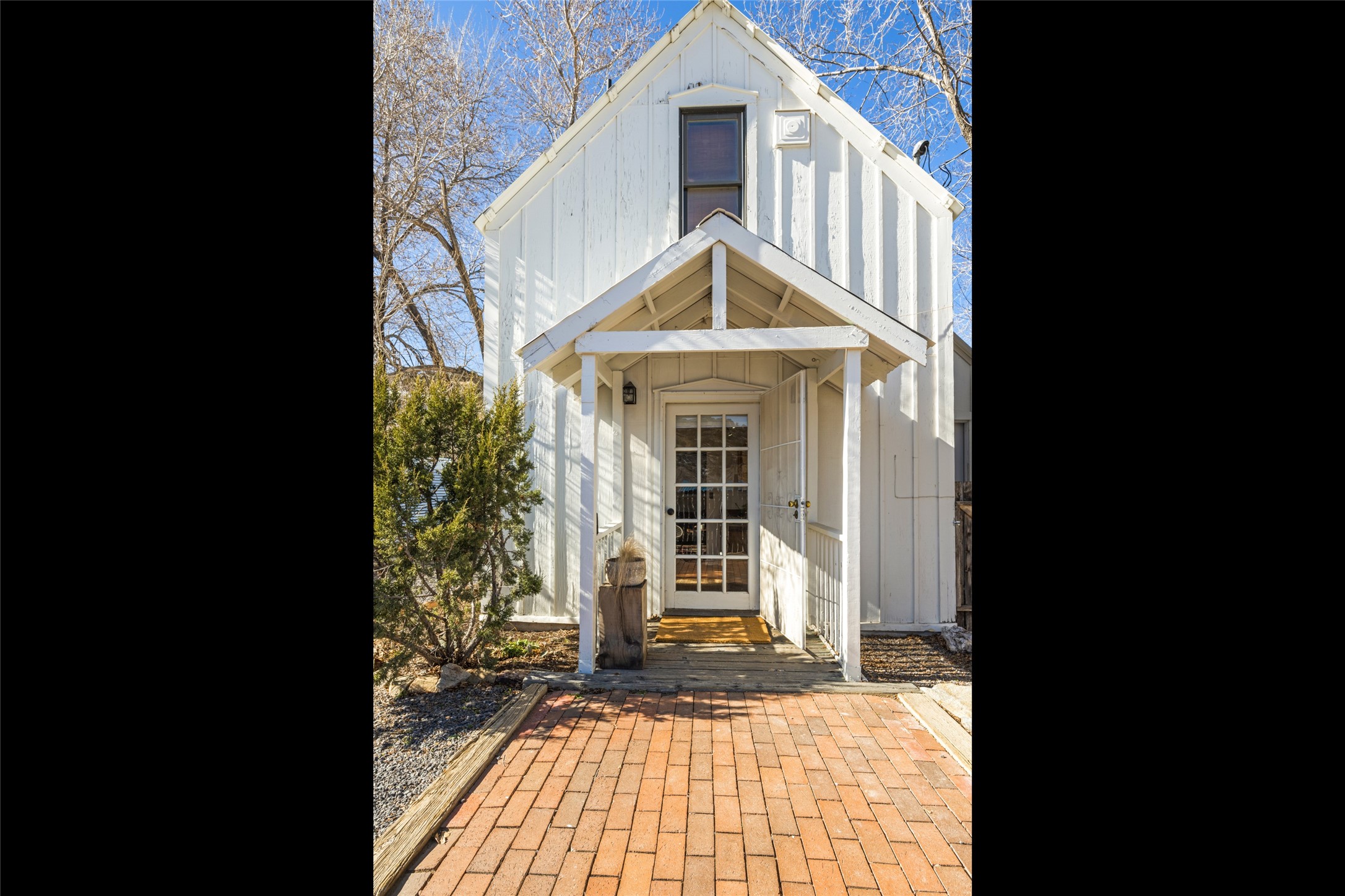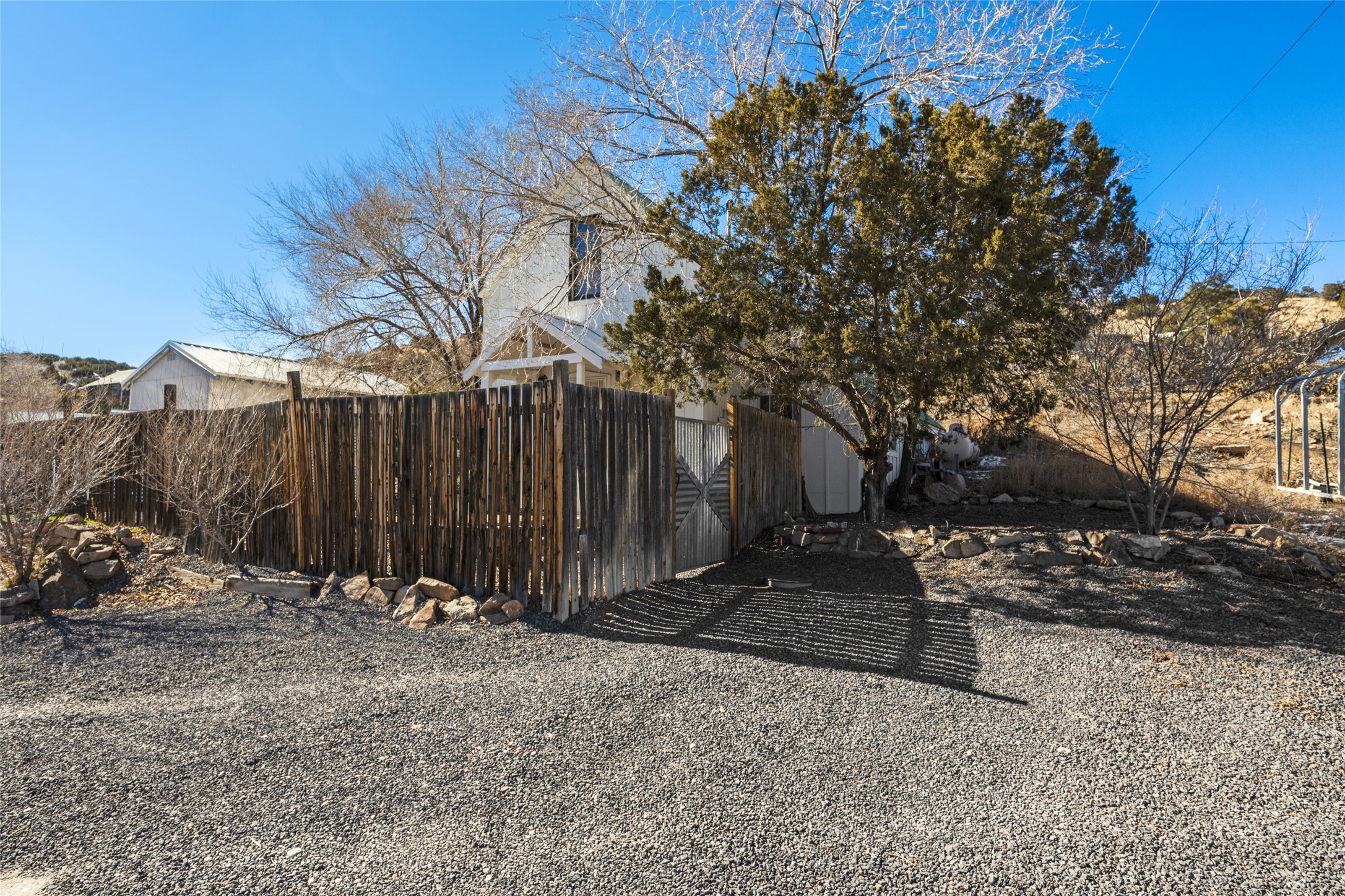 A charming house in great condition and detached guest house make this versatile property a great opportunity for home and studio, home with rental income or home with appealing guest quarters. The main home is nestled within a private fenced yard with entry gate and sits just above Madrid Main Street with views to the surrounding hillside and walking access to all that this vibrant, historic community has to offer. The wood beamed ceiling and lovely brick and wood floors in the main home add a warm and comfortable feel to the home. Patio doors from the living room allow for easy access to the outdoor courtyard. The upstairs bedroom and bath include updated tile, hardwood floors, and vaulted ceiling. The guest house is complete with kitchen, bath and lovely patio doors. Located just south of Santa Fe off the Scenic Turquoise Trail in Madrid village with restaurants, general store, coffee shop, live music, galleries and easy access to open space. The 1,100-acre Cerrillos Hills Park is only minutes away. Enjoy rural village living with easy access to Santa Fe and Albuquerque.