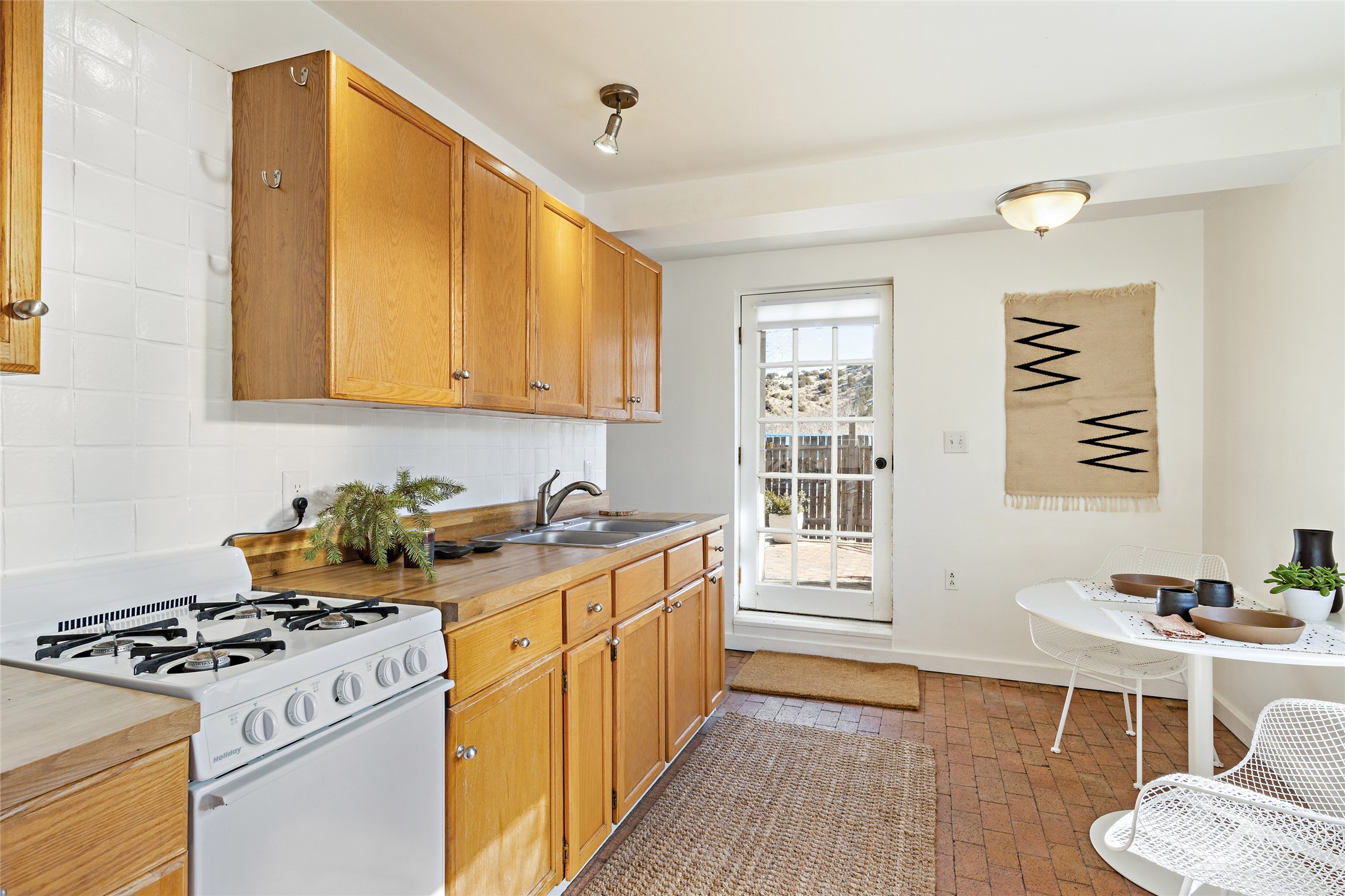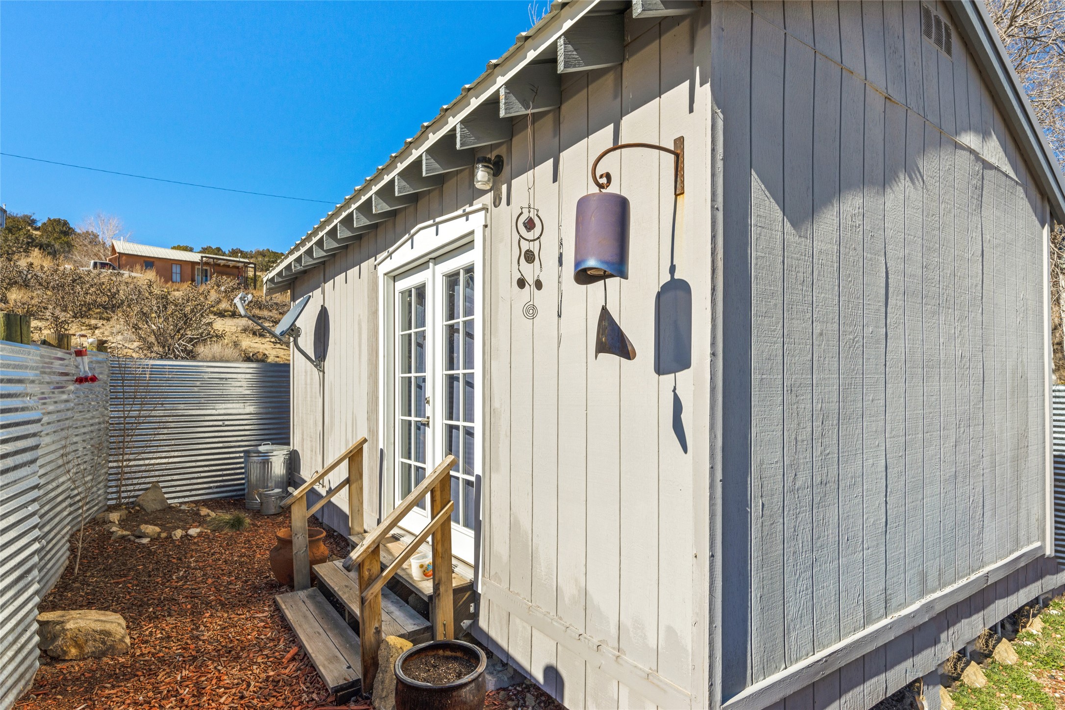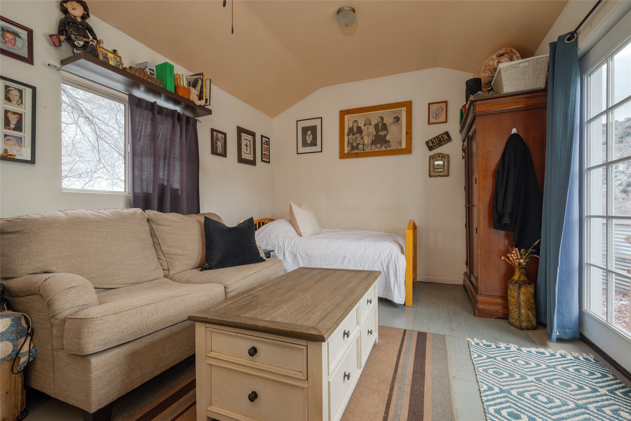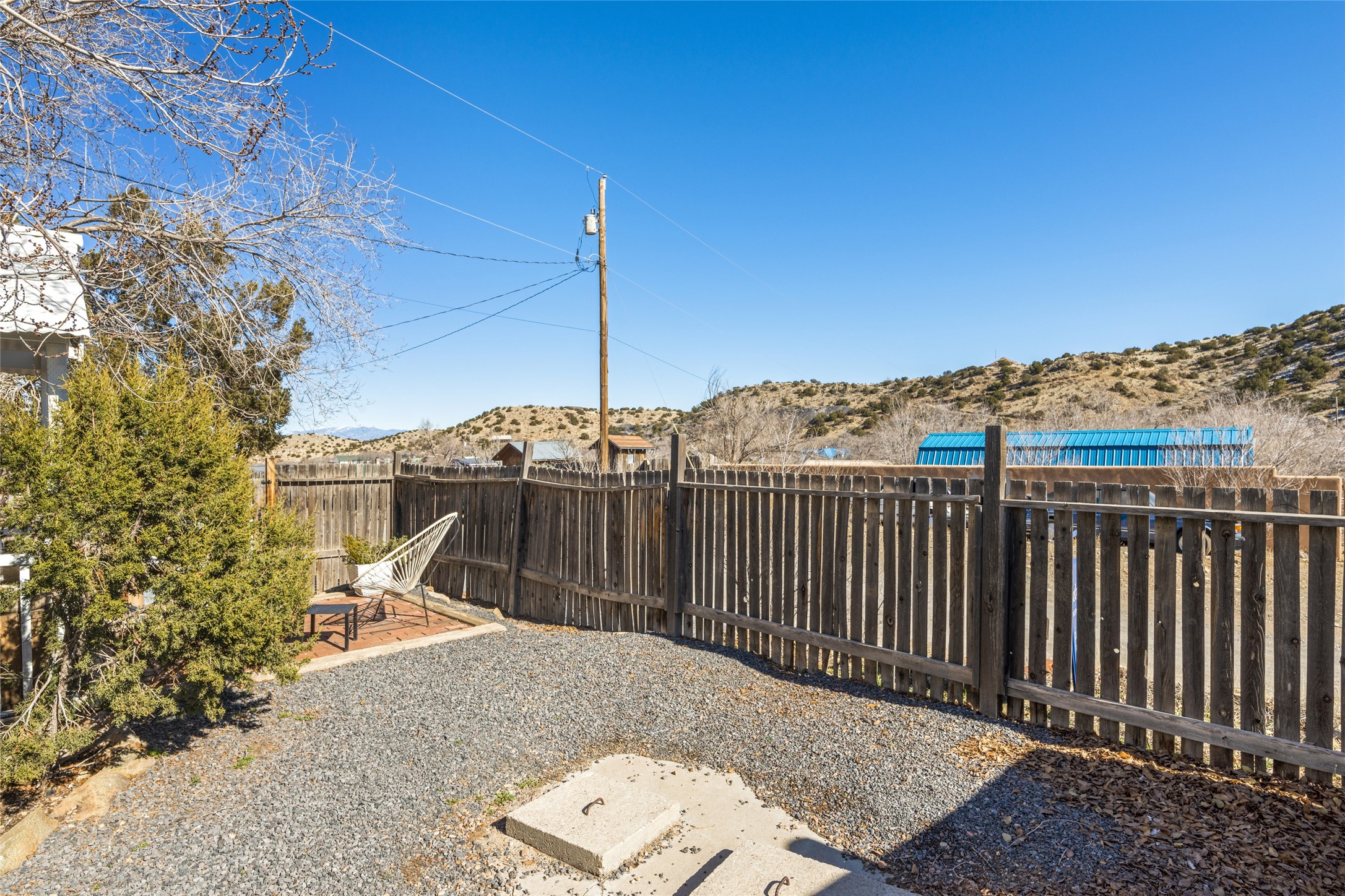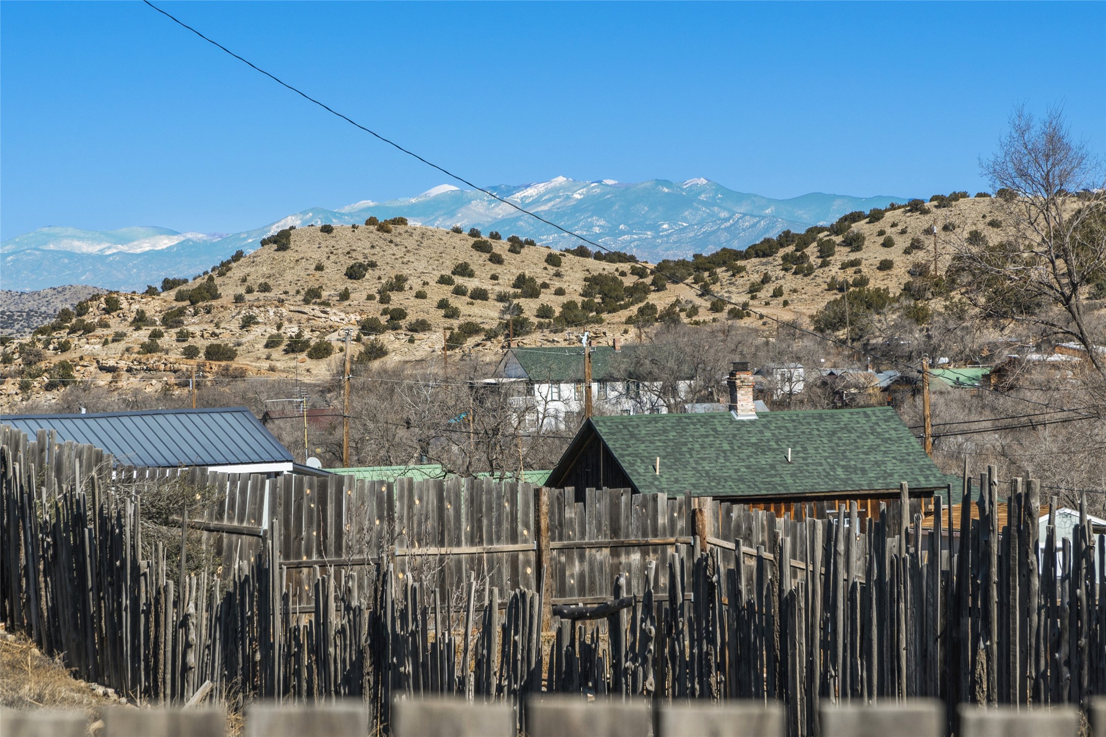 A charming house in great condition and detached guest house make this versatile property a great opportunity for home and studio, home with rental income or home with appealing guest quarters. The main home is nestled within a private fenced yard with entry gate and sits just above Madrid Main Street with views to the surrounding hillside and walking access to all that this vibrant, historic community has to offer. The wood beamed ceiling and lovely brick and wood floors in the main home add a warm and comfortable feel to the home. Patio doors from the living room allow for easy access to the outdoor courtyard. The upstairs bedroom and bath include updated tile, hardwood floors, and vaulted ceiling. The guest house is complete with kitchen, bath and lovely patio doors. Located just south of Santa Fe off the Scenic Turquoise Trail in Madrid village with restaurants, general store, coffee shop, live music, galleries and easy access to open space. The 1,100-acre Cerrillos Hills Park is only minutes away. Enjoy rural village living with easy access to Santa Fe and Albuquerque.