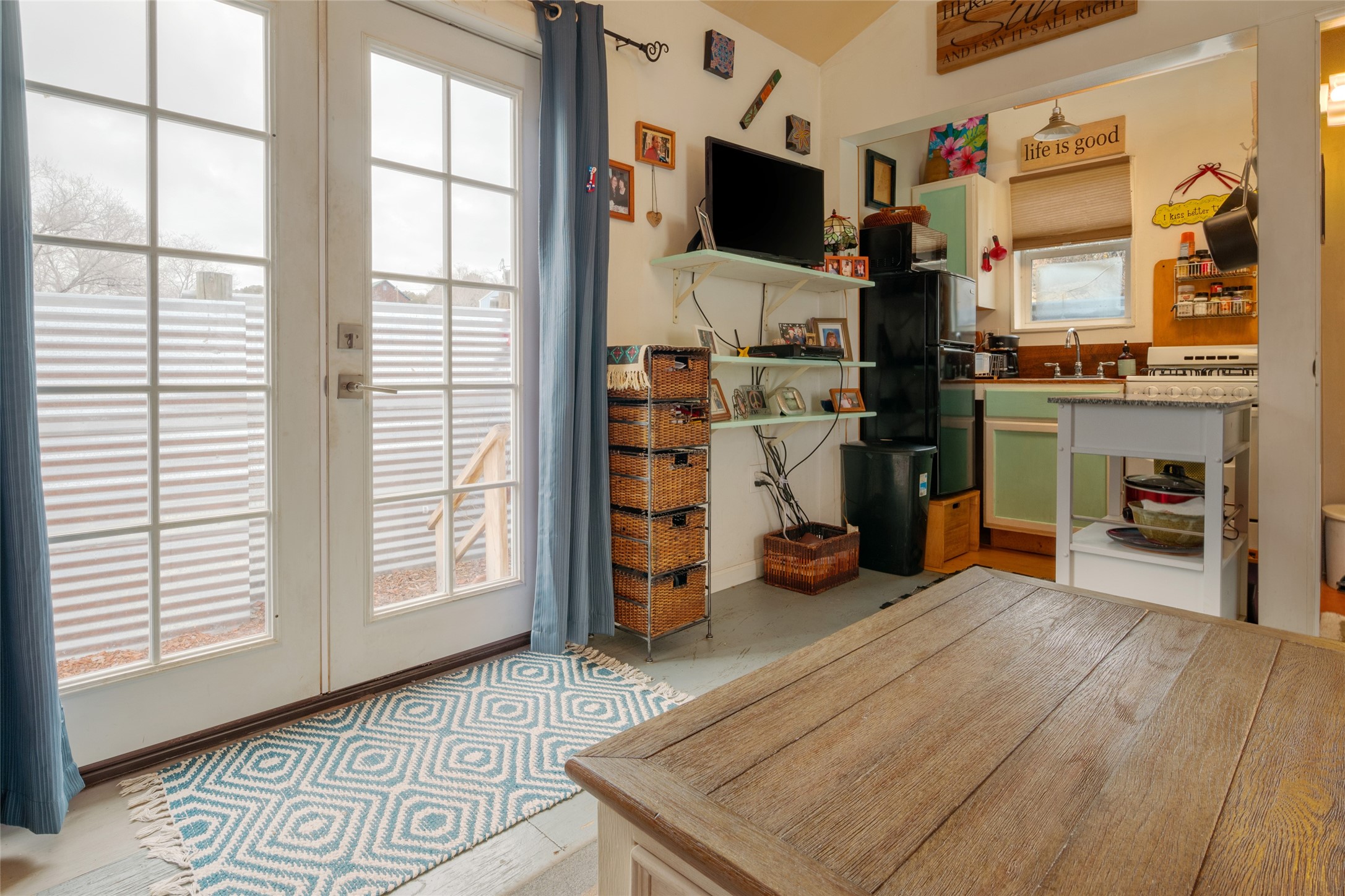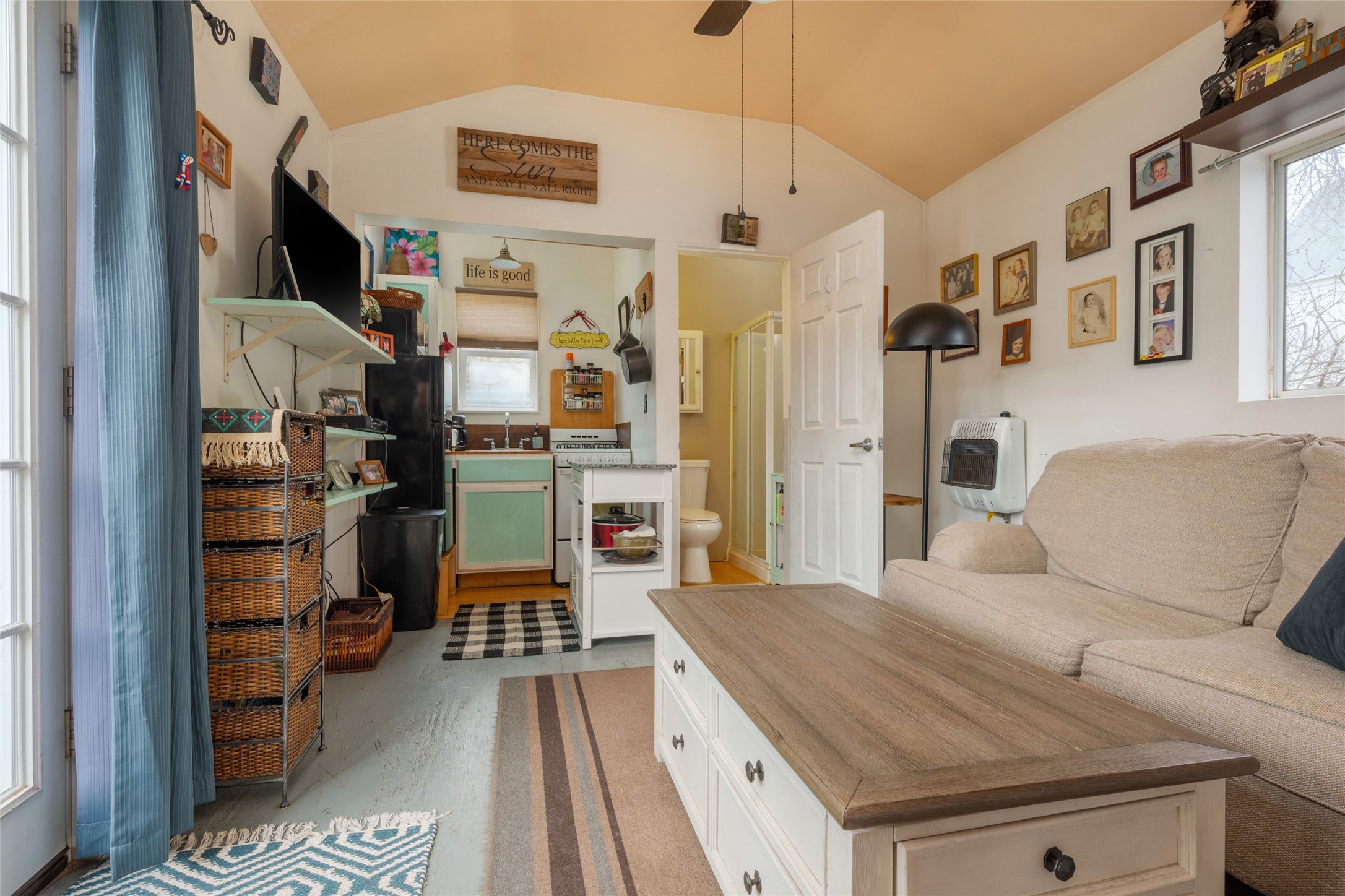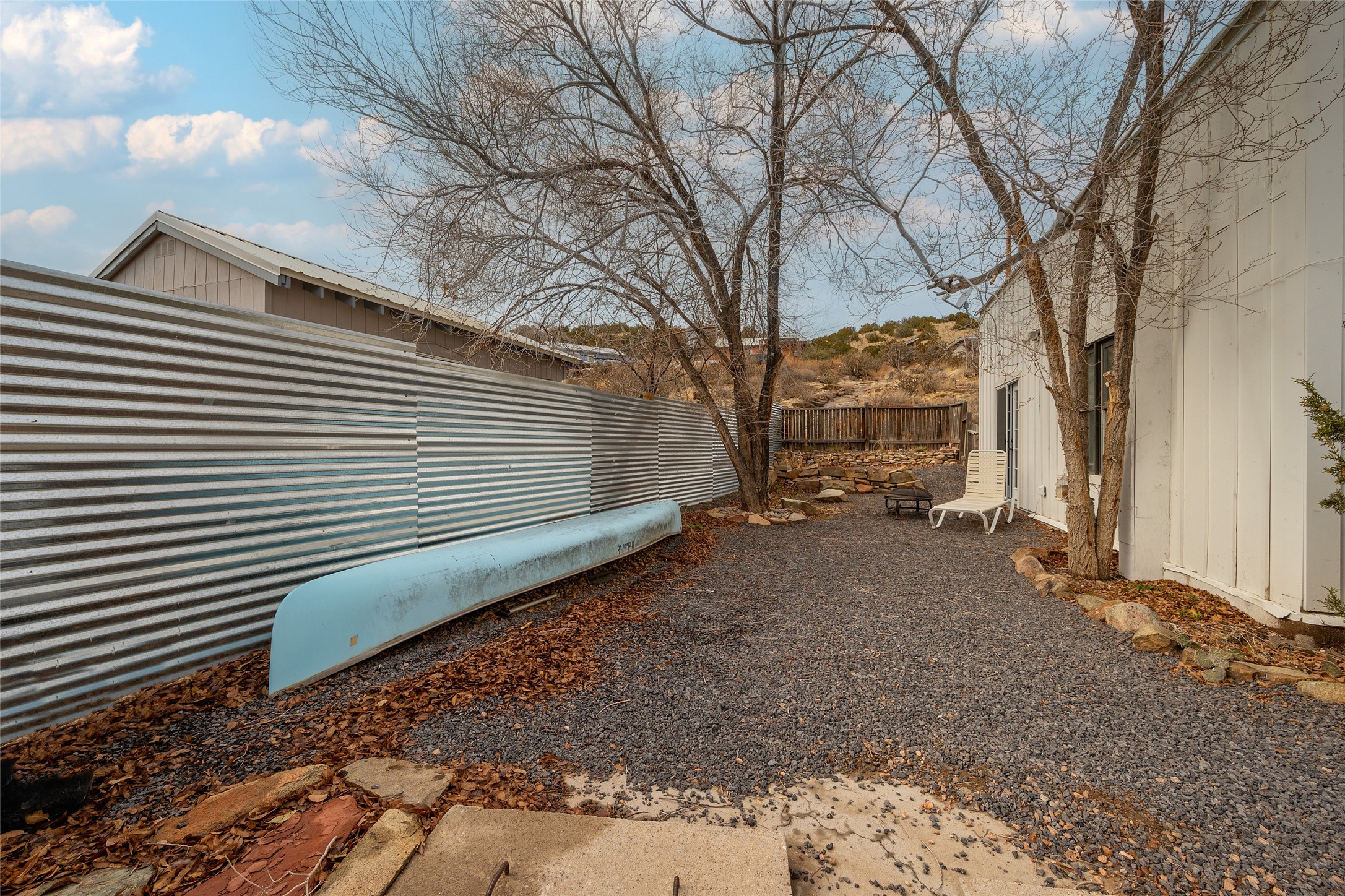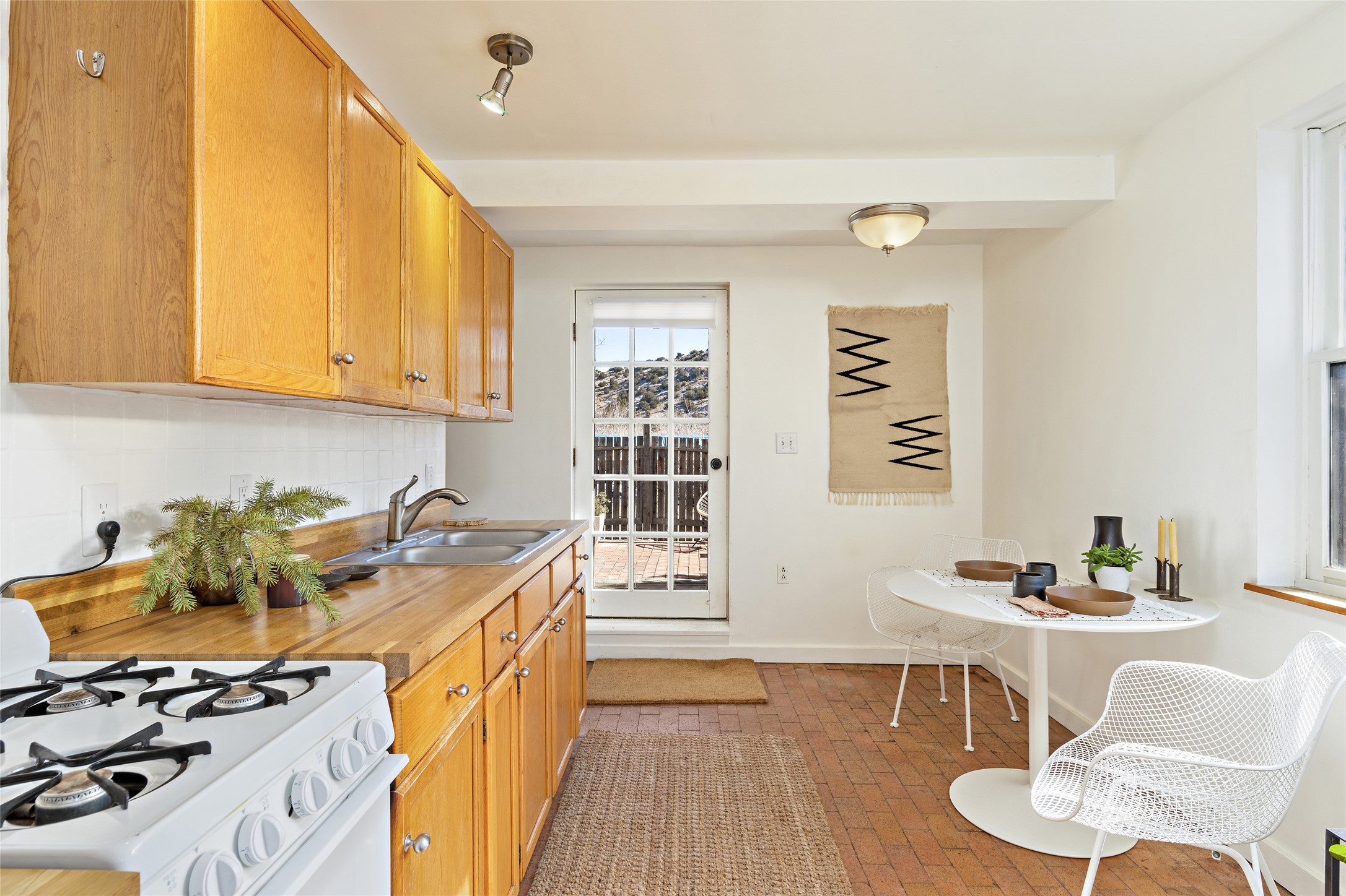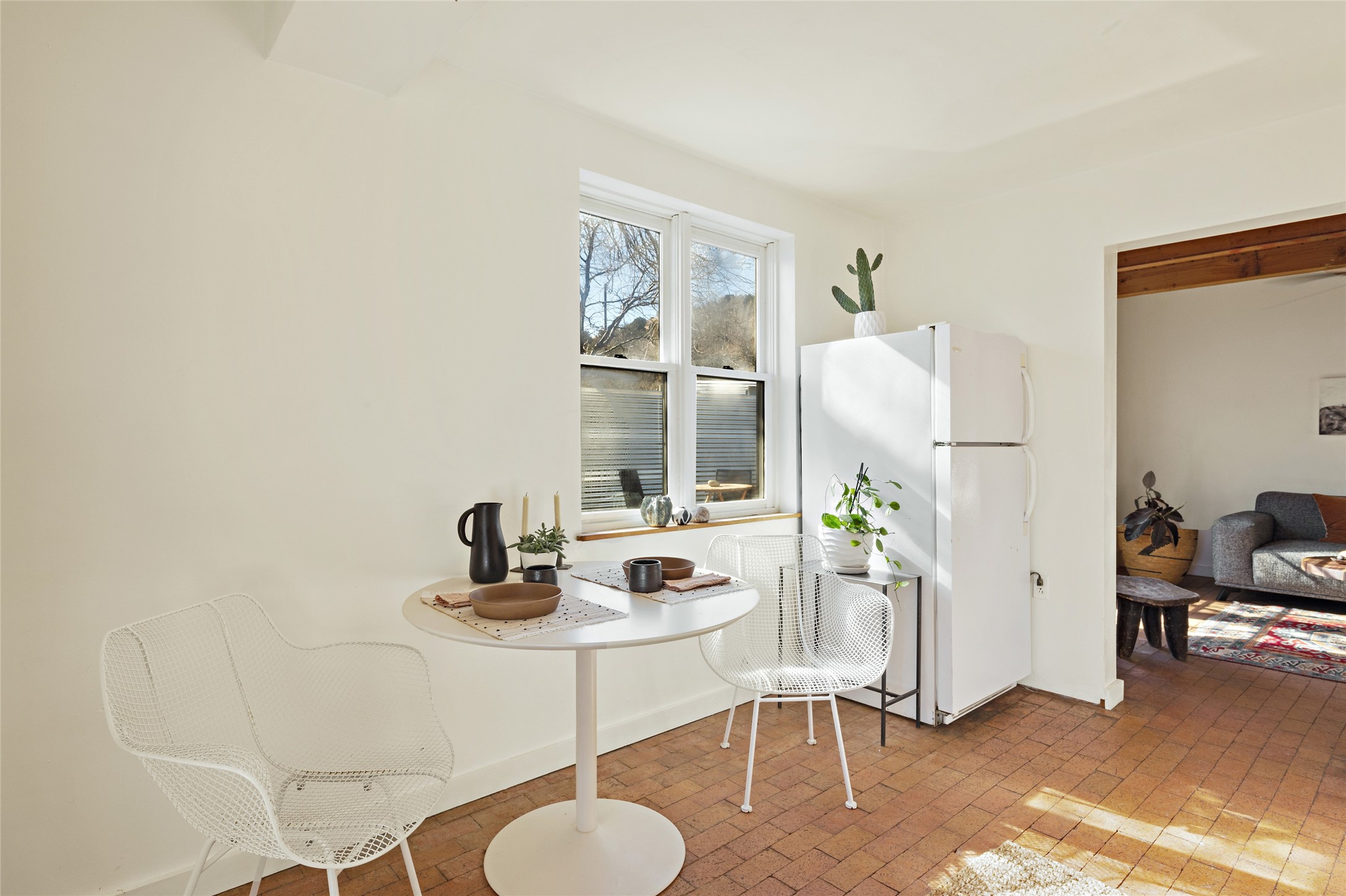 A charming house in great condition and detached guest house make this versatile property a great opportunity for home and studio, home with rental income or home with appealing guest quarters. The main home is nestled within a private fenced yard with entry gate and sits just above Madrid Main Street with views to the surrounding hillside and walking access to all that this vibrant, historic community has to offer. The wood beamed ceiling and lovely brick and wood floors in the main home add a warm and comfortable feel to the home. Patio doors from the living room allow for easy access to the outdoor courtyard. The upstairs bedroom and bath include updated tile, hardwood floors, and vaulted ceiling. The guest house is complete with kitchen, bath and lovely patio doors. Located just south of Santa Fe off the Scenic Turquoise Trail in Madrid village with restaurants, general store, coffee shop, live music, galleries and easy access to open space. The 1,100-acre Cerrillos Hills Park is only minutes away. Enjoy rural village living with easy access to Santa Fe and Albuquerque.