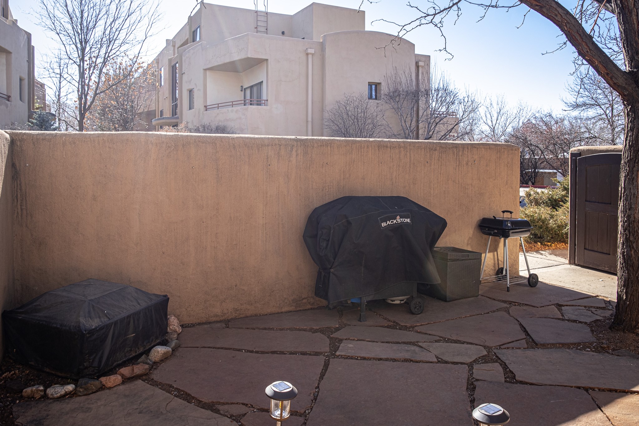 OPEN HOUSE ON SATURDAY- APRIL 1 AND SUNDAY- APRIL 2 FROM 1PM TO 4PM. SEE YOU THERE!This La Remuda condo is a hidden treasure, right in the heart of town!This unique property is located in a quiet, secluded area just 5 minutes from the plaza and 5 minutes from the interstate. You have a front patio area, large enough for entertaining. It is shaded in the summer by mature trees and there is plenty of parking for guests. Large, passive solar atrium windows bring in lots of bright sun light from the lower level of the condo to the upper level. You have a covered parking area and spacious storage at the back entrance of the condo. This is rare for Santa Fe. You enter the condo from the back door to a split level entrance where you may proceed upstairs to the bedrooms or downstairs to the living area. The tile on the stairs is newly installed as is the wood flooring upstairs. This home has been freshly painted throughout the lower living area and all vigas re-stained. The lower flooring is brick throughout the living, dining, powder room and kitchen area. High ceilings, beams and a kiva enhance the lower level for a very charming and inviting area. As it is below ground level, the lower level stays naturally cool in the summer. The upper level has an energy efficient mini split air conditioner in the master bedroom, which keeps the room as cool as you desire. come see for yourself and be sure to watch the video online as well. Home has a new roof as of NOV 2022..