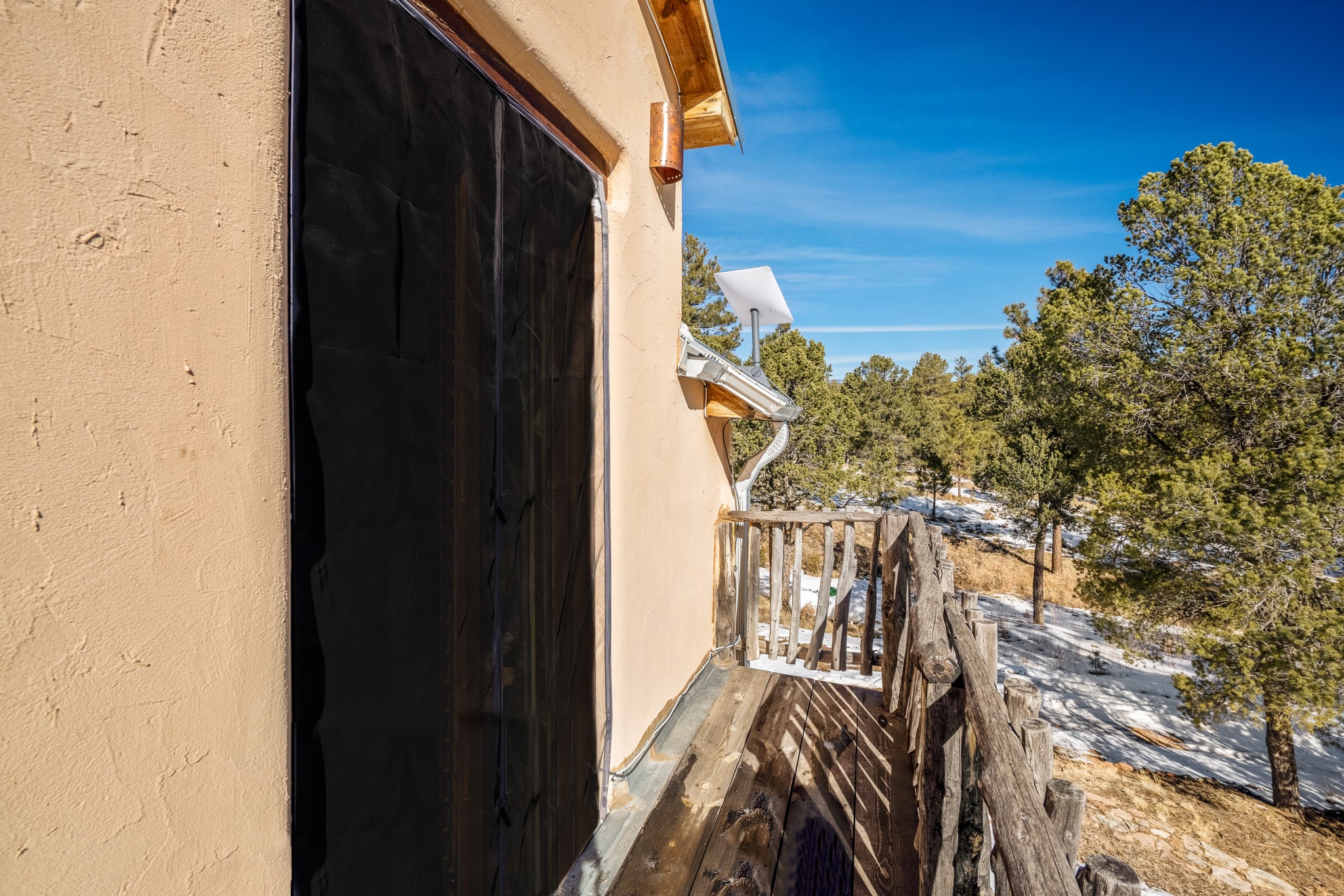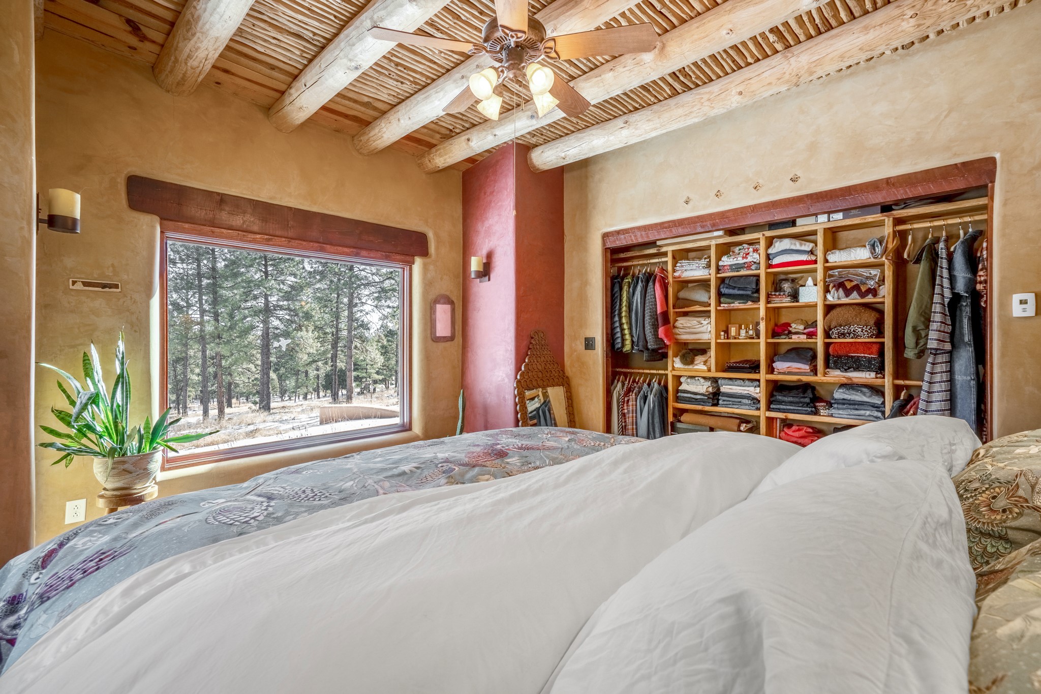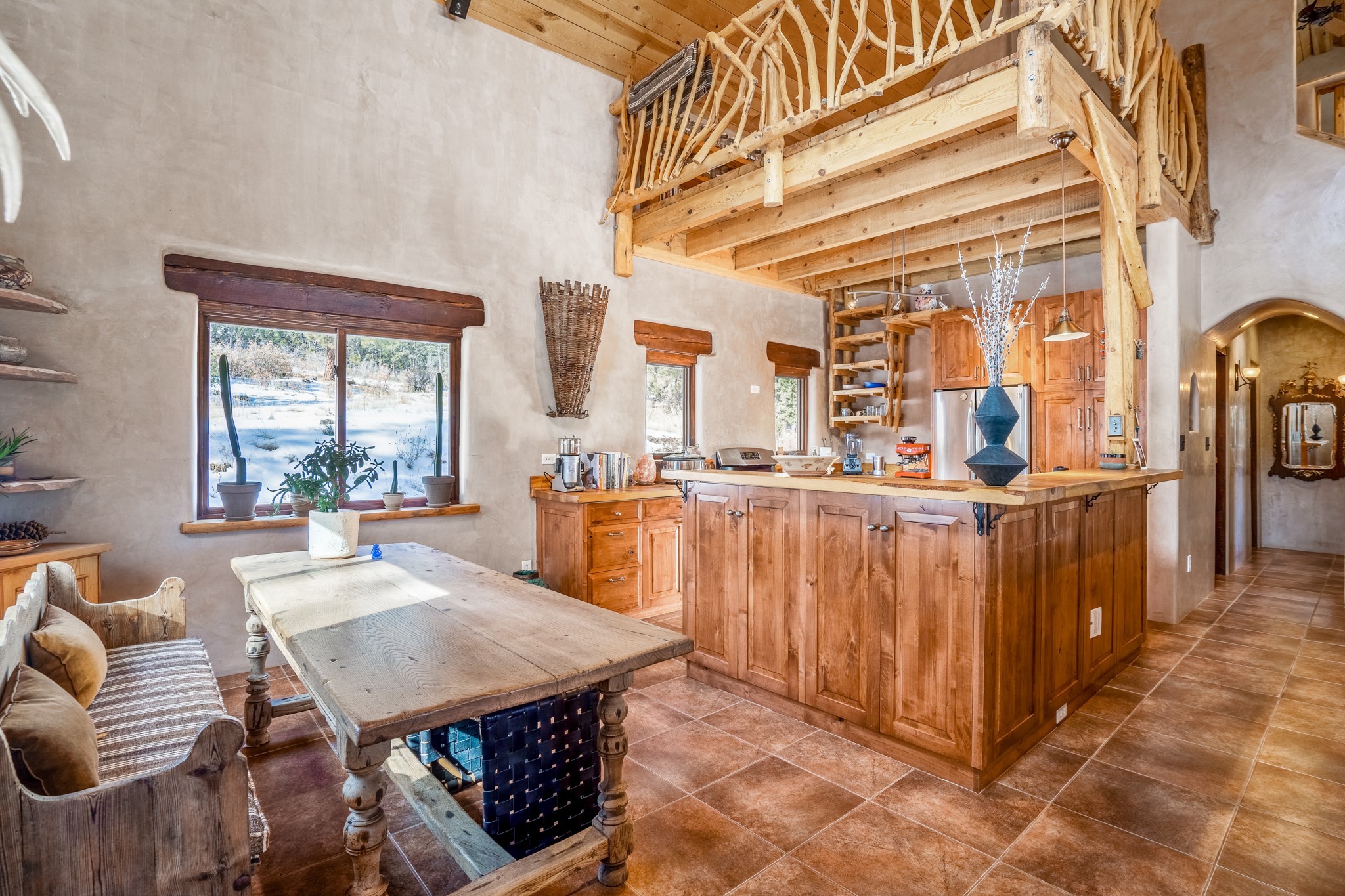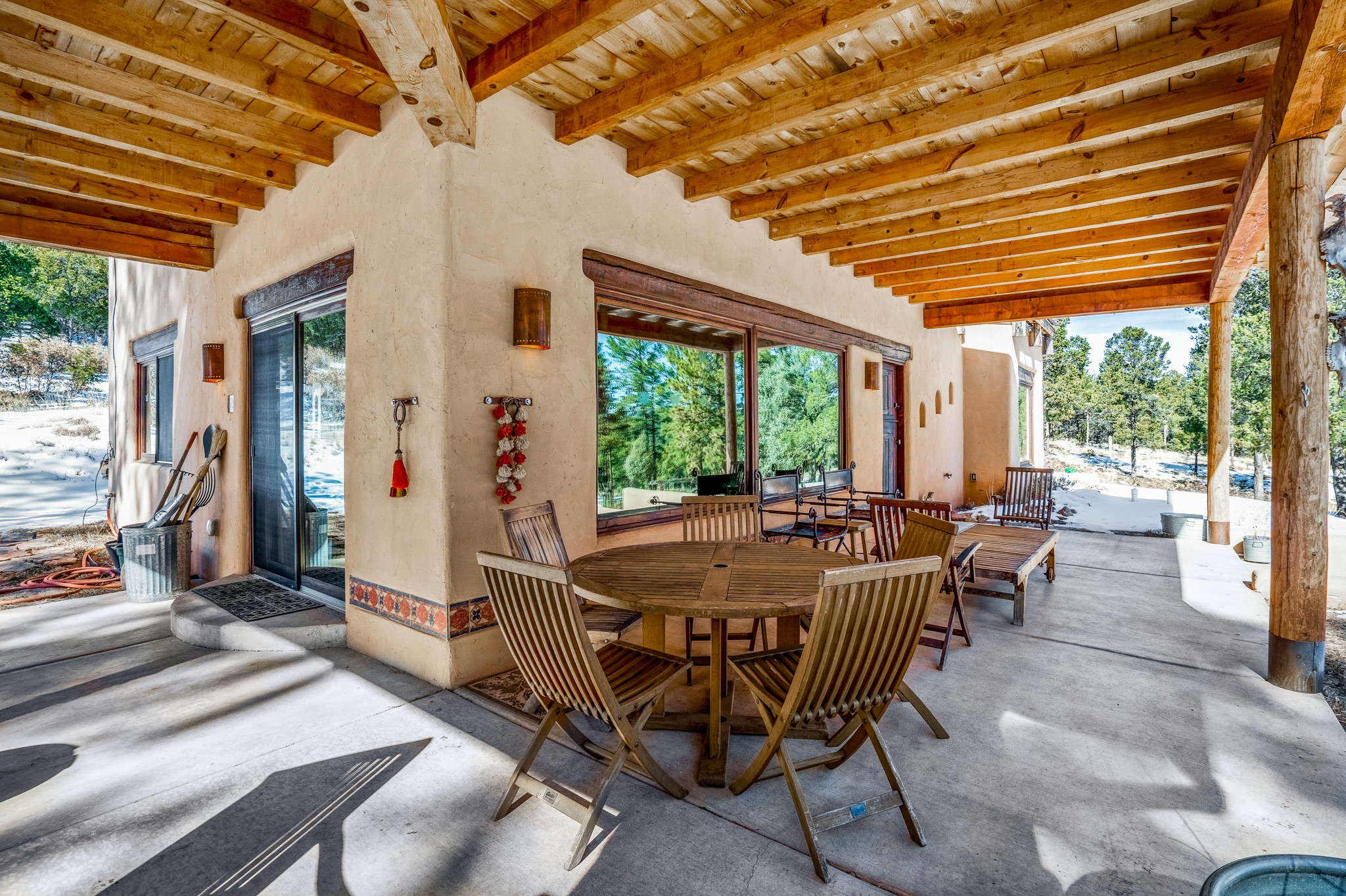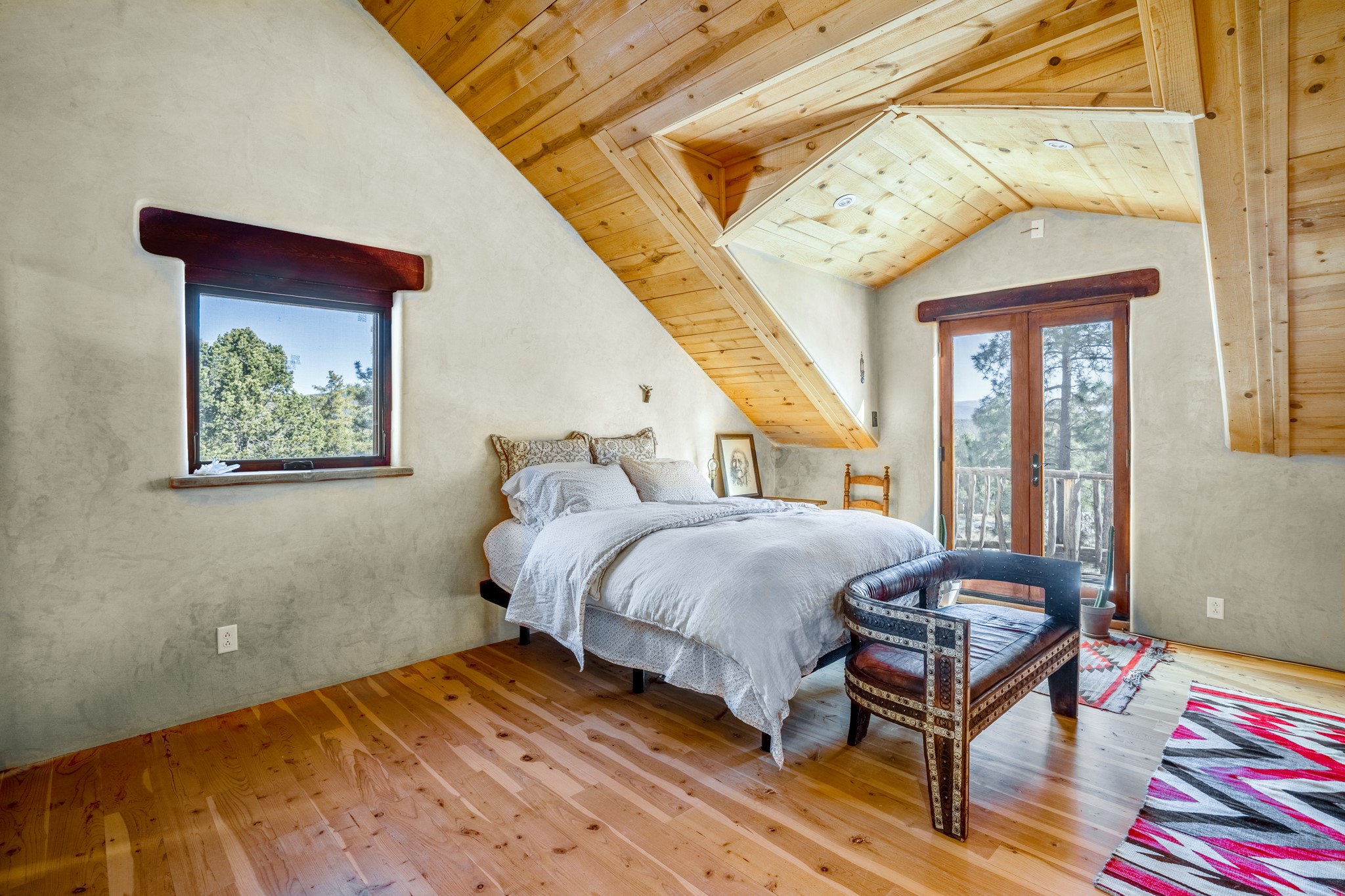 Exceptionally gorgeous custom built home on 12 1/2 acres adjoining 89,000 acres of Santa Fe National Forest with a trail, full horse facilities, full solar and a private well. Architectural features include Hand plastered natural American clay walls, 20 foot vaulted, pitched wood ceilings in the open living room, kitchen and dining. Gourmet cook's kitchen with farm sink, natural wood cabinetry and wood counters, La Puerta hand made Dutch doors, nichos, wood inlay, and restoration hardware light switches. Additional features include expansive upstairs and downstairs bedrooms; a primary bath with deep soaking clawfoot tub; Ensuite upstairs bath is plumbed and ready for fixtures. a bonus office loft, all wood and tile floors throughout with newer in floor radiant heat, A large mud room with utility, laundry (washer, dryer included); Expansive and deep wrap around portal with a kiva fireplace facing South and East. A 280 foot deep private well that produced 50+ gallons when drilled in 1993, wooden features (ceilings, loft window sills, kitchen countertops) made from trees harvested from the property that original owners cut, peeled and milled themselves, no HOA, and fully owned solar electrical system with ground array of 12 panels. (electric bill is $27 a month) The acreage is thriving with tall Ponderosa Pine, Fir, Pinon and Juniper trees, varied terrain, dramatic rock outcroppings, and fenced garden areas. For horses, goats, sheep or chickens, a 90'x90' arena, a 50' round pen, loafing shed, 2 fenced stalls, a covered hay shed and separate tack room. The Seller has shared riding trails from the home to the National Forest. Property is also zoned for a potential guest house, studio or ADU. This home is like no other with a focus on quality and aesthetics that is incomparable. Most "Casa Fina" furnishings may convey with an acceptable offer. bonus RV hook up on property too. also, In the esteemed Eldorado school district.