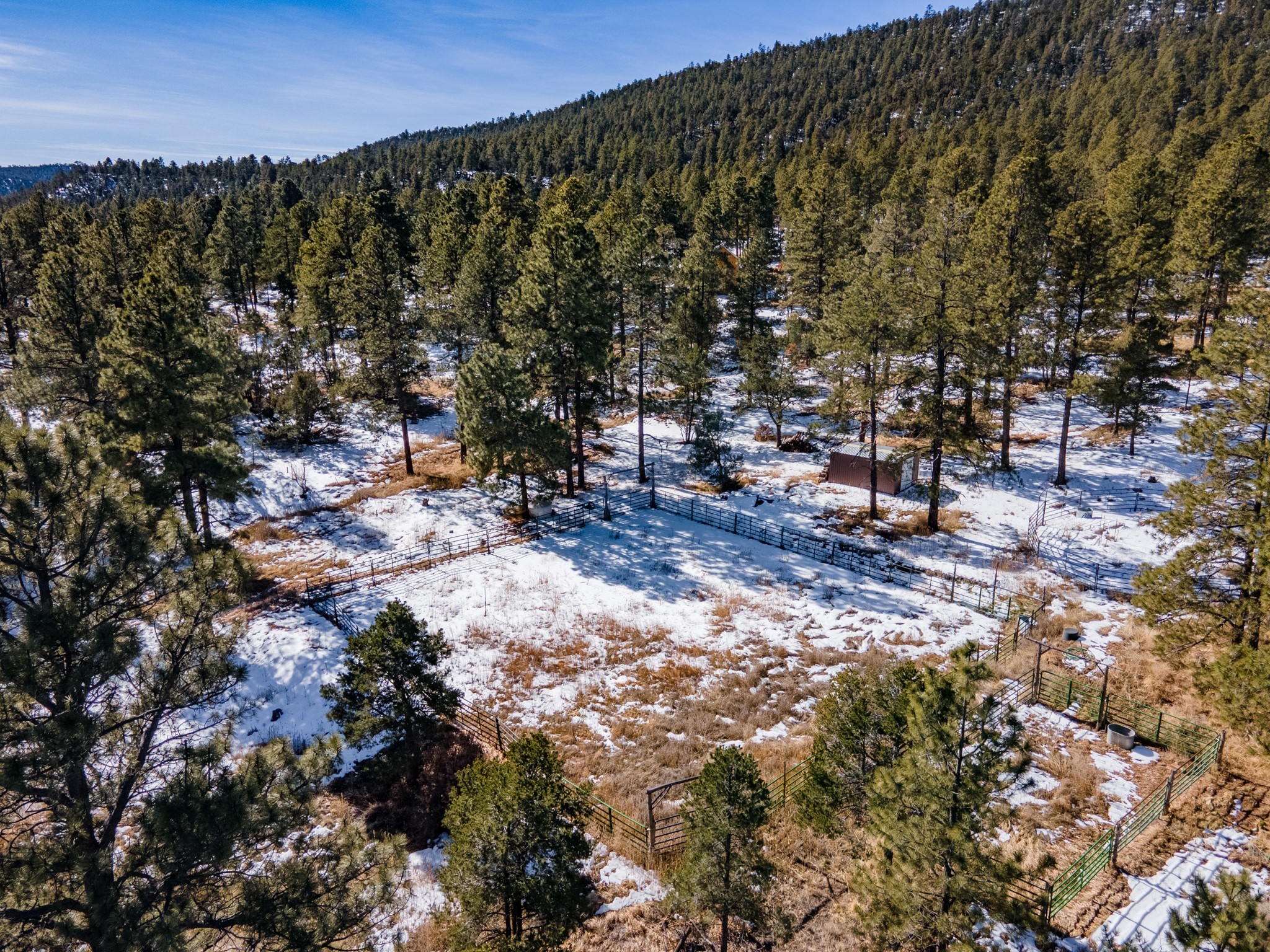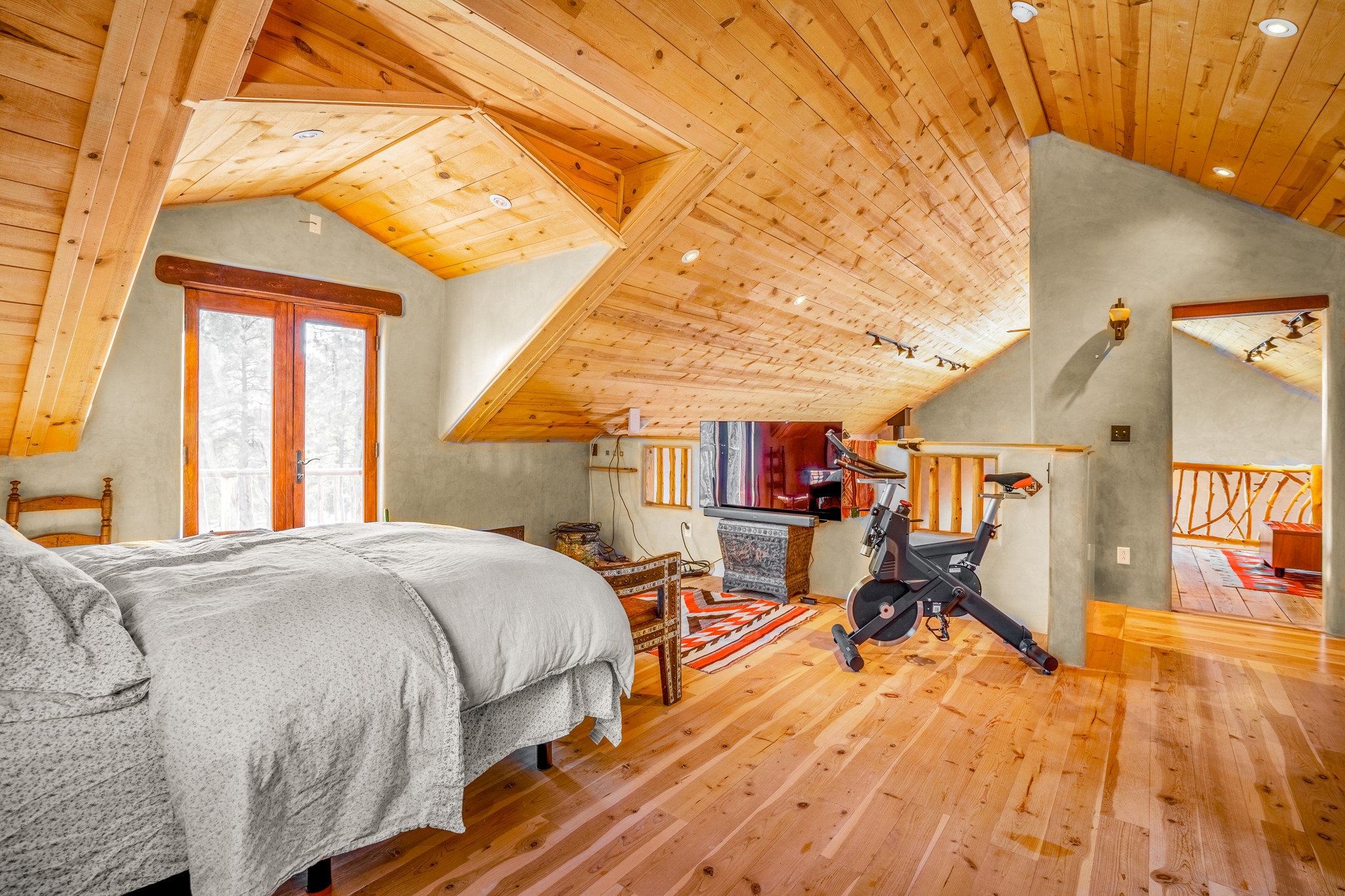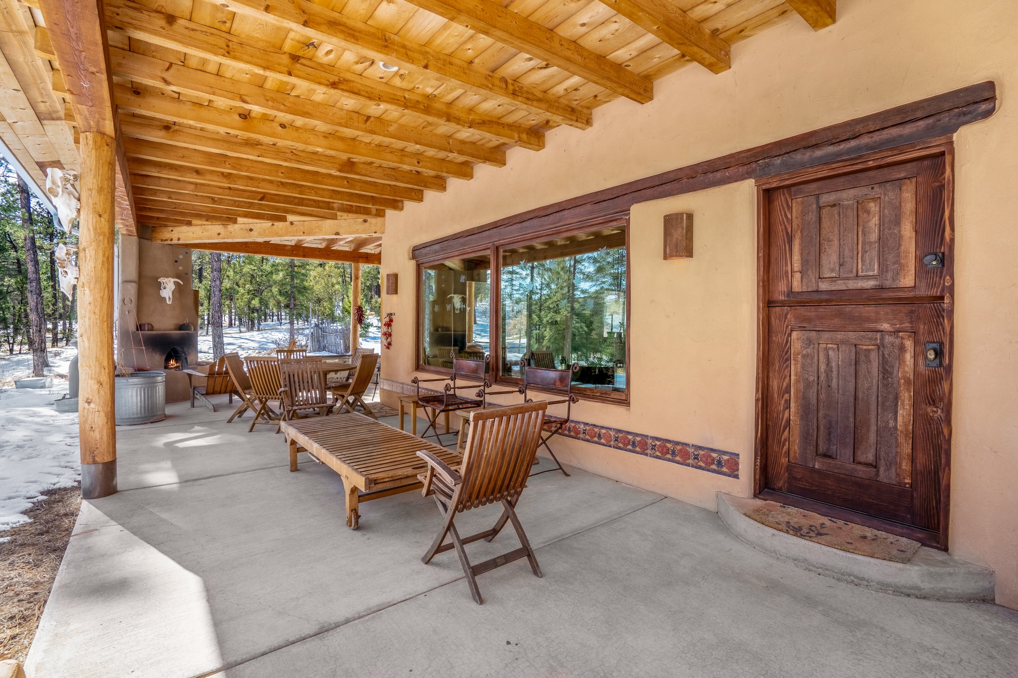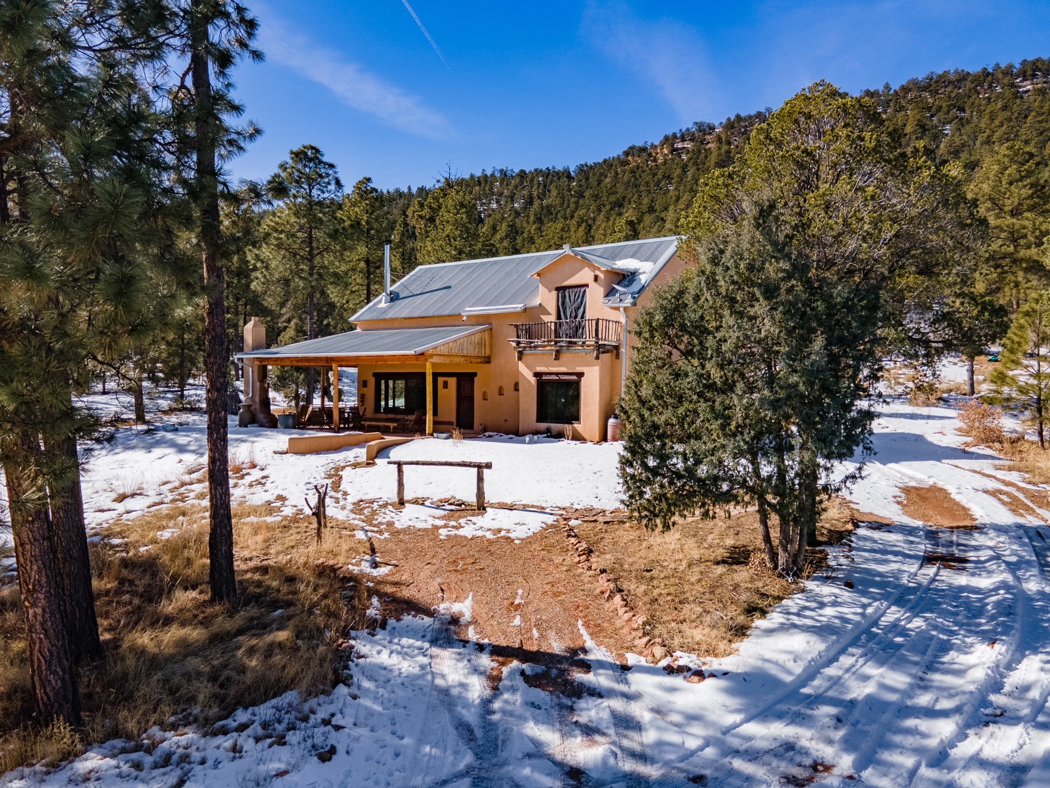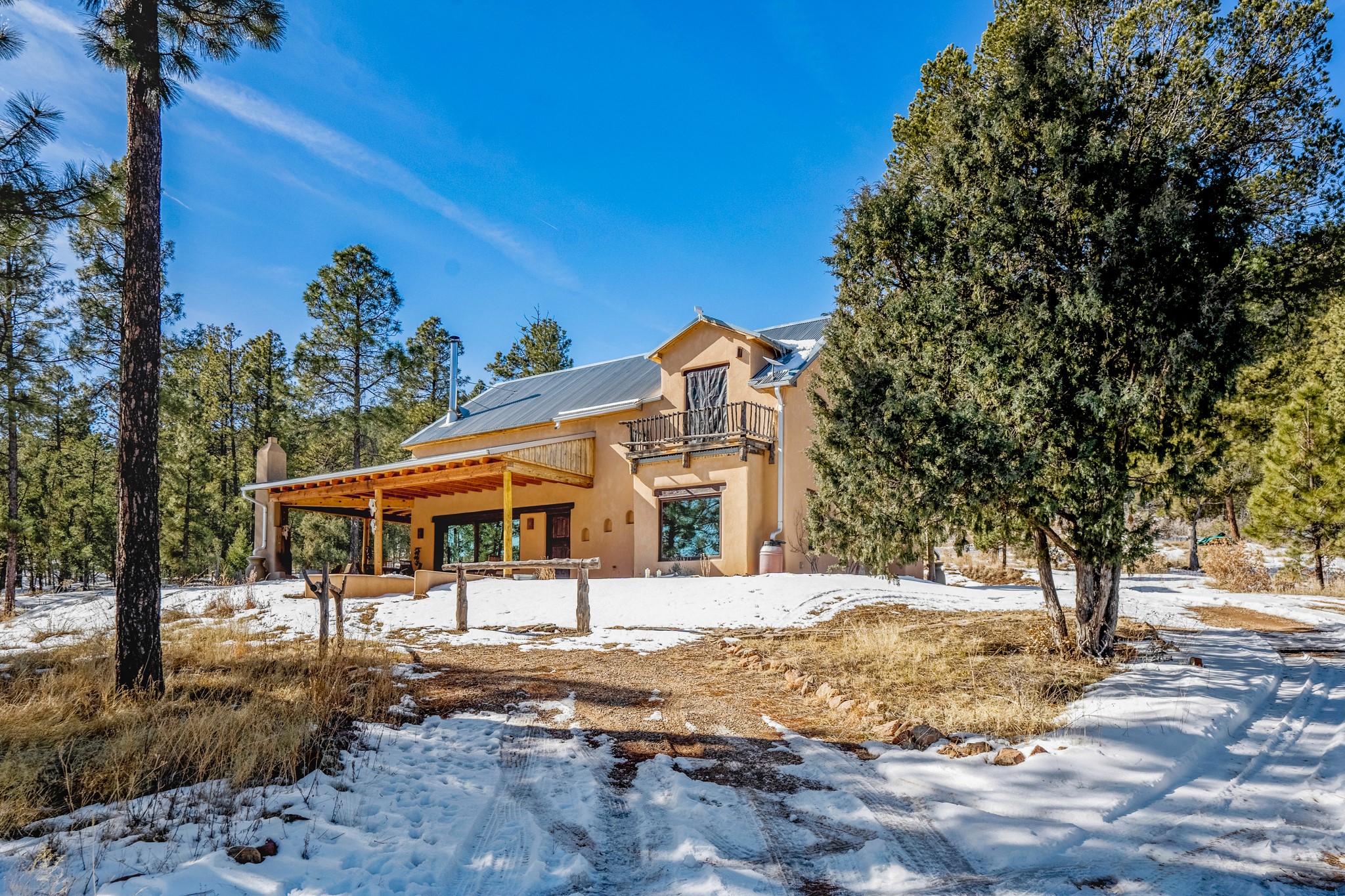 Exceptionally gorgeous custom built home on 12 1/2 acres adjoining 89,000 acres of Santa Fe National Forest with a trail, full horse facilities, full solar and a private well. Architectural features include Hand plastered natural American clay walls, 20 foot vaulted, pitched wood ceilings in the open living room, kitchen and dining. Gourmet cook's kitchen with farm sink, natural wood cabinetry and wood counters, La Puerta hand made Dutch doors, nichos, wood inlay, and restoration hardware light switches. Additional features include expansive upstairs and downstairs bedrooms; a primary bath with deep soaking clawfoot tub; Ensuite upstairs bath is plumbed and ready for fixtures. a bonus office loft, all wood and tile floors throughout with newer in floor radiant heat, A large mud room with utility, laundry (washer, dryer included); Expansive and deep wrap around portal with a kiva fireplace facing South and East. A 280 foot deep private well that produced 50+ gallons when drilled in 1993, wooden features (ceilings, loft window sills, kitchen countertops) made from trees harvested from the property that original owners cut, peeled and milled themselves, no HOA, and fully owned solar electrical system with ground array of 12 panels. (electric bill is $27 a month) The acreage is thriving with tall Ponderosa Pine, Fir, Pinon and Juniper trees, varied terrain, dramatic rock outcroppings, and fenced garden areas. For horses, goats, sheep or chickens, a 90'x90' arena, a 50' round pen, loafing shed, 2 fenced stalls, a covered hay shed and separate tack room. The Seller has shared riding trails from the home to the National Forest. Property is also zoned for a potential guest house, studio or ADU. This home is like no other with a focus on quality and aesthetics that is incomparable. Most "Casa Fina" furnishings may convey with an acceptable offer. bonus RV hook up on property too. also, In the esteemed Eldorado school district.