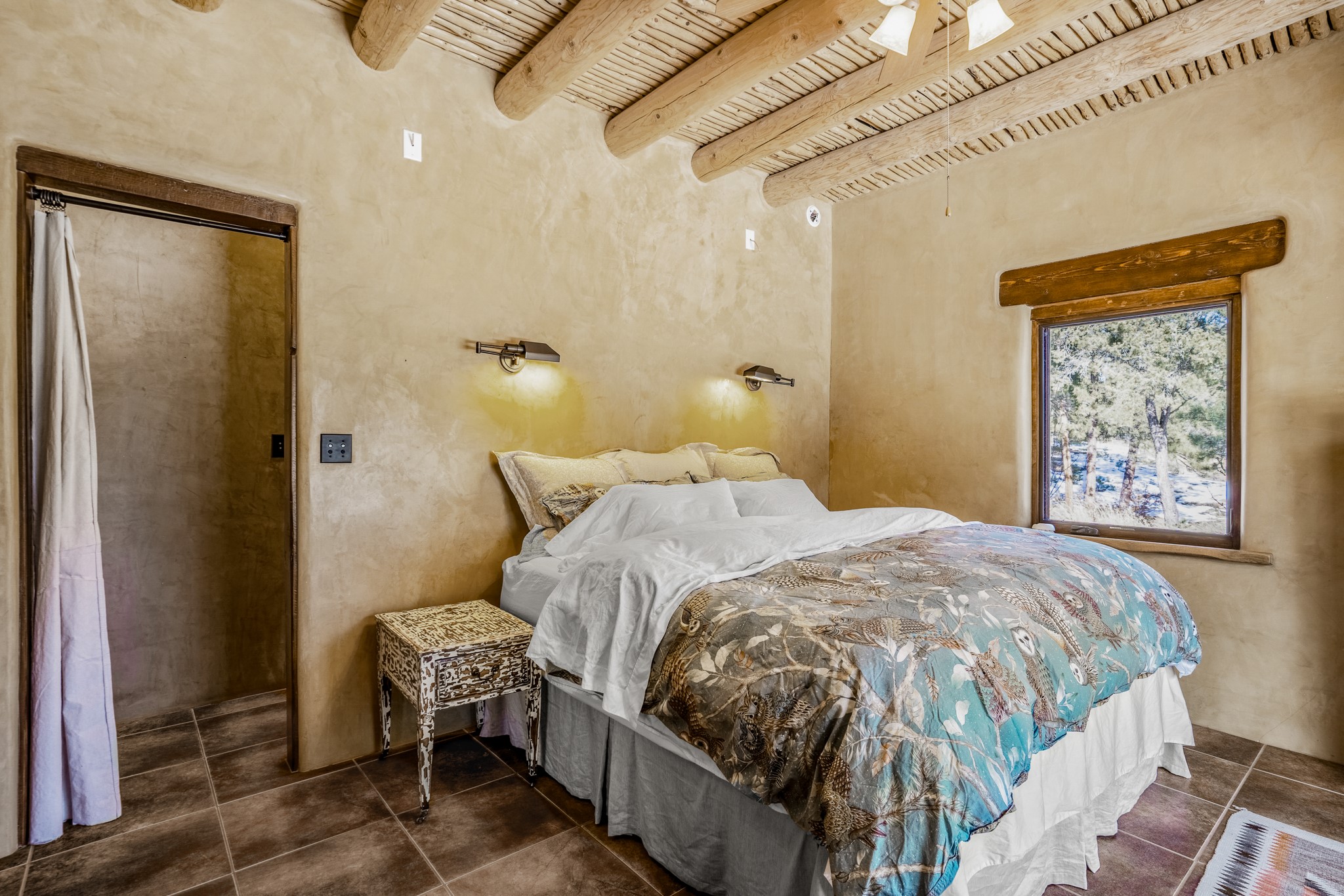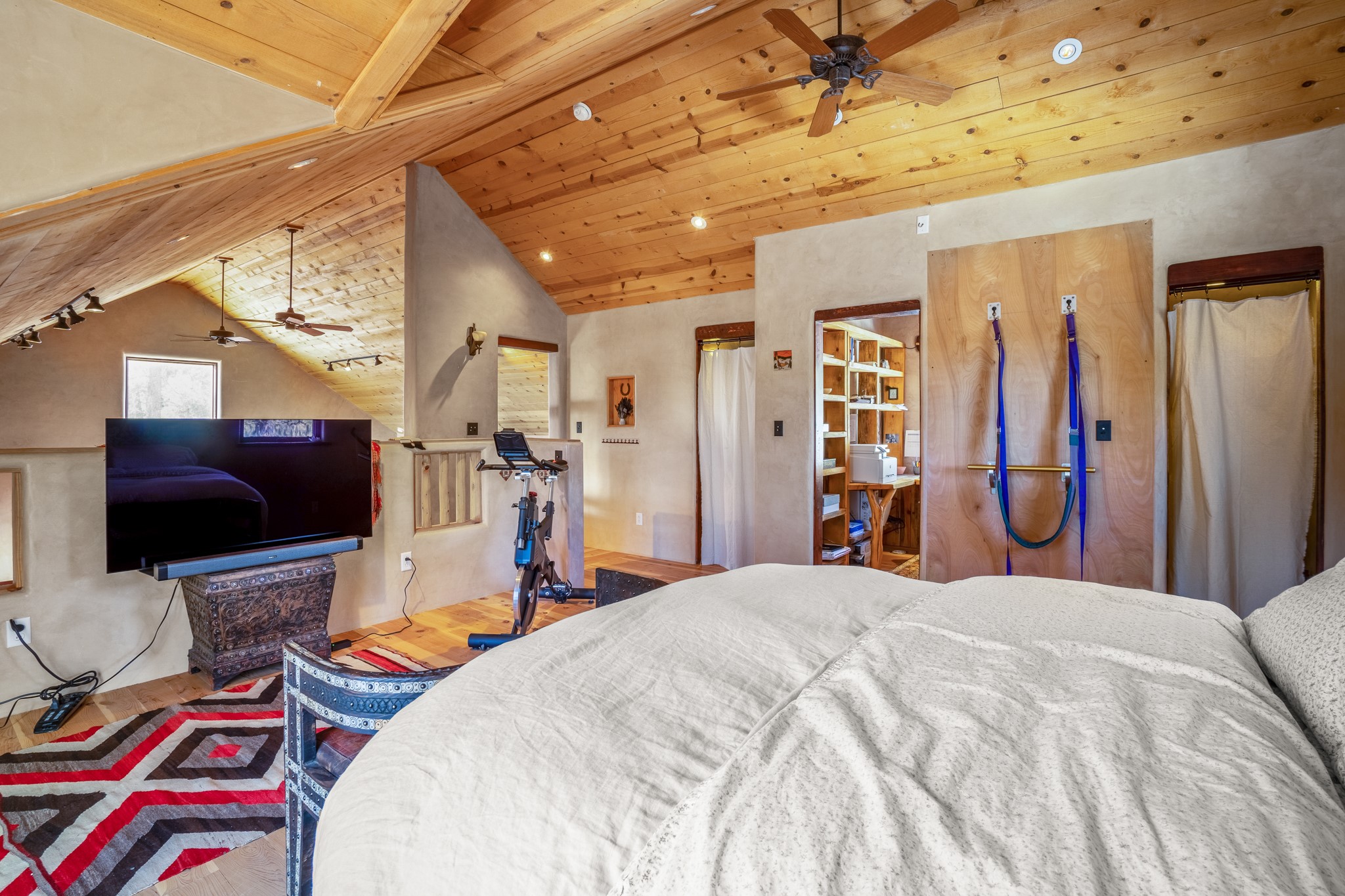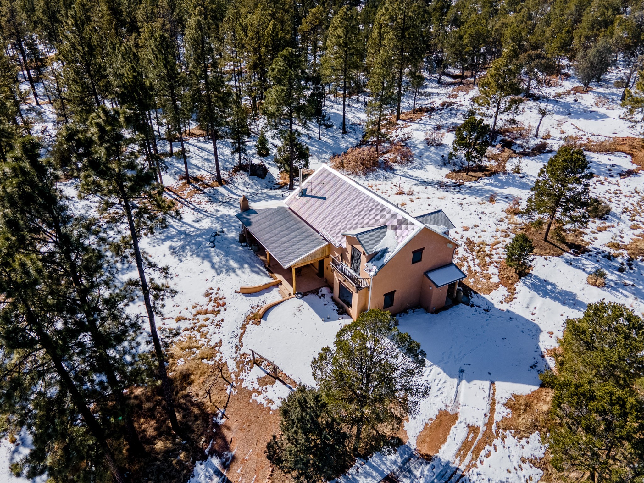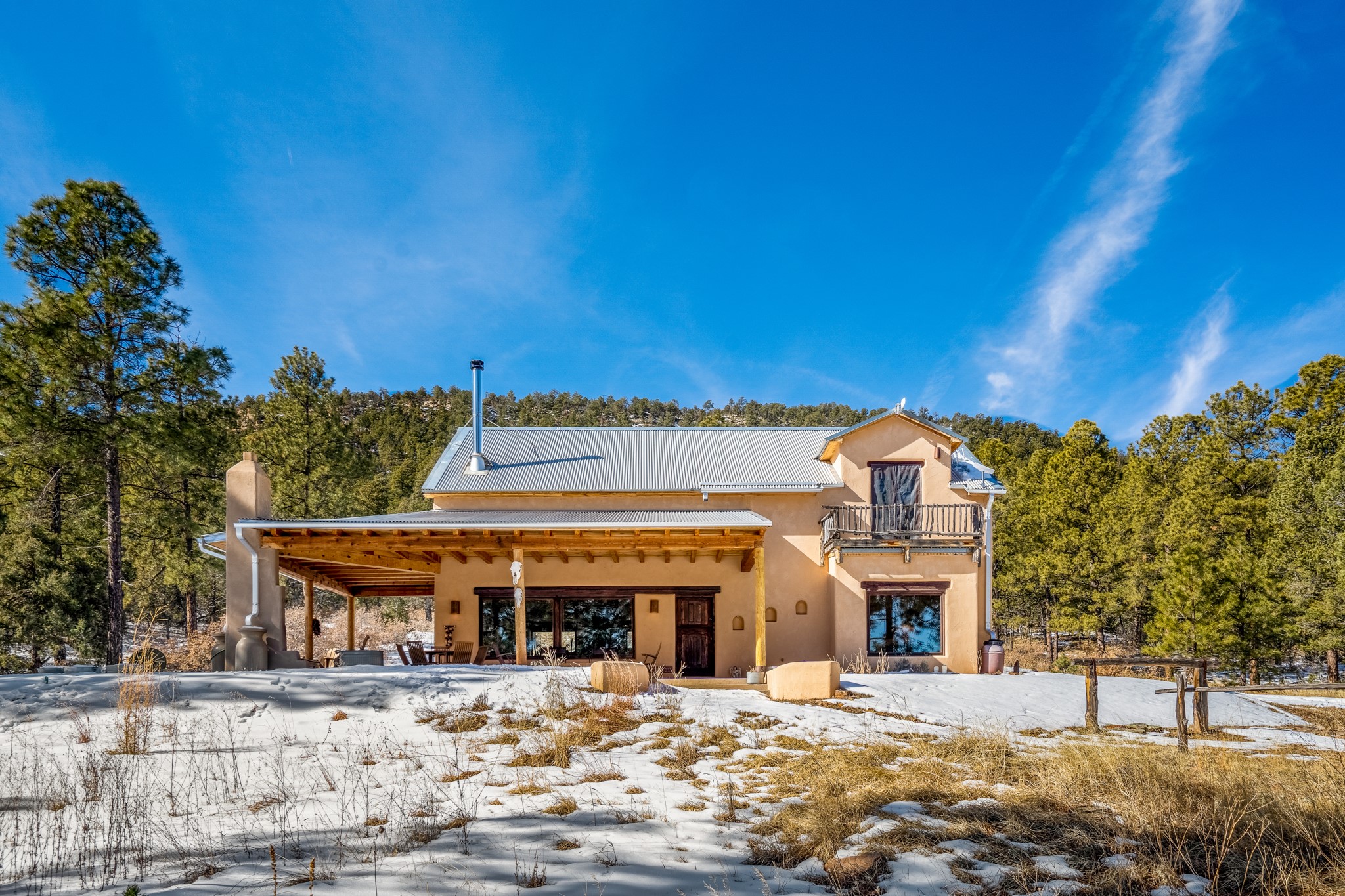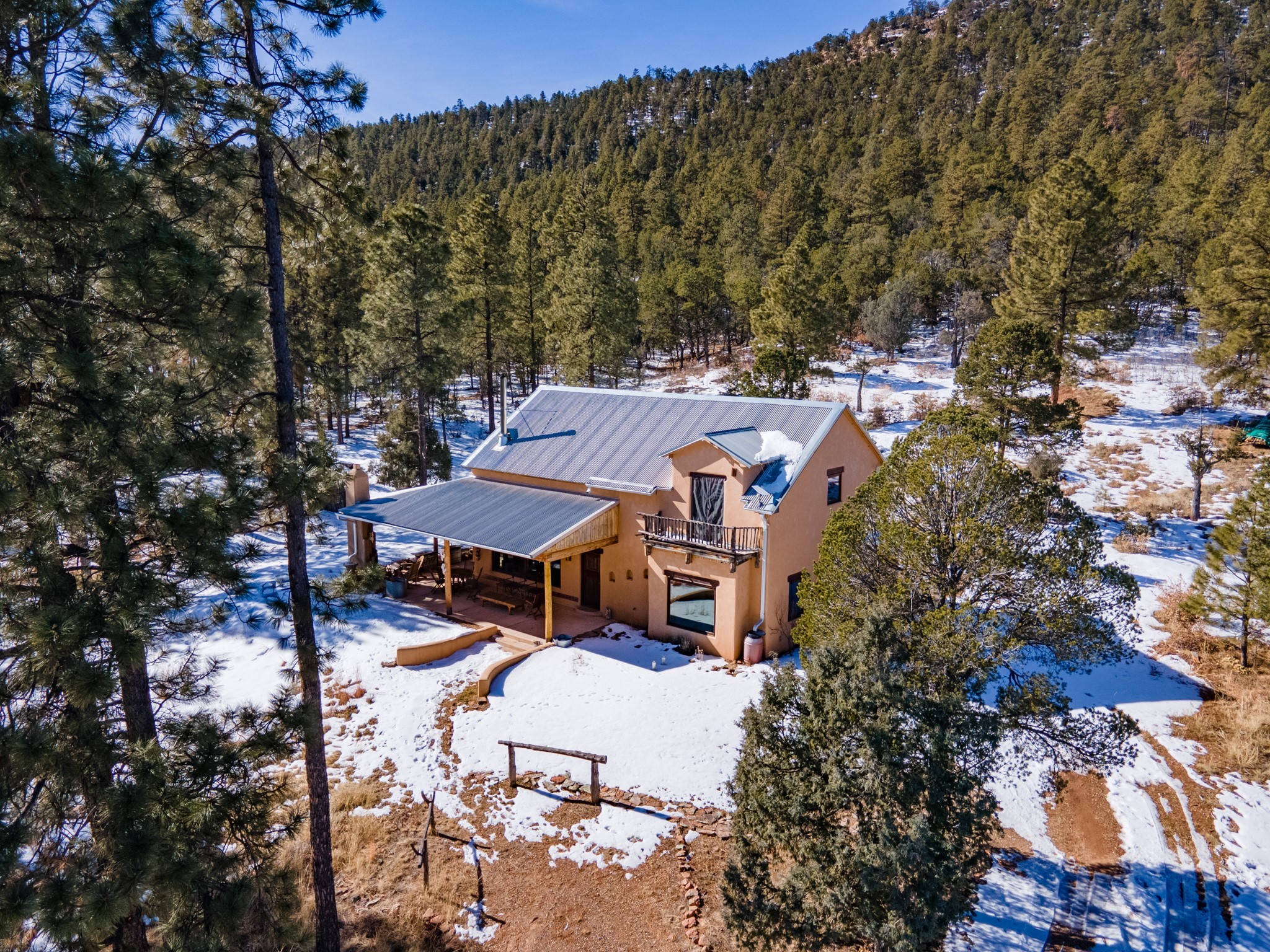 Exceptionally gorgeous custom built home on 12 1/2 acres adjoining 89,000 acres of Santa Fe National Forest with a trail, full horse facilities, full solar and a private well. Architectural features include Hand plastered natural American clay walls, 20 foot vaulted, pitched wood ceilings in the open living room, kitchen and dining. Gourmet cook's kitchen with farm sink, natural wood cabinetry and wood counters, La Puerta hand made Dutch doors, nichos, wood inlay, and restoration hardware light switches. Additional features include expansive upstairs and downstairs bedrooms; a primary bath with deep soaking clawfoot tub; Ensuite upstairs bath is plumbed and ready for fixtures. a bonus office loft, all wood and tile floors throughout with newer in floor radiant heat, A large mud room with utility, laundry (washer, dryer included); Expansive and deep wrap around portal with a kiva fireplace facing South and East. A 280 foot deep private well that produced 50+ gallons when drilled in 1993, wooden features (ceilings, loft window sills, kitchen countertops) made from trees harvested from the property that original owners cut, peeled and milled themselves, no HOA, and fully owned solar electrical system with ground array of 12 panels. (electric bill is $27 a month) The acreage is thriving with tall Ponderosa Pine, Fir, Pinon and Juniper trees, varied terrain, dramatic rock outcroppings, and fenced garden areas. For horses, goats, sheep or chickens, a 90'x90' arena, a 50' round pen, loafing shed, 2 fenced stalls, a covered hay shed and separate tack room. The Seller has shared riding trails from the home to the National Forest. Property is also zoned for a potential guest house, studio or ADU. This home is like no other with a focus on quality and aesthetics that is incomparable. Most "Casa Fina" furnishings may convey with an acceptable offer. bonus RV hook up on property too. also, In the esteemed Eldorado school district.