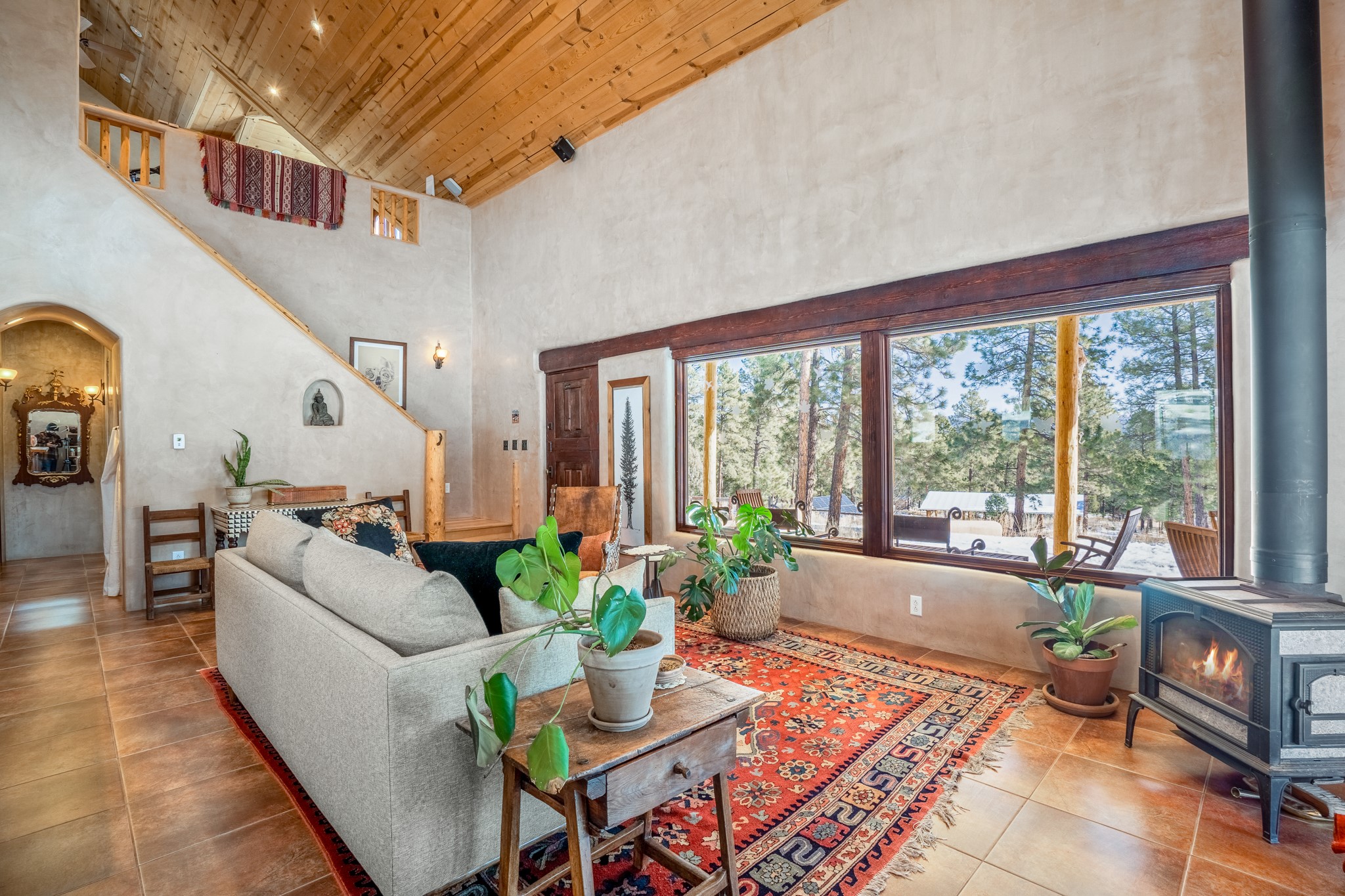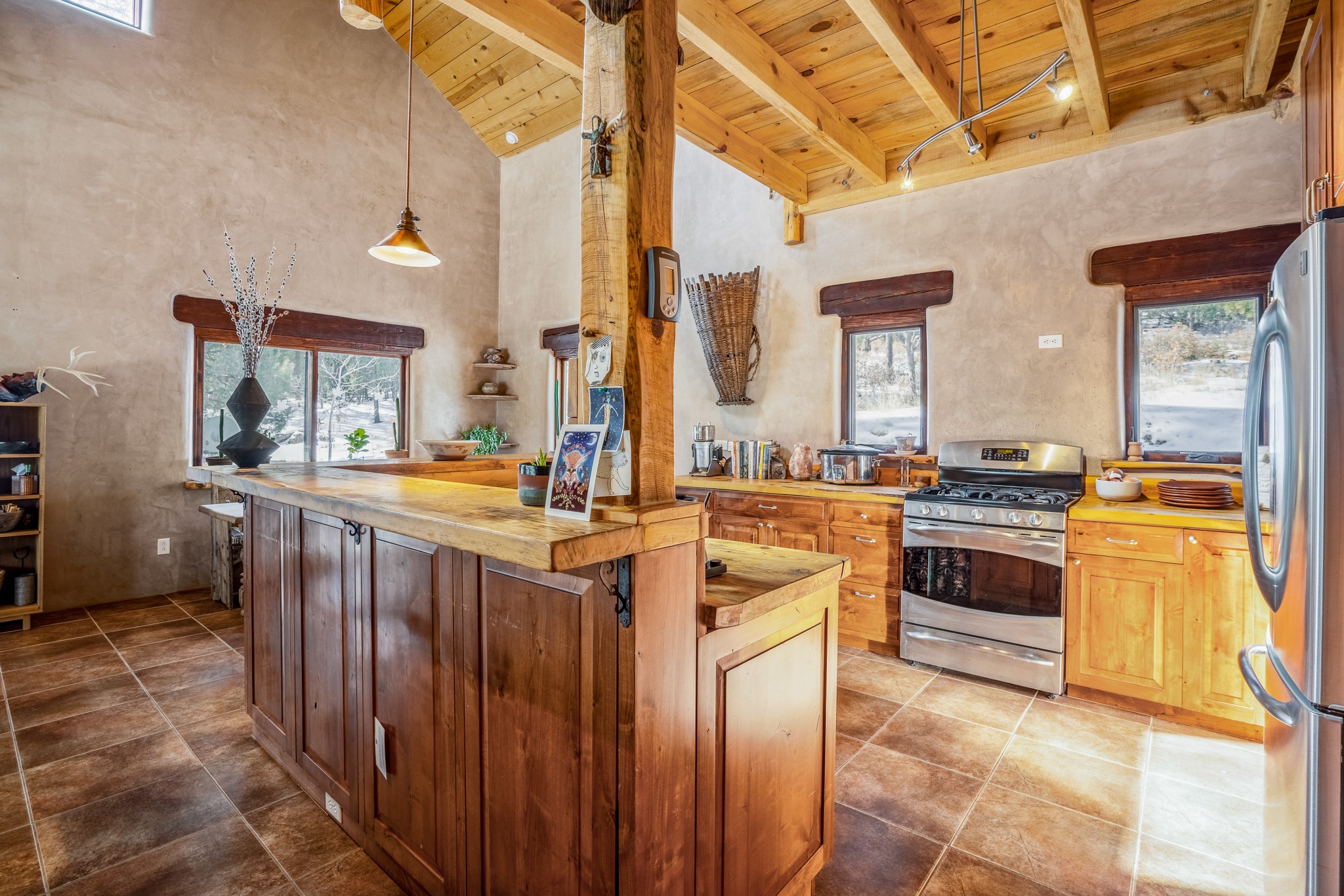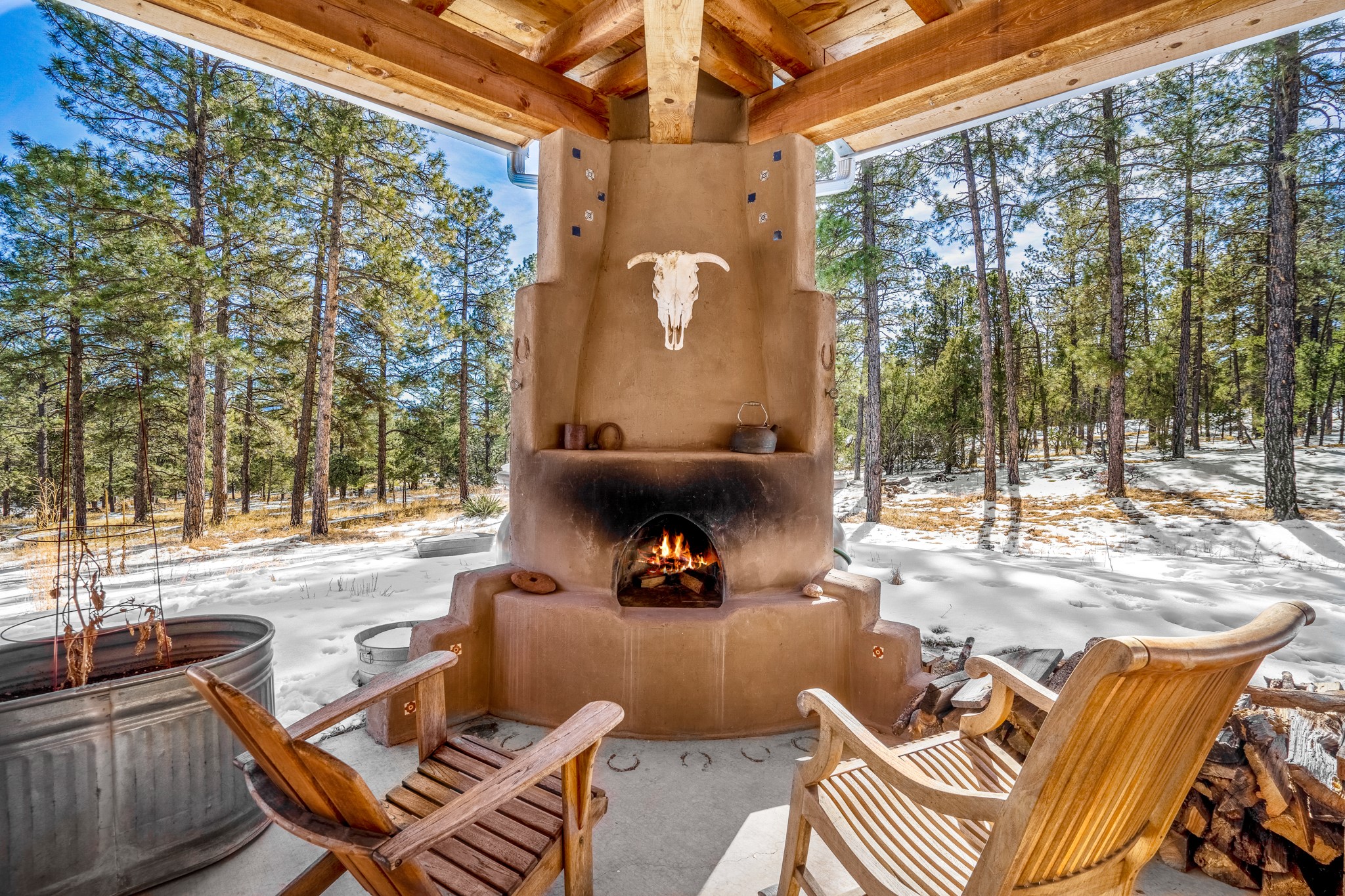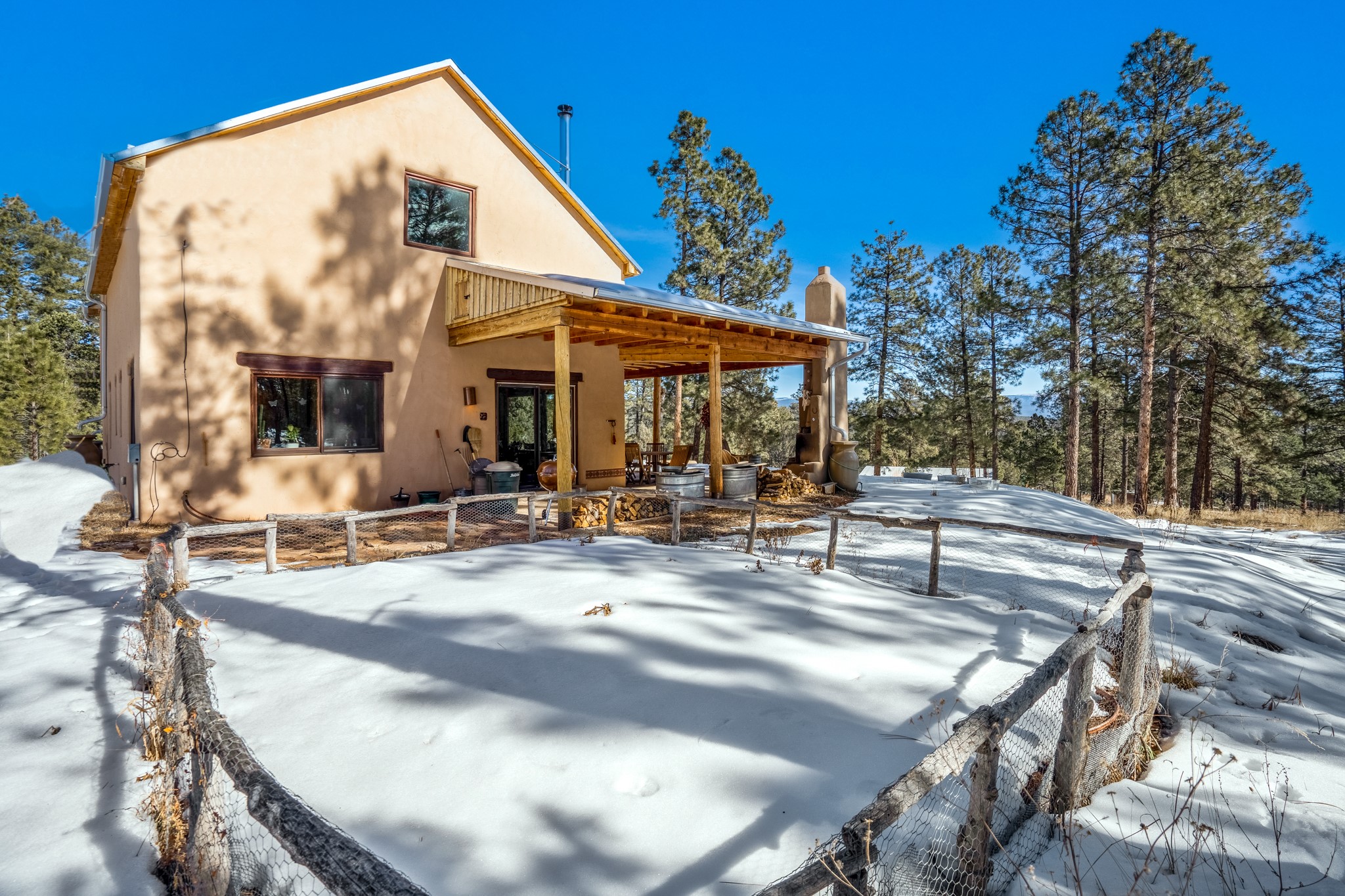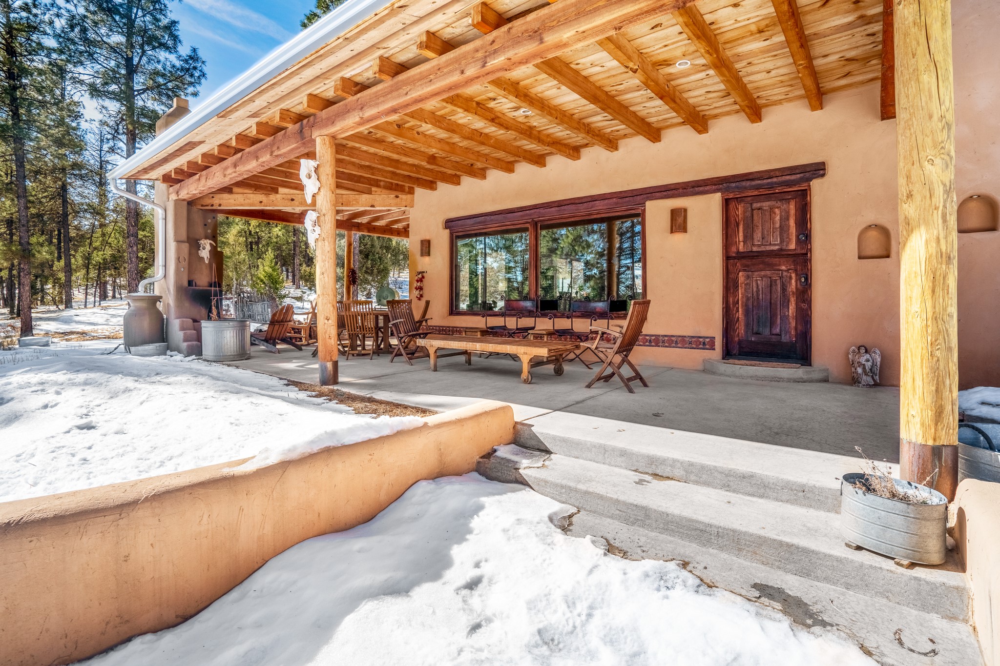 Exceptionally gorgeous custom built home on 12 1/2 acres adjoining 89,000 acres of Santa Fe National Forest with a trail, full horse facilities, full solar and a private well. Architectural features include Hand plastered natural American clay walls, 20 foot vaulted, pitched wood ceilings in the open living room, kitchen and dining. Gourmet cook's kitchen with farm sink, natural wood cabinetry and wood counters, La Puerta hand made Dutch doors, nichos, wood inlay, and restoration hardware light switches. Additional features include expansive upstairs and downstairs bedrooms; a primary bath with deep soaking clawfoot tub; Ensuite upstairs bath is plumbed and ready for fixtures. a bonus office loft, all wood and tile floors throughout with newer in floor radiant heat, A large mud room with utility, laundry (washer, dryer included); Expansive and deep wrap around portal with a kiva fireplace facing South and East. A 280 foot deep private well that produced 50+ gallons when drilled in 1993, wooden features (ceilings, loft window sills, kitchen countertops) made from trees harvested from the property that original owners cut, peeled and milled themselves, no HOA, and fully owned solar electrical system with ground array of 12 panels. (electric bill is $27 a month) The acreage is thriving with tall Ponderosa Pine, Fir, Pinon and Juniper trees, varied terrain, dramatic rock outcroppings, and fenced garden areas. For horses, goats, sheep or chickens, a 90'x90' arena, a 50' round pen, loafing shed, 2 fenced stalls, a covered hay shed and separate tack room. The Seller has shared riding trails from the home to the National Forest. Property is also zoned for a potential guest house, studio or ADU. This home is like no other with a focus on quality and aesthetics that is incomparable. Most "Casa Fina" furnishings may convey with an acceptable offer. bonus RV hook up on property too. also, In the esteemed Eldorado school district.