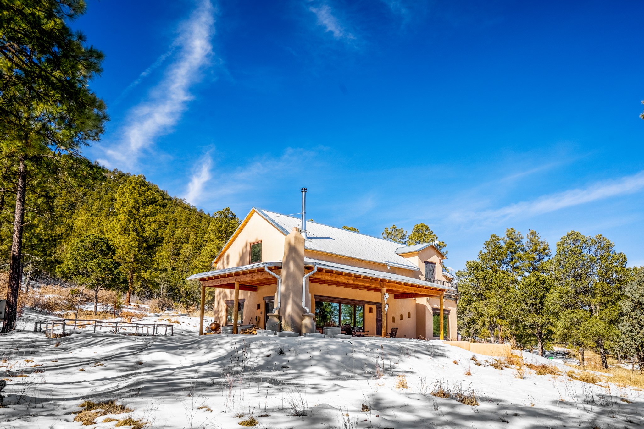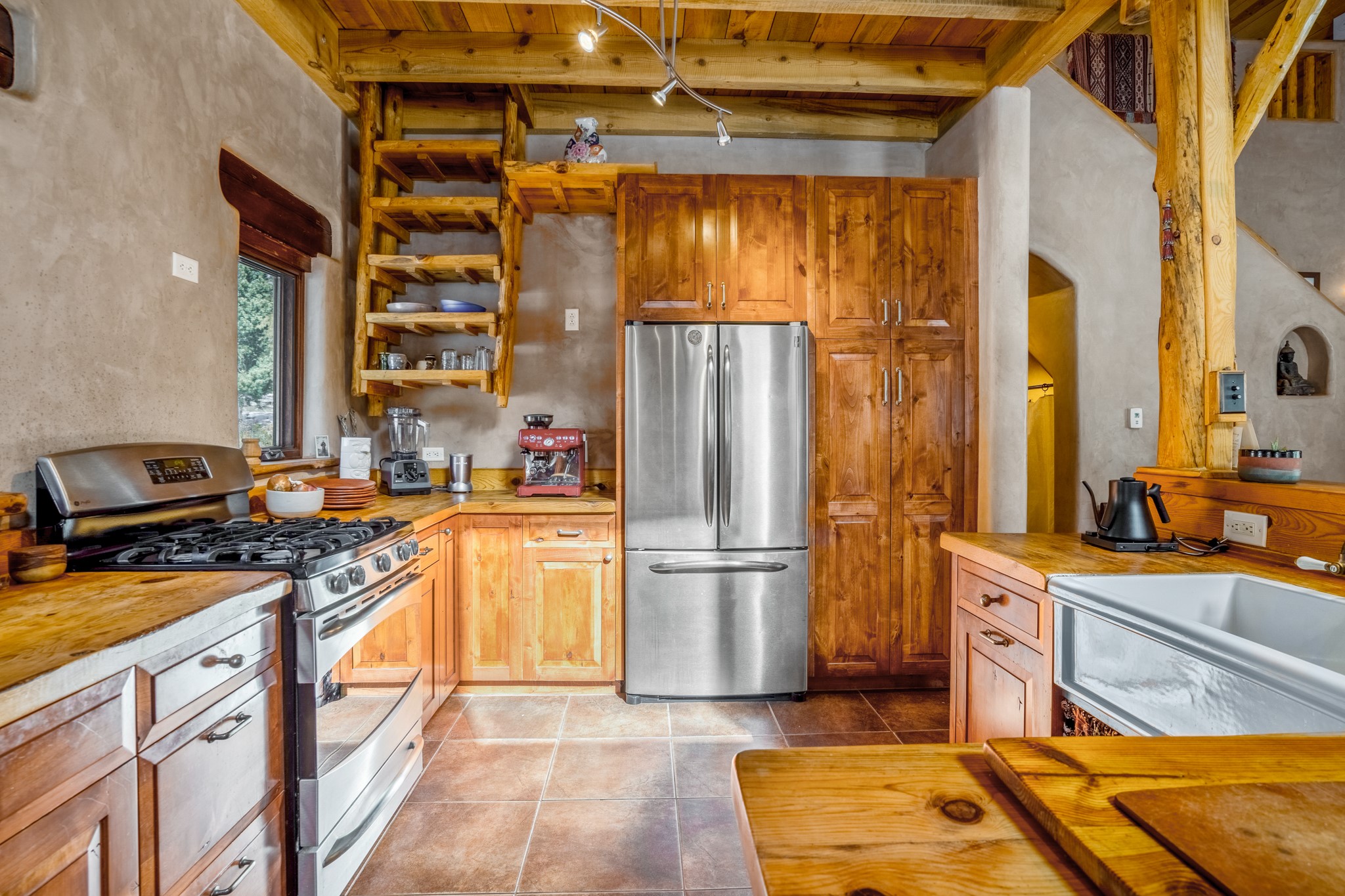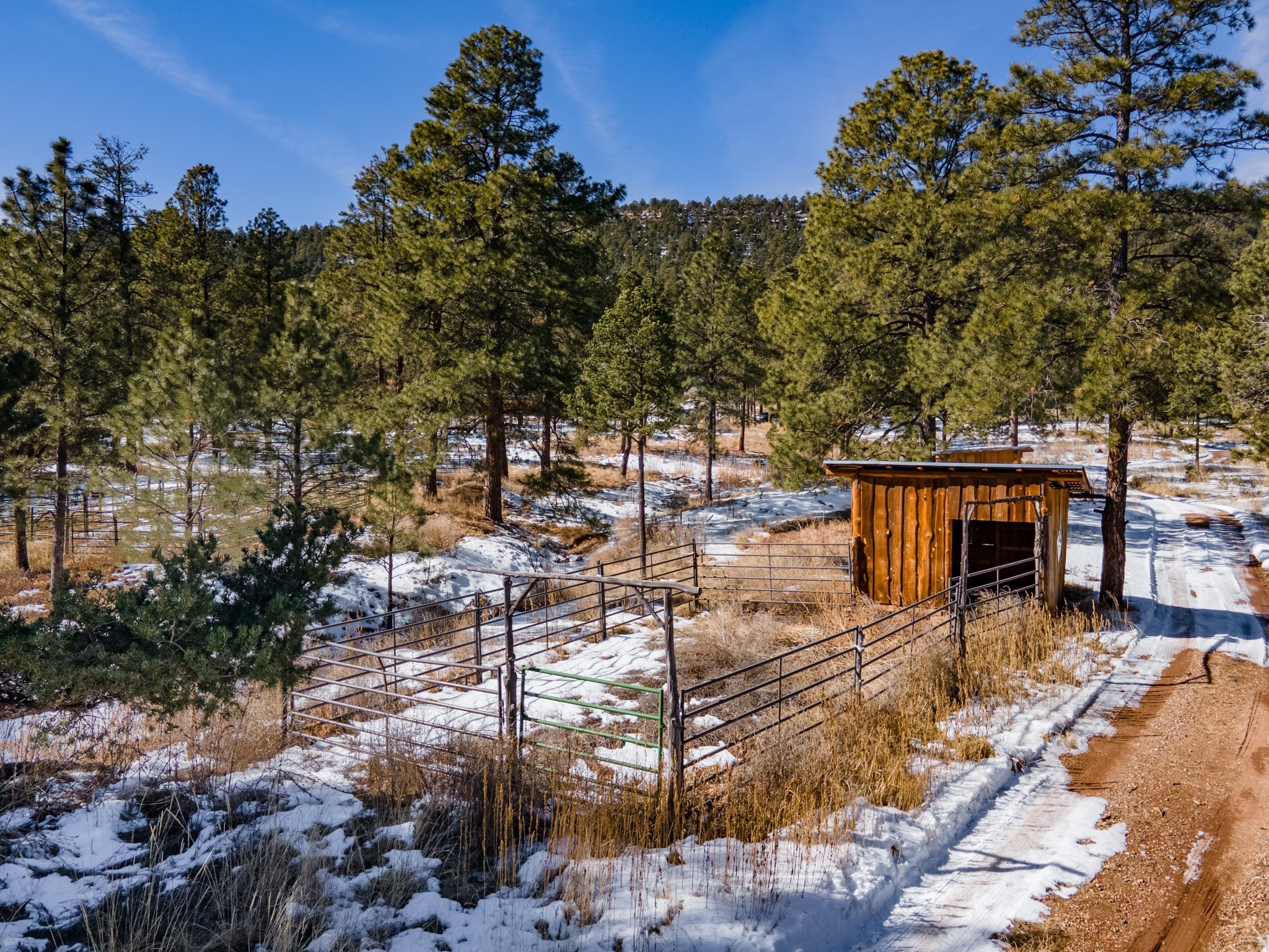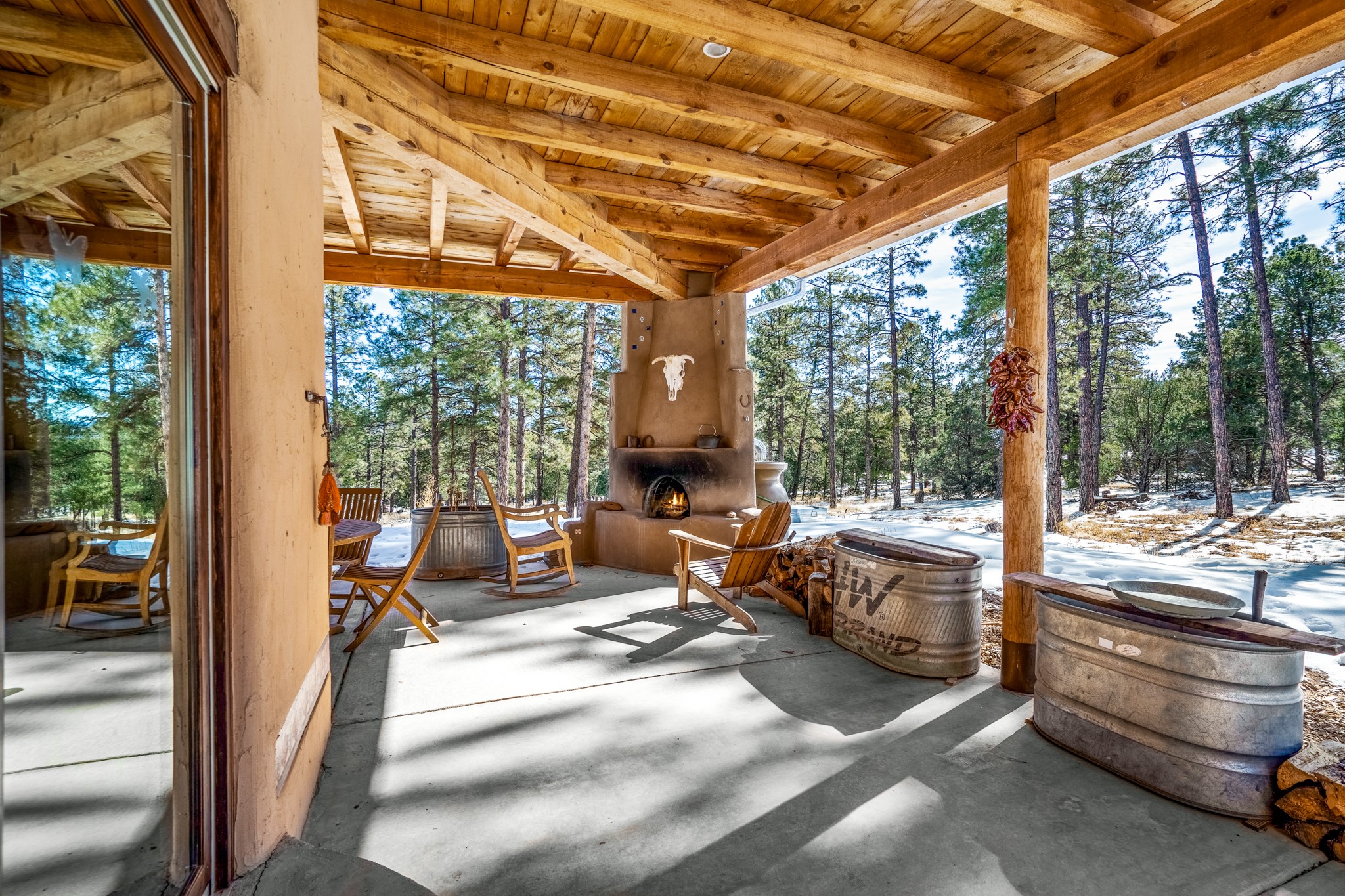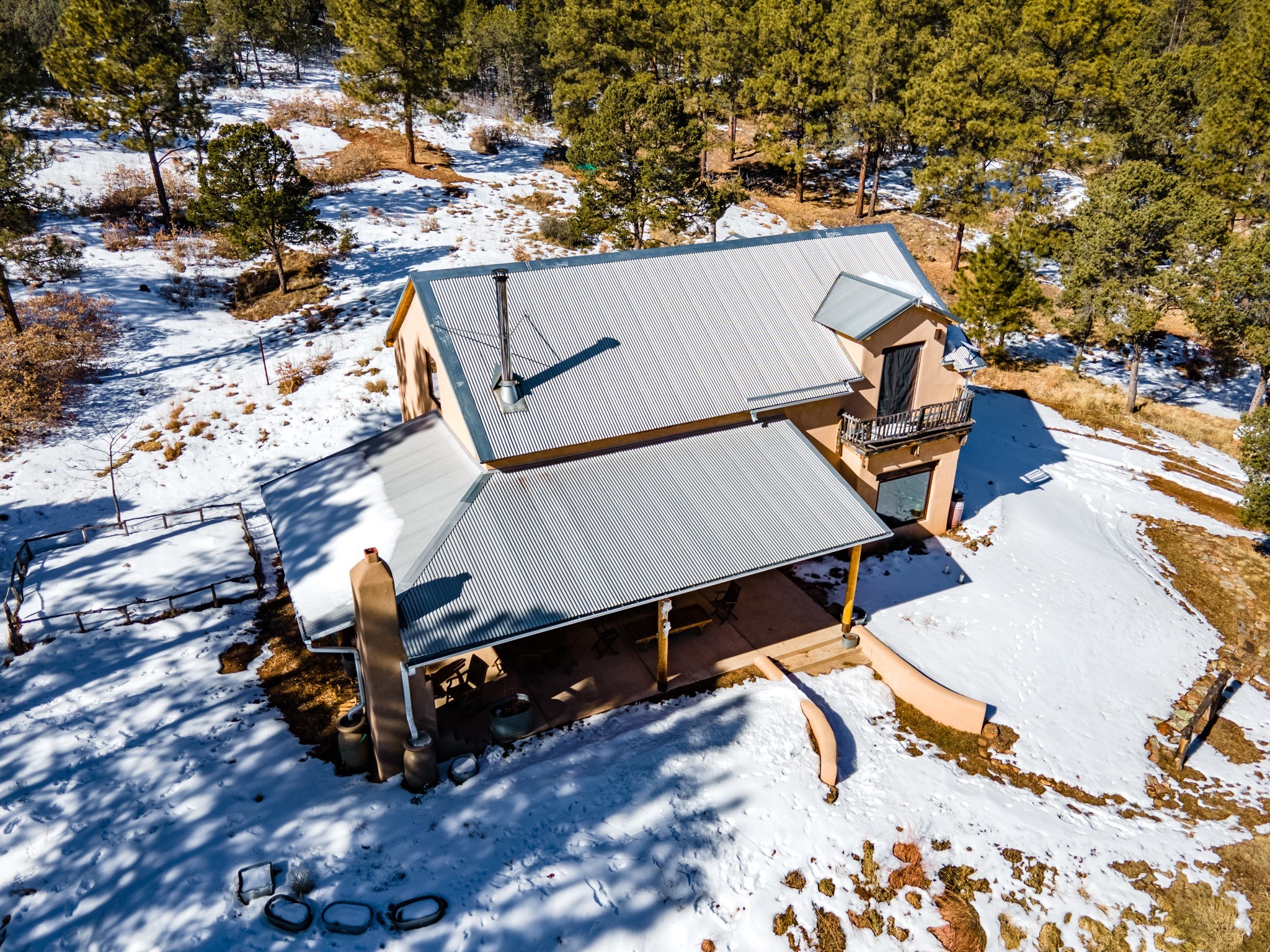 Exceptionally gorgeous custom built home on 12 1/2 acres adjoining 89,000 acres of Santa Fe National Forest with a trail, full horse facilities, full solar and a private well. Architectural features include Hand plastered natural American clay walls, 20 foot vaulted, pitched wood ceilings in the open living room, kitchen and dining. Gourmet cook's kitchen with farm sink, natural wood cabinetry and wood counters, La Puerta hand made Dutch doors, nichos, wood inlay, and restoration hardware light switches. Additional features include expansive upstairs and downstairs bedrooms; a primary bath with deep soaking clawfoot tub; Ensuite upstairs bath is plumbed and ready for fixtures. a bonus office loft, all wood and tile floors throughout with newer in floor radiant heat, A large mud room with utility, laundry (washer, dryer included); Expansive and deep wrap around portal with a kiva fireplace facing South and East. A 280 foot deep private well that produced 50+ gallons when drilled in 1993, wooden features (ceilings, loft window sills, kitchen countertops) made from trees harvested from the property that original owners cut, peeled and milled themselves, no HOA, and fully owned solar electrical system with ground array of 12 panels. (electric bill is $27 a month) The acreage is thriving with tall Ponderosa Pine, Fir, Pinon and Juniper trees, varied terrain, dramatic rock outcroppings, and fenced garden areas. For horses, goats, sheep or chickens, a 90'x90' arena, a 50' round pen, loafing shed, 2 fenced stalls, a covered hay shed and separate tack room. The Seller has shared riding trails from the home to the National Forest. Property is also zoned for a potential guest house, studio or ADU. This home is like no other with a focus on quality and aesthetics that is incomparable. Most "Casa Fina" furnishings may convey with an acceptable offer. bonus RV hook up on property too. also, In the esteemed Eldorado school district.
