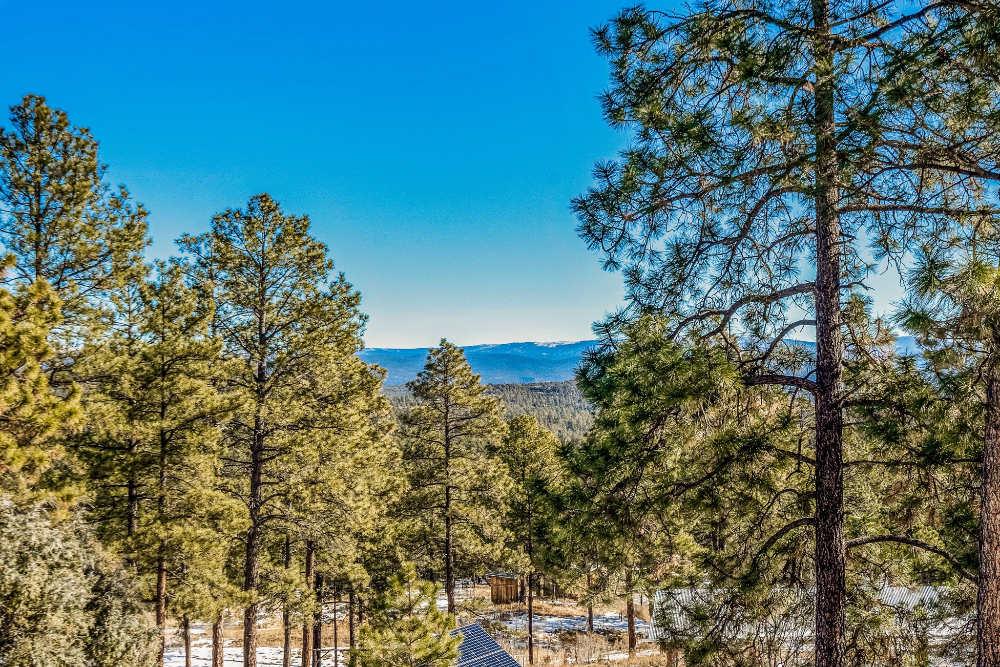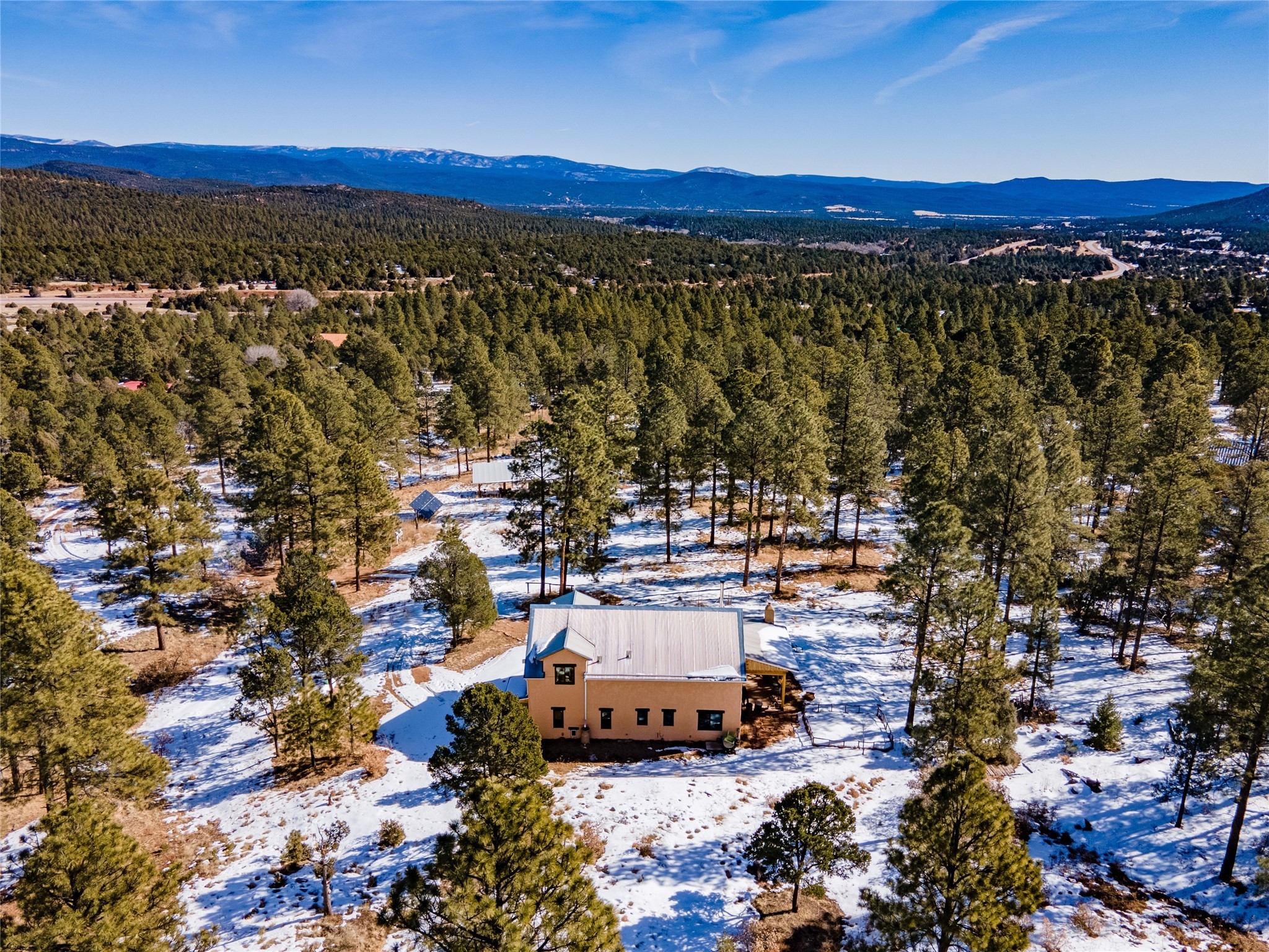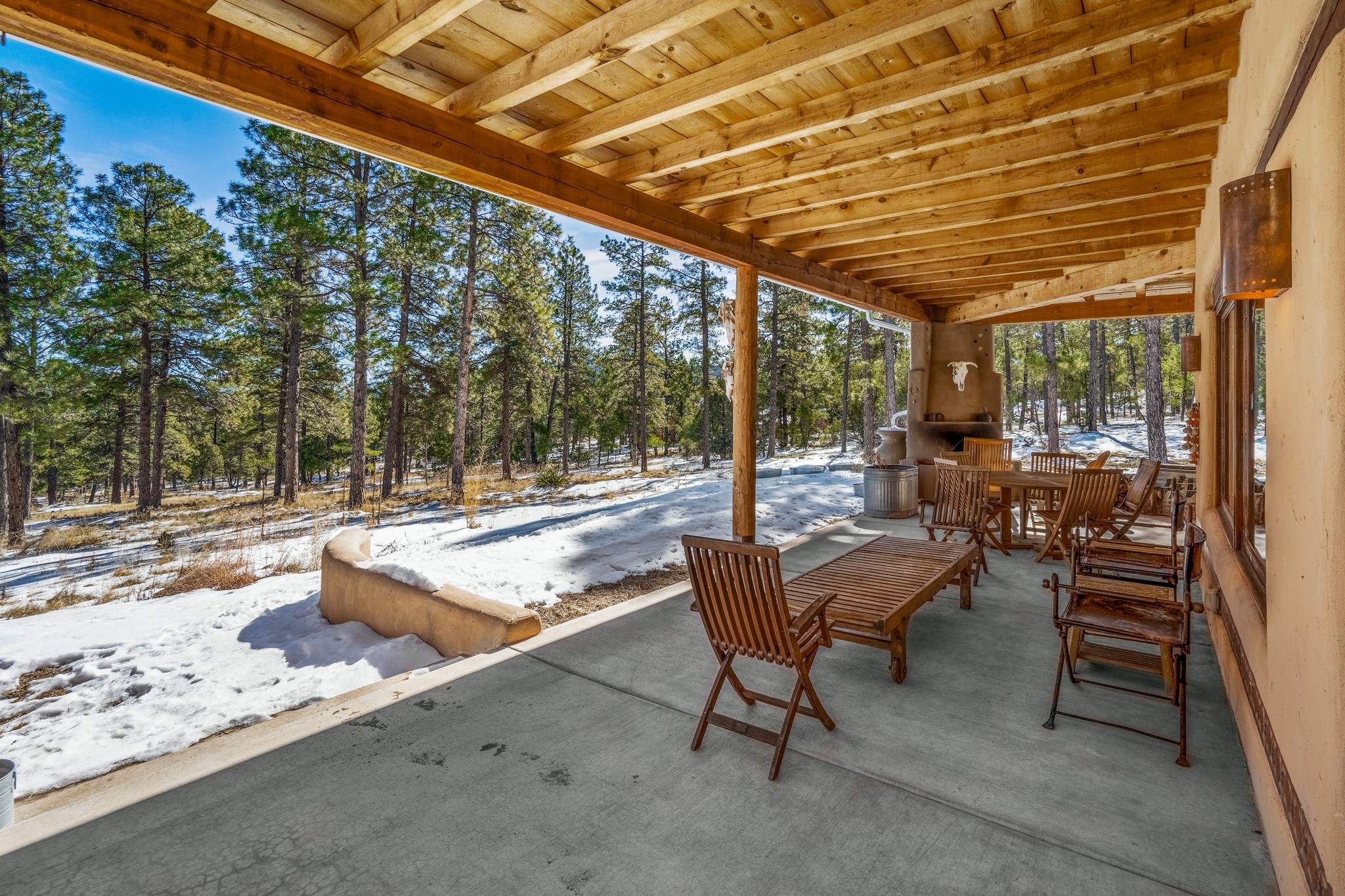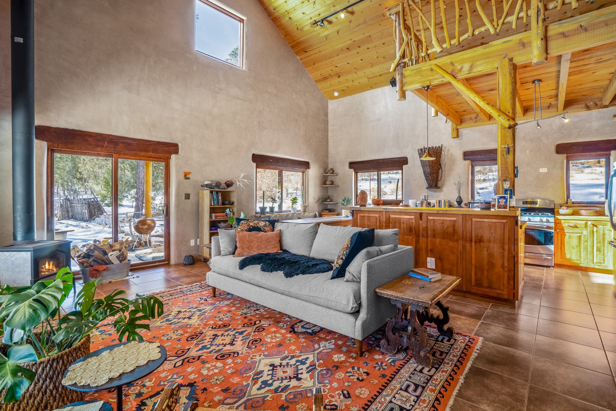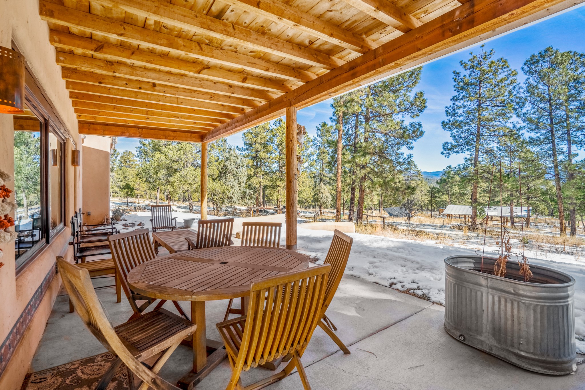 Exceptionally gorgeous custom built home on 12 1/2 acres adjoining 89,000 acres of Santa Fe National Forest with a trail, full horse facilities, full solar and a private well. Architectural features include Hand plastered natural American clay walls, 20 foot vaulted, pitched wood ceilings in the open living room, kitchen and dining. Gourmet cook's kitchen with farm sink, natural wood cabinetry and wood counters, La Puerta hand made Dutch doors, nichos, wood inlay, and restoration hardware light switches. Additional features include expansive upstairs and downstairs bedrooms; a primary bath with deep soaking clawfoot tub; Ensuite upstairs bath is plumbed and ready for fixtures. a bonus office loft, all wood and tile floors throughout with newer in floor radiant heat, A large mud room with utility, laundry (washer, dryer included); Expansive and deep wrap around portal with a kiva fireplace facing South and East. A 280 foot deep private well that produced 50+ gallons when drilled in 1993, wooden features (ceilings, loft window sills, kitchen countertops) made from trees harvested from the property that original owners cut, peeled and milled themselves, no HOA, and fully owned solar electrical system with ground array of 12 panels. (electric bill is $27 a month) The acreage is thriving with tall Ponderosa Pine, Fir, Pinon and Juniper trees, varied terrain, dramatic rock outcroppings, and fenced garden areas. For horses, goats, sheep or chickens, a 90'x90' arena, a 50' round pen, loafing shed, 2 fenced stalls, a covered hay shed and separate tack room. The Seller has shared riding trails from the home to the National Forest. Property is also zoned for a potential guest house, studio or ADU. This home is like no other with a focus on quality and aesthetics that is incomparable. Most "Casa Fina" furnishings may convey with an acceptable offer. bonus RV hook up on property too. also, In the esteemed Eldorado school district.