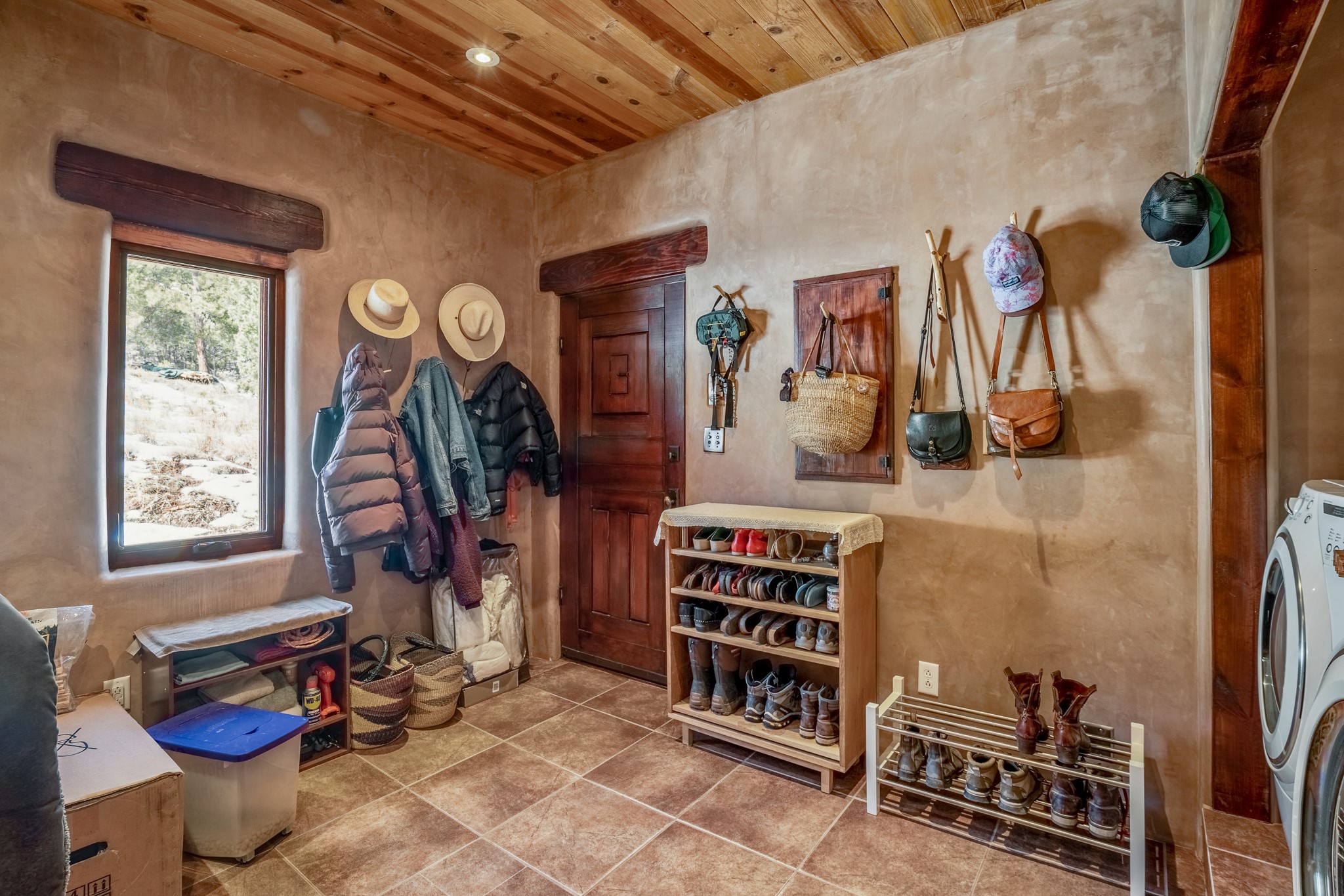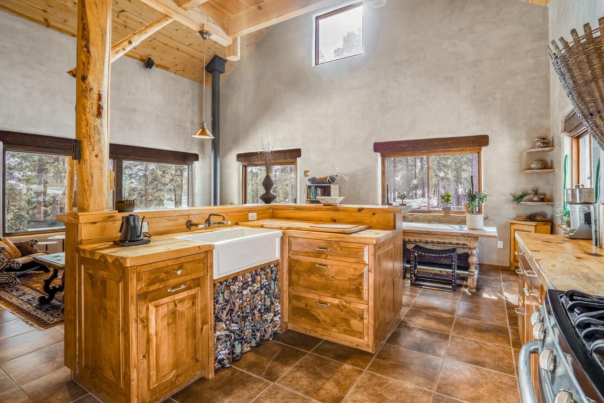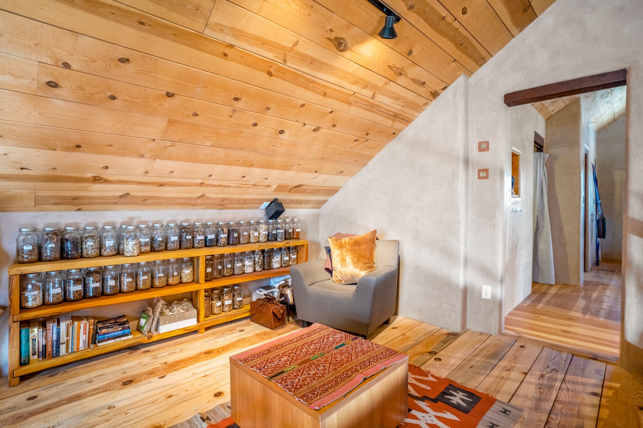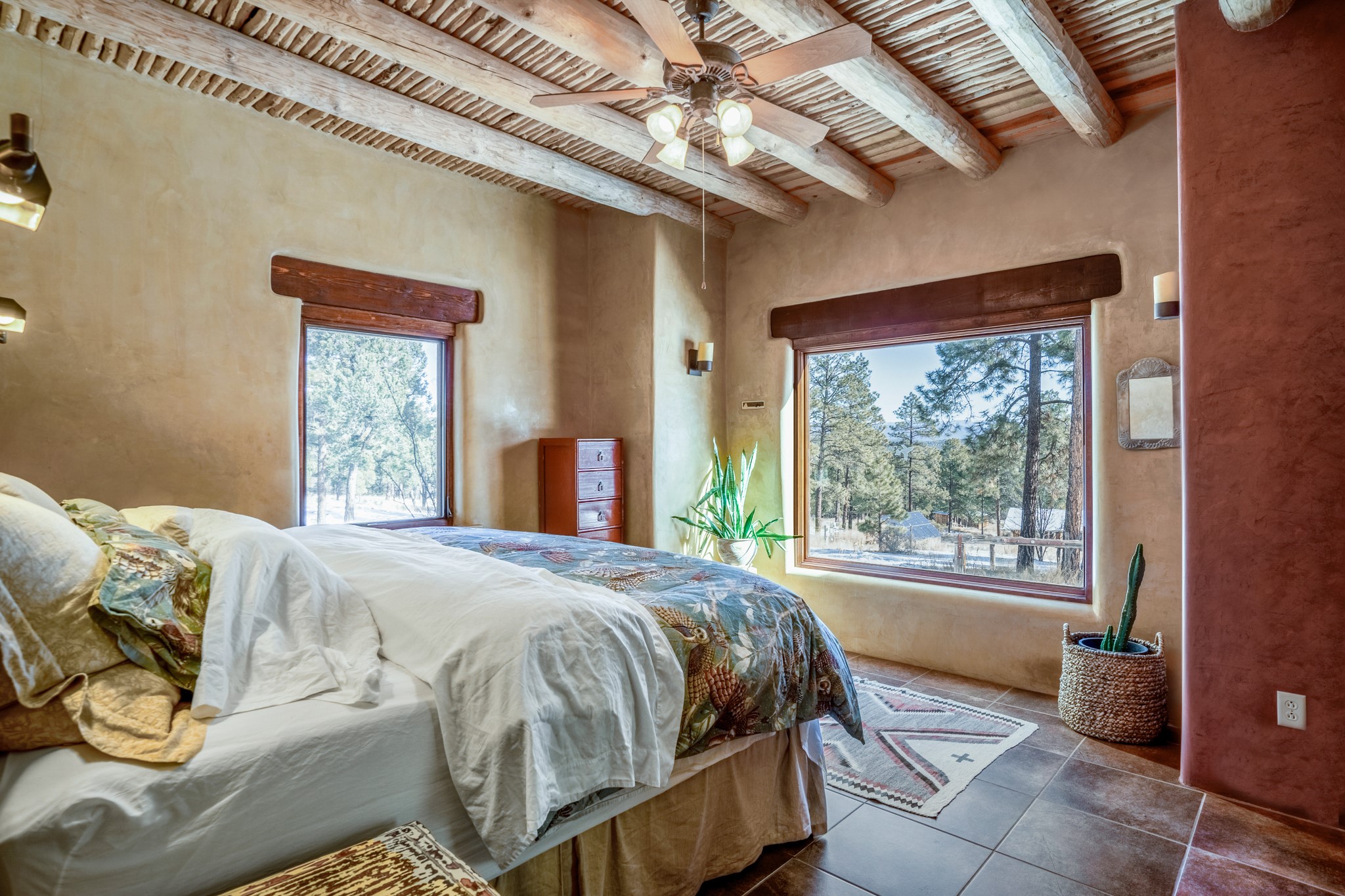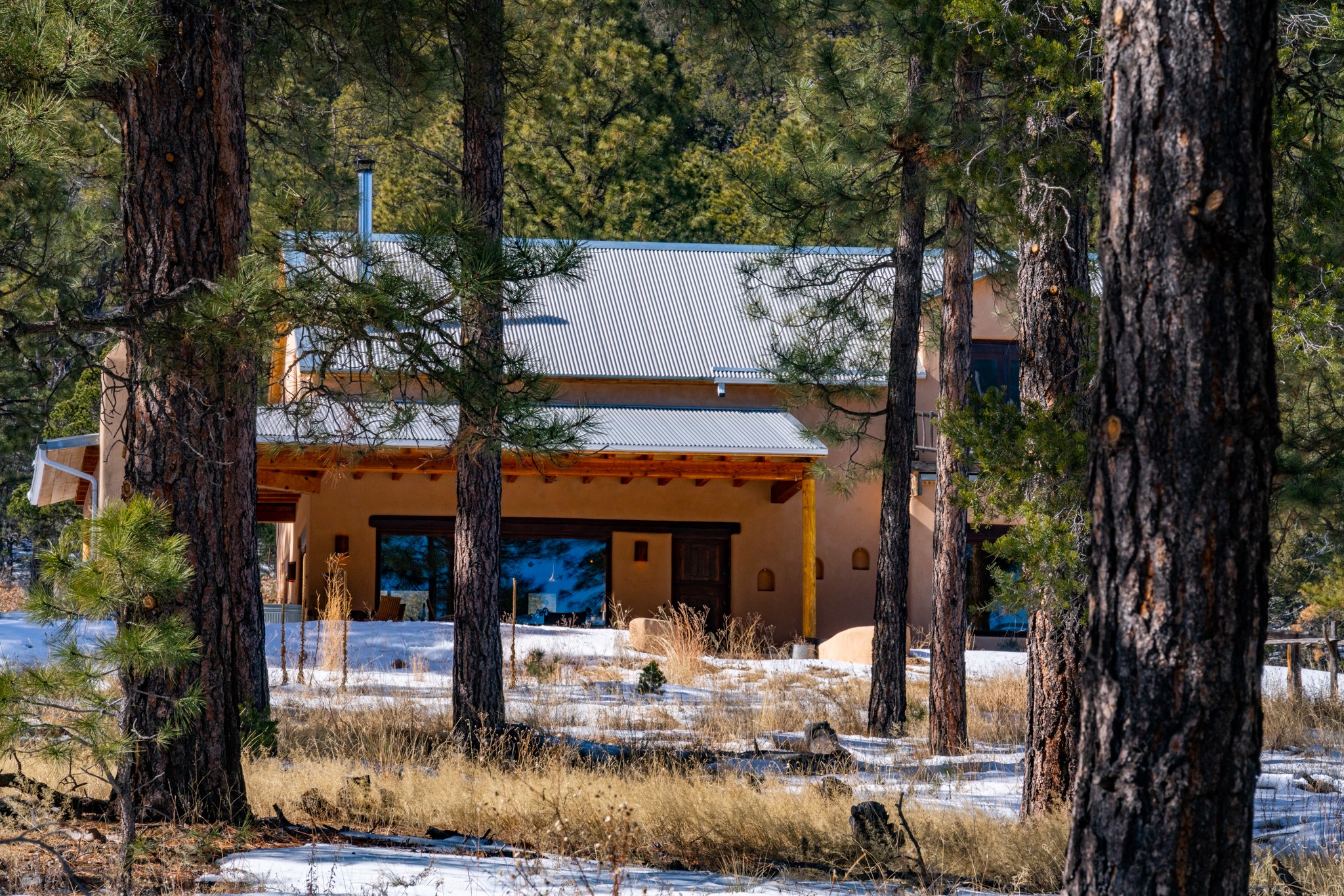 Exceptionally gorgeous custom built home on 12 1/2 acres adjoining 89,000 acres of Santa Fe National Forest with a trail, full horse facilities, full solar and a private well. Architectural features include Hand plastered natural American clay walls, 20 foot vaulted, pitched wood ceilings in the open living room, kitchen and dining. Gourmet cook's kitchen with farm sink, natural wood cabinetry and wood counters, La Puerta hand made Dutch doors, nichos, wood inlay, and restoration hardware light switches. Additional features include expansive upstairs and downstairs bedrooms; a primary bath with deep soaking clawfoot tub; Ensuite upstairs bath is plumbed and ready for fixtures. a bonus office loft, all wood and tile floors throughout with newer in floor radiant heat, A large mud room with utility, laundry (washer, dryer included); Expansive and deep wrap around portal with a kiva fireplace facing South and East. A 280 foot deep private well that produced 50+ gallons when drilled in 1993, wooden features (ceilings, loft window sills, kitchen countertops) made from trees harvested from the property that original owners cut, peeled and milled themselves, no HOA, and fully owned solar electrical system with ground array of 12 panels. (electric bill is $27 a month) The acreage is thriving with tall Ponderosa Pine, Fir, Pinon and Juniper trees, varied terrain, dramatic rock outcroppings, and fenced garden areas. For horses, goats, sheep or chickens, a 90'x90' arena, a 50' round pen, loafing shed, 2 fenced stalls, a covered hay shed and separate tack room. The Seller has shared riding trails from the home to the National Forest. Property is also zoned for a potential guest house, studio or ADU. This home is like no other with a focus on quality and aesthetics that is incomparable. Most "Casa Fina" furnishings may convey with an acceptable offer. bonus RV hook up on property too. also, In the esteemed Eldorado school district.