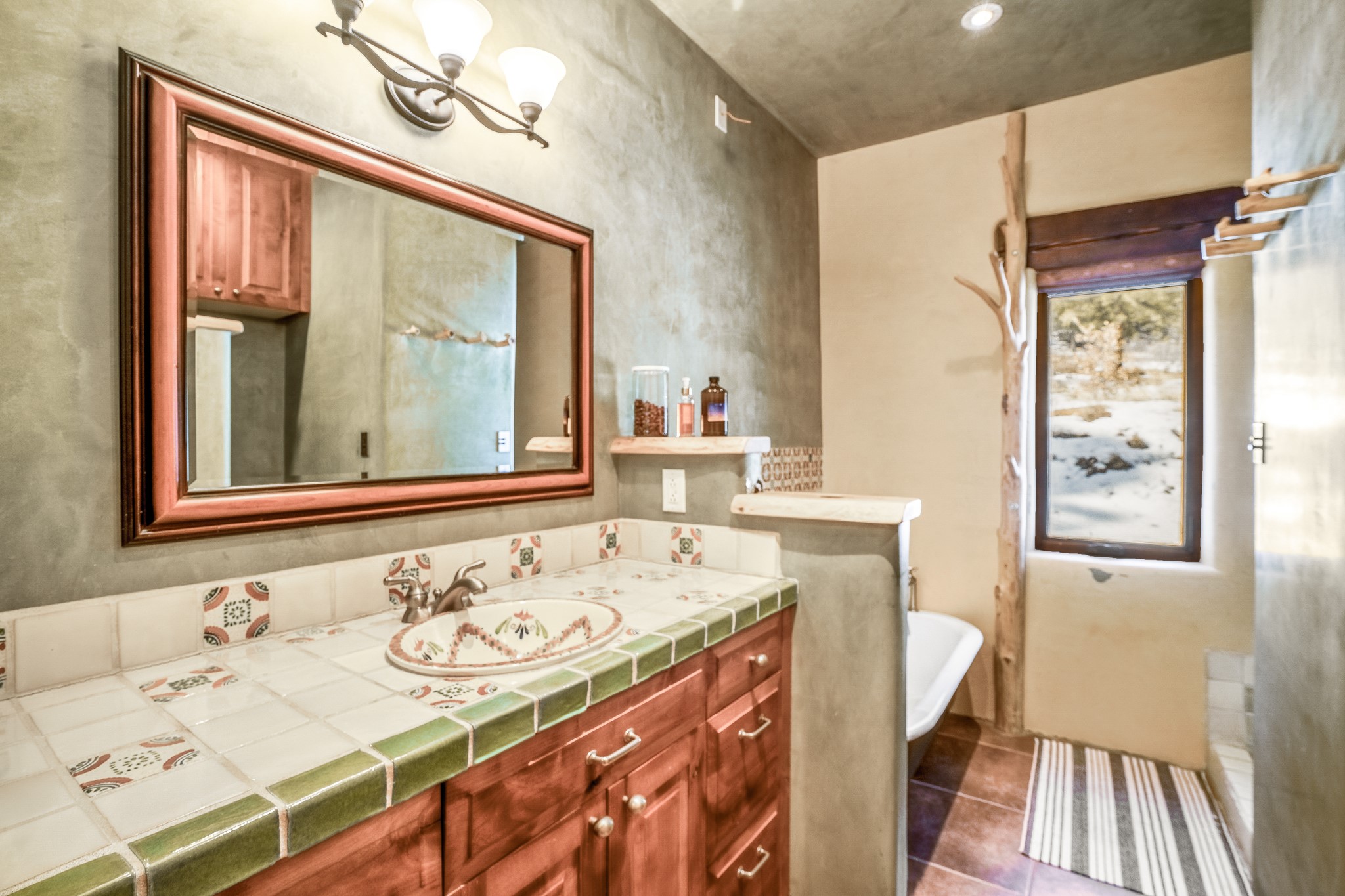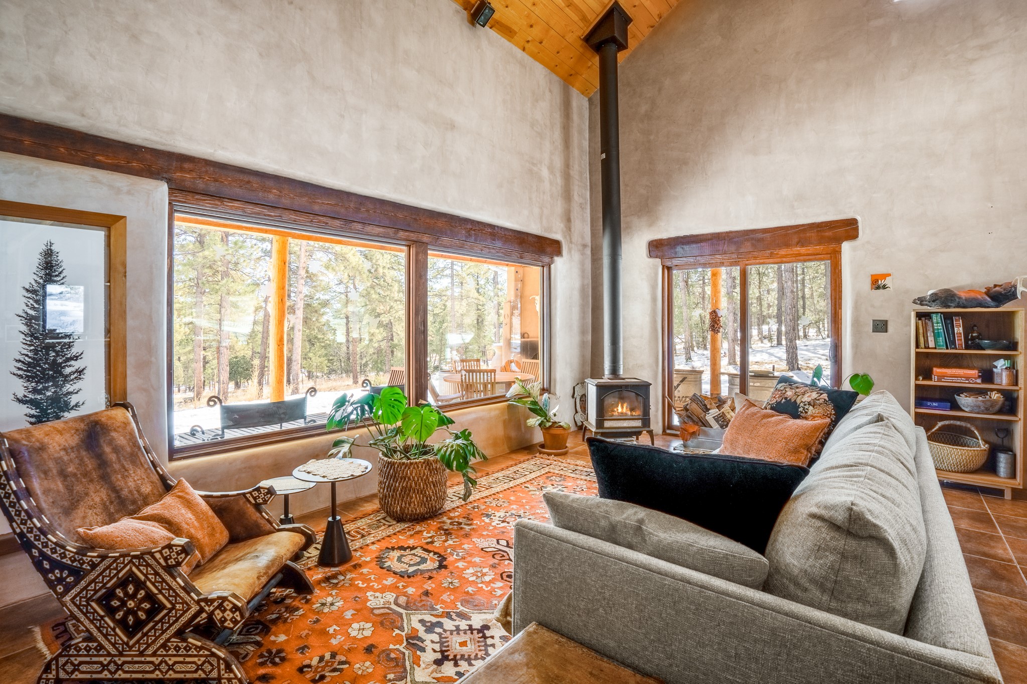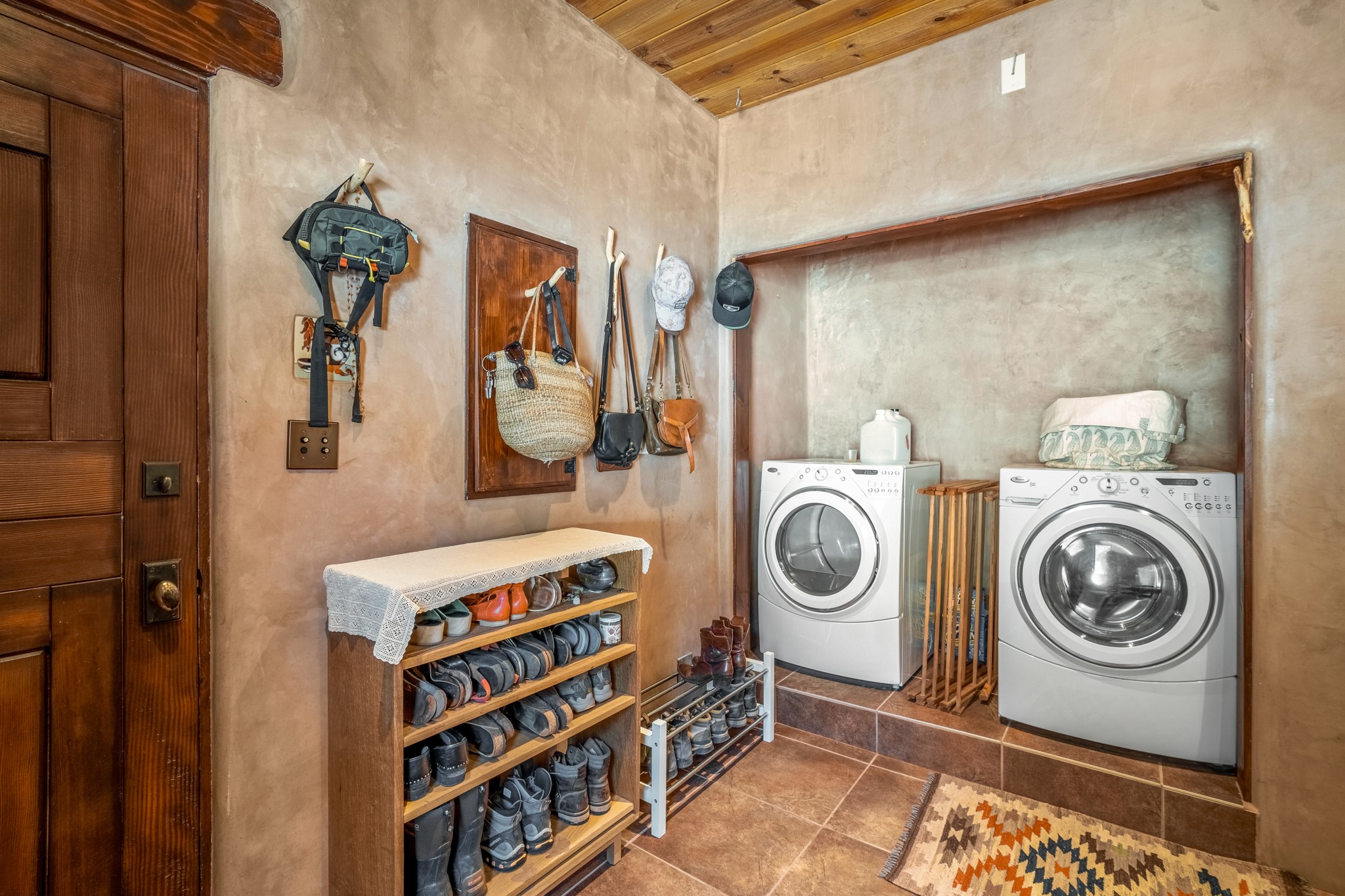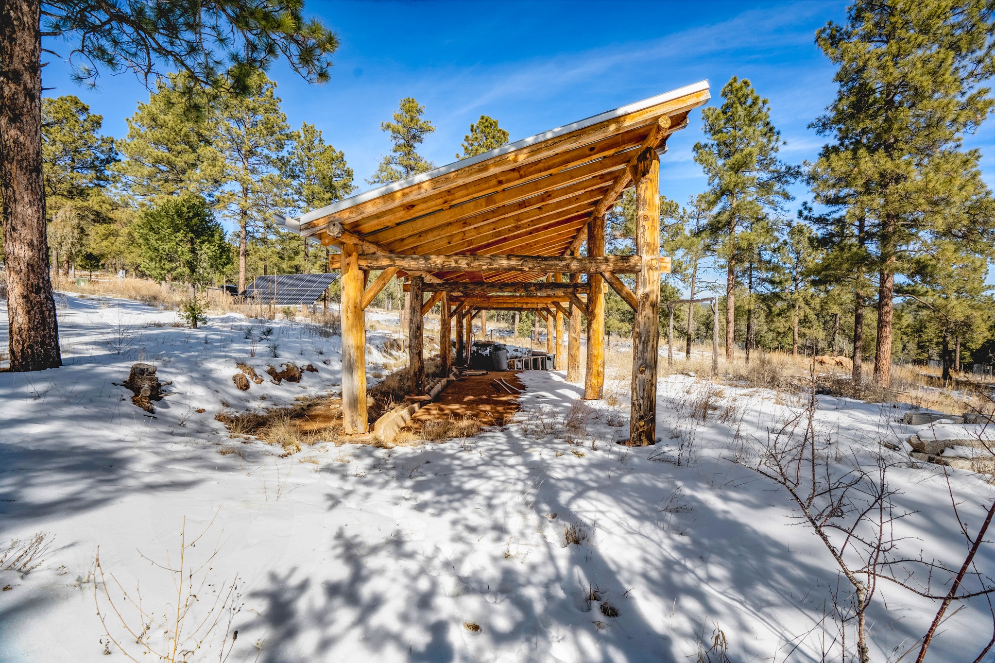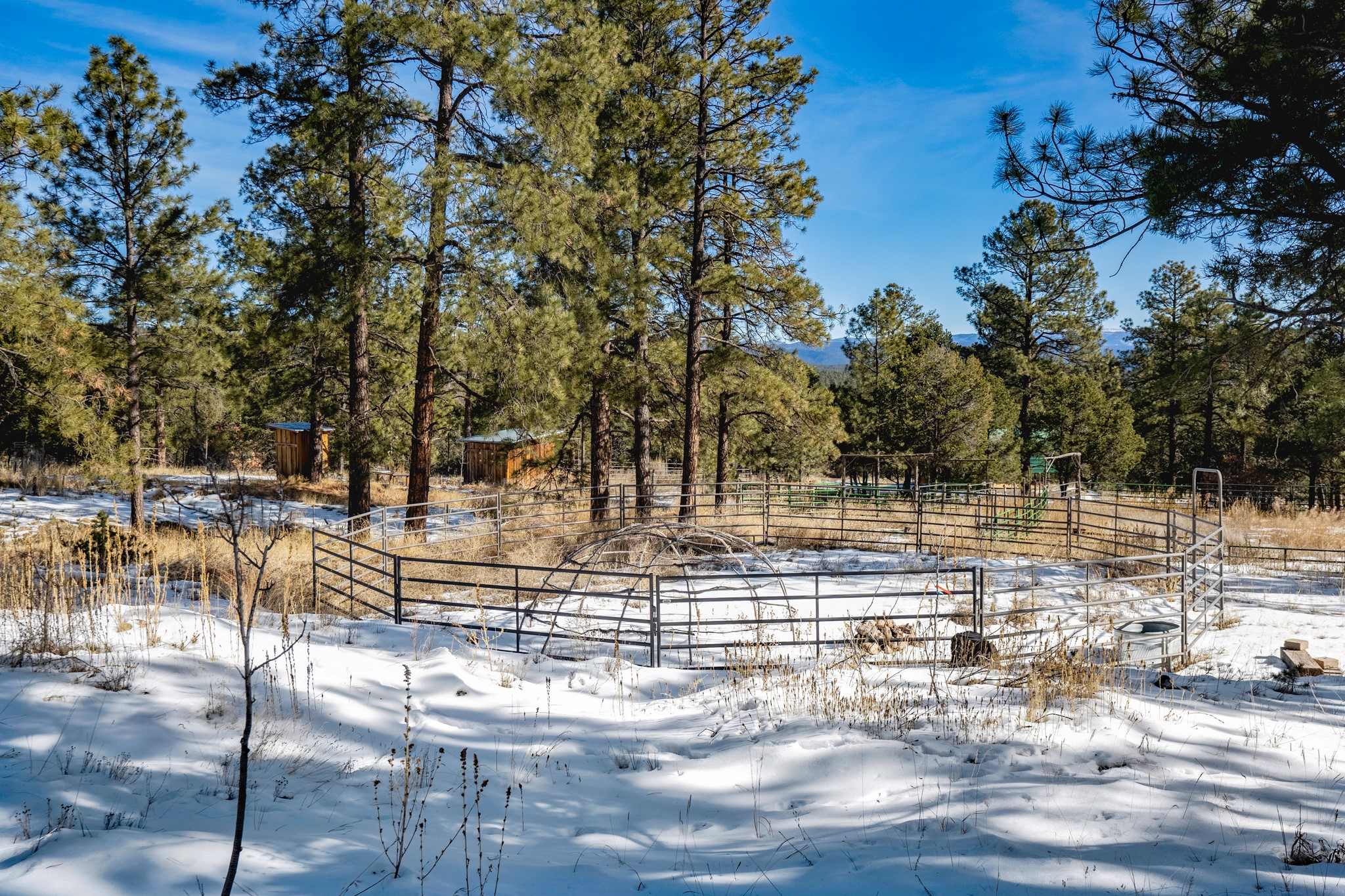 Exceptionally gorgeous custom built home on 12 1/2 acres adjoining 89,000 acres of Santa Fe National Forest with a trail, full horse facilities, full solar and a private well. Architectural features include Hand plastered natural American clay walls, 20 foot vaulted, pitched wood ceilings in the open living room, kitchen and dining. Gourmet cook's kitchen with farm sink, natural wood cabinetry and wood counters, La Puerta hand made Dutch doors, nichos, wood inlay, and restoration hardware light switches. Additional features include expansive upstairs and downstairs bedrooms; a primary bath with deep soaking clawfoot tub; Ensuite upstairs bath is plumbed and ready for fixtures. a bonus office loft, all wood and tile floors throughout with newer in floor radiant heat, A large mud room with utility, laundry (washer, dryer included); Expansive and deep wrap around portal with a kiva fireplace facing South and East. A 280 foot deep private well that produced 50+ gallons when drilled in 1993, wooden features (ceilings, loft window sills, kitchen countertops) made from trees harvested from the property that original owners cut, peeled and milled themselves, no HOA, and fully owned solar electrical system with ground array of 12 panels. (electric bill is $27 a month) The acreage is thriving with tall Ponderosa Pine, Fir, Pinon and Juniper trees, varied terrain, dramatic rock outcroppings, and fenced garden areas. For horses, goats, sheep or chickens, a 90'x90' arena, a 50' round pen, loafing shed, 2 fenced stalls, a covered hay shed and separate tack room. The Seller has shared riding trails from the home to the National Forest. Property is also zoned for a potential guest house, studio or ADU. This home is like no other with a focus on quality and aesthetics that is incomparable. Most "Casa Fina" furnishings may convey with an acceptable offer. bonus RV hook up on property too. also, In the esteemed Eldorado school district.