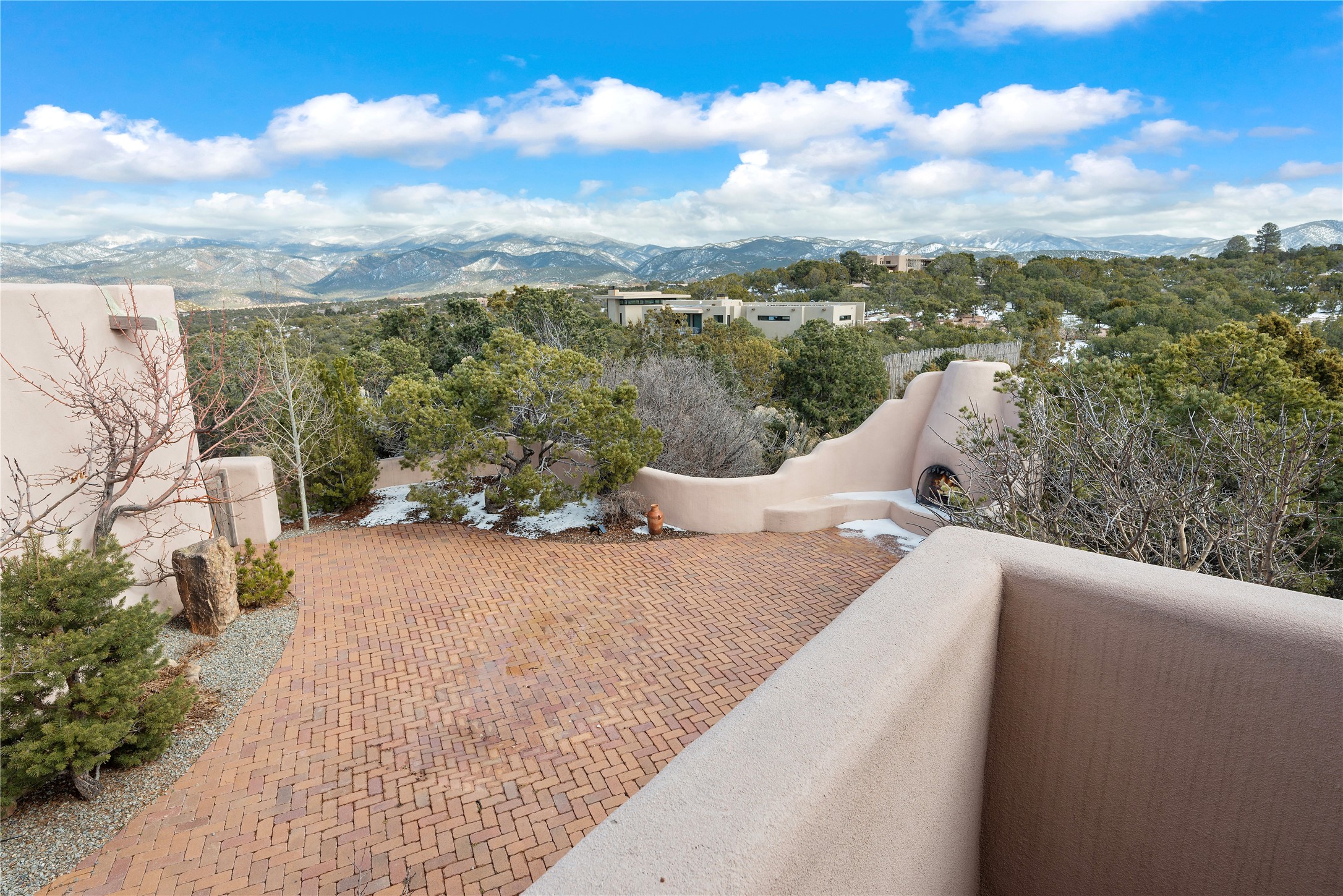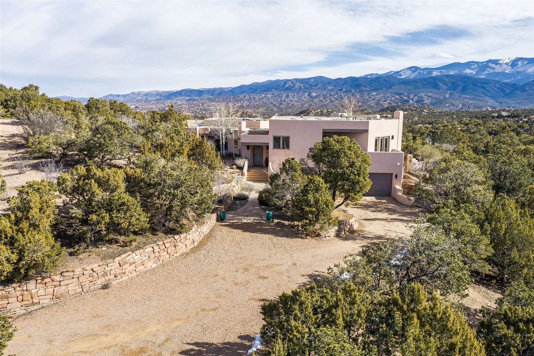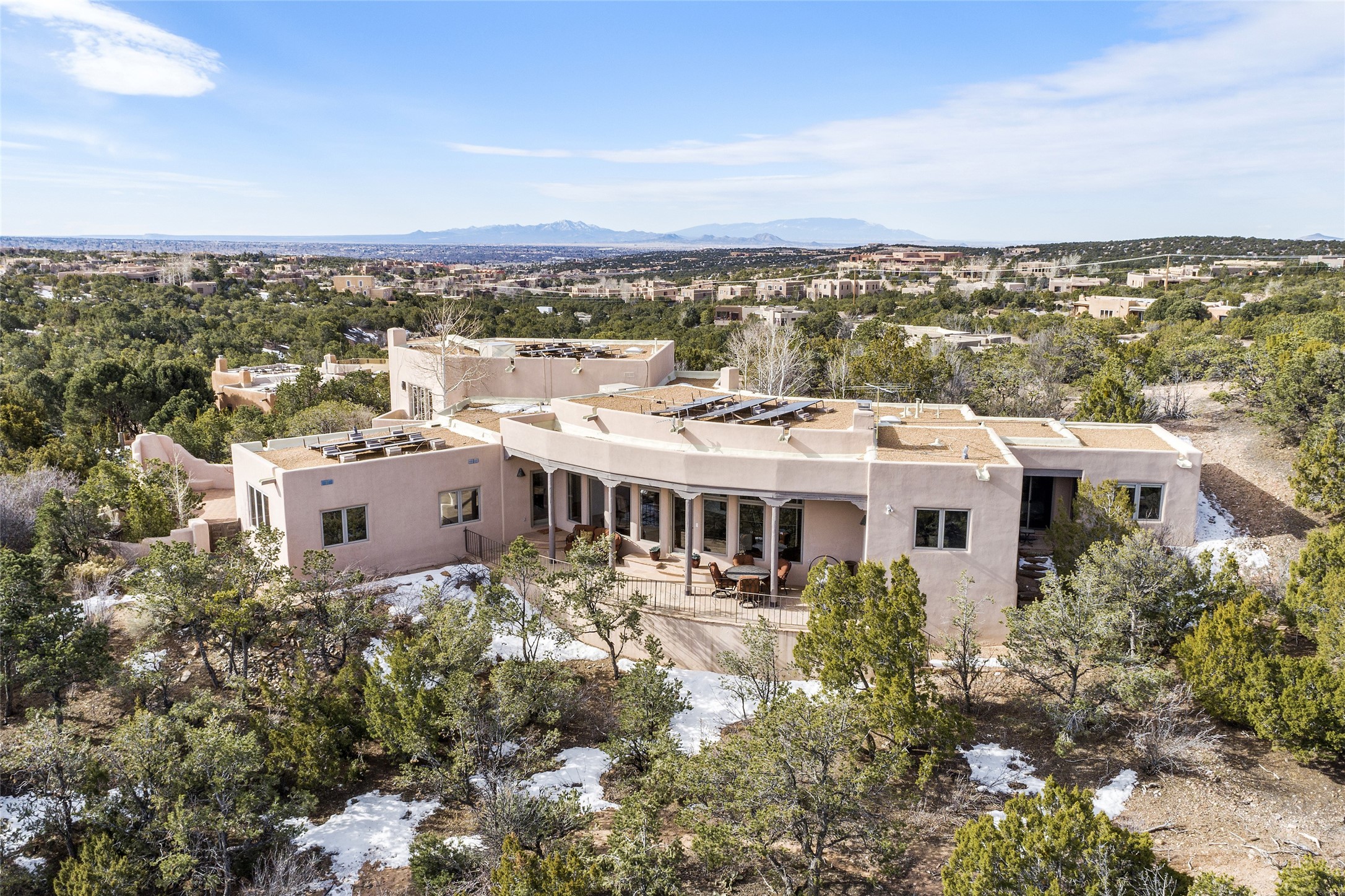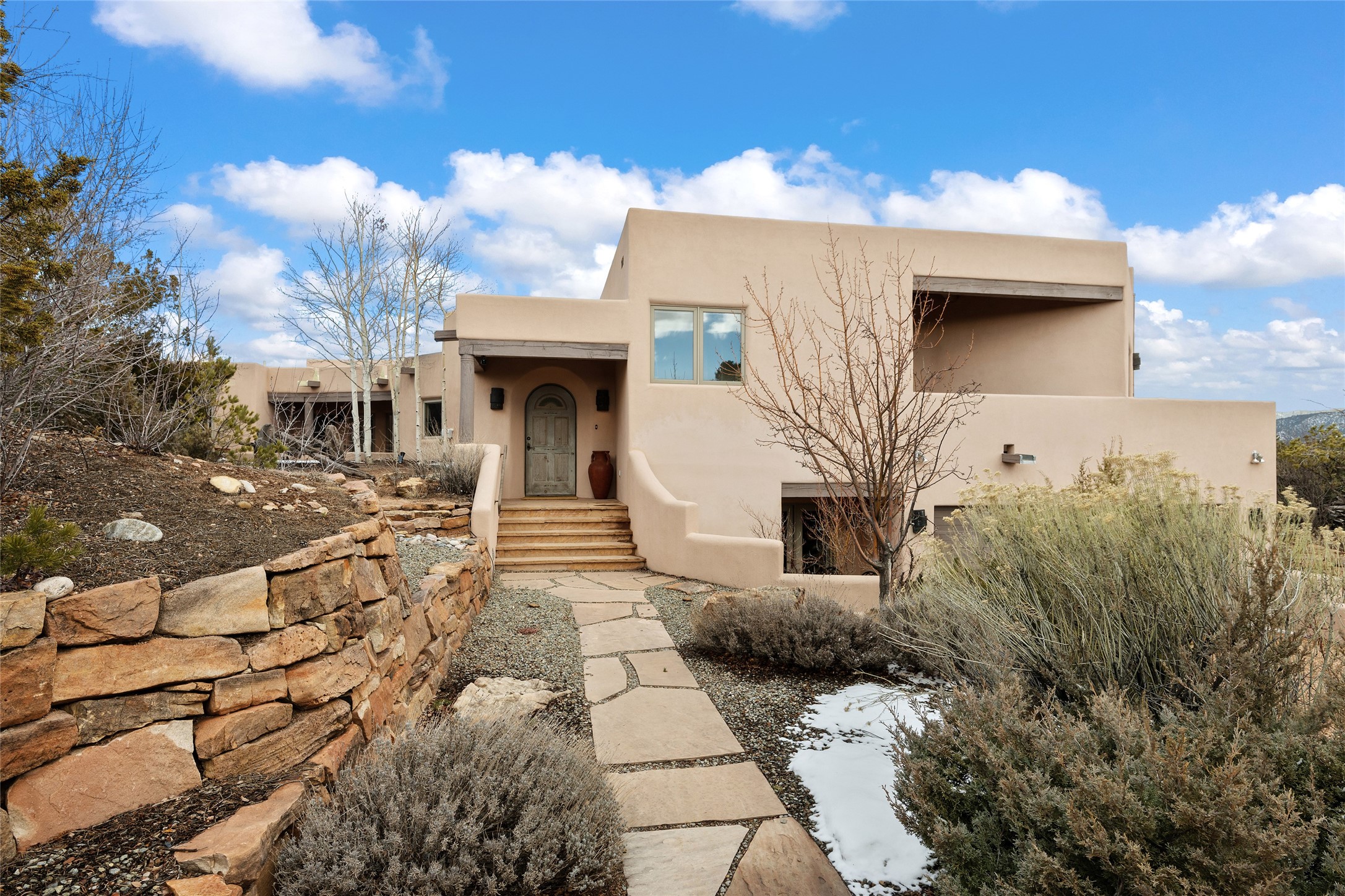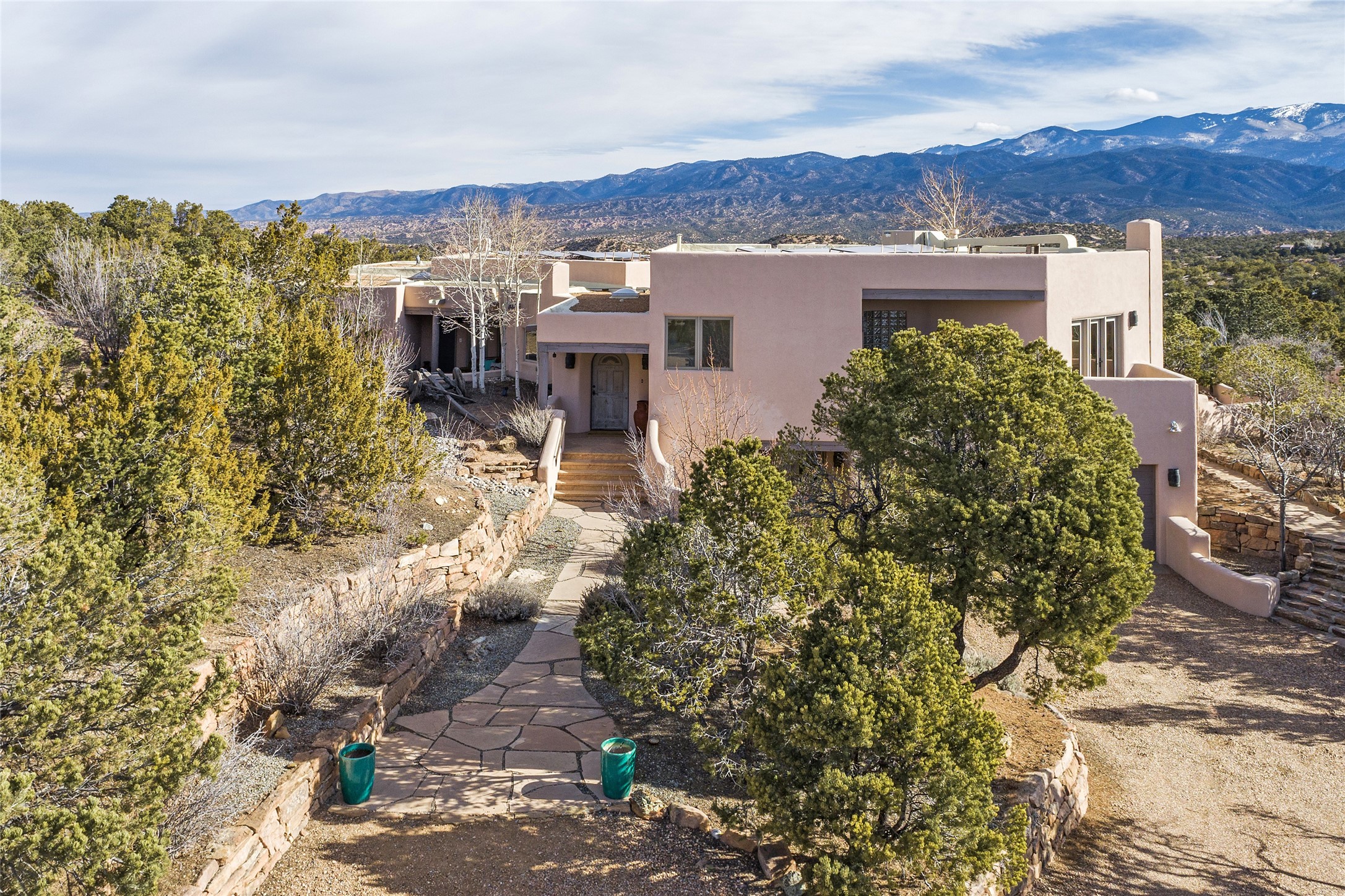 SANGRE DE CHRISTO MOUNTAIN VIEWS SPLAYED OUT IN ALL THEIR REVALRY FROM THIS 1.7 ACRE TANO ROAD HOME LOCATED ON COVETED CUL-DU-SAC LOCATION. Classical Santa Fe architecture meets modern day requirements including flexible space for bedrooms + office, city water and high-speed internet, excellent proximity to town and a Positive Energy solar system with battery back-up. Prull Builders built this extraordinary home which has been lovingly updated and maintained by the current owners. Designed by Paula Baker Laporte - the tranquil "arc" of the design allows one to "discover" the home - a new inspiration around each gentle bend. Fantastic floor plan allows for multiple outdoor spaces for entertaining and relaxing around the residence including a long portal maximizing the Sangre views, a large private walled courtyard with outdoor kiva fireplace off the den/kitchen area, balconies off corners of the primary suite and other bedrooms. Finally, an outdoor portal with a hot tub is in the perfect nook for privacy and views! Each bath has unique Talavera tile designs including a dazzling powder room. This home is the ultimate in Santa Fe living - honoring the integrity of Santa Fe style with today's modern amenities/energy savings.